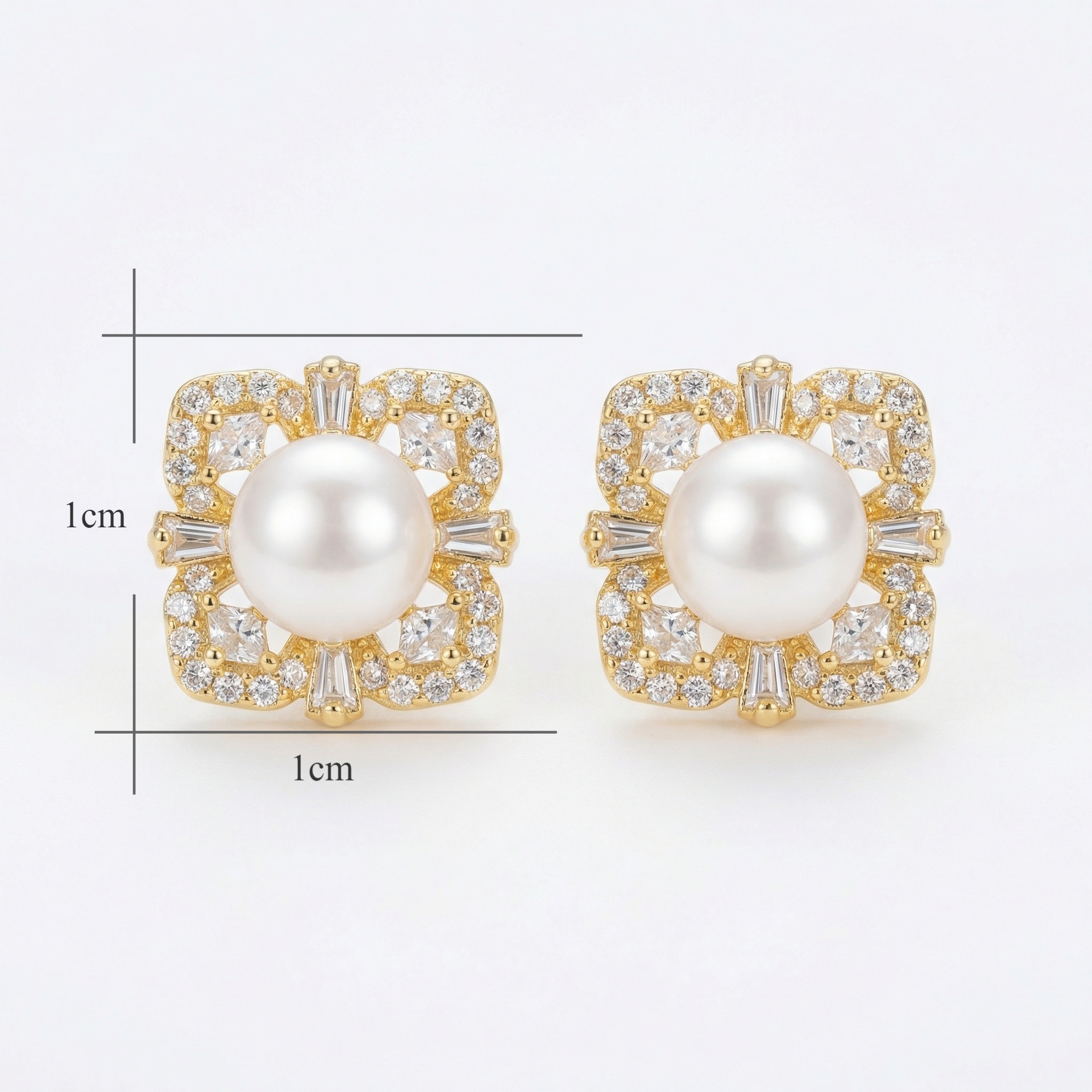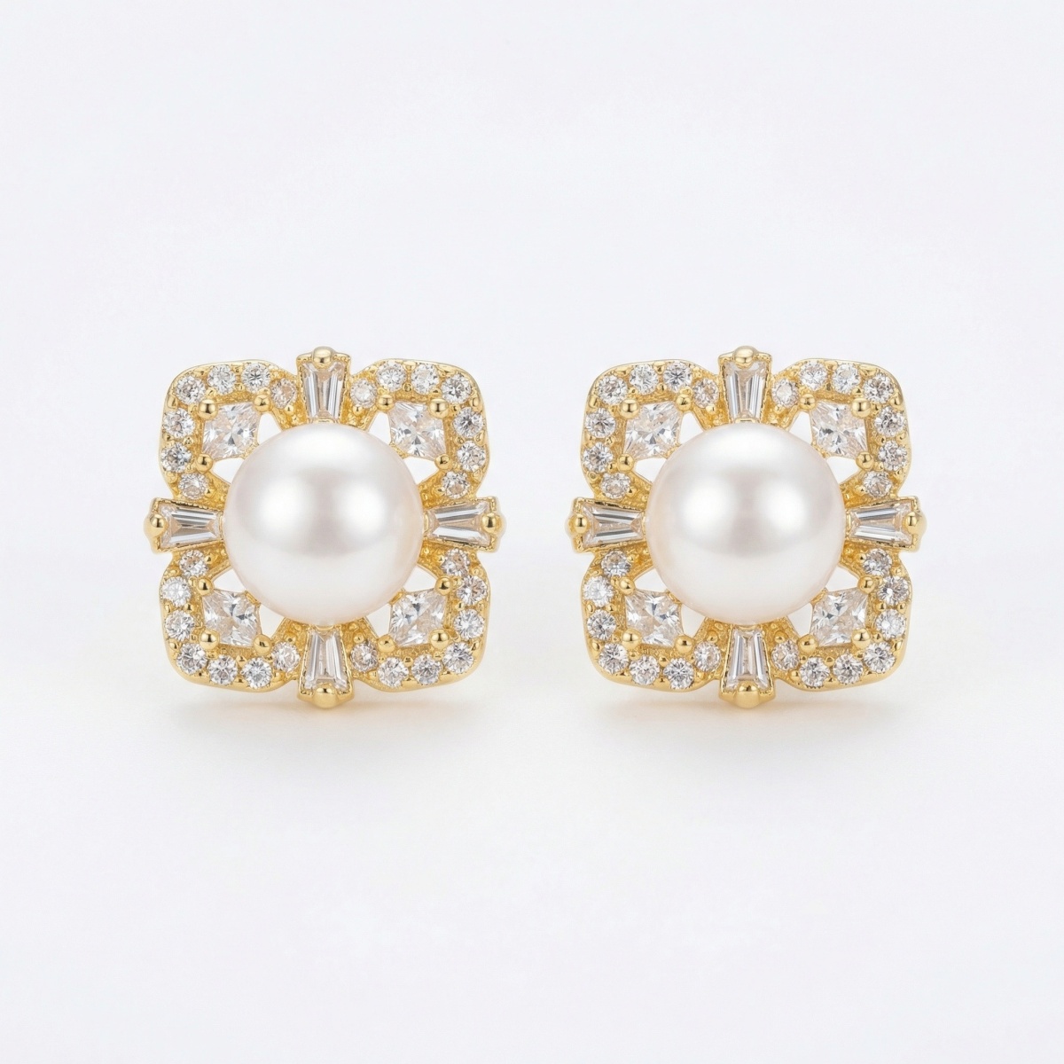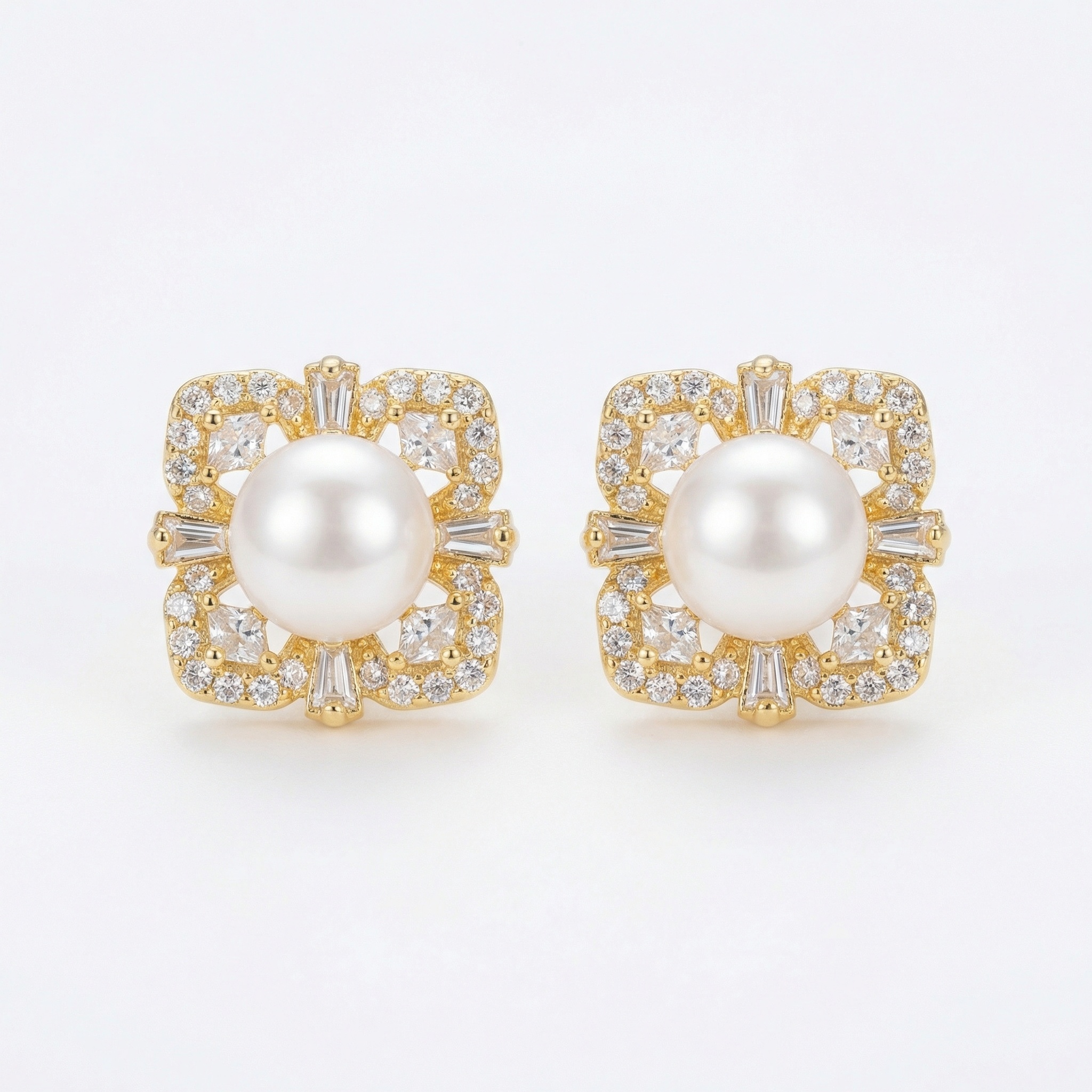 These exquisite stud earrings showcase a luminous round white pearl at the heart of an intricate geometric frame. Surrounded by a halo of shimmering round and baguette-cut gemstones, the design offers a perfect blend of vintage inspiration and modern sophistication. The warm yellow-toned setting provides a rich contrast to the creamy pearl luster, creating a timeless aesthetic that elevates any ensemble. Whether worn for a wedding, a formal event, or to add a touch of luxury to your everyday style, these earrings are a versatile addition to any jewelry box. Featuring secure backings for comfortable wear, they reflect light beautifully, making them a captivating choice for those who appreciate classic elegance and detailed craftsmanship. | Brand: jewelryodm