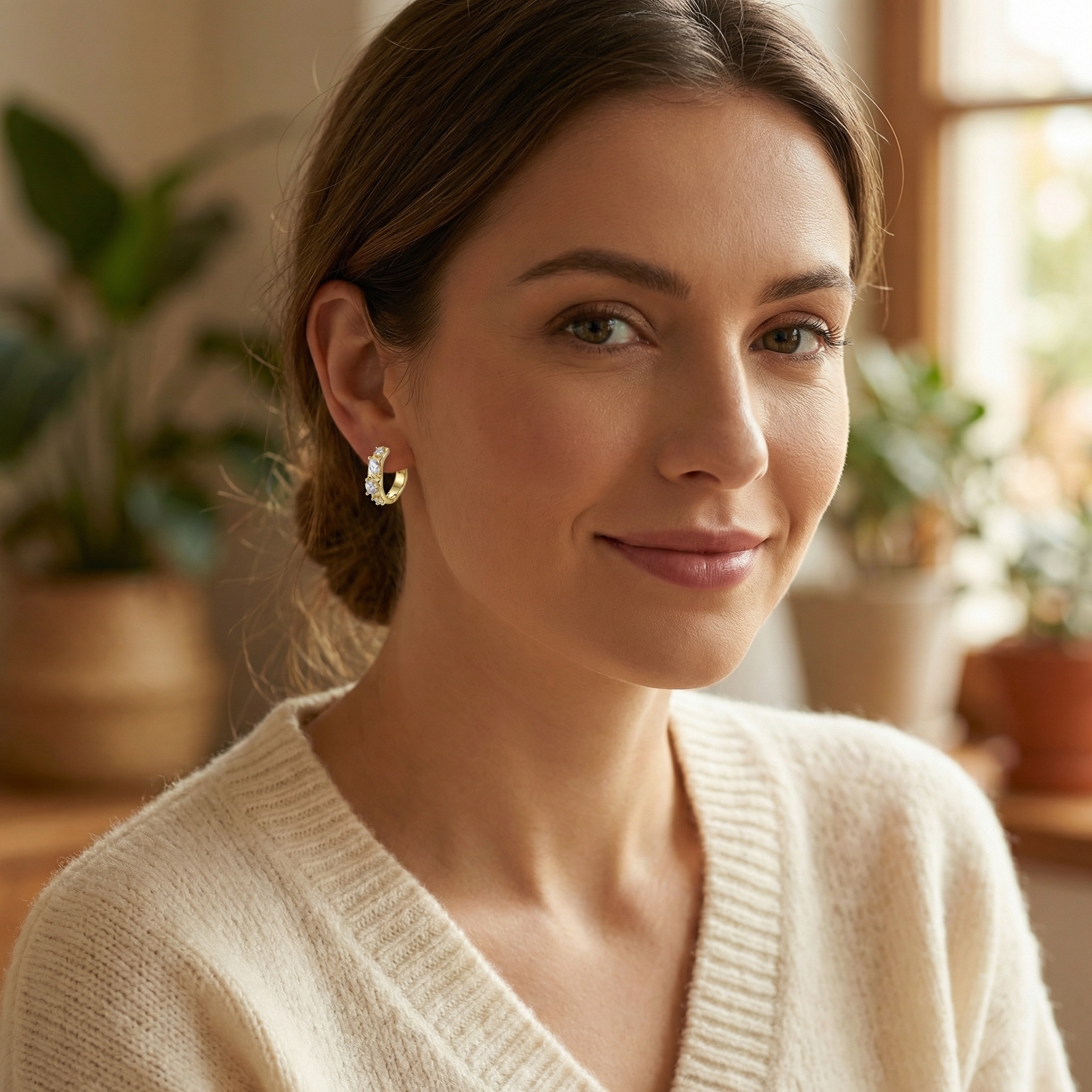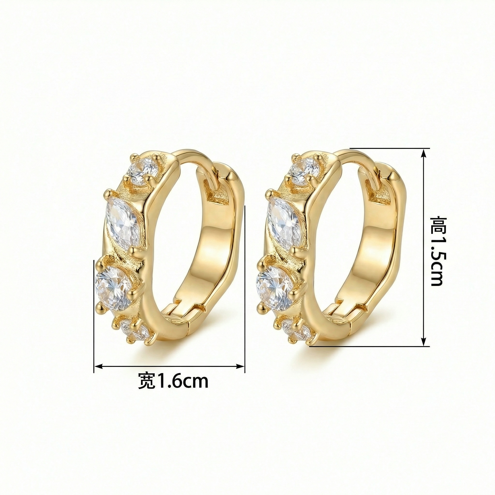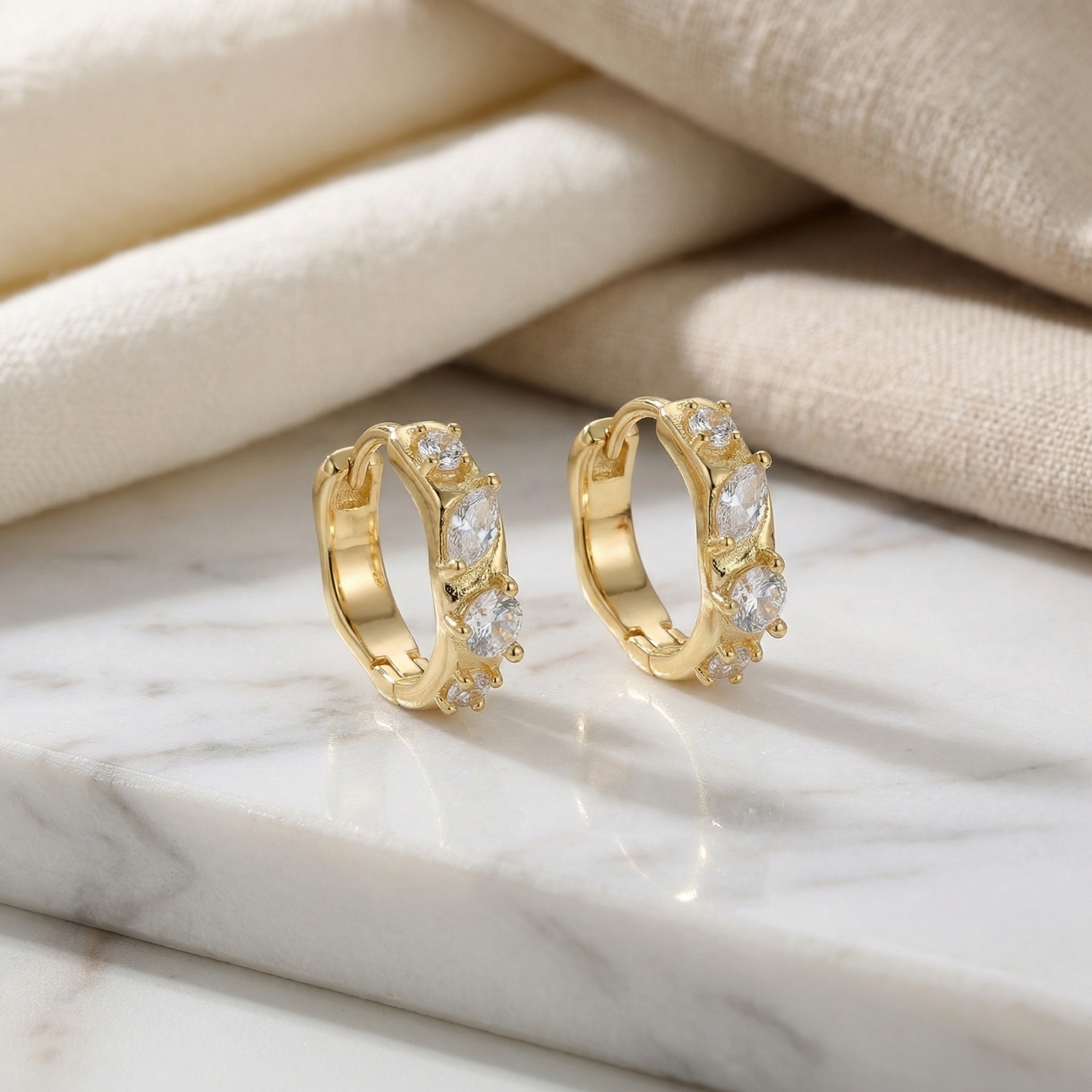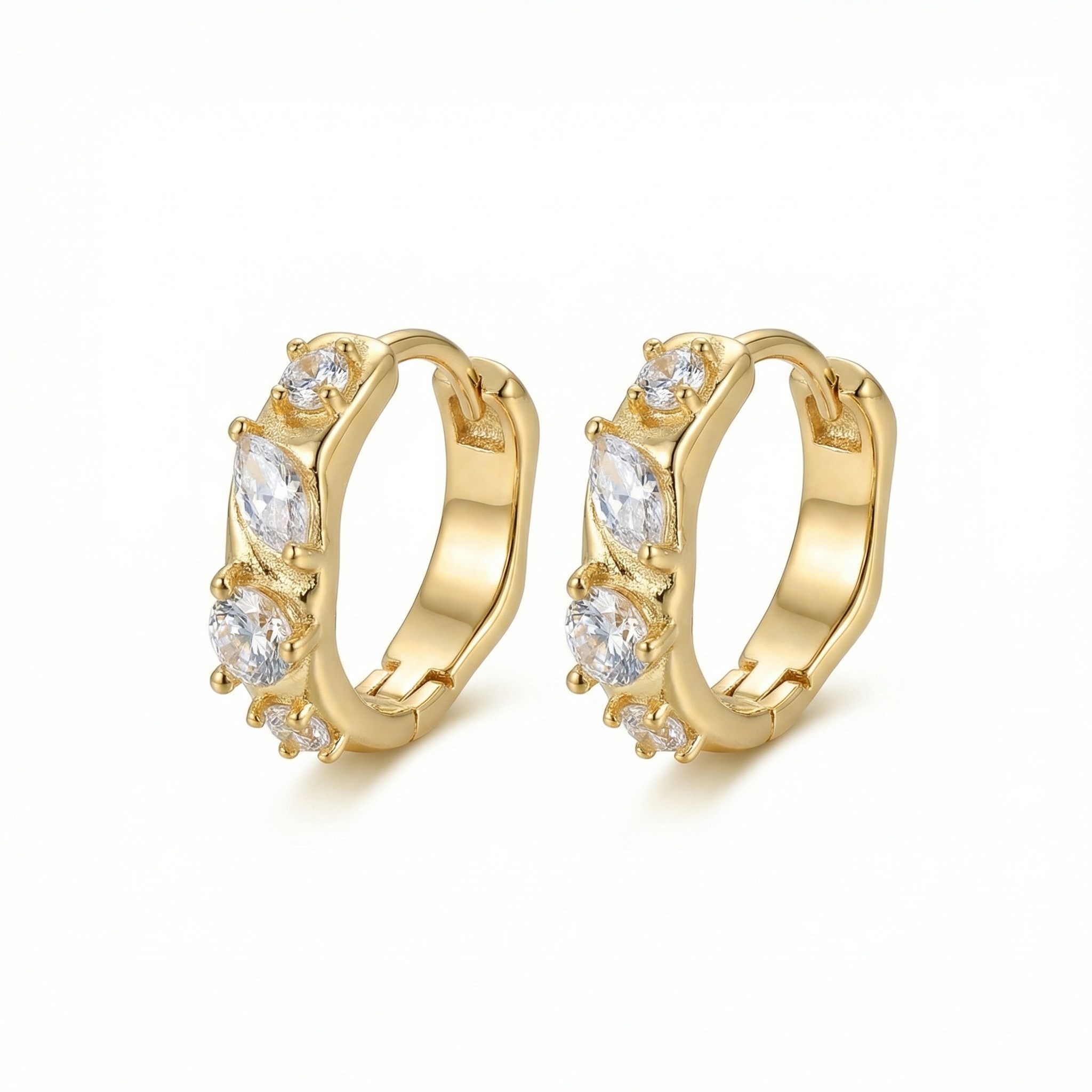 Elevate your everyday style with these exquisite huggie hoop earrings. Featuring a stunning combination of alternating marquise and brilliant round-cut cubic zirconia stones, these earrings capture and reflect light from every angle. The warm-toned metallic finish provides a luxurious backdrop for the sparkling gems, which are securely held in textured prong settings. Designed for comfort and ease, they feature a convenient hinged closure that clicks safely into place. Whether you're dressing up for a special occasion or adding a touch of shimmer to your casual attire, these petite hoops offer a sophisticated and timeless look. Lightweight and durable, they make a perfect addition to any jewelry collection or a thoughtful gift for someone special. Enjoy the effortless elegance and radiant charm of these shimmering accessories. | Brand: jewelryodm