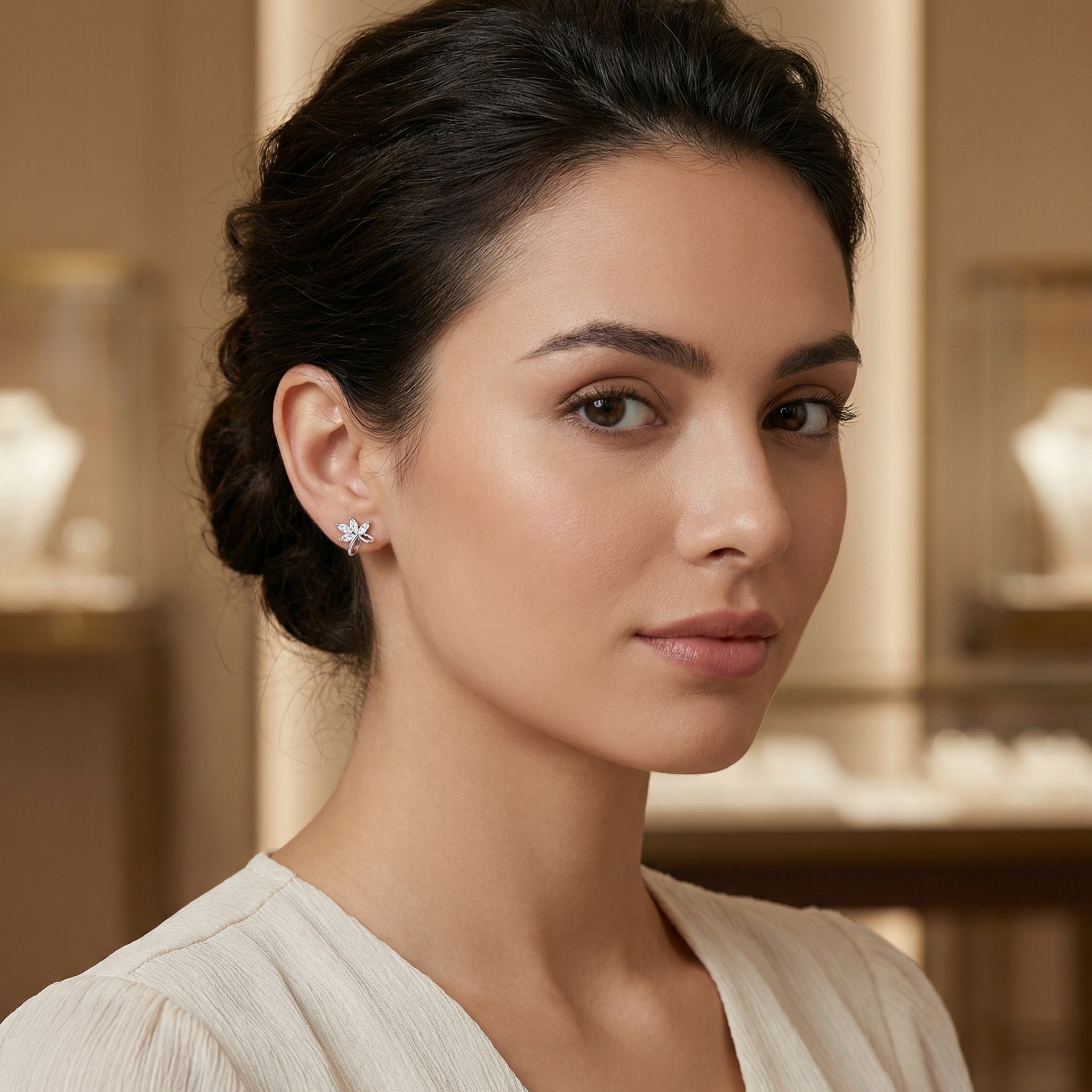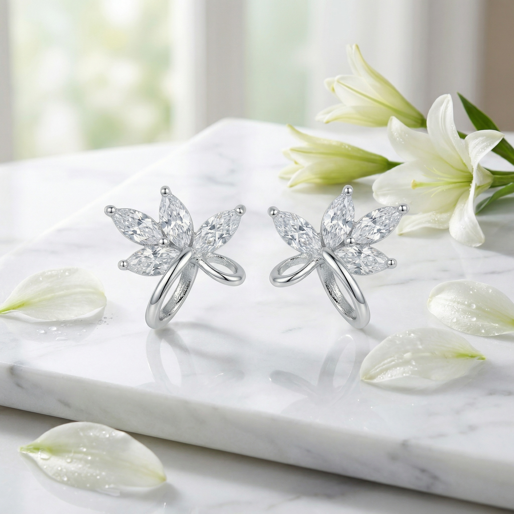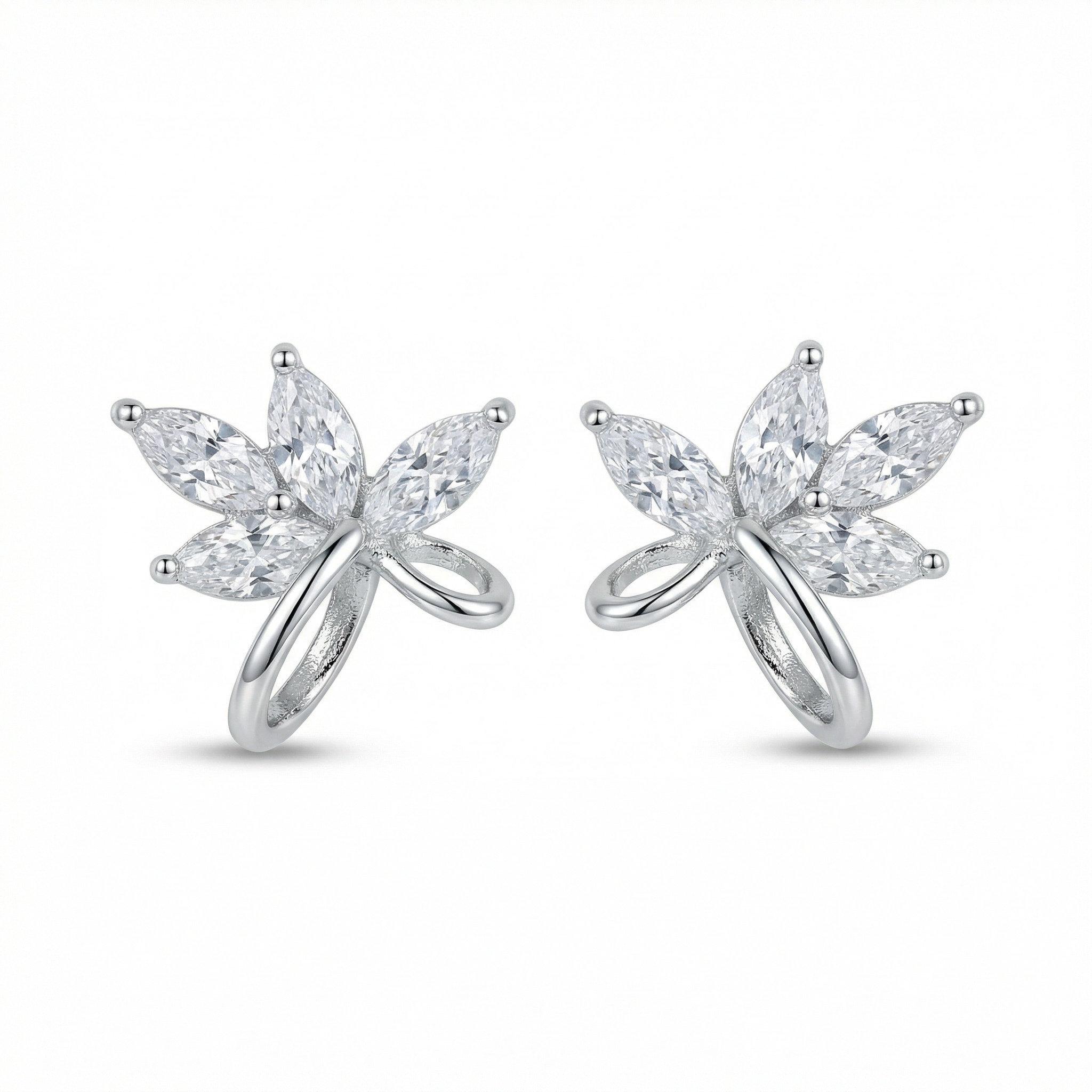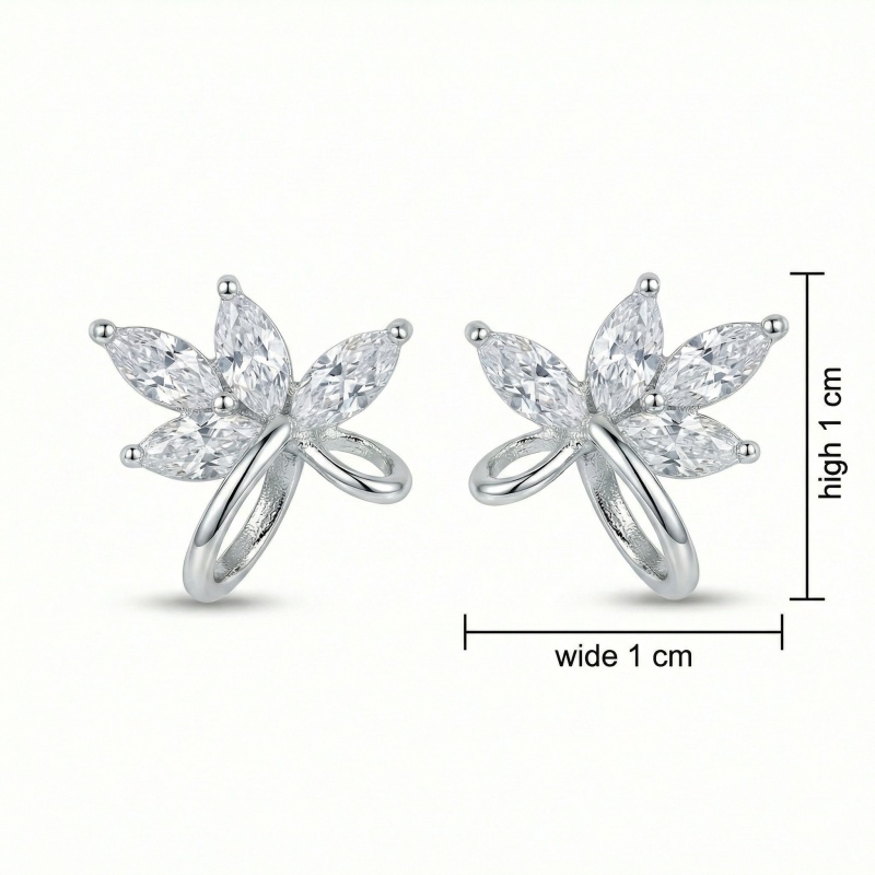 These exquisite stud earrings feature a stunning botanical design, meticulously crafted from high-quality silver-tone metal. Each earring showcases five brilliant marquise-cut clear stones, expertly arranged to resemble a delicate leaf or flower blossom. The sparkling stones catch the light from every angle, creating a radiant shimmer. Beneath the petal-like stones are two polished silver-toned loops that add a modern, fluid touch to the classic floral aesthetic. These lightweight and comfortable earrings are perfect for adding a touch of sophisticated elegance to any outfit, whether it's for a formal event or everyday wear. They make a thoughtful gift for birthdays, anniversaries, or any special occasion. With their timeless appeal and refined craftsmanship, these floral marquise earrings are a must-have addition to any jewelry collection. | Brand: jewelryodm