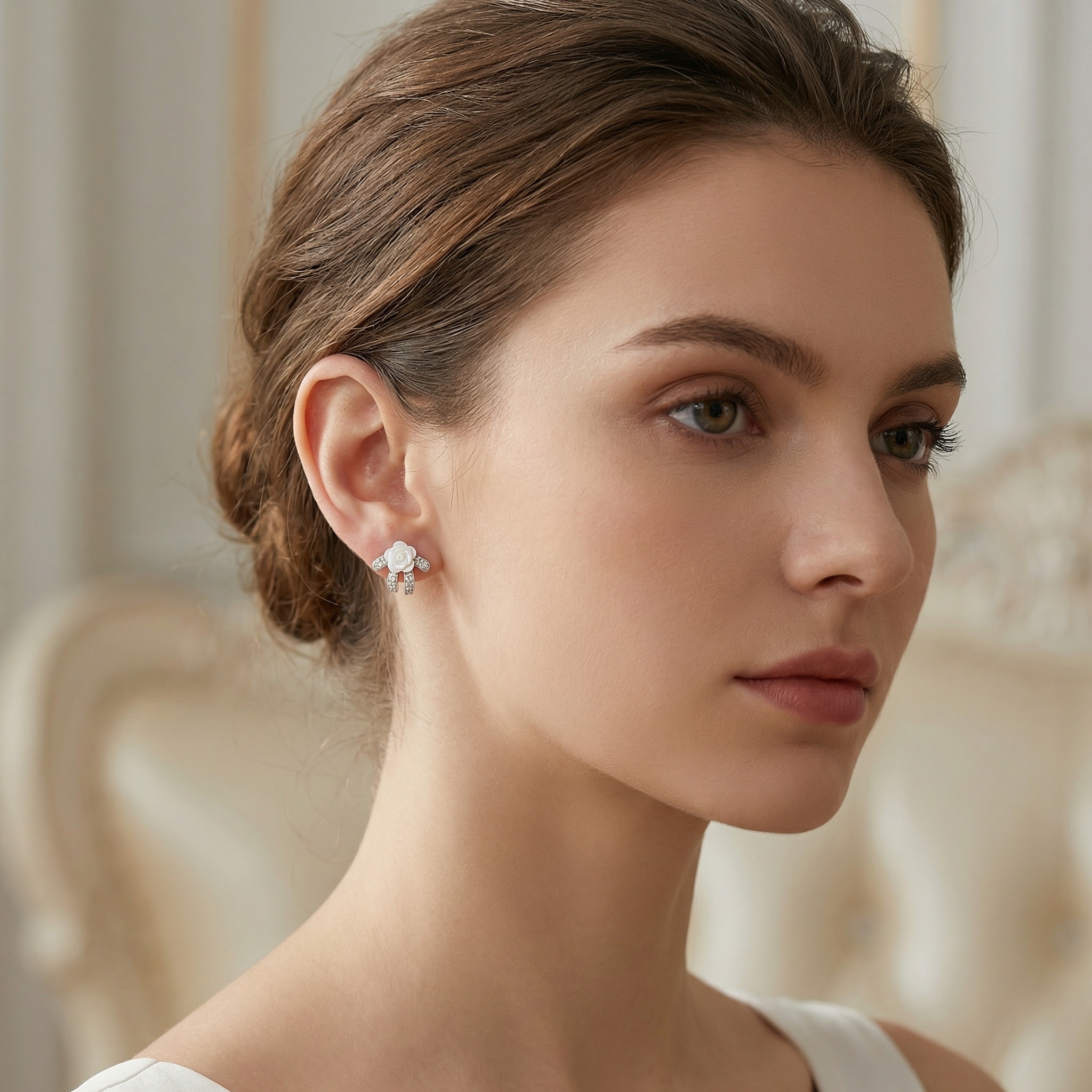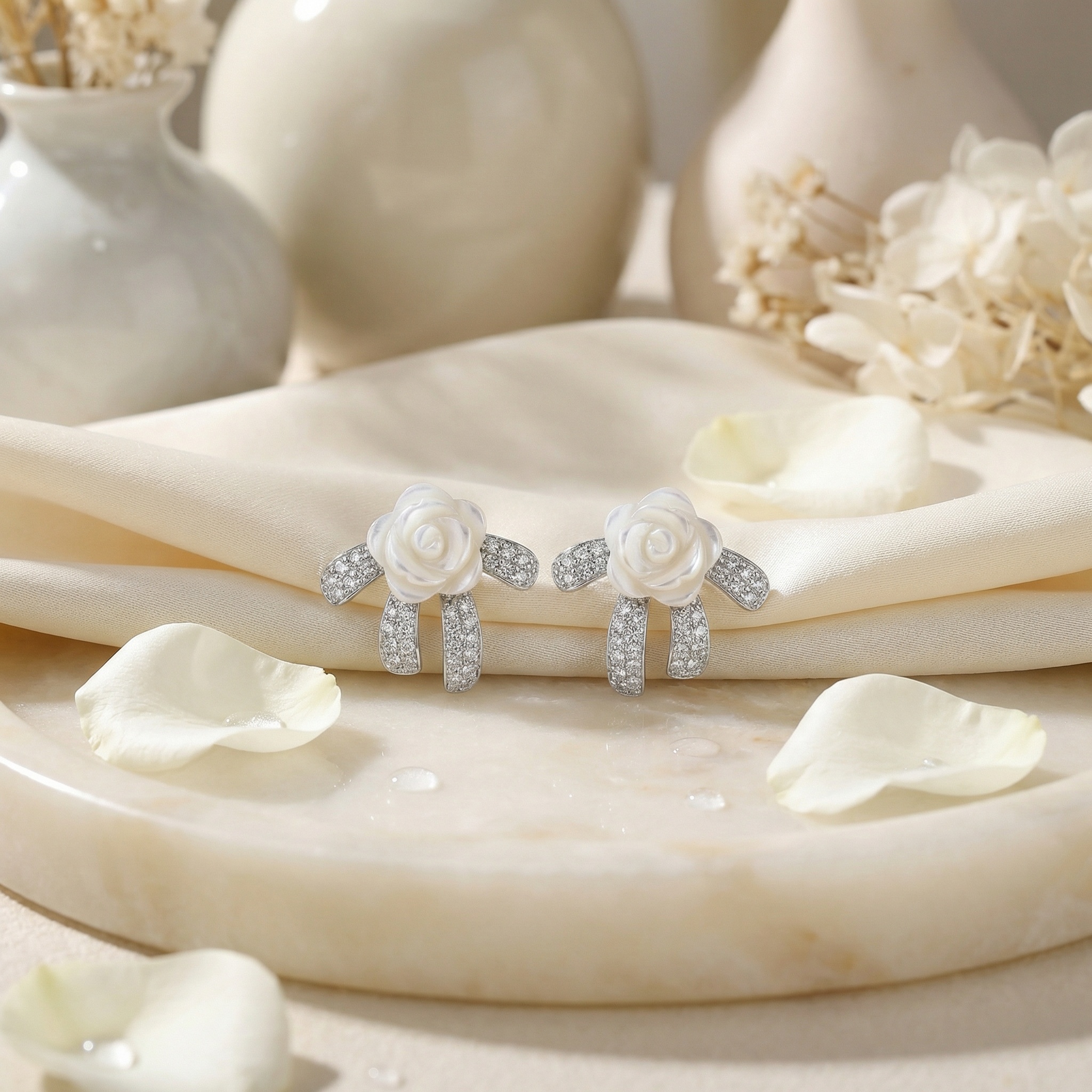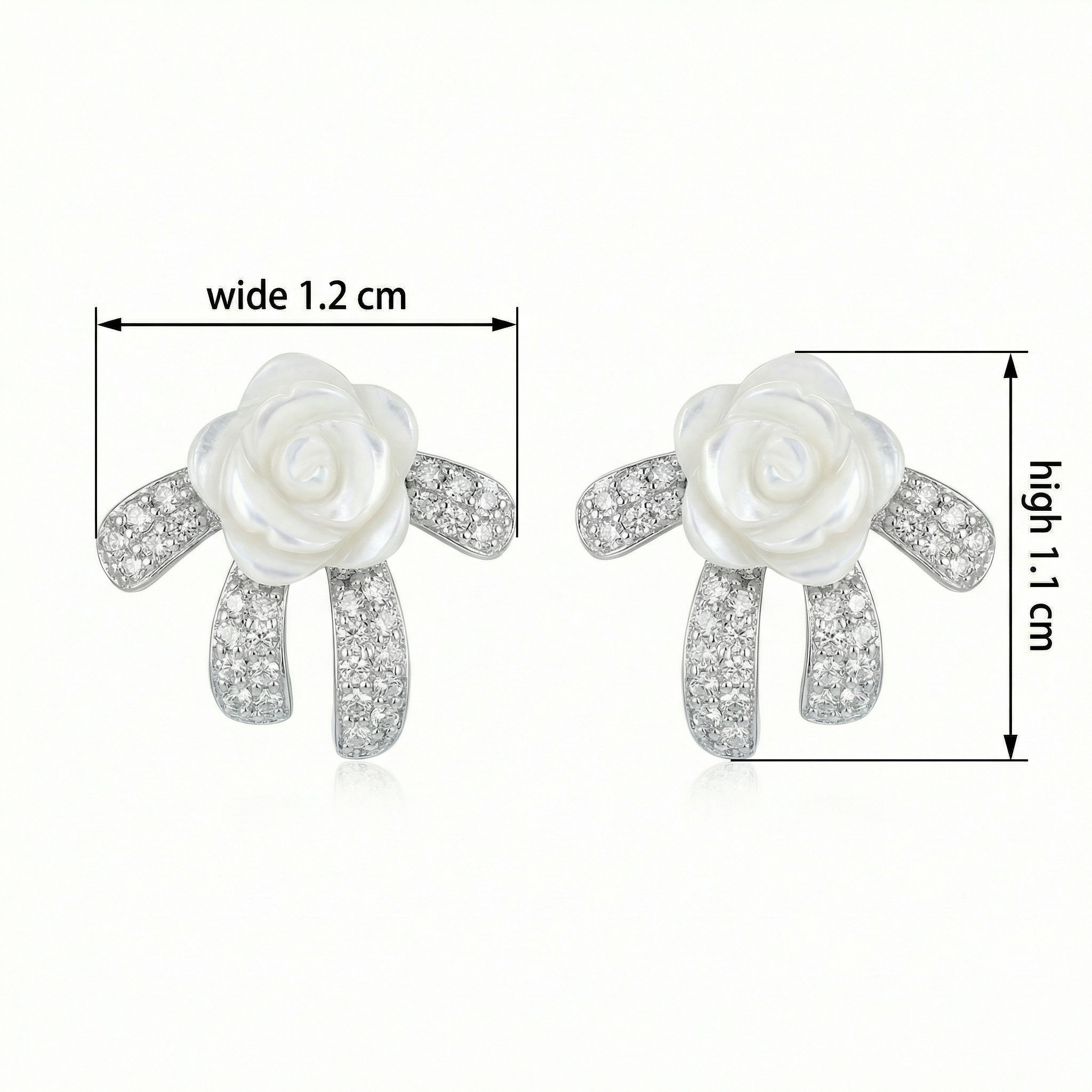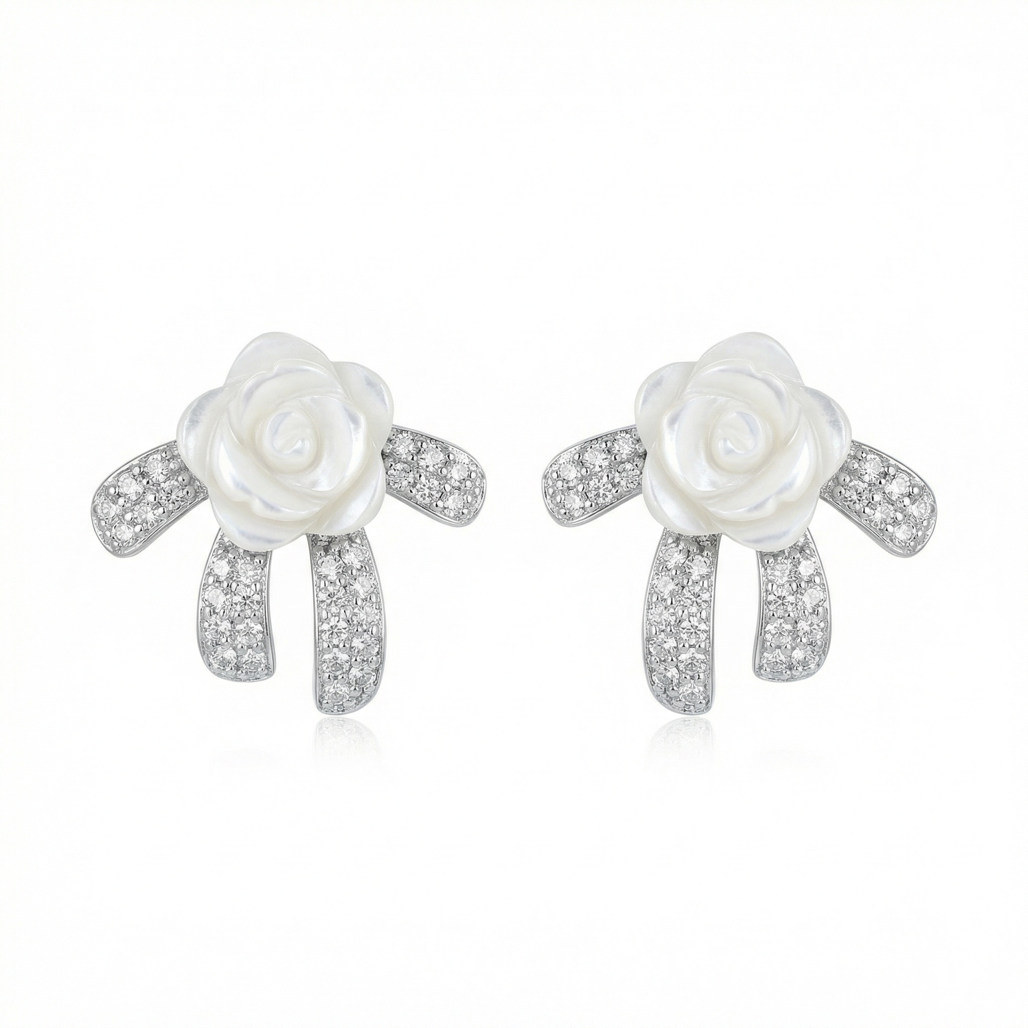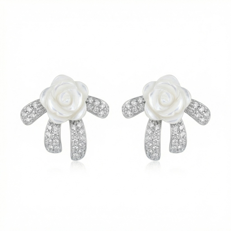 These exquisite stud earrings feature a delicate hand-carved mother-of-pearl rose as the centerpiece, radiating a soft, iridescent glow. The bloom is elegantly nestled upon a stylized silver-toned bow motif, which is meticulously pavé-set with shimmering clear crystals that catch the light from every angle. The combination of the natural, organic texture of the shell and the brilliant sparkle of the gemstones creates a romantic and sophisticated aesthetic. Perfect for adding a touch of timeless elegance to bridal attire, formal evening ensembles, or as a luxury gift for someone special. Crafted with a high-polished finish, these earrings offer a beautiful blend of vintage-inspired charm and modern grace, making them a versatile and feminine addition to any fine jewelry collection. | Brand: jewelryodm