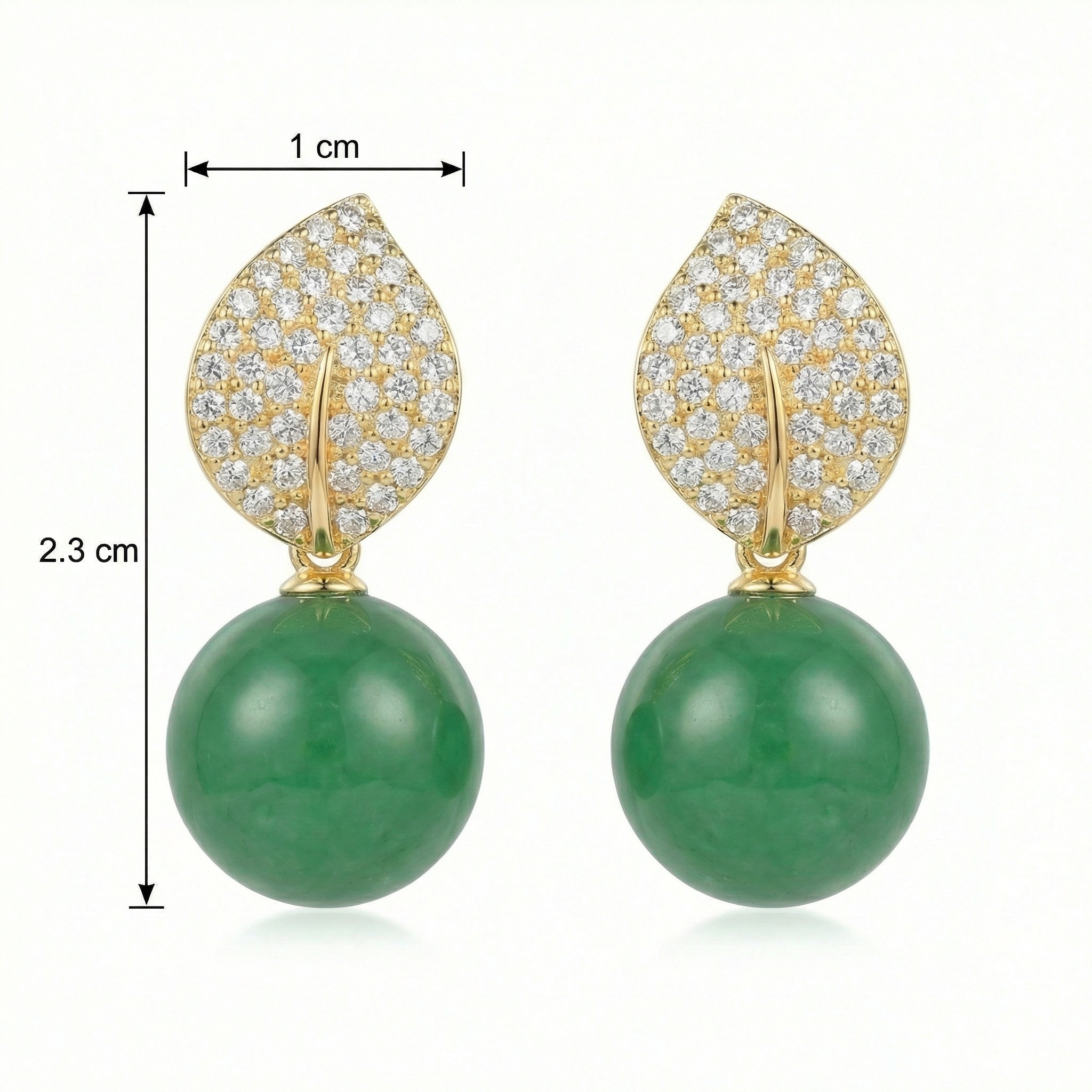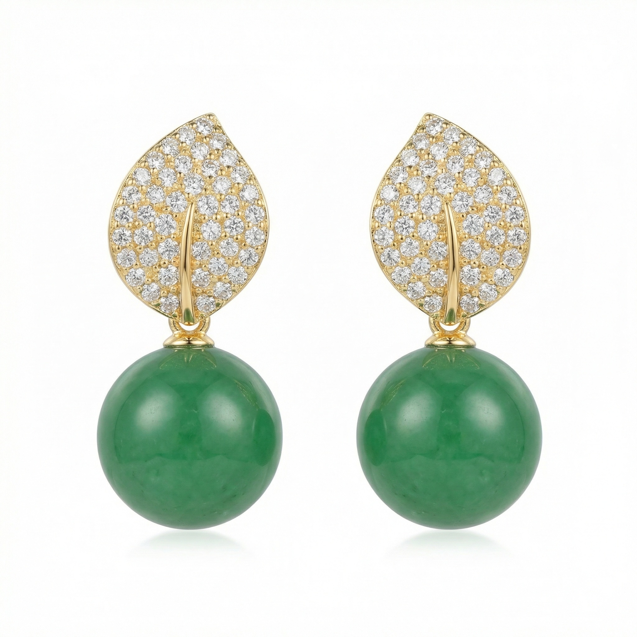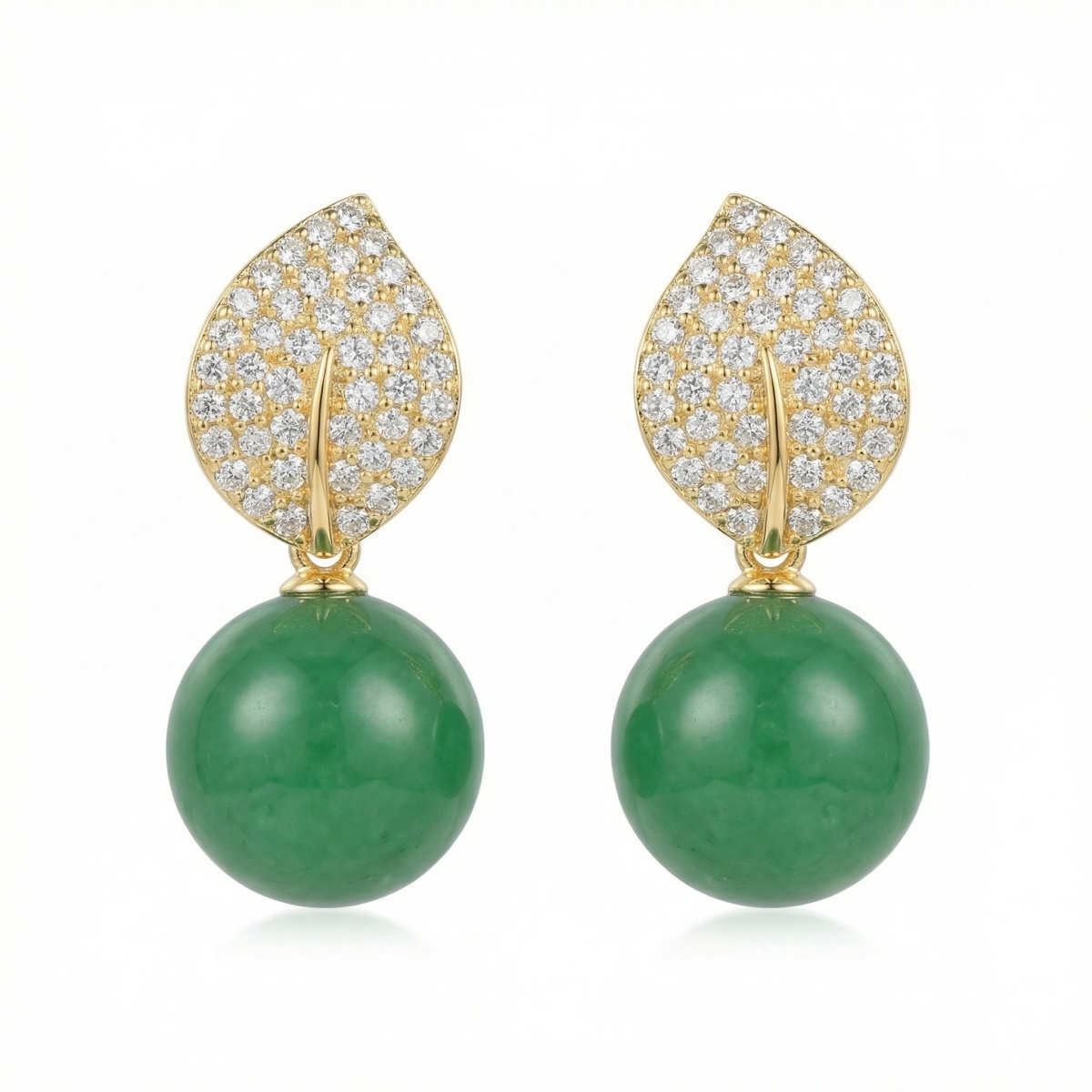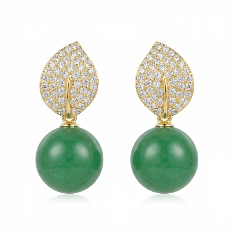These stunning drop earrings feature a captivating blend of nature-inspired design and sophisticated elegance. The top portion is meticulously crafted in a delicate leaf shape, intricately pavé-set with brilliant clear stones that catch the light from every angle. Suspending from these shimmering leaves are two magnificent, vibrant green spherical beads, reminiscent of high-quality jade. The smooth, polished finish of the green stones provides a beautiful contrast to the detailed sparkle above. These earrings are designed to add a touch of timeless luxury to any ensemble, making them a perfect choice for special occasions or to elevate everyday wear. The warm-toned metallic setting enhances the depth of the green and the brilliance of the stones, creating a harmonious and eye-catching accessory for any jewelry collection. | Brand: jewelryodm