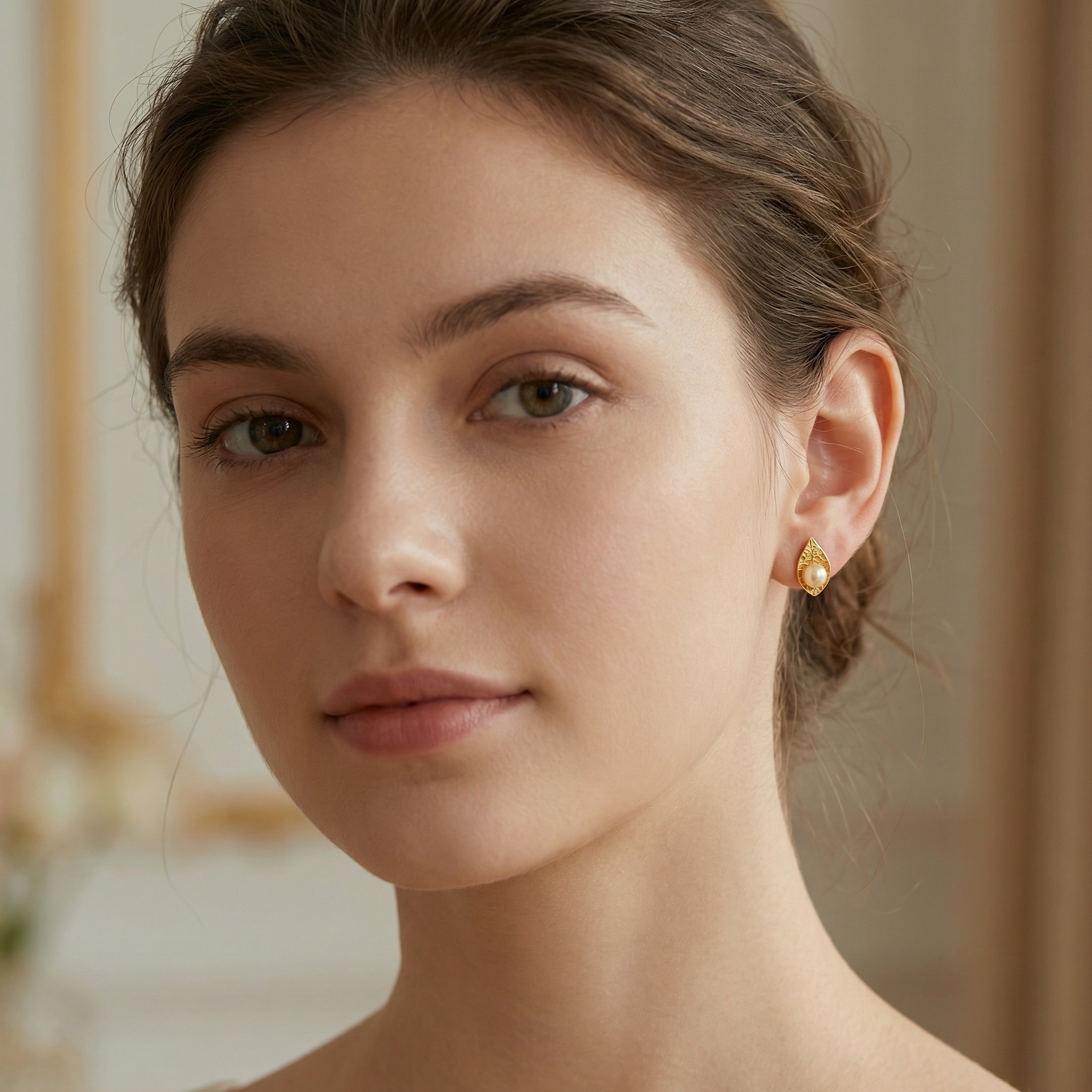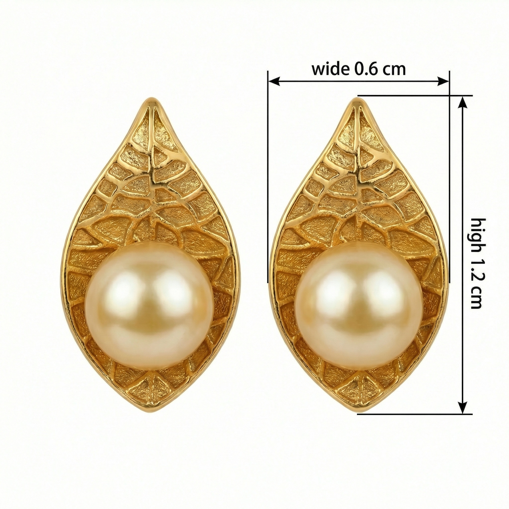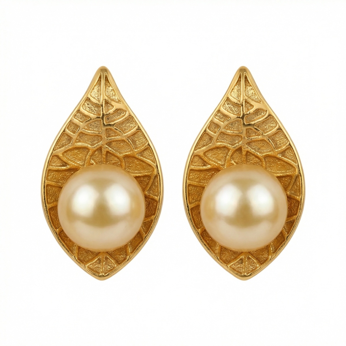 These exquisite earrings showcase a captivating teardrop silhouette, drawing inspiration from the delicate patterns found in nature. At the heart of each piece sits a magnificent, lustrous pearl with a warm, honey-toned glow. The surrounding metallic framework features a complex, web-like texture that adds depth and vintage-inspired charm. The radiant finish of the setting perfectly complements the iridescent sheen of the central pearls, creating a timeless look suitable for both formal galas and sophisticated daily wear. Meticulously crafted with a lightweight feel, these studs offer a blend of luxury and comfort. Ideal as a thoughtful gift for a special occasion or a refined addition to your personal jewelry collection, these earrings embody grace and botanical-inspired artistry. | Brand: jewelryodm