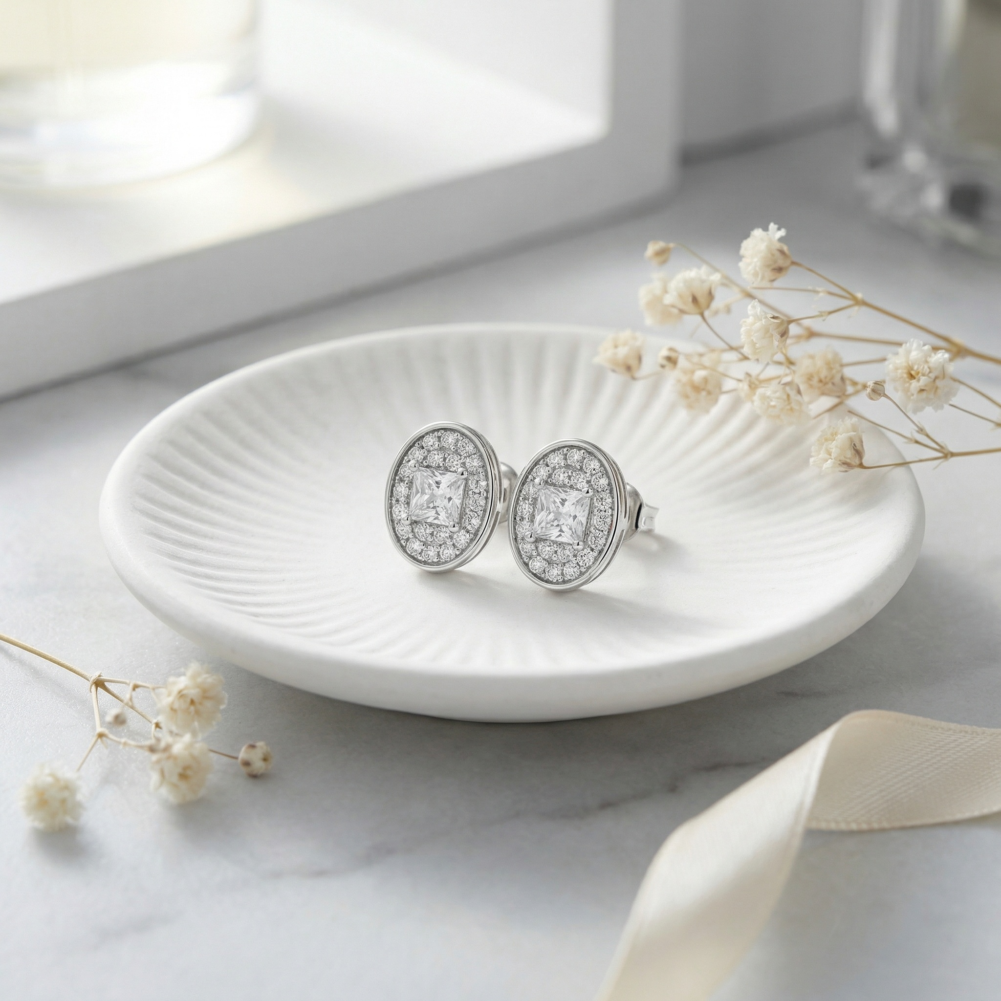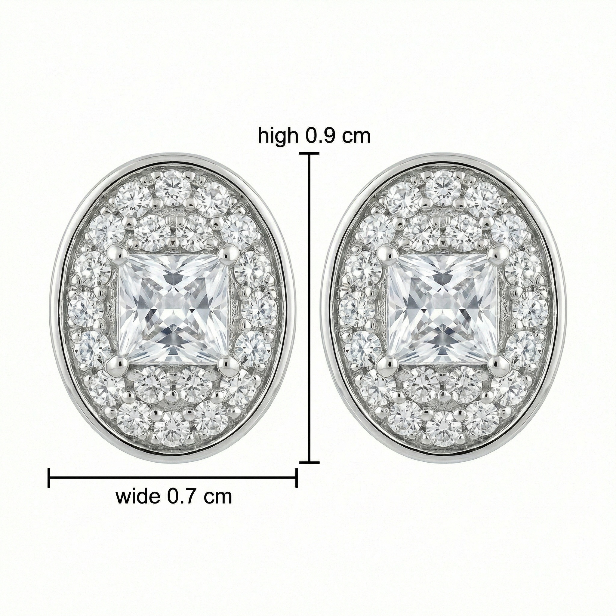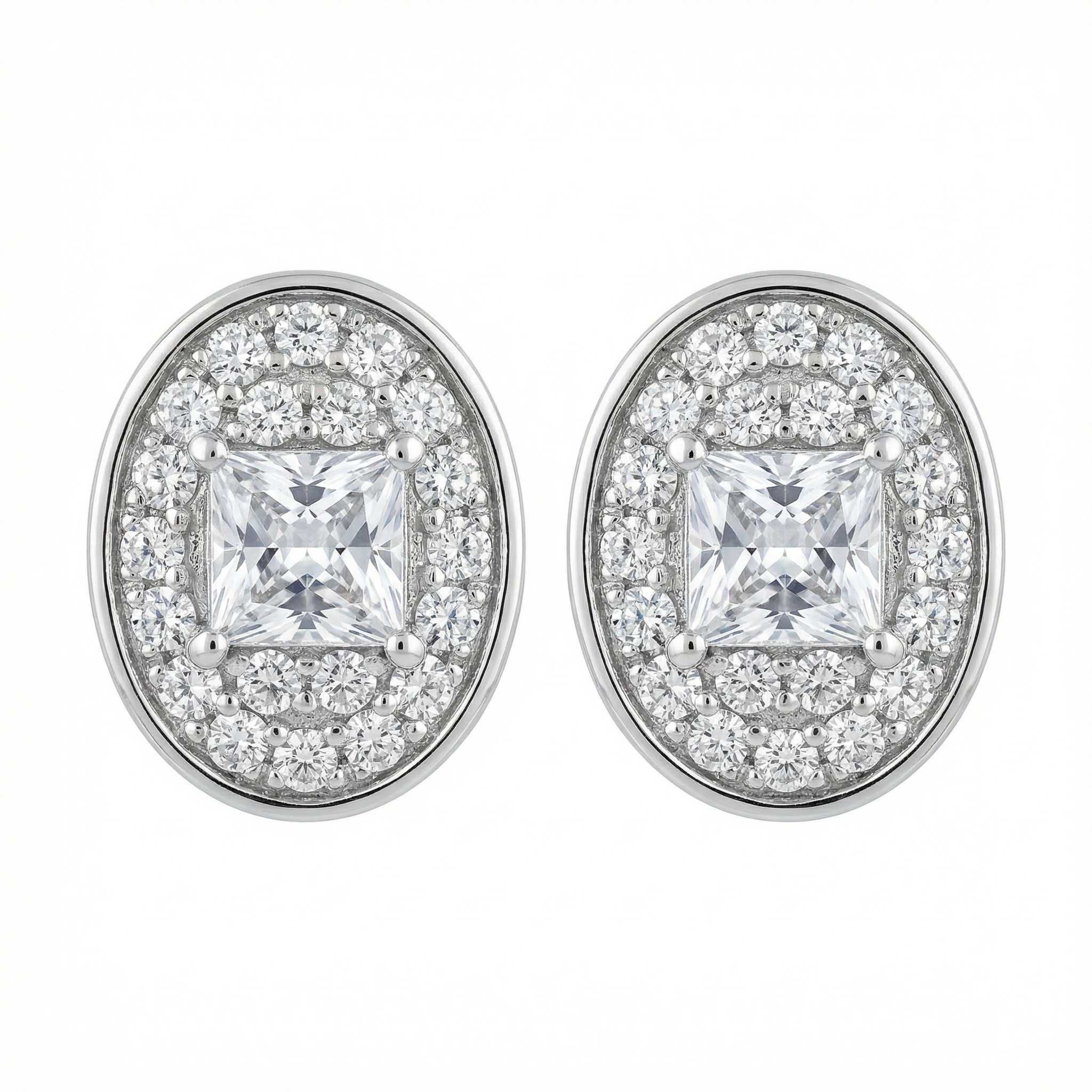 These exquisite stud earrings showcase a stunning blend of geometric shapes and brilliant sparkle. At the center of each earring sits a large, princess-cut stone, known for its sharp corners and modern appeal. Surrounding the center stone are layers of shimmering round-cut accents, creating a rich halo effect that enhances the overall radiance. The entire cluster is elegantly enclosed within a polished oval-shaped border crafted from high-quality silver-tone metal. Perfect for both formal occasions and adding a touch of glamour to everyday wear, these earrings offer a timeless design that reflects light from every angle. The secure post backs ensure comfortable and reliable wear. Whether as a gift for a loved one or a treat for yourself, these oval halo studs are a sophisticated and dazzling addition to any jewelry collection. | Brand: jewelryodm