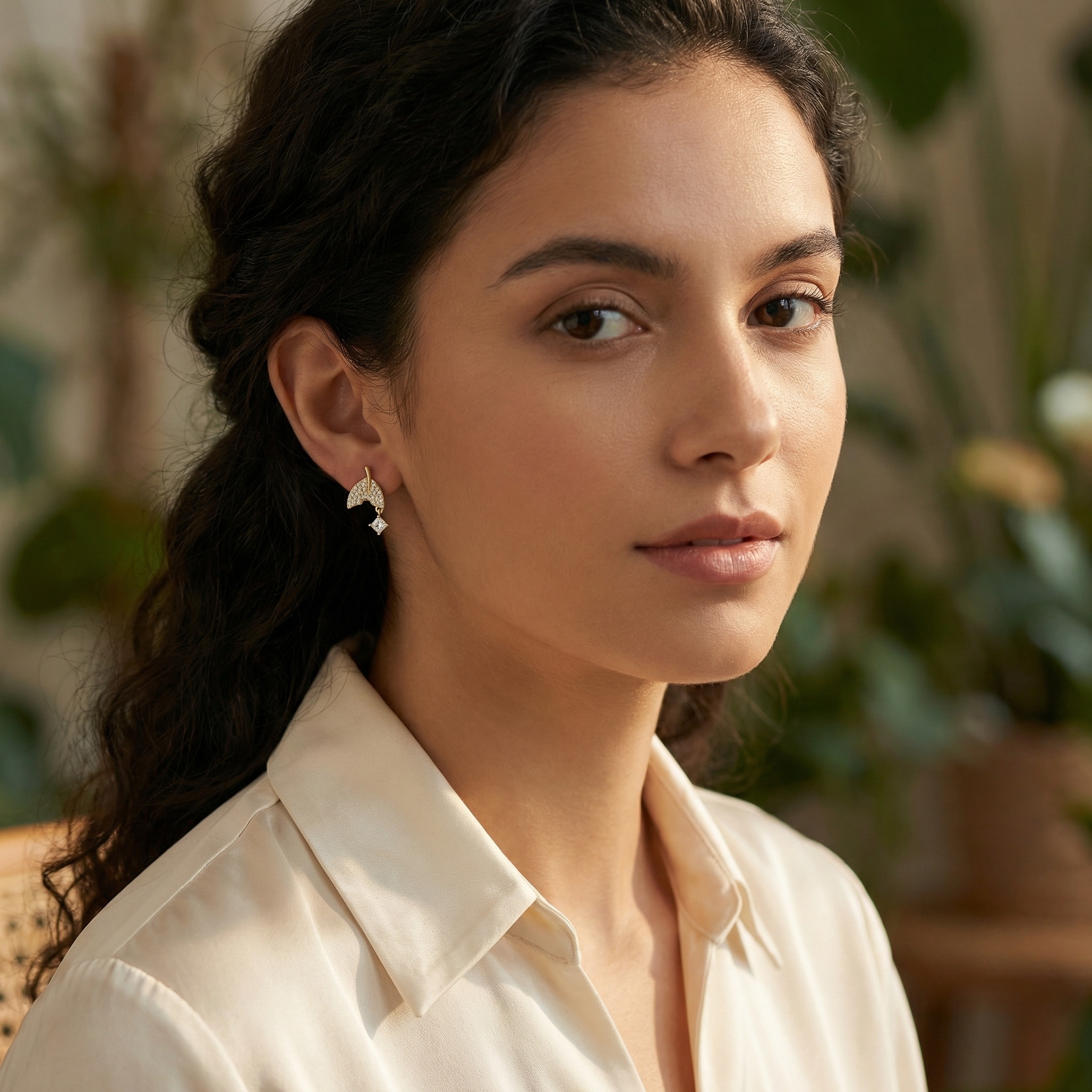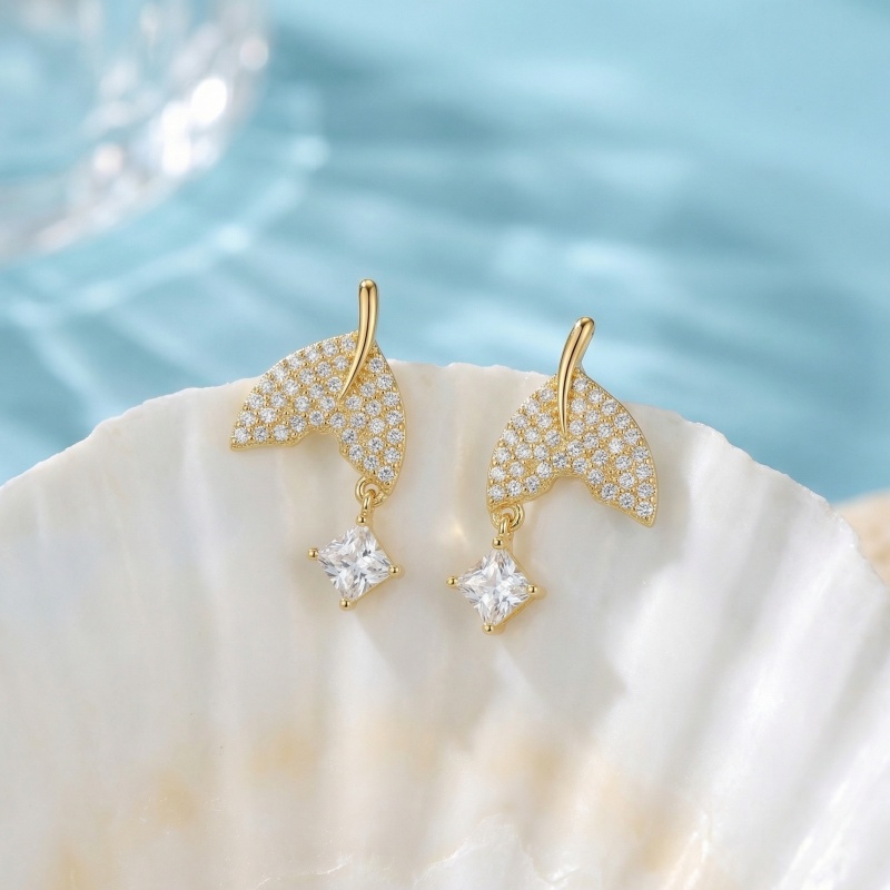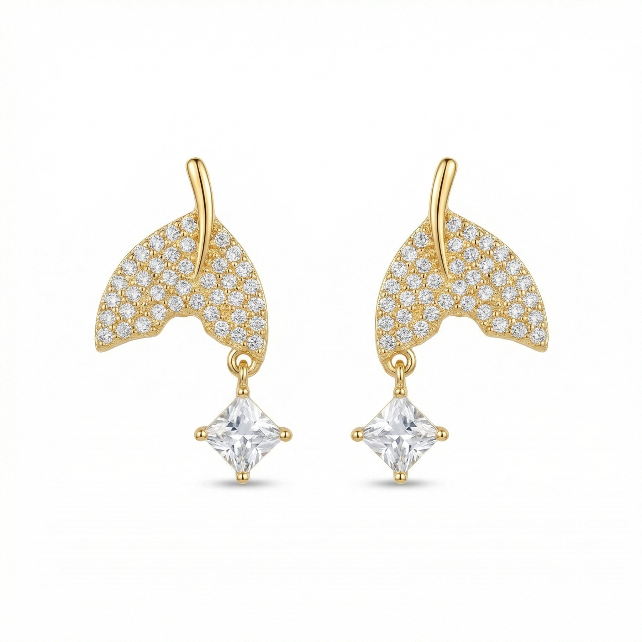 Capture the majesty of the ocean with these exquisite whale tail dangle earrings. Each piece features a beautifully curved tail design, meticulously set with shimmering micro-pavé stones that glitter brilliantly. Suspended beneath is a dazzling princess-cut crystal, providing a sophisticated geometric contrast and fluid movement. Finished in a lustrous metallic polish, these earrings are the perfect accessory for adding a touch of nautical charm to any ensemble. Whether for a formal event or an everyday style boost, their lightweight design ensures comfort without compromising on elegance. An ideal choice for those who love marine life or unique statement jewelry, these radiant earrings evoke the spirit of the deep blue. | Brand: jewelryodm