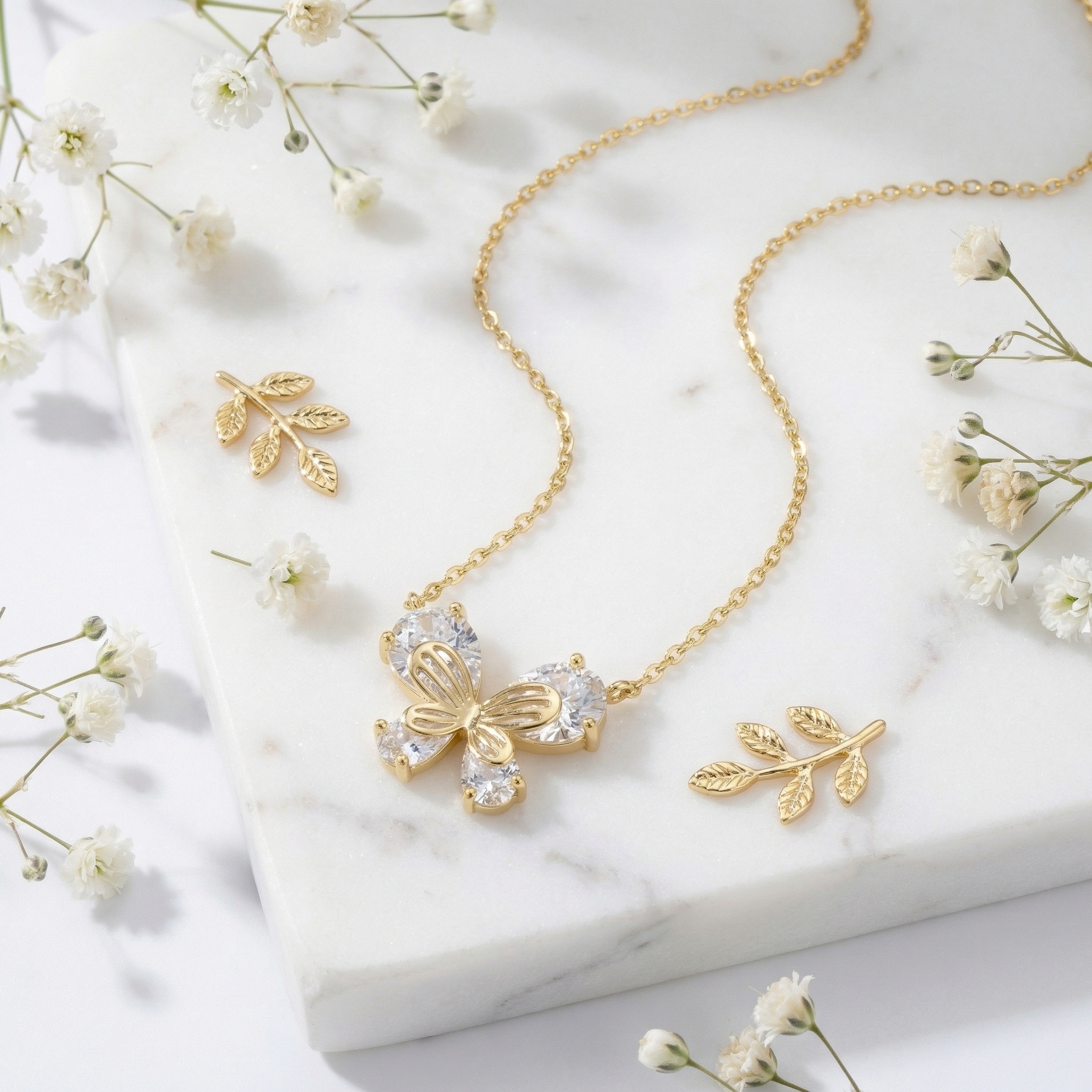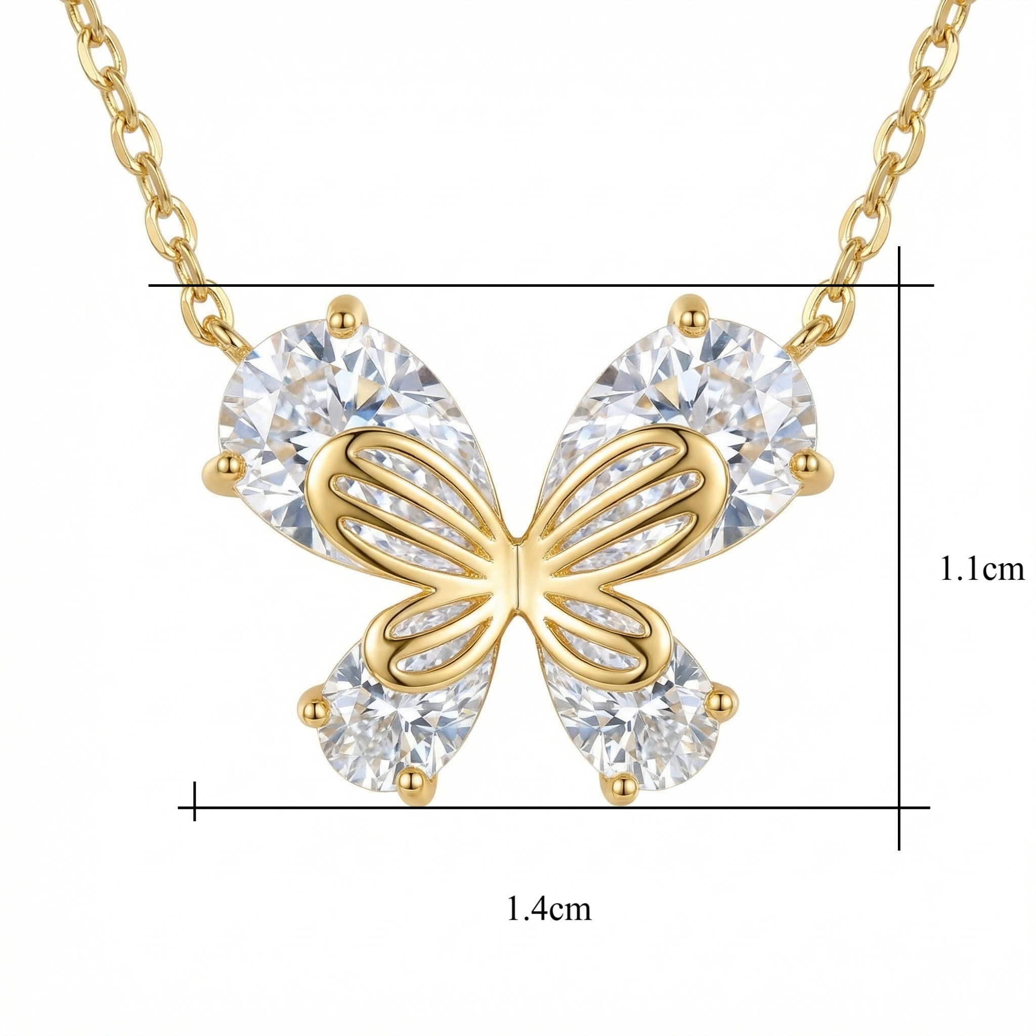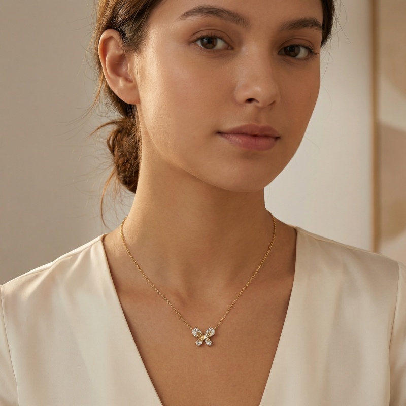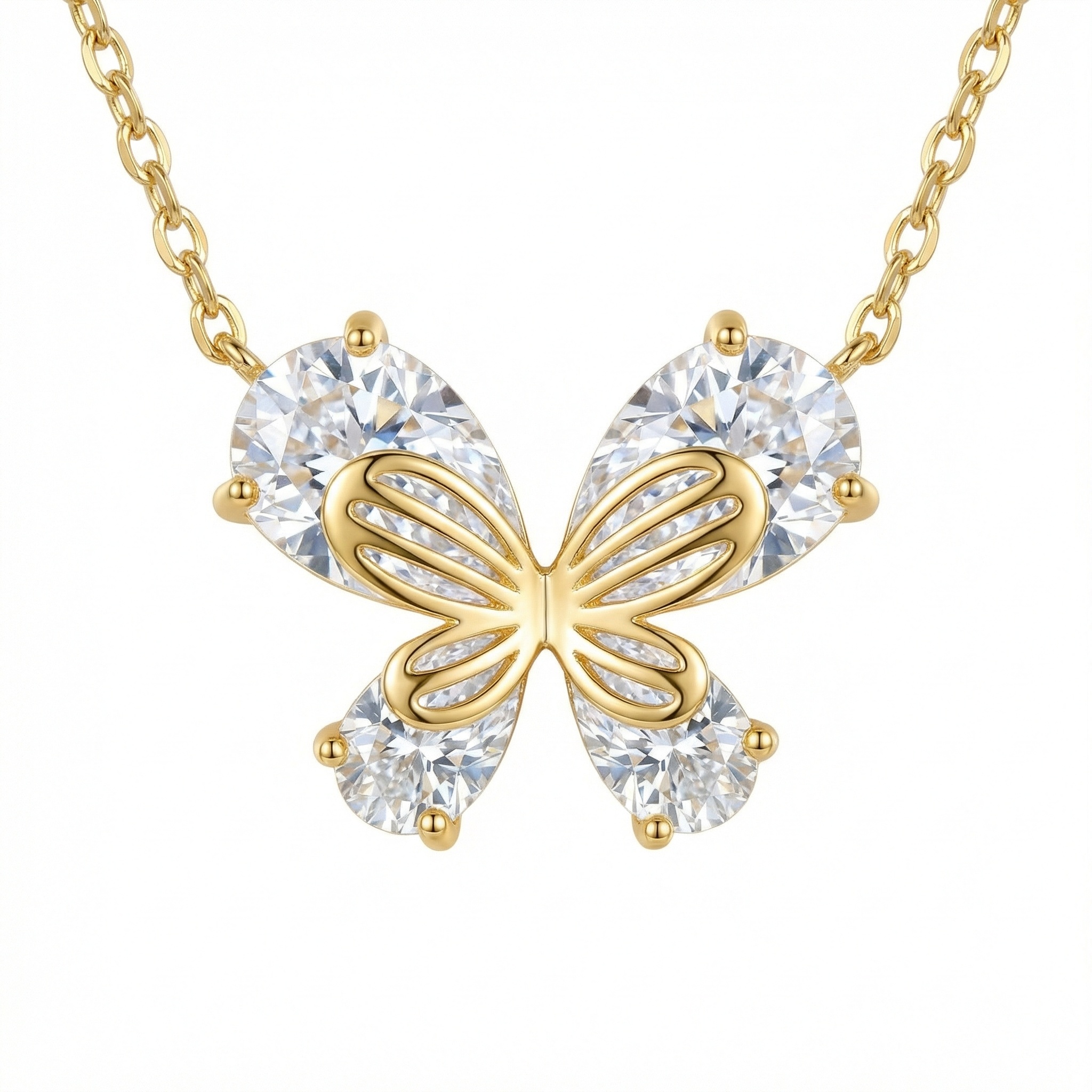 This exquisite necklace captures the ethereal beauty of a butterfly in flight. It features four brilliant pear-cut crystals that form the shimmering wings, designed to catch and reflect light with every movement. A polished metallic filigree overlay adds depth and detail, tracing the intricate patterns of the butterfly's body and wings. The warm metallic finish provides a classic contrast against the clear, radiant stones, making it a versatile accessory for any outfit. Suspended from a delicate matching chain, this pendant serves as a meaningful symbol of grace and transformation. It is an ideal gift for nature lovers or anyone looking to add a touch of sparkle and whimsical charm to their jewelry collection. | Brand: jewelryodm