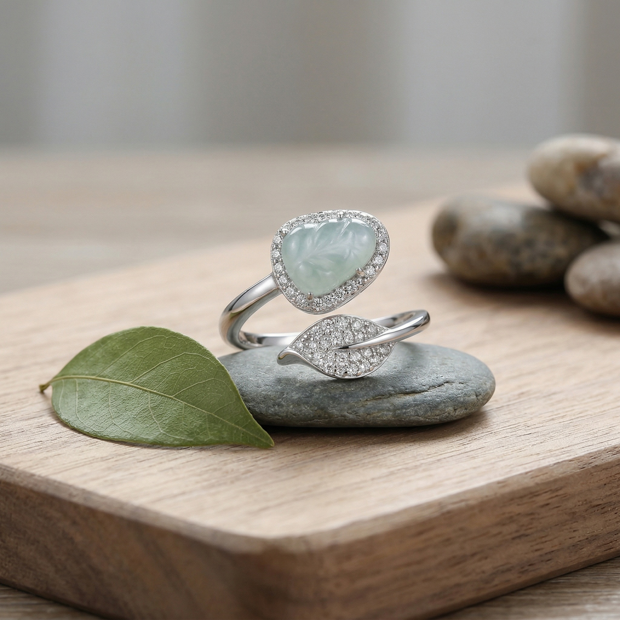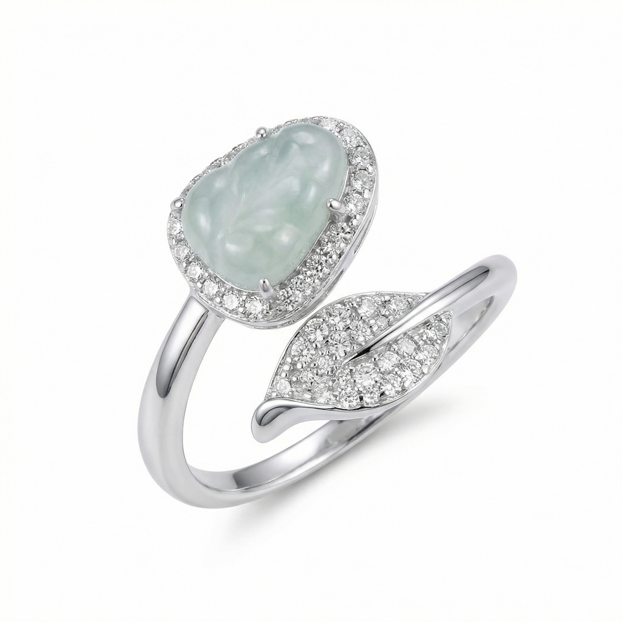 This stunning ring features a brilliant pear-cut light blue gemstone, reminiscent of clear ocean waters, elegantly set within a sparkling halo of white pavé stones. Crafted from polished silver-toned metal, the band showcases a sophisticated bypass design that gracefully wraps around the finger. Opposite the central gem, a delicate leaf-shaped motif is intricately encrusted with shimmering accents, adding a touch of nature-inspired beauty to the piece. This exquisite combination of a classic pear shape and a contemporary botanical element creates a unique and romantic silhouette. Perfect for special occasions or as a timeless gift, this ring blends luxury with artistic flair, offering a radiant sparkle from every angle. Its refined craftsmanship and serene color palette make it a standout accessory for any jewelry collection. | Brand: jewelryodm