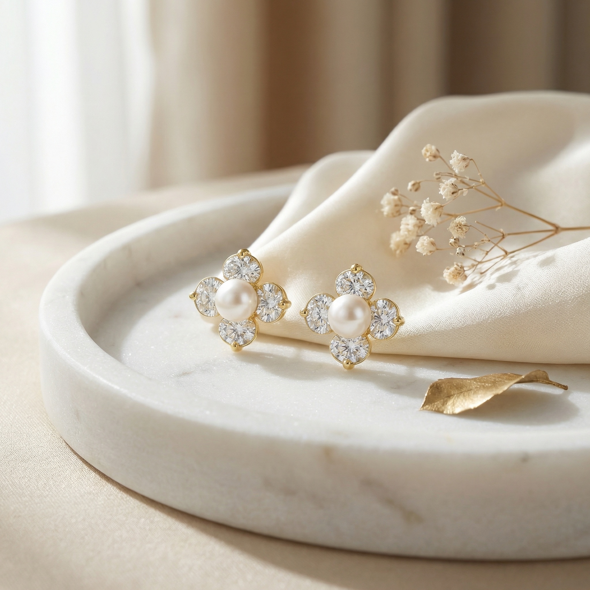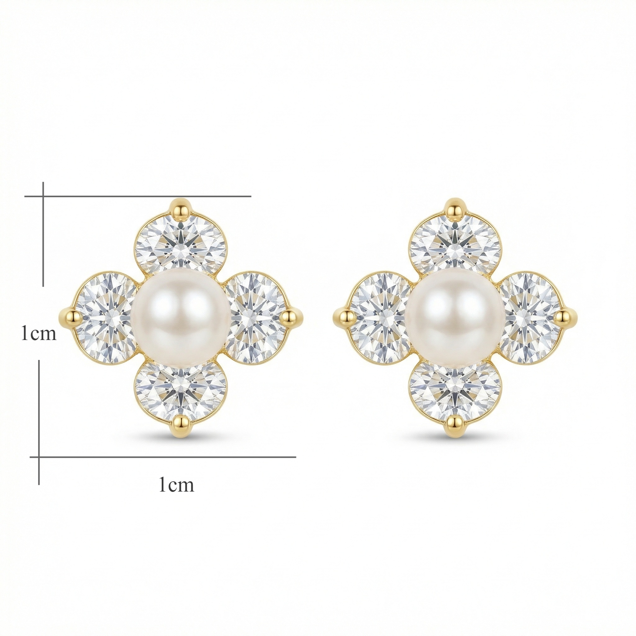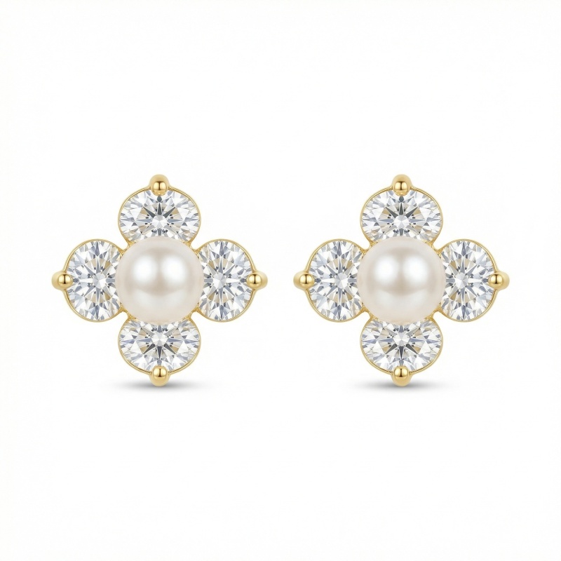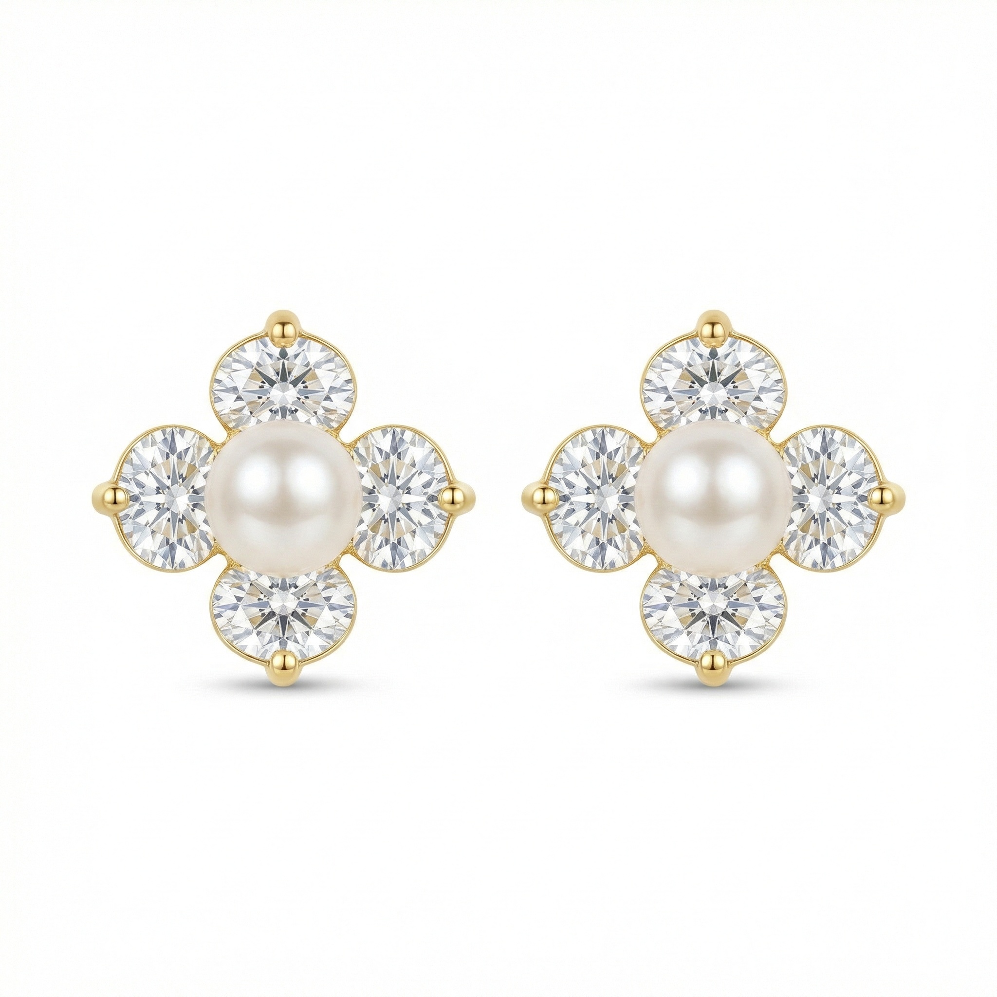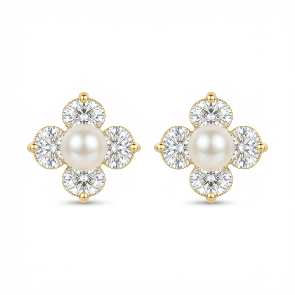 These exquisite stud earrings feature a timeless design that blends classic elegance with modern brilliance. At the heart of each earring sits a lustrous, creamy white pearl, radiating a soft and sophisticated glow. Surrounding the center pearl are four brilliant round-cut gemstones, meticulously set to form a delicate floral or clover-shaped motif. The shimmering stones capture the light from every angle, providing a stunning contrast to the smooth surface of the pearl. Crafted in a rich yellow-toned metal, these earrings offer a warm and luxurious aesthetic. The secure post backs ensure a comfortable fit for all-day wear. Whether you are dressing up for a special occasion or adding a touch of glamour to your everyday attire, these floral-inspired studs are a versatile and enchanting choice. They make a perfect gift for those who appreciate refined jewelry with a feminine touch. | Brand: jewelryodm