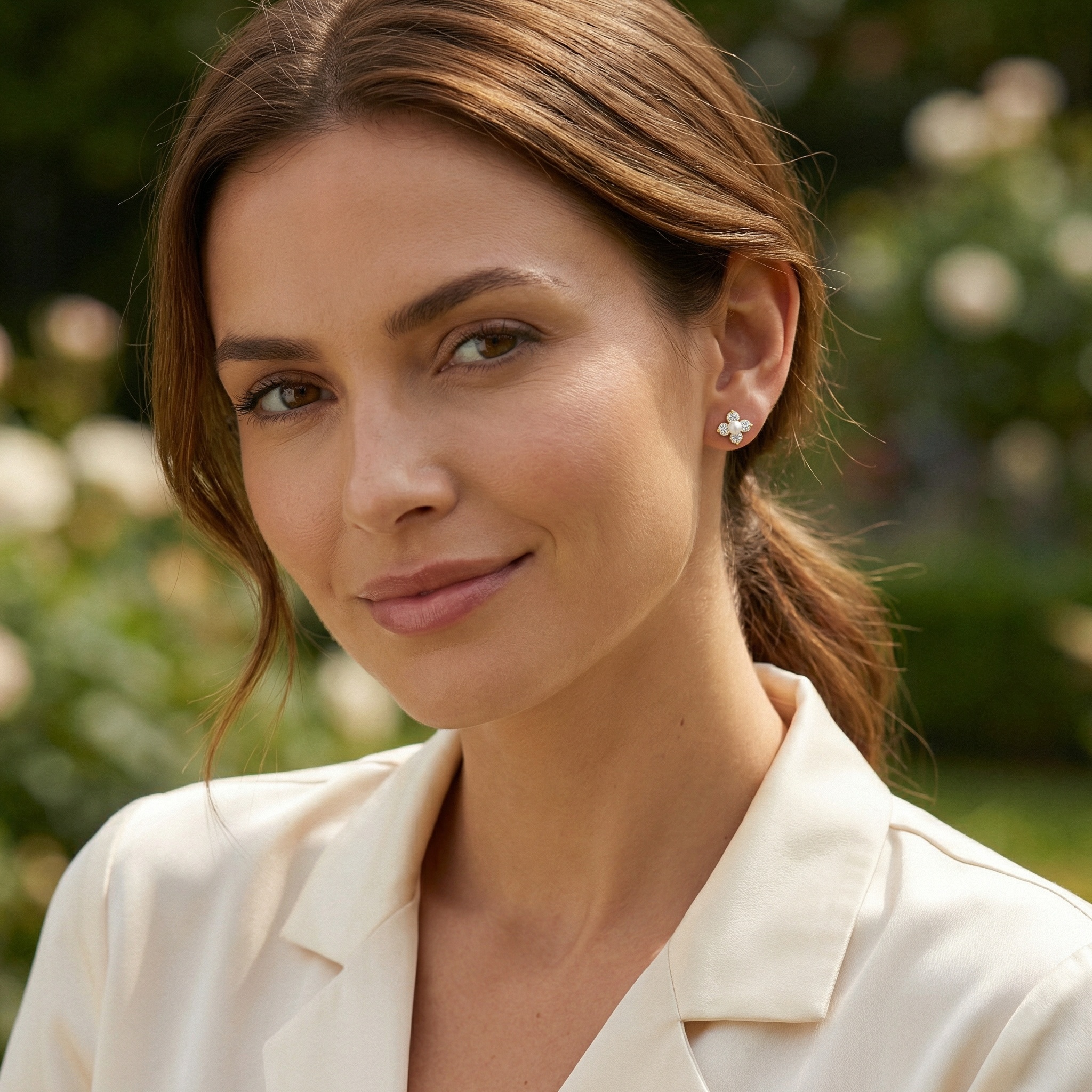 925 Sterling Silver Elegant Pearl and Brilliant Round Gemstone Floral Clover Stud Earrings