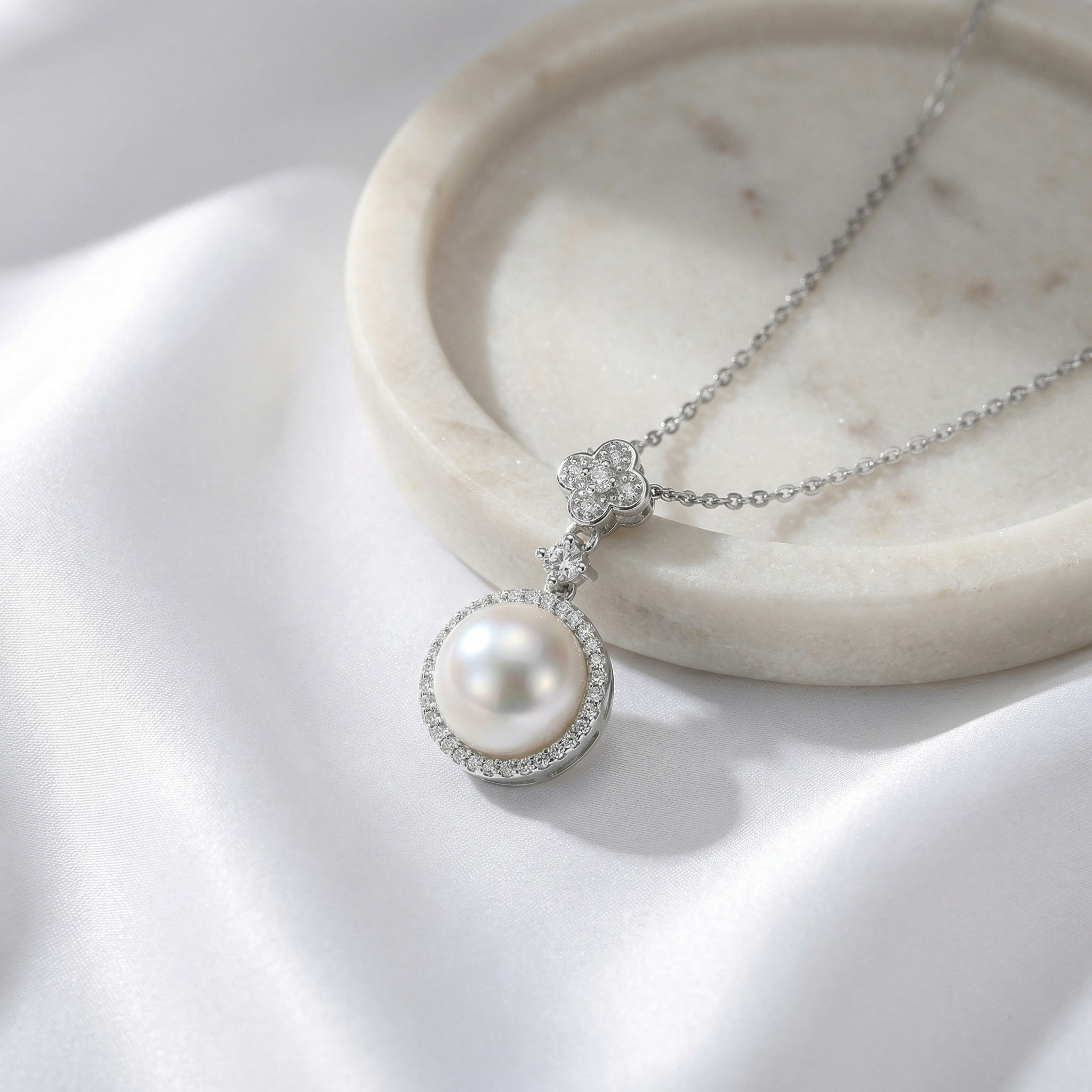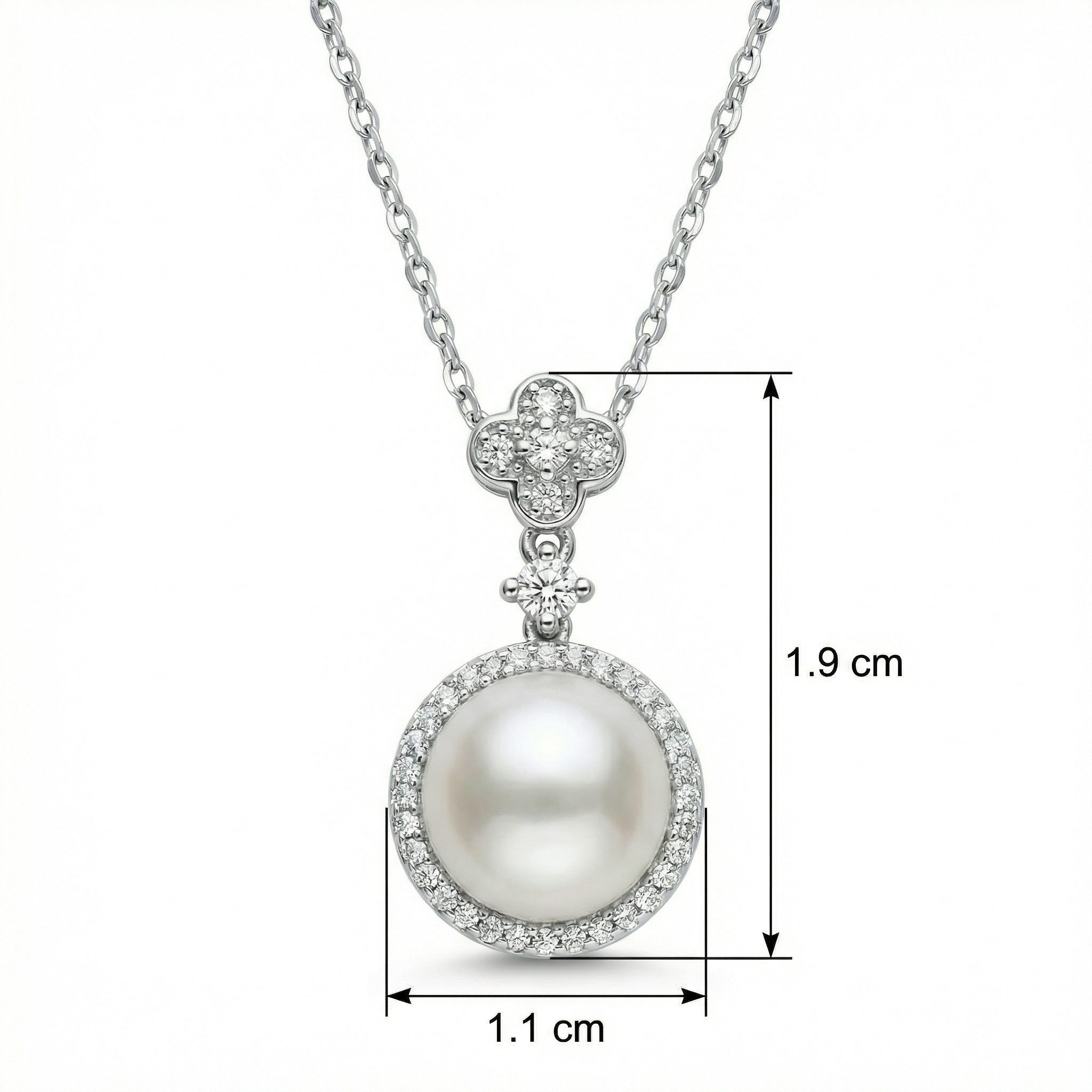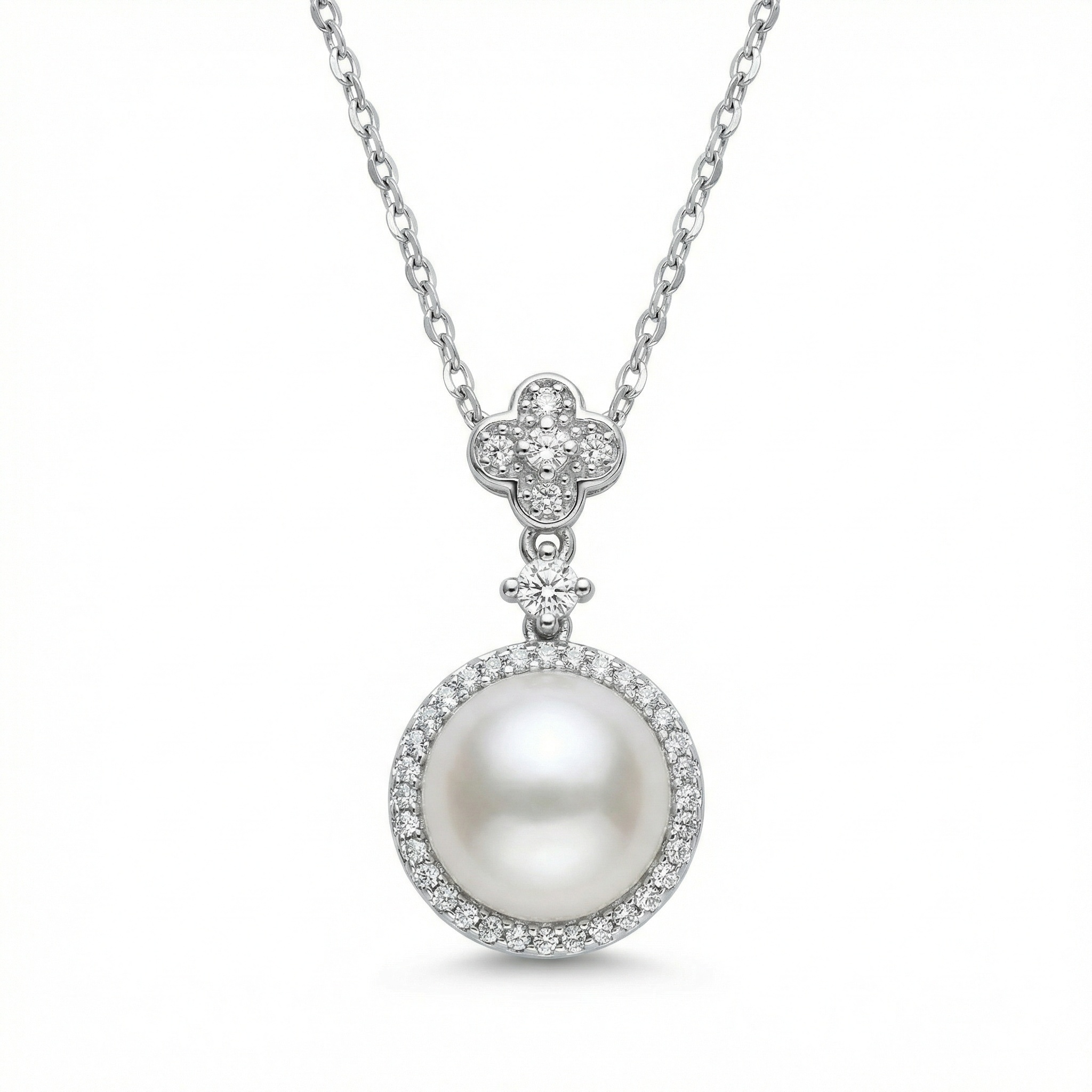 This exquisite necklace features a luminous, round white pearl at its center, framed by a shimmering halo of brilliant-cut diamonds that enhance its natural luster. The pendant is suspended from a delicate silver-tone cable chain and includes a sophisticated floral-inspired bail, intricately crafted in a quatrefoil pattern and pavé-set with sparkling diamonds. A single, larger diamond sits gracefully between the floral motif and the pearl, creating a seamless and elegant transition. This timeless piece blends classic sophistication with intricate craftsmanship, making it an ideal choice for bridal wear, formal occasions, or as a luxurious gift. Its refined design and radiant sparkle ensure it remains a cherished staple in any high-end jewelry collection. | Brand: jewelryodm