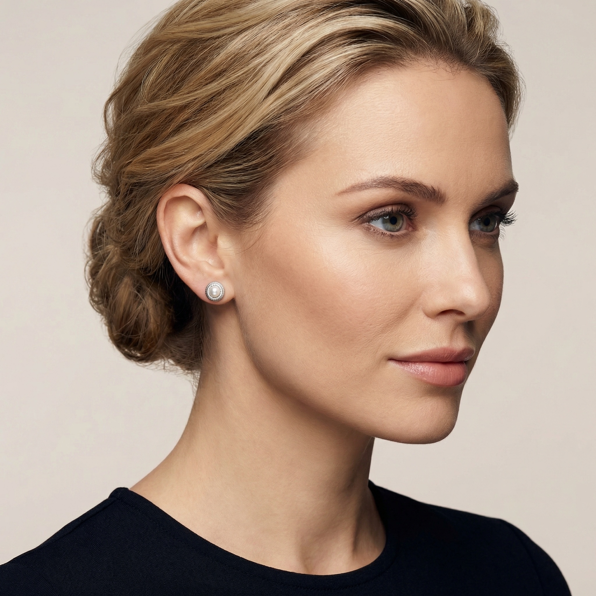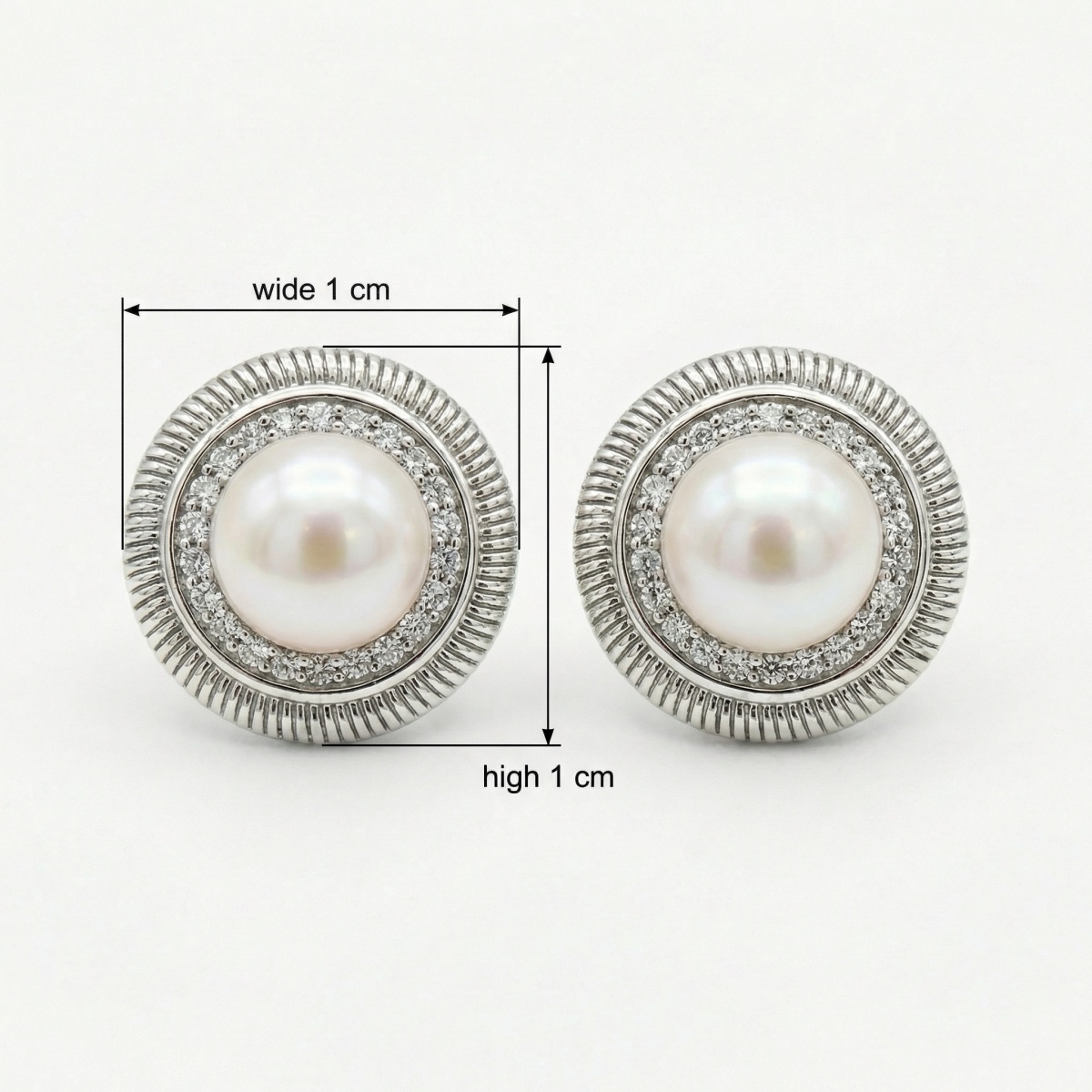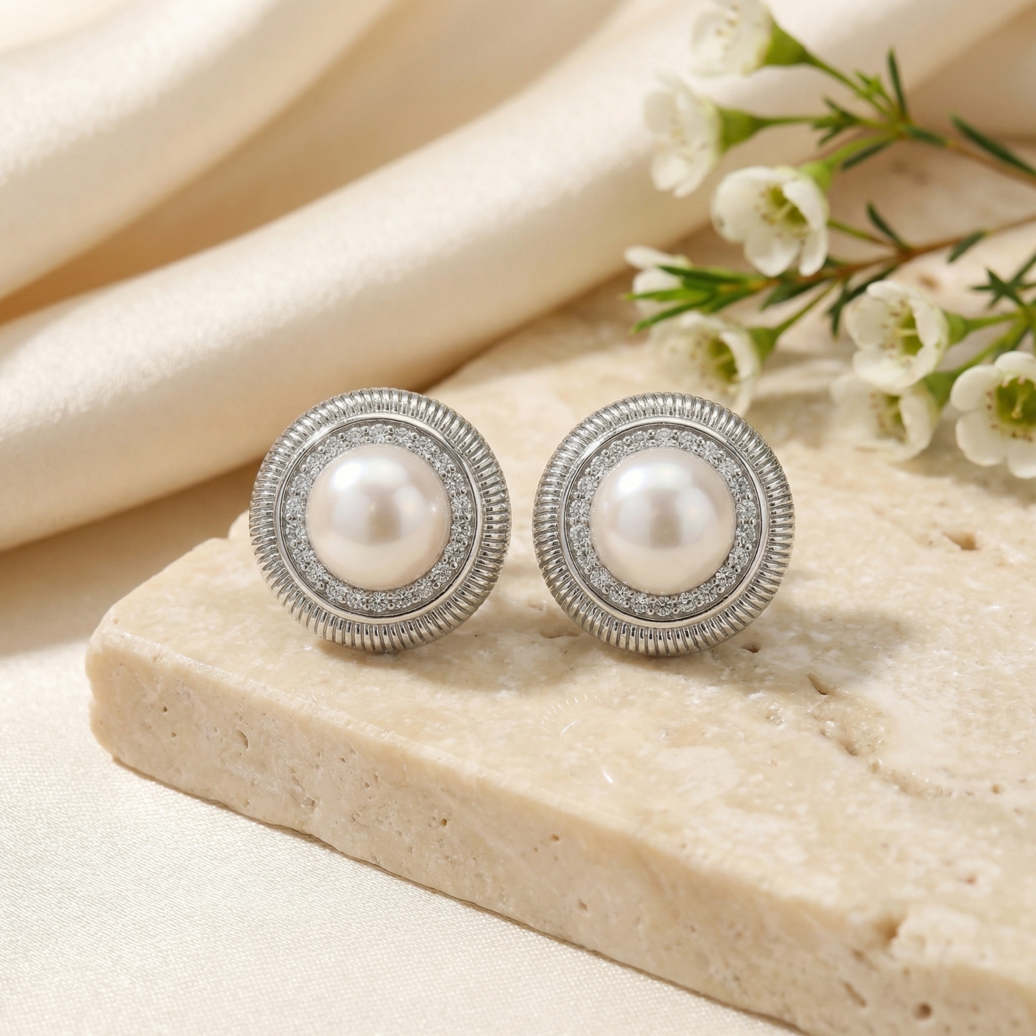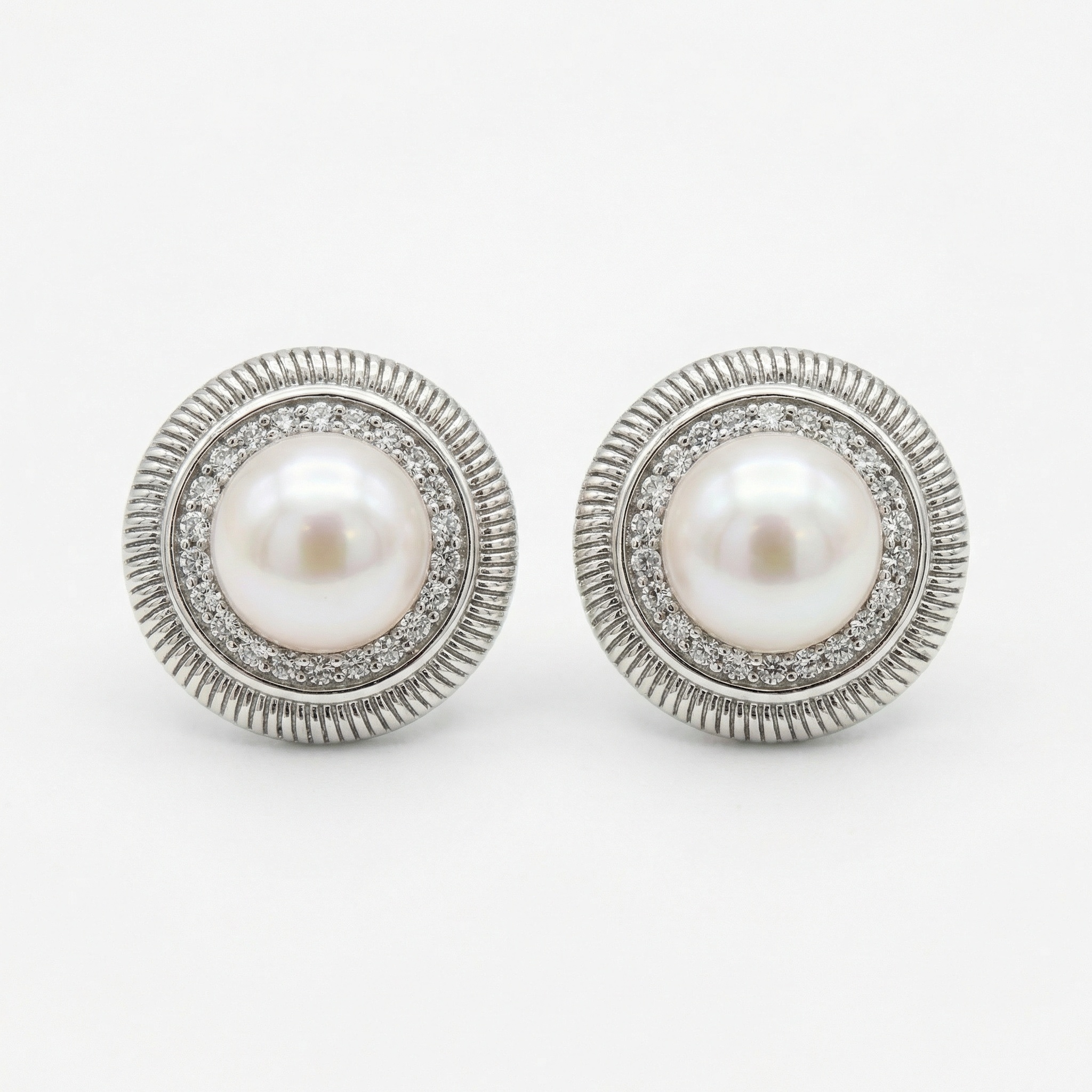 These exquisite stud earrings feature a pair of luminous, round white pearls as their centerpiece. Each pearl is encircled by a sparkling halo of finely set round-cut stones, adding a touch of brilliance and luxury. The entire composition is encased within a sophisticated silver-toned metal frame, characterized by its distinctive ribbed or gadroon-textured outer edge. This combination of classic pearl elegance and intricate textured metalwork creates a timeless, vintage-inspired look. Perfectly suited for bridal wear, formal evening events, or adding a refined touch to everyday attire, these earrings offer a balanced blend of soft luster and brilliant shine. The high-quality craftsmanship and polished finish make them a versatile and elegant addition to any jewelry collection. | Brand: jewelryodm
