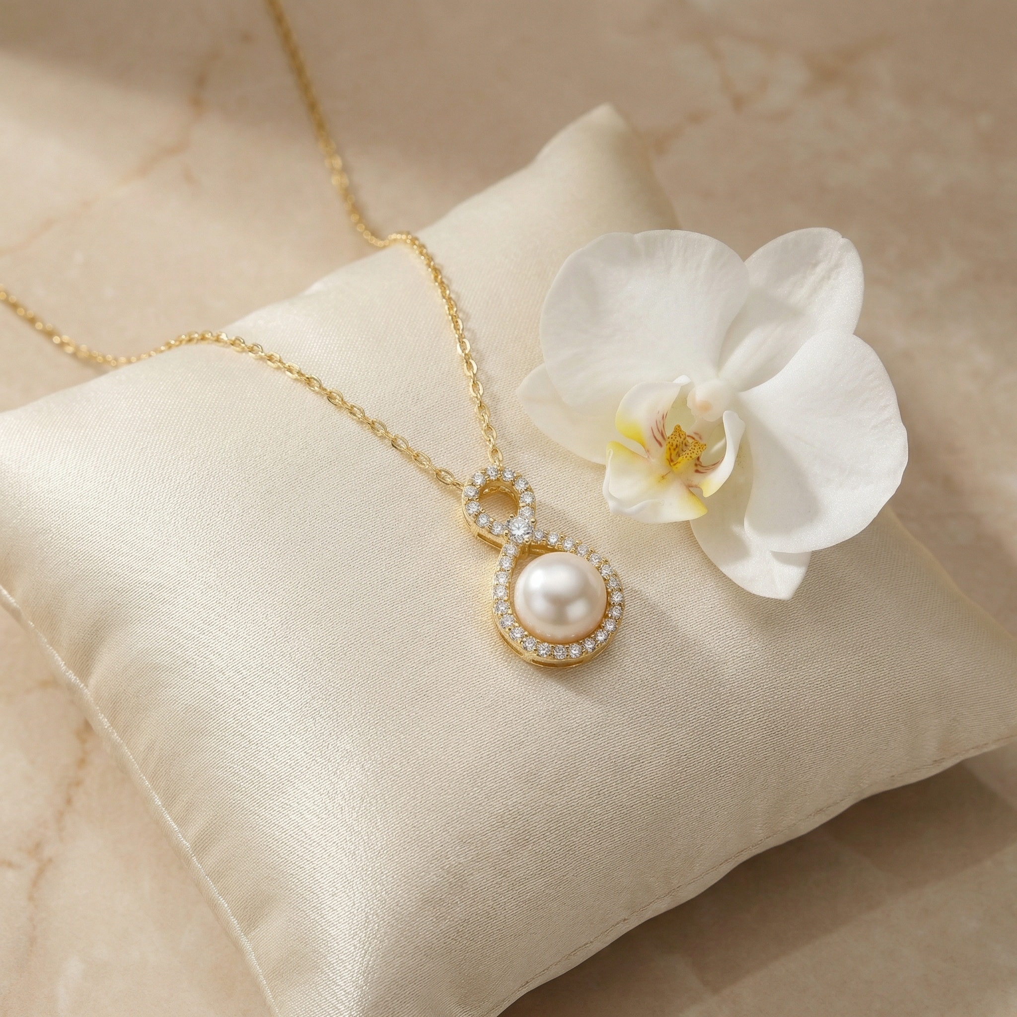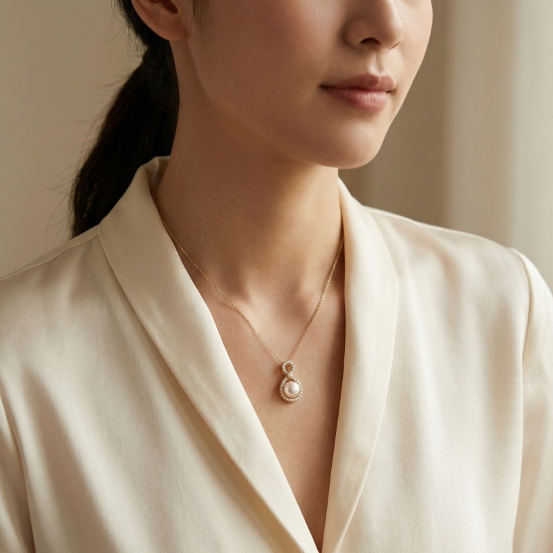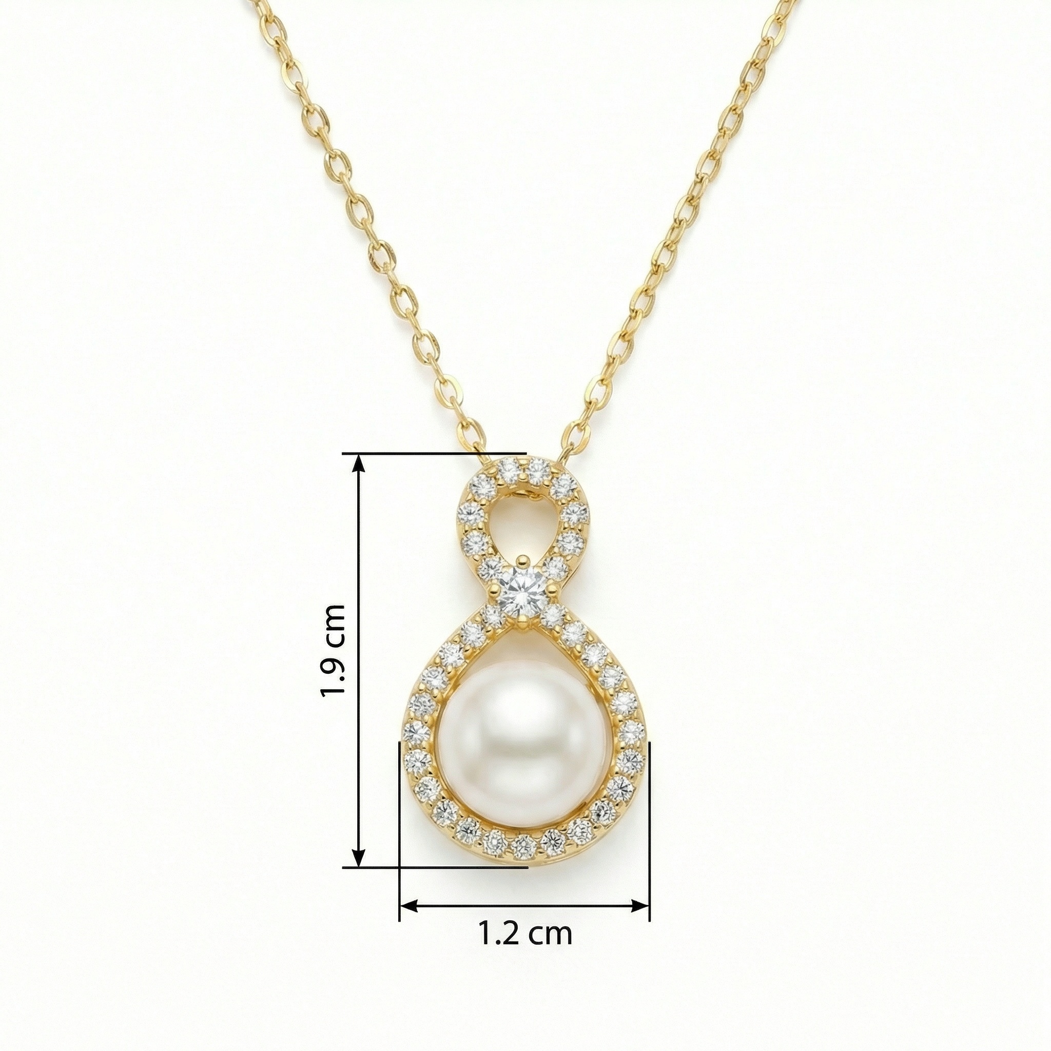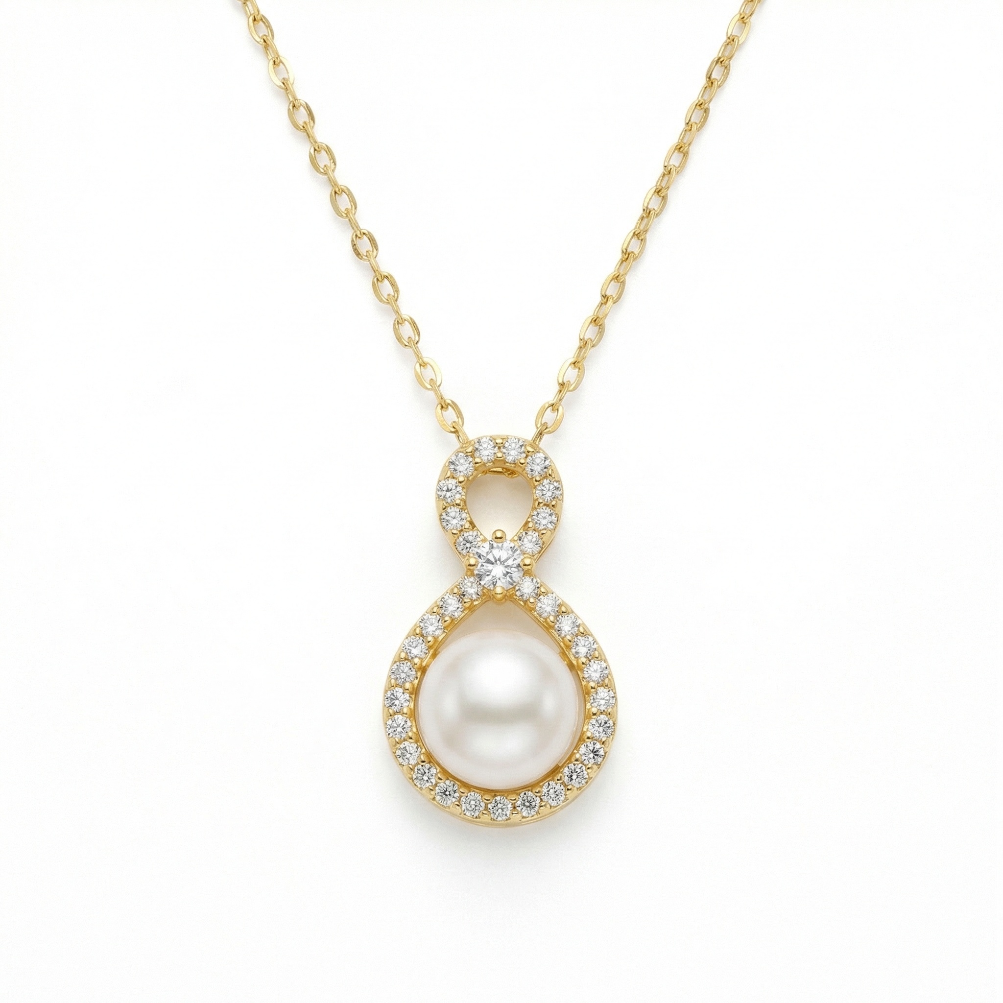 This exquisite necklace features a timeless figure-eight pendant, symbolizing eternity and grace. At the heart of the lower loop sits a stunning, lustrous white pearl, beautifully framed by a halo of shimmering round-cut diamonds. The upper loop is also delicately pavé-set with diamonds, meeting at a central focal point highlighted by a larger, brilliant diamond. Crafted in a warm-toned precious metal, the pendant hangs elegantly from a matching fine link chain. The combination of the classic pearl and the modern infinity silhouette makes this piece a perfect accessory for weddings, special anniversaries, or sophisticated evening wear. Its balanced design radiates luxury and refined taste, ensuring it remains a cherished staple in any jewelry collection. | Brand: jewelryodm