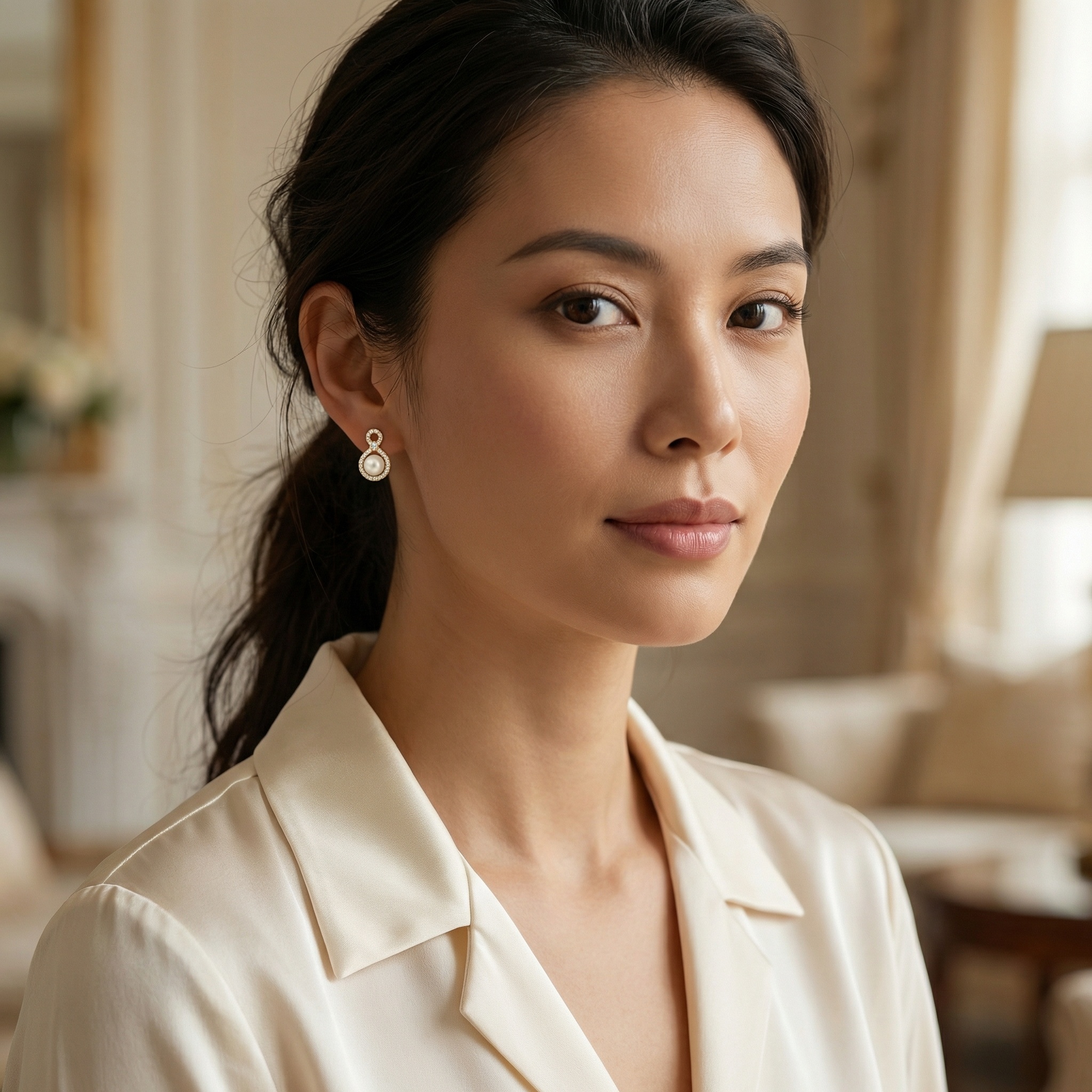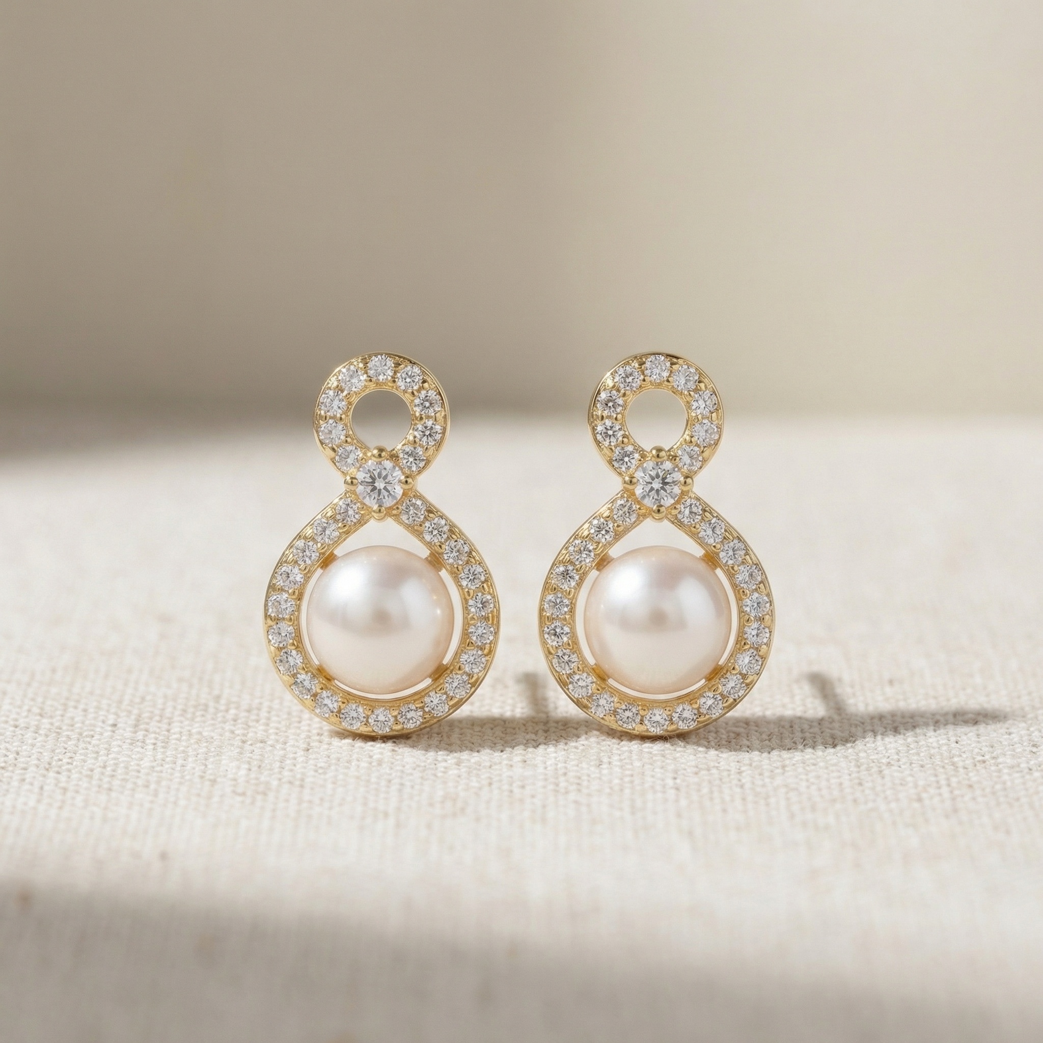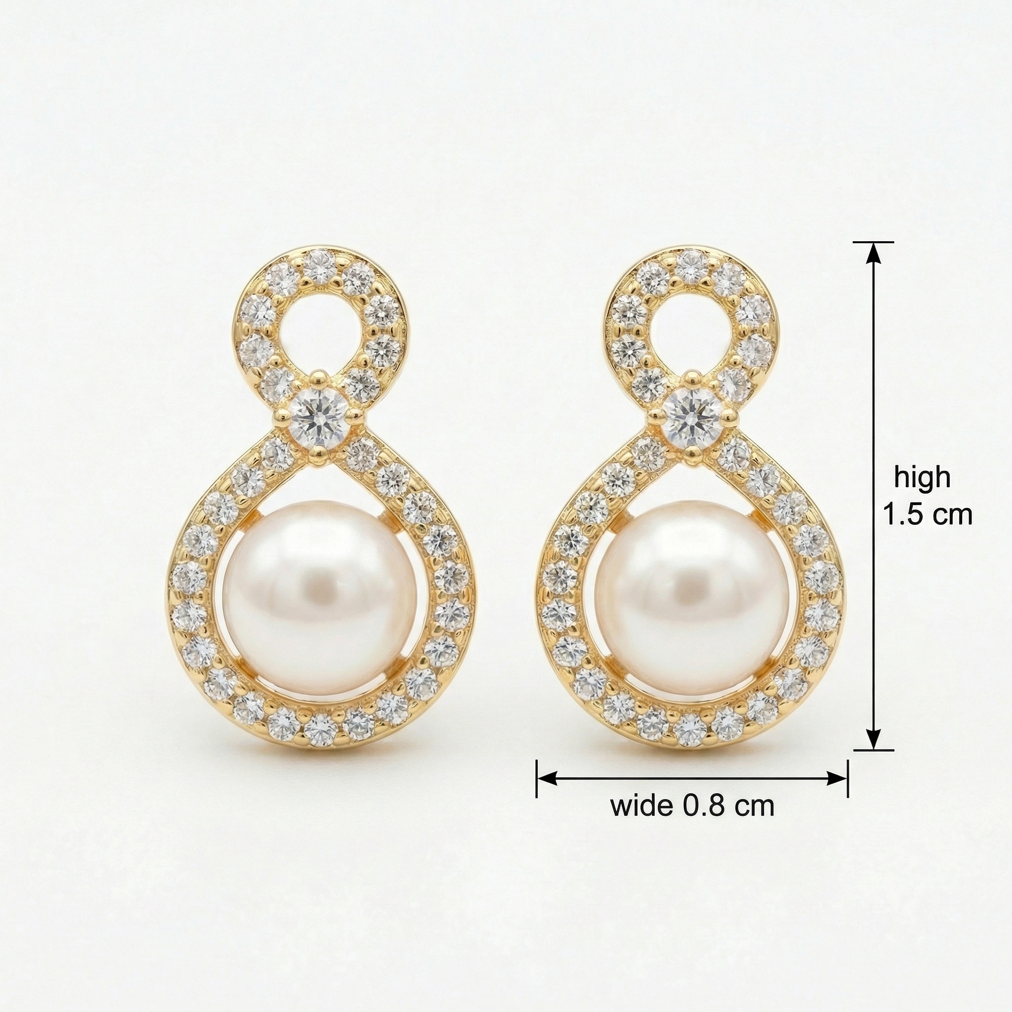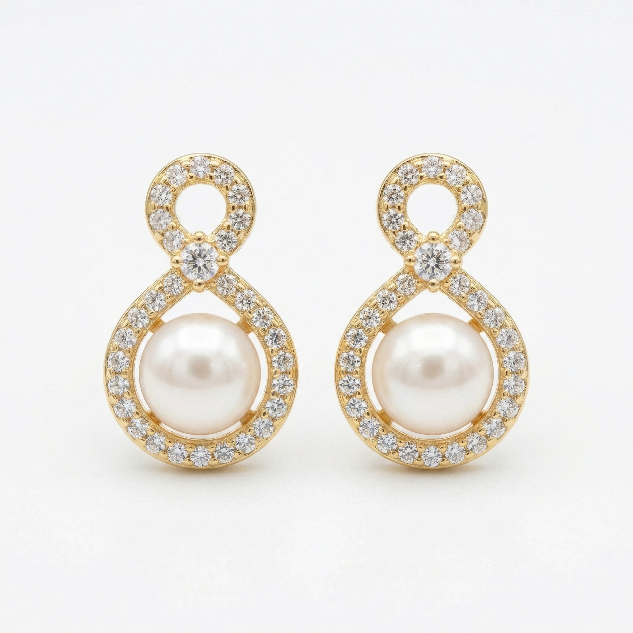 These exquisite stud earrings feature a unique figure-eight design, blending timeless elegance with contemporary style. Each earring showcases a perfectly round, lustrous pearl nestled within a teardrop-shaped frame. The frame is meticulously adorned with shimmering round-cut diamonds that continue up into a smaller circular loop, creating a graceful infinity silhouette. A larger central diamond sits at the intersection, adding an extra touch of brilliance. Crafted in a warm, polished precious metal, these earrings offer a sophisticated sparkle that beautifully complements any outfit. Whether worn for a special occasion or as a daily statement of luxury, these pearl and diamond accessories represent eternal beauty and refined craftsmanship. The secure backing ensures a comfortable and secure fit for all-day elegance and poise. | Brand: jewelryodm