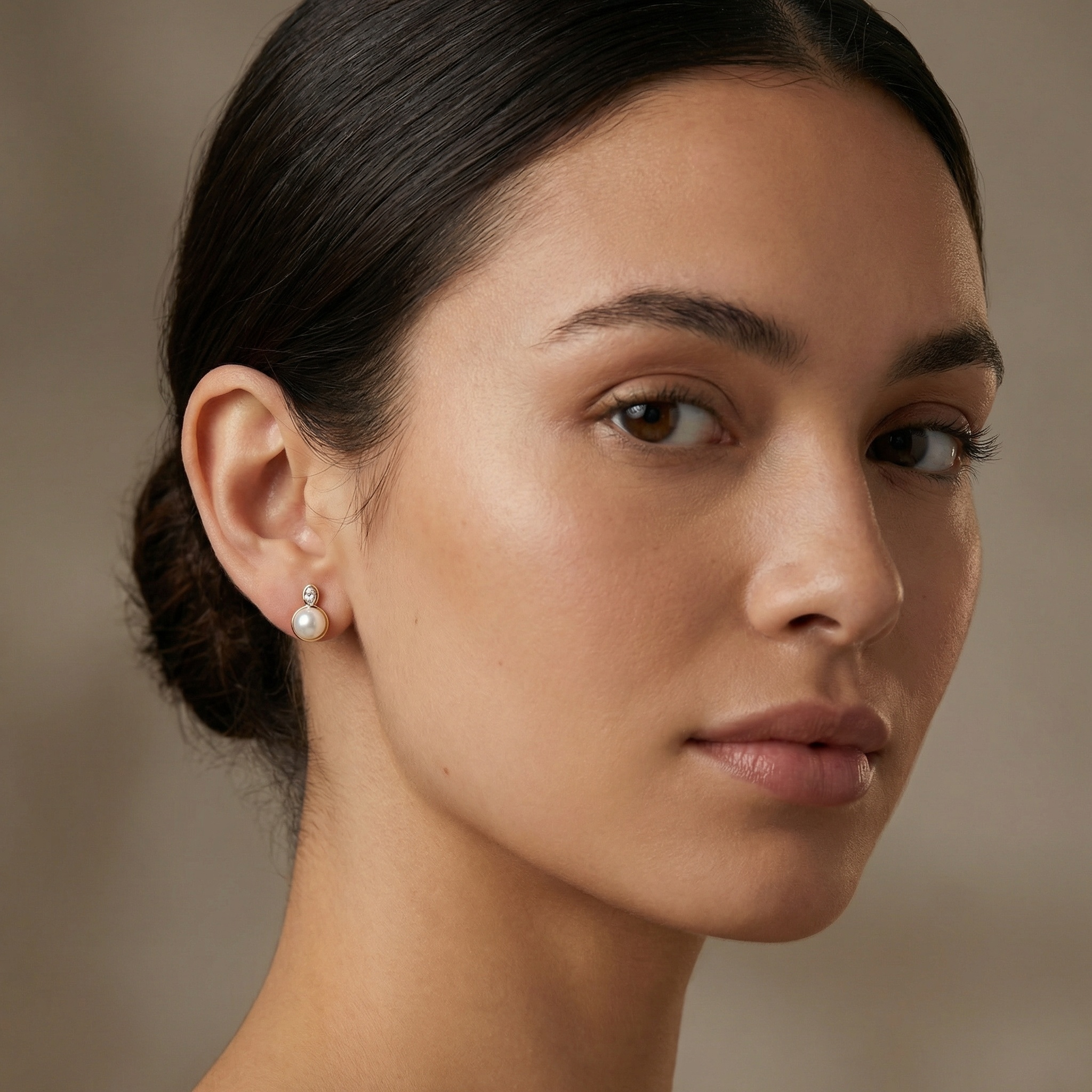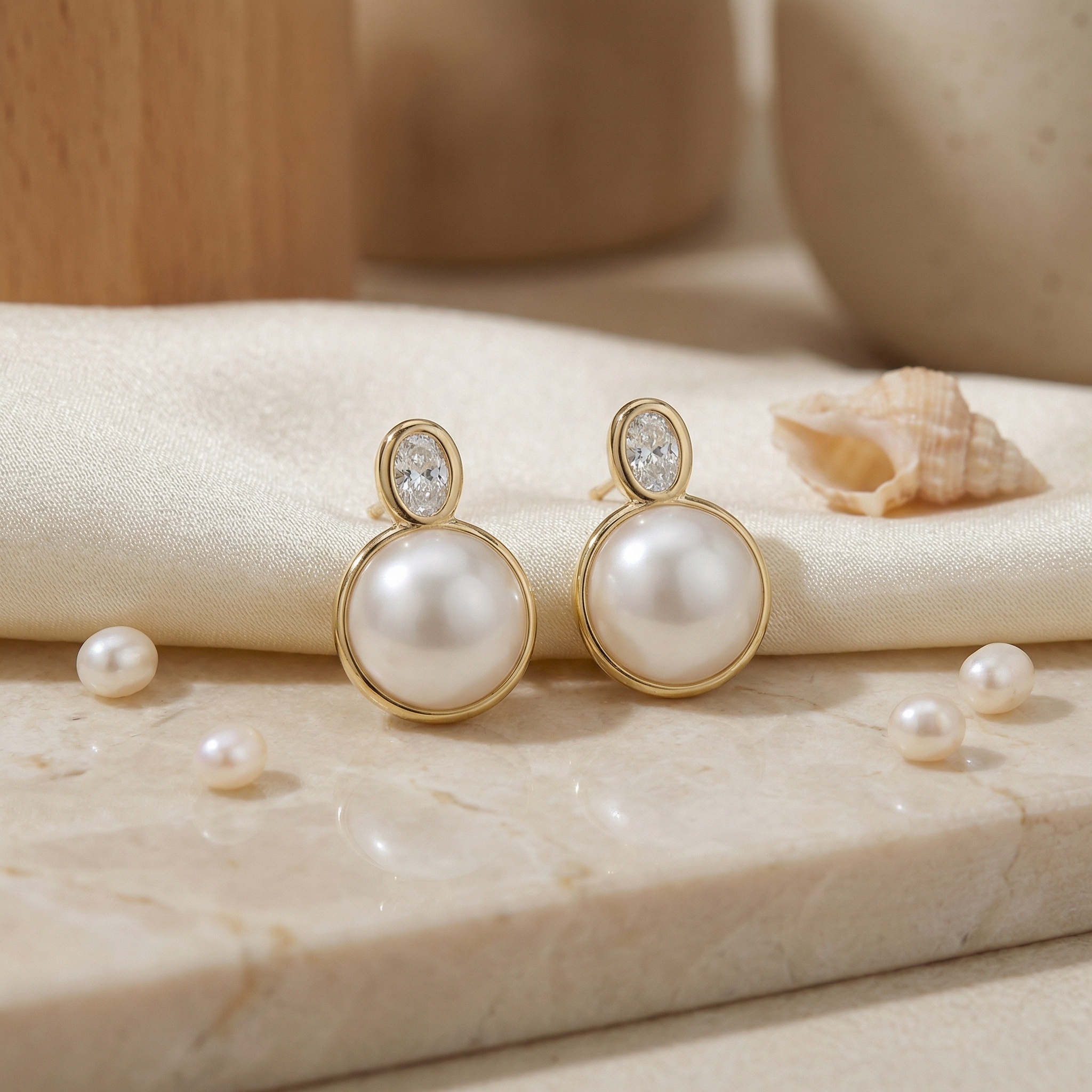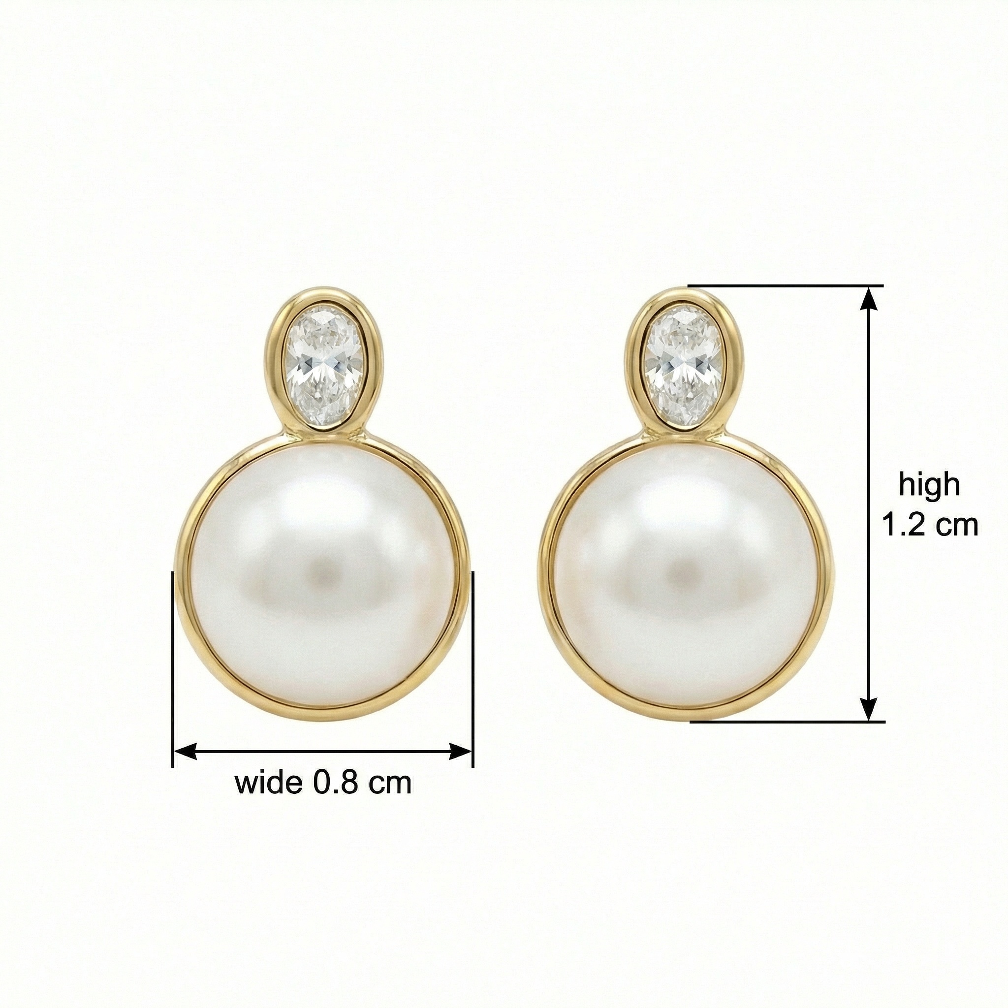 These sophisticated stud earrings feature a stunning combination of classic pearls and brilliant diamonds. Each piece showcases a large, lustrous round pearl nestled within a sleek, polished yellow bezel setting. Perched atop the pearl is a sparkling oval-cut diamond, also securely held in a matching bezel mount, adding a touch of modern brilliance to the traditional aesthetic. The warm metallic tones perfectly complement the creamy iridescence of the pearls and the fiery sparkle of the diamonds. These elegant earrings are designed for effortless wear, making them a versatile addition to any jewelry collection. Whether paired with casual attire or formal evening wear, they provide a refined and timeless look. Crafted with precision and attention to detail, these studs make an exceptional gift for a loved one or a luxurious treat for yourself. | Brand: jewelryodm