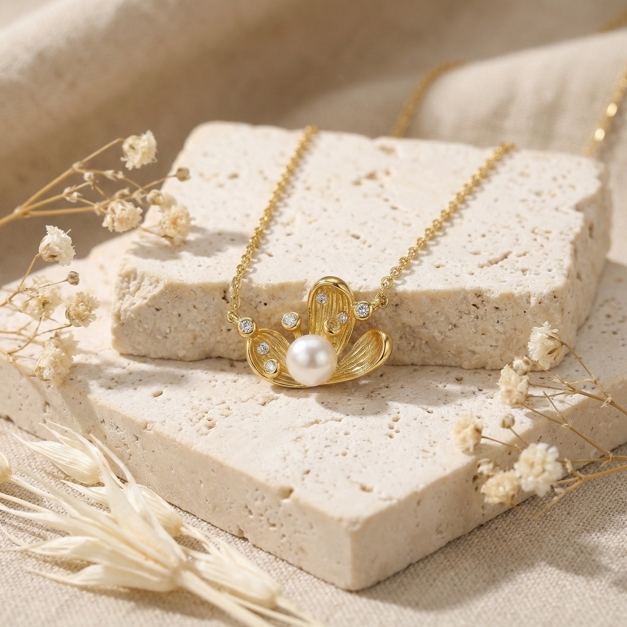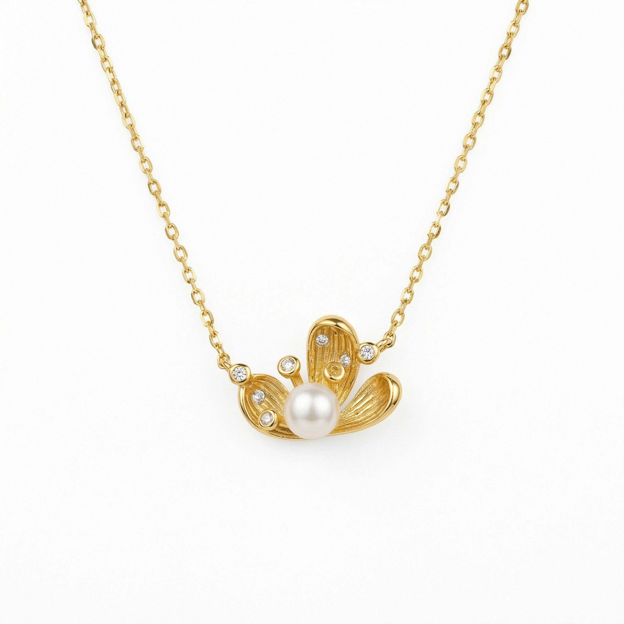 This elegant necklace showcases a centerpiece pearl surrounded by stylized metallic leaves. Small, brilliant diamonds are carefully set within the floral design, providing a sparkling contrast to the smooth surface of the pearl. The textured finish on the leaf motifs adds depth and character to the piece, while the delicate chain ensures it sits beautifully on the neck. Ideal for both formal events and everyday elegance, this accessory captures the beauty of nature in a sophisticated design. The warm tone of the metal enhances the iridescent quality of the pearl, making it a standout addition to any jewelry ensemble. Expert craftsmanship and timeless appeal define this stunning necklace, making it a perfect gift or a luxurious treat for yourself. | Brand: jewelryodm