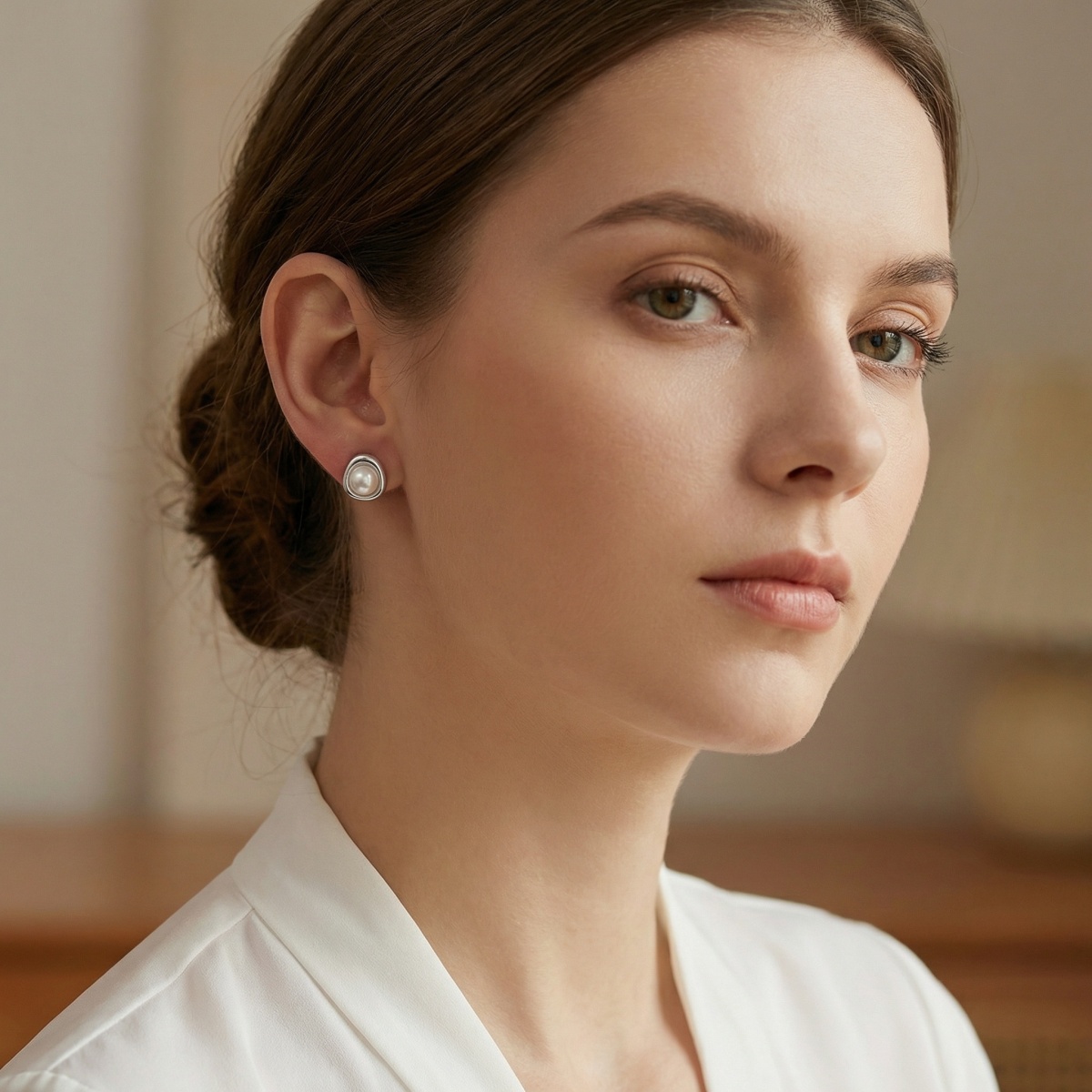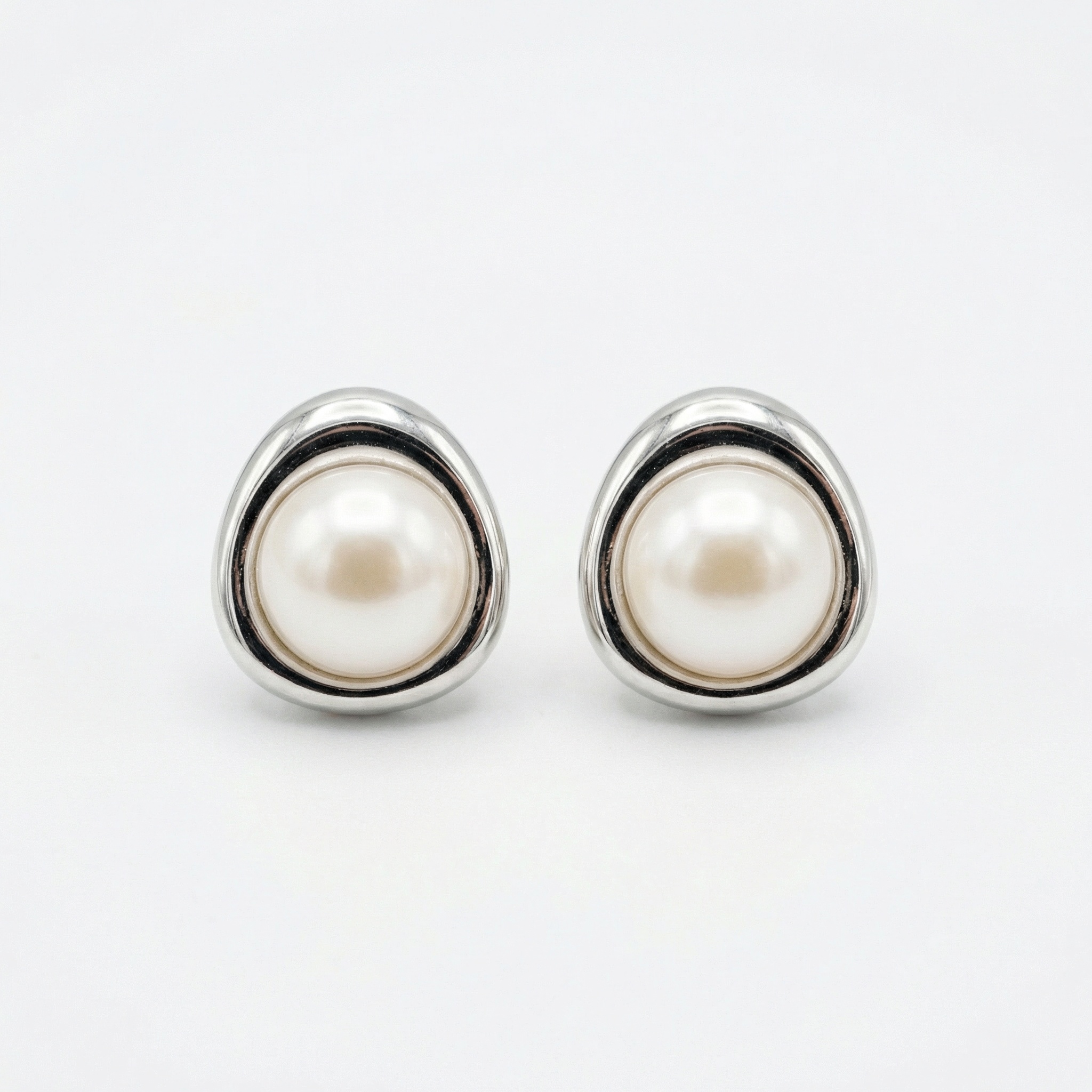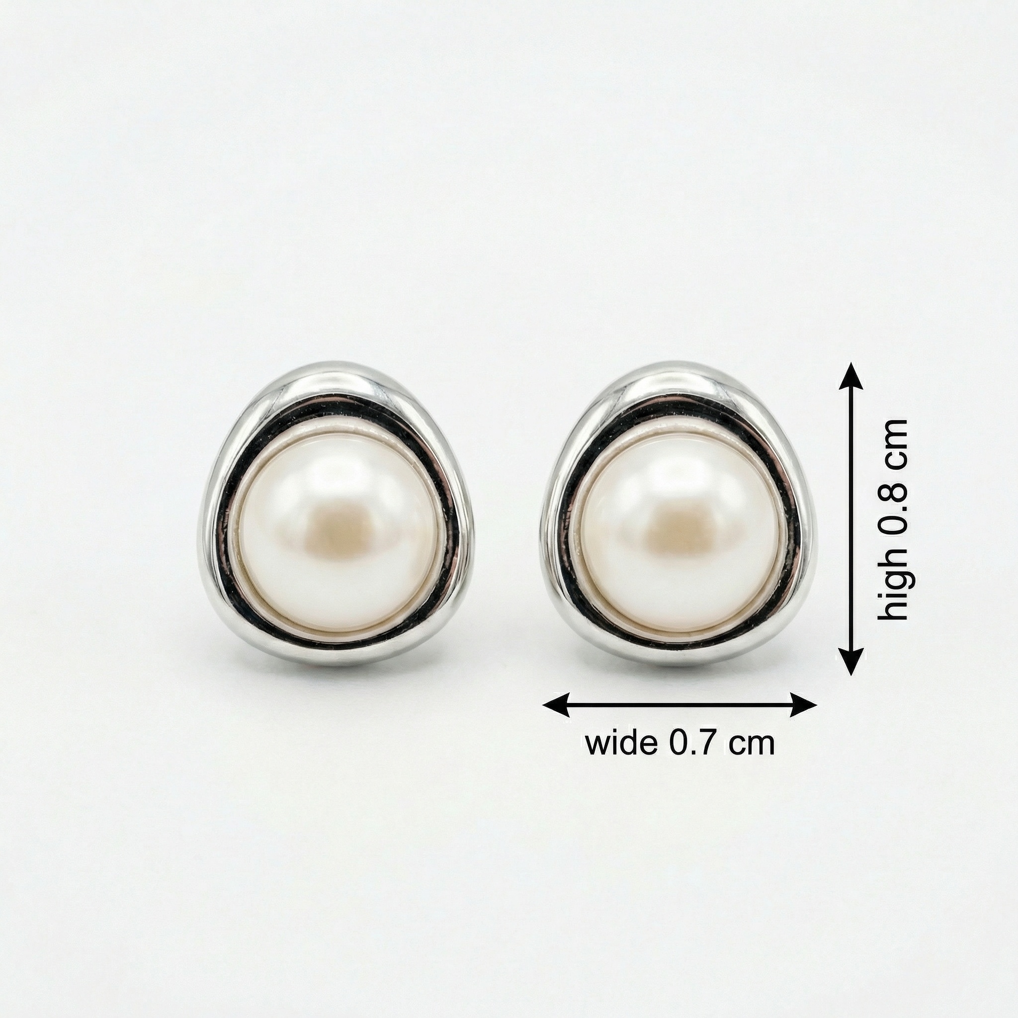This pair of elegant stud earrings features a timeless combination of lustrous white pearls and polished silver-toned metal. Each earring showcases a perfectly round, creamy white pearl nestled securely within a modern, rounded triangular frame. The smooth, reflective finish of the silver-toned setting complements the soft glow of the pearls, creating a sophisticated and minimalist aesthetic. Their versatile design makes them an ideal accessory for both everyday wear and special formal occasions. With their clean lines and classic appeal, these earrings offer a subtle touch of luxury to any outfit. They are lightweight and comfortable, making them a perfect addition to any jewelry collection or a thoughtful gift for someone special. | Brand: jewelryodm