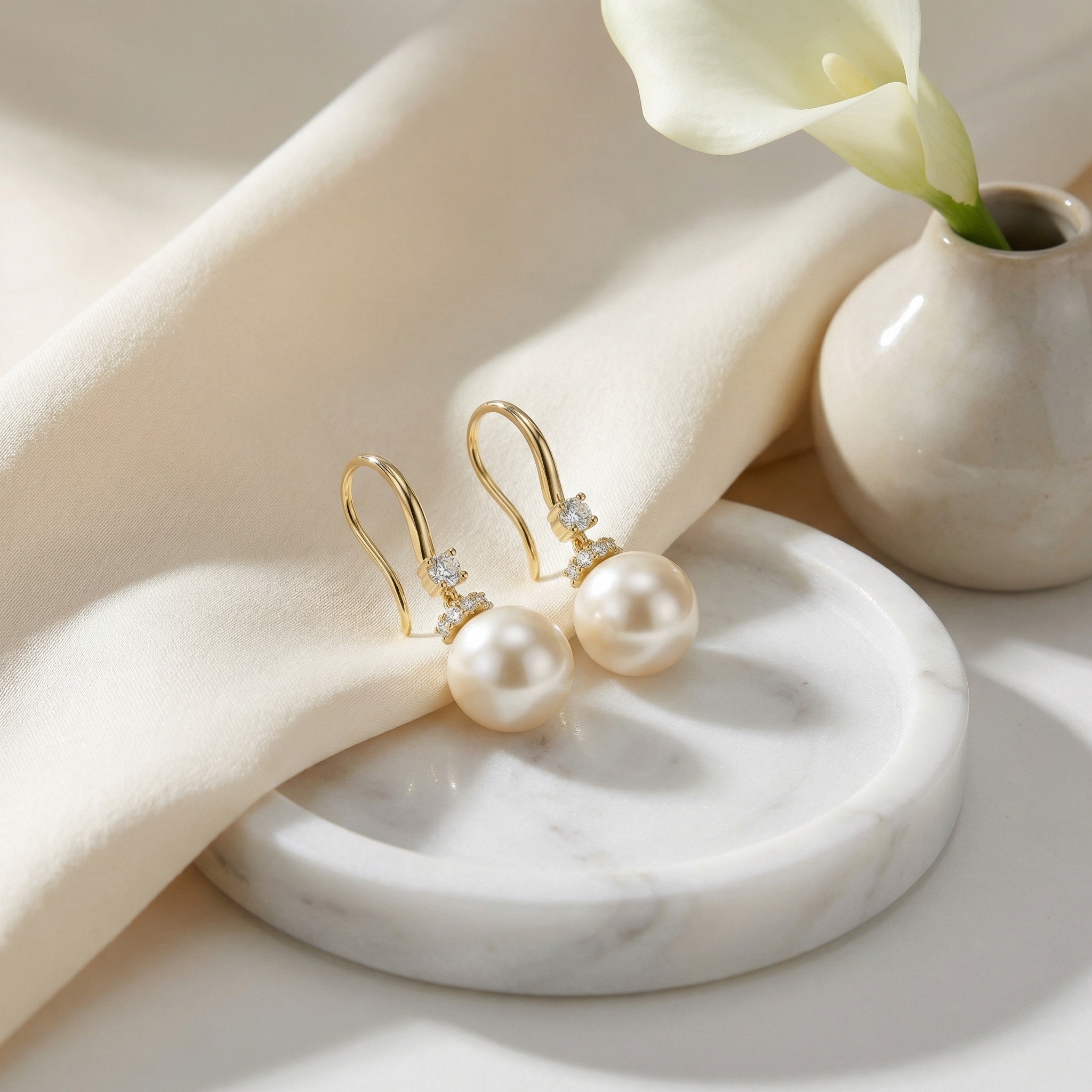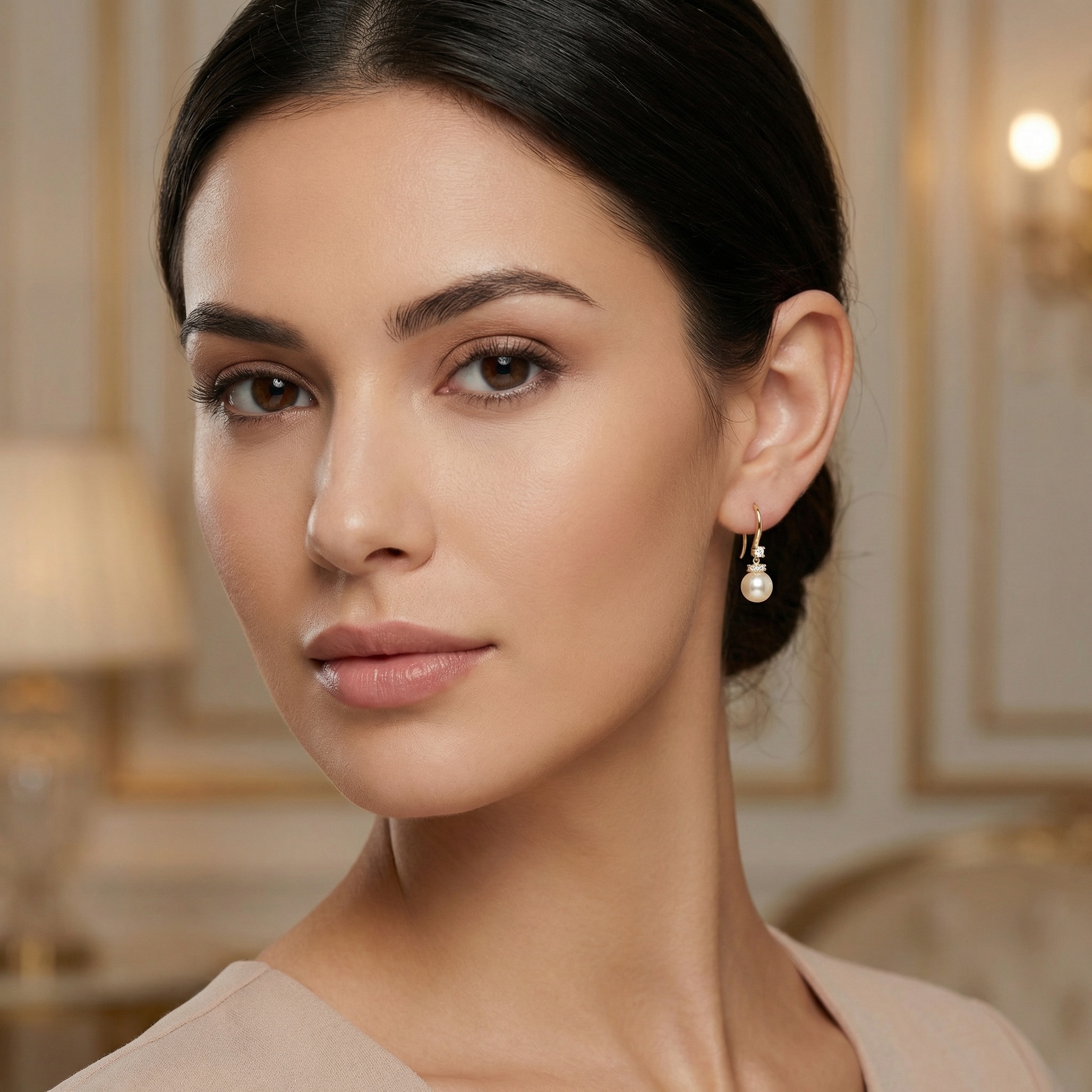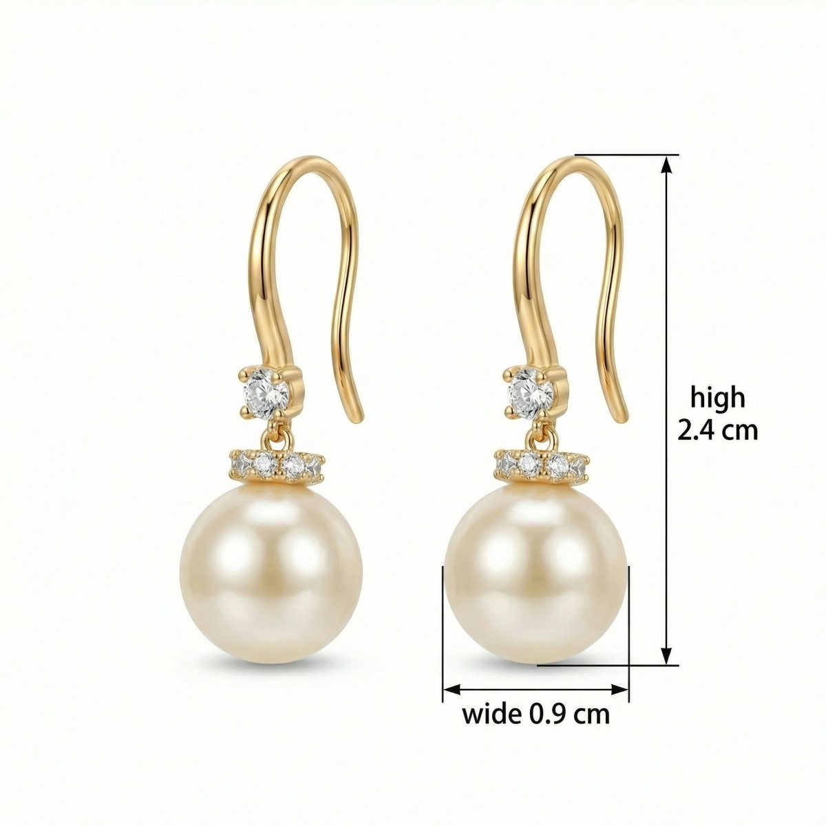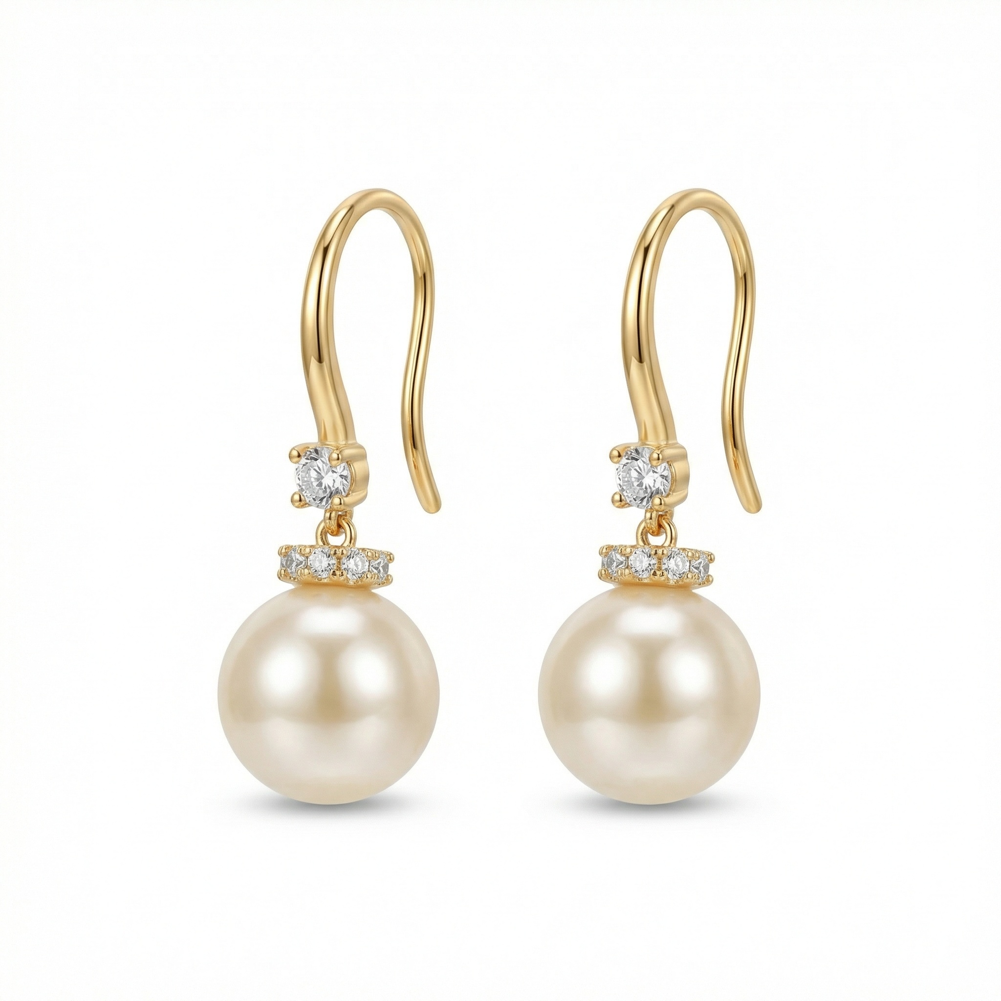 These stunning earrings feature lustrous, round creamy pearls suspended from graceful curved hooks. Each earring is adorned with a brilliant round-cut sparkling stone just below the hook, adding a touch of radiance. A delicate band of three smaller glittering accents sits perfectly atop each pearl, creating a refined and luxurious look. The warm metallic finish complements the soft glow of the pearls, making these earrings an ideal accessory for both formal occasions and everyday elegance. Designed for a comfortable fit with a classic silhouette, they offer a timeless charm that enhances any outfit. The smooth surface of the pearls and the precise setting of the crystals reflect light beautifully, ensuring a captivating shimmer from every angle. This pair serves as a sophisticated addition to any jewelry collection, perfect for gifting or personal wear. | Brand: jewelryodm