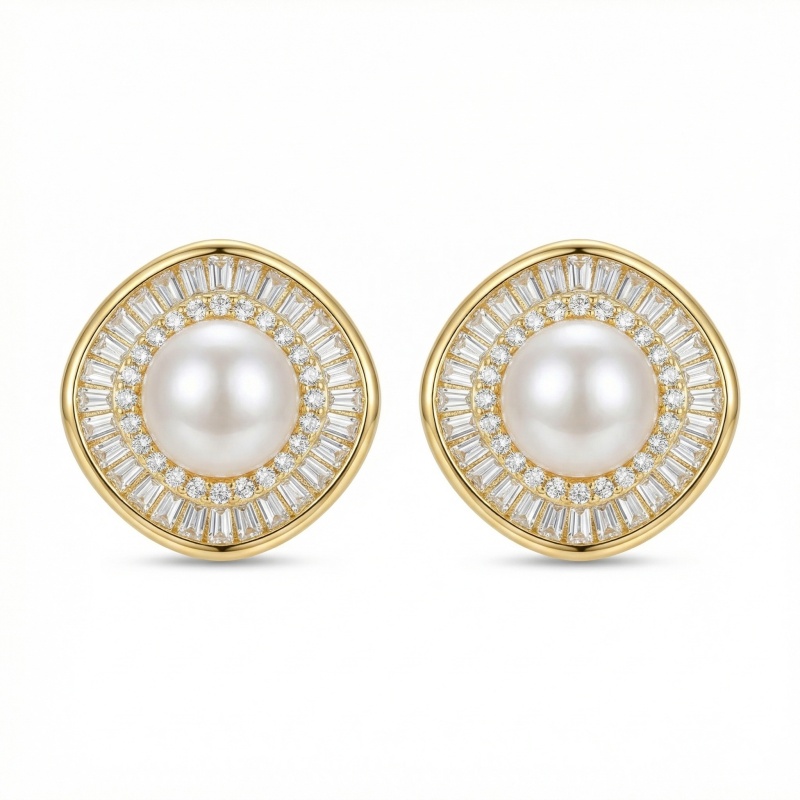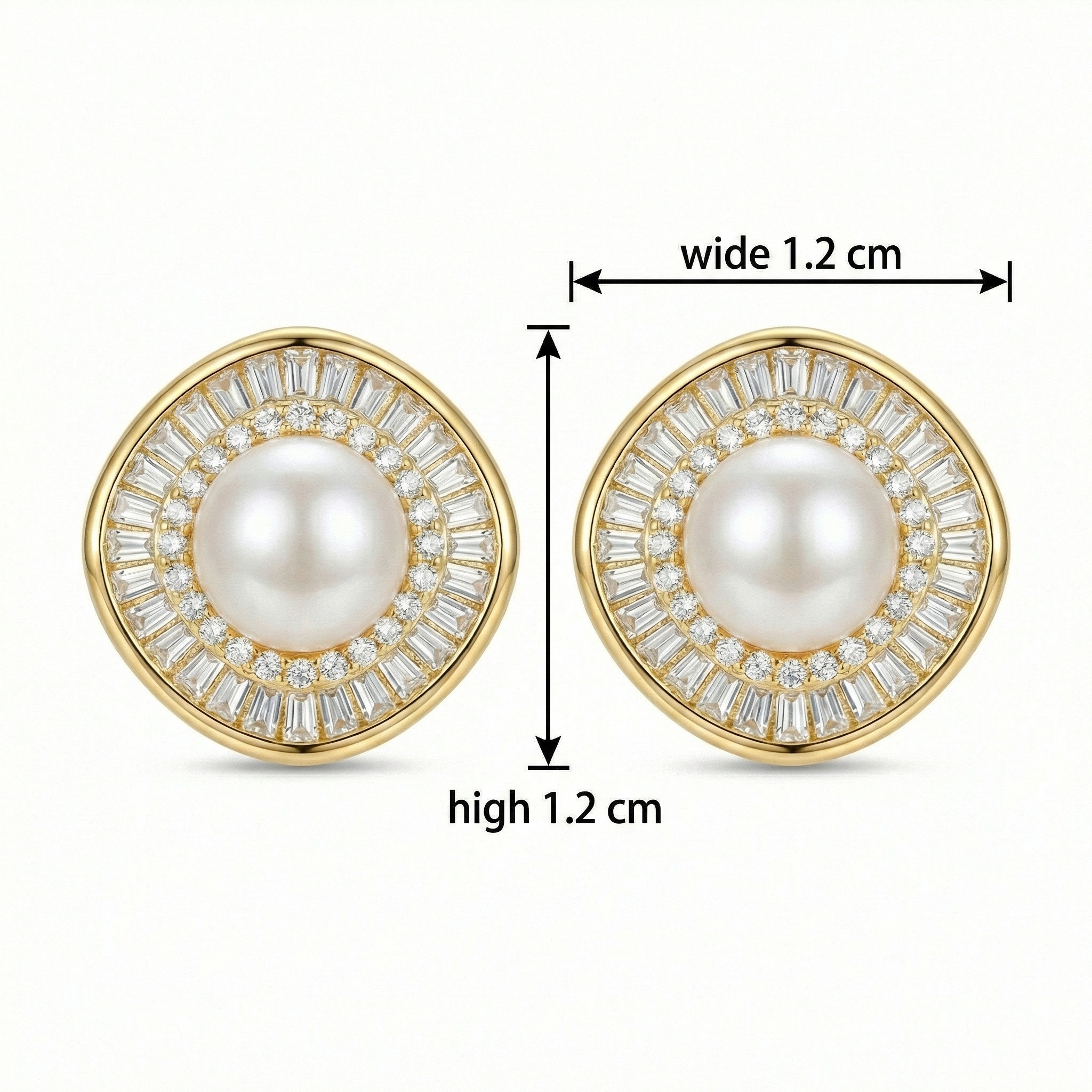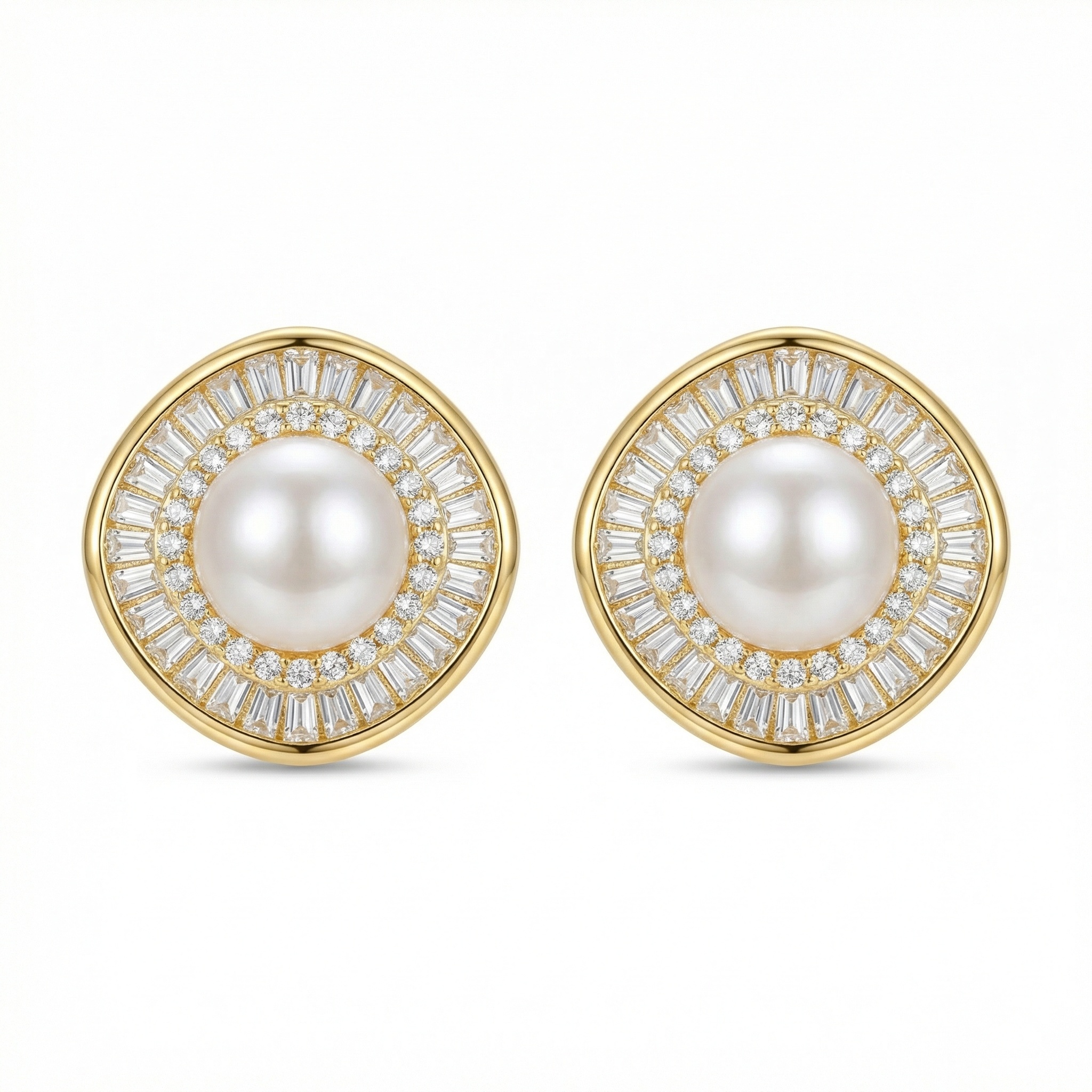These exquisite stud earrings showcase a timeless design, featuring a pair of lustrous white pearls at the center. Each pearl is meticulously framed by two concentric circles of brilliant diamonds that catch the light from every angle. The inner halo consists of delicate round-cut diamonds, providing a classic shimmer, while the outer halo features a striking sunburst pattern of precisely set baguette diamonds. Set in a polished yellow-toned precious metal, these earrings offer a sophisticated blend of traditional elegance and modern flair. Perfect for weddings, formal events, or adding a touch of luxury to your daily attire, these pearl and diamond studs are a versatile addition to any jewelry collection. The secure backing ensures a comfortable fit, making them a precious gift or a refined treat for yourself. | Brand: jewelryodm
