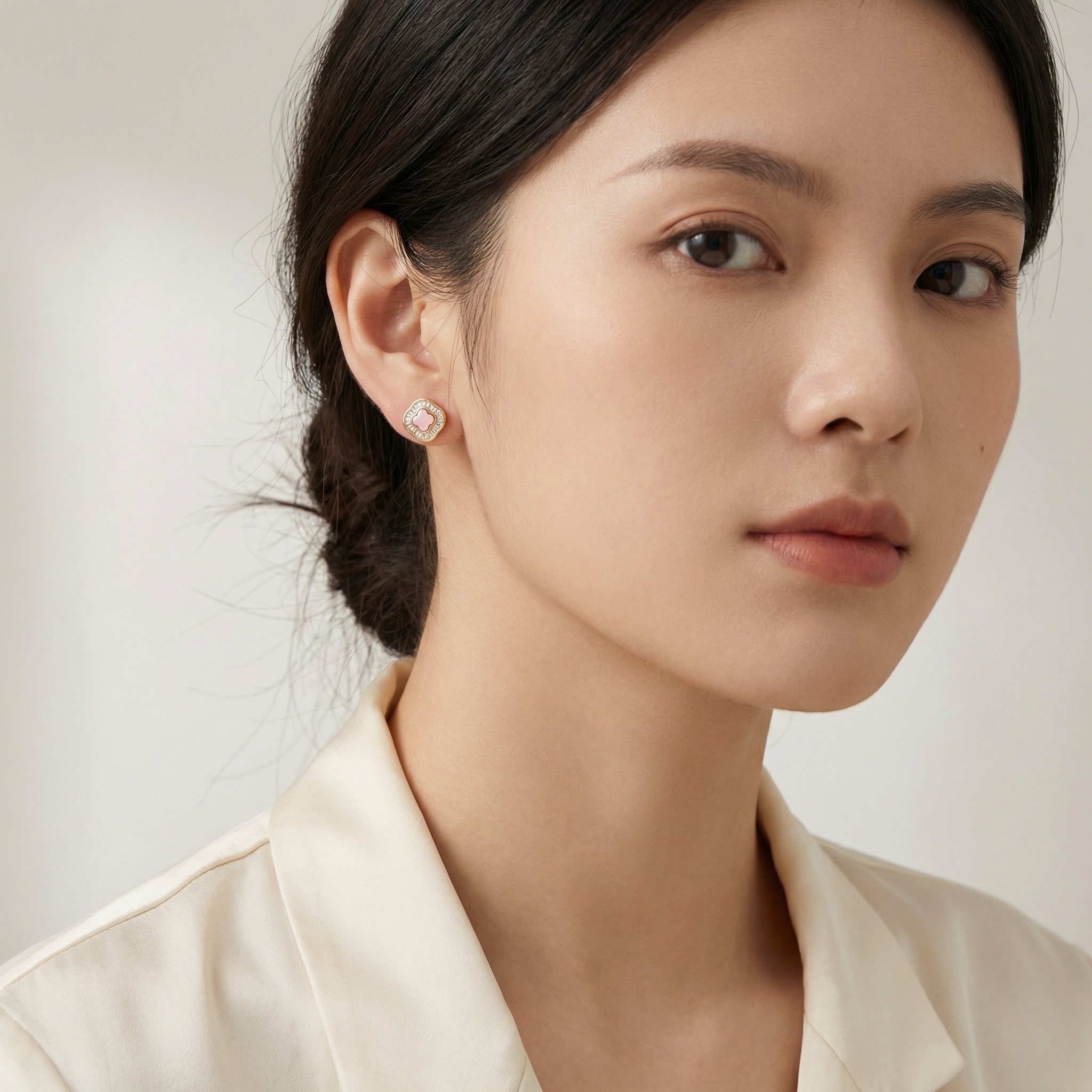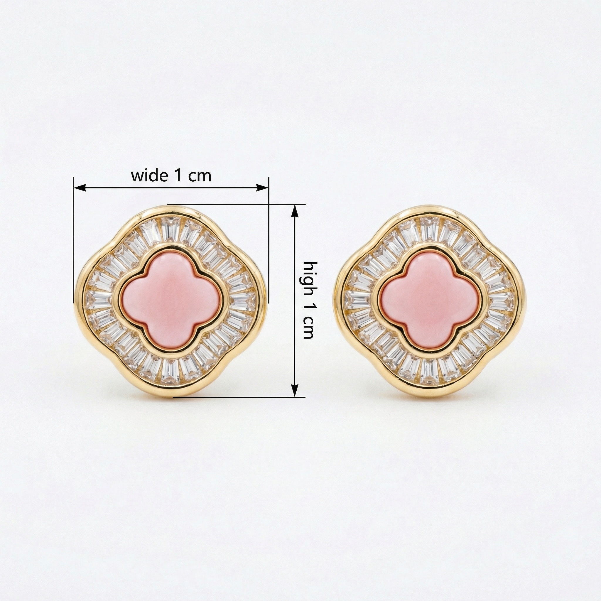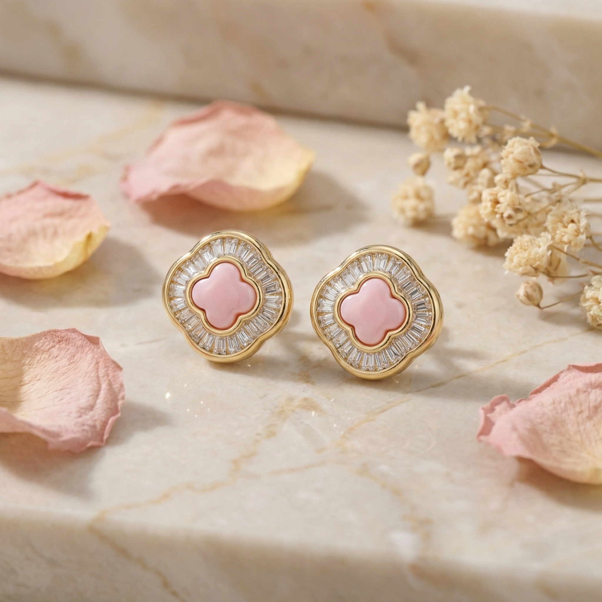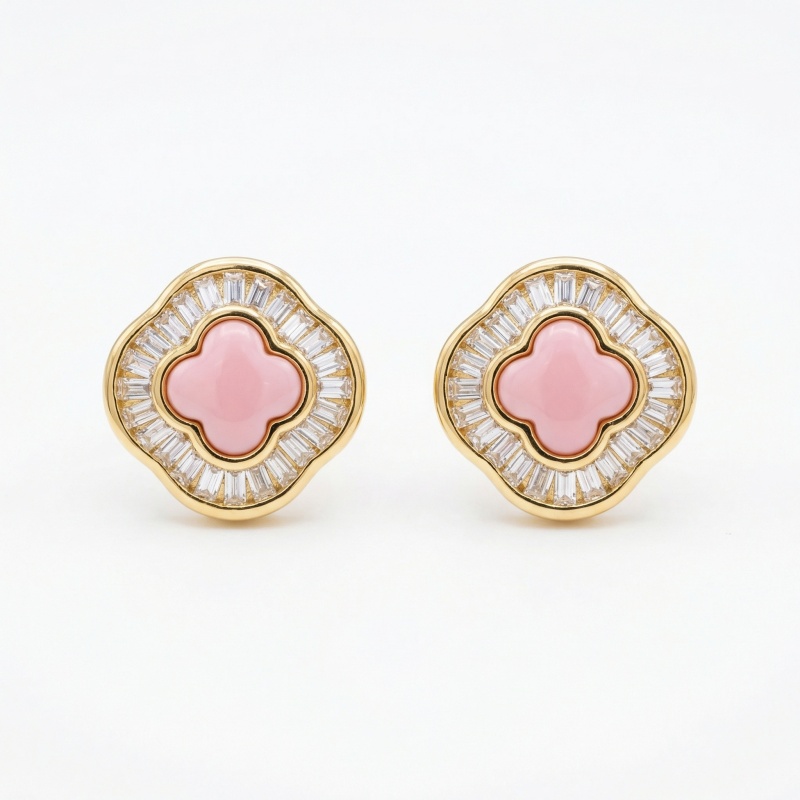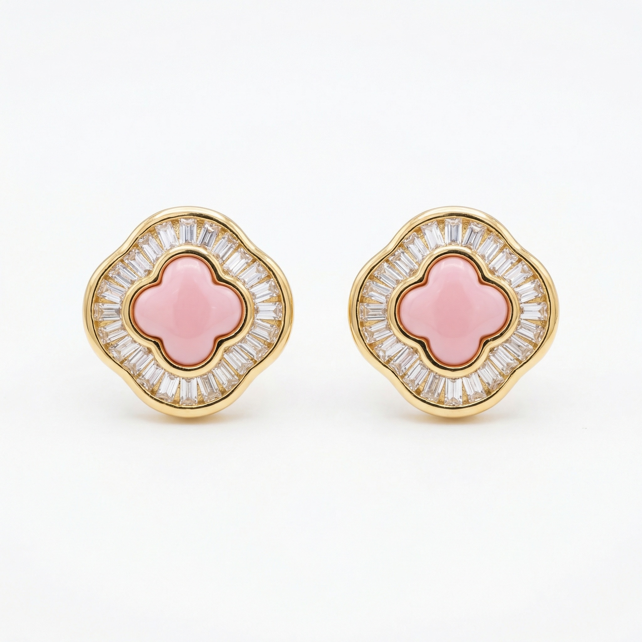 These stunning stud earrings feature a central quatrefoil-shaped pink stone set within a lustrous precious metal frame. Surrounding the soft pink center is a brilliant halo of baguette-cut clear gemstones, meticulously arranged to create a sunburst effect that captures and reflects light from every angle. The scalloped outer edge mirrors the clover motif, providing a timeless and sophisticated silhouette. Perfectly balanced between vintage-inspired charm and modern luxury, these earrings offer a vibrant pop of color and exceptional sparkle. Ideal for both daily wear and special occasions, they are a testament to fine craftsmanship and elegant design, making them a beautiful addition to any jewelry collection. | Brand: jewelryodm