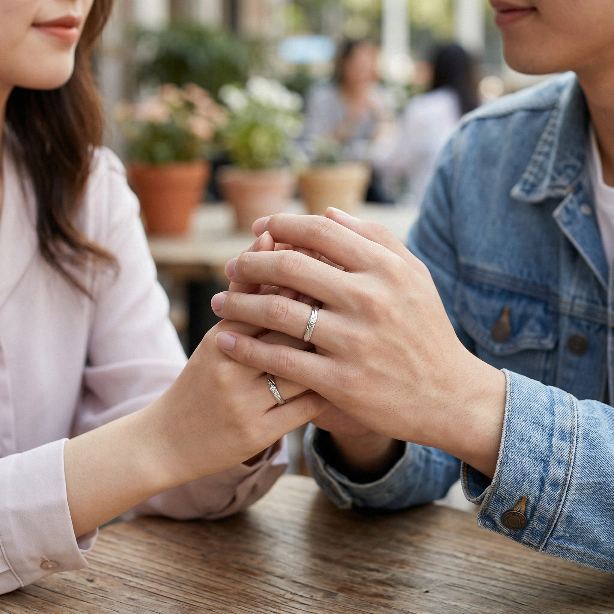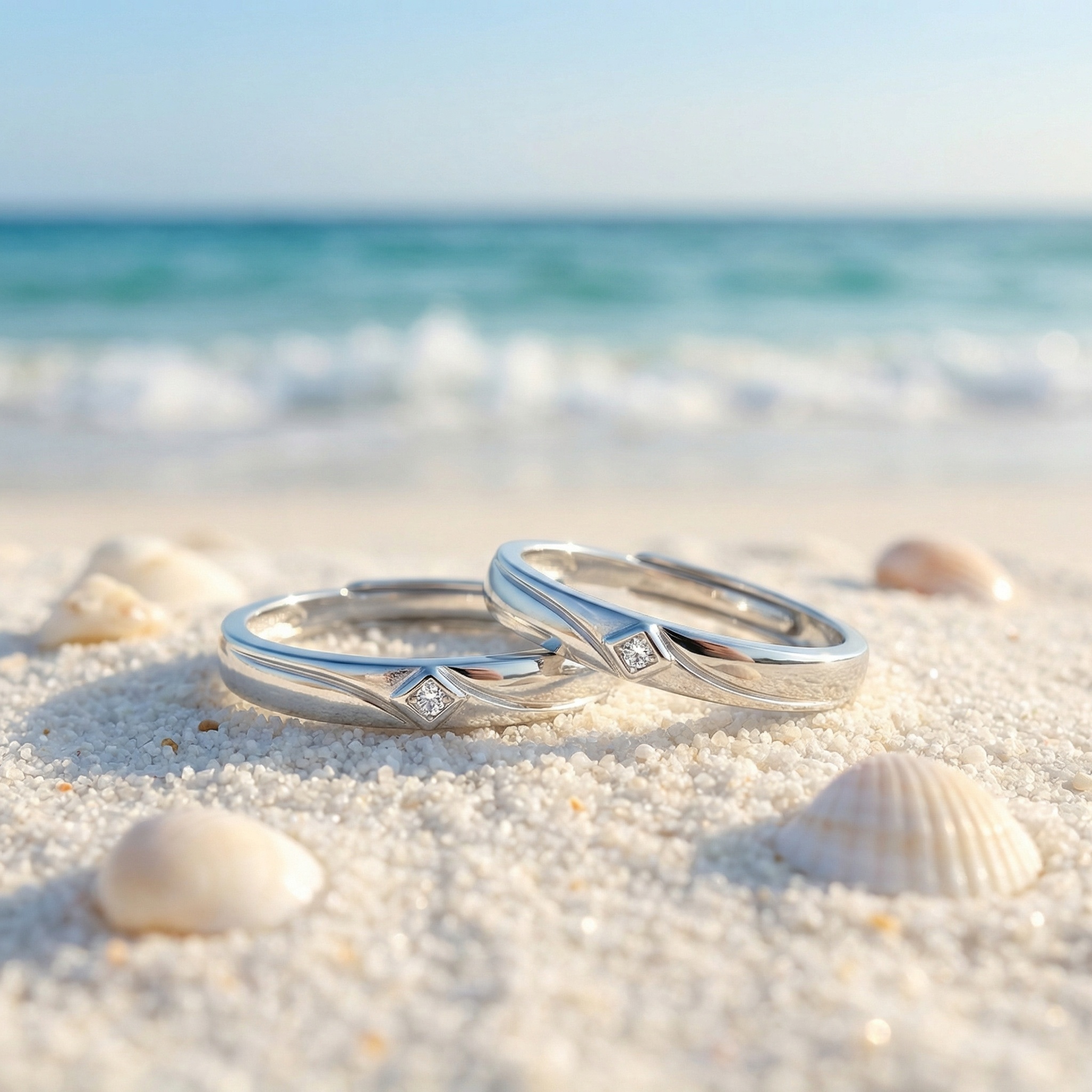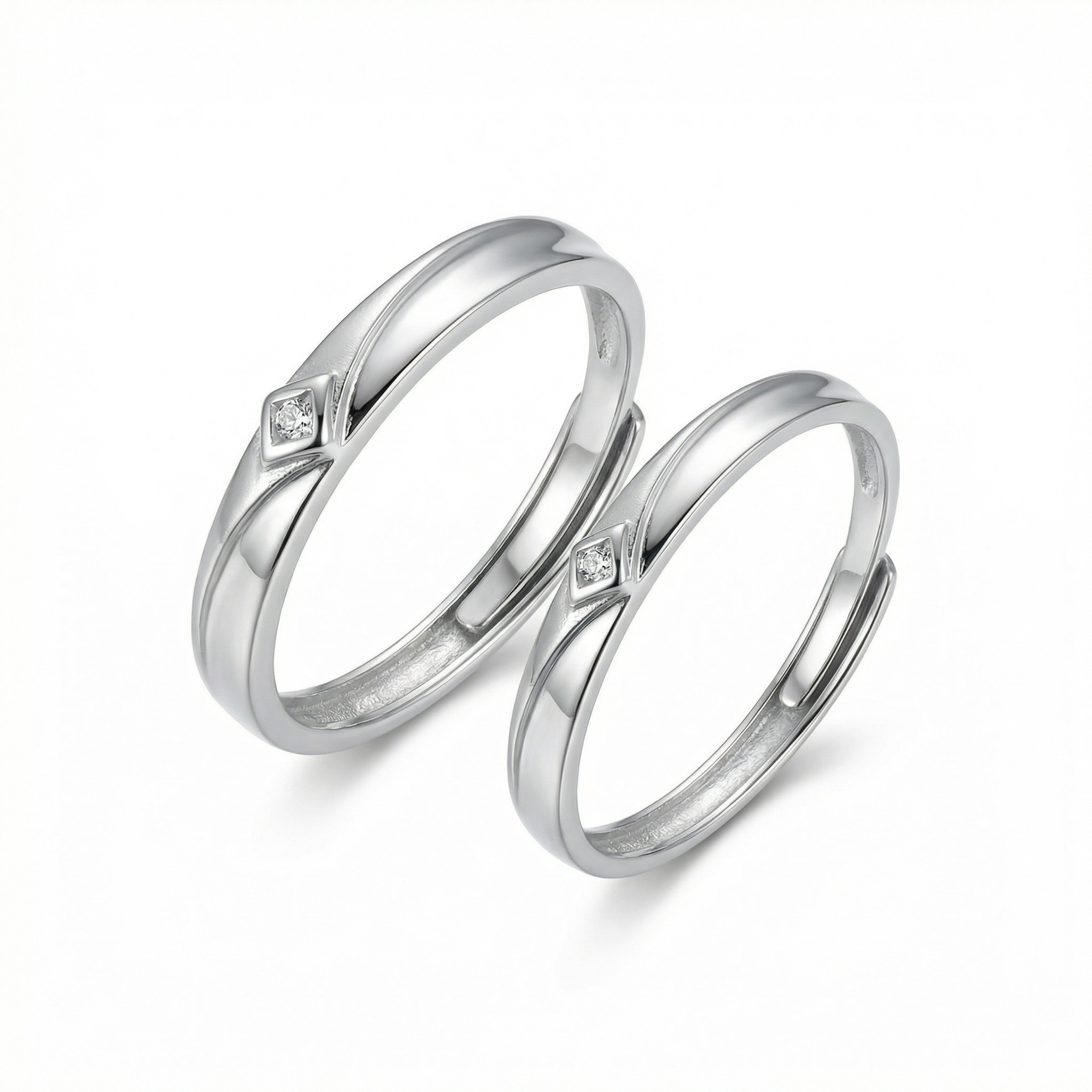 This sophisticated pair of matching couple's rings features a minimalist design crafted from polished silver-toned metal. Each ring showcases a graceful, sweeping wave pattern along the band, leading to a single, brilliant-cut inset stone nestled within a square setting. The high-shine finish provides a timeless aesthetic, making them perfect for anniversaries or as heartfelt promise rings. A notable feature is the adjustable open-ended design, ensuring a comfortable and customizable fit for any finger size. These rings symbolize a harmonious bond and elegant simplicity, offering a modern take on traditional romantic jewelry. Whether worn daily or for special occasions, this exquisite set serves as a beautiful reminder of love and commitment. | Brand: jewelryodm