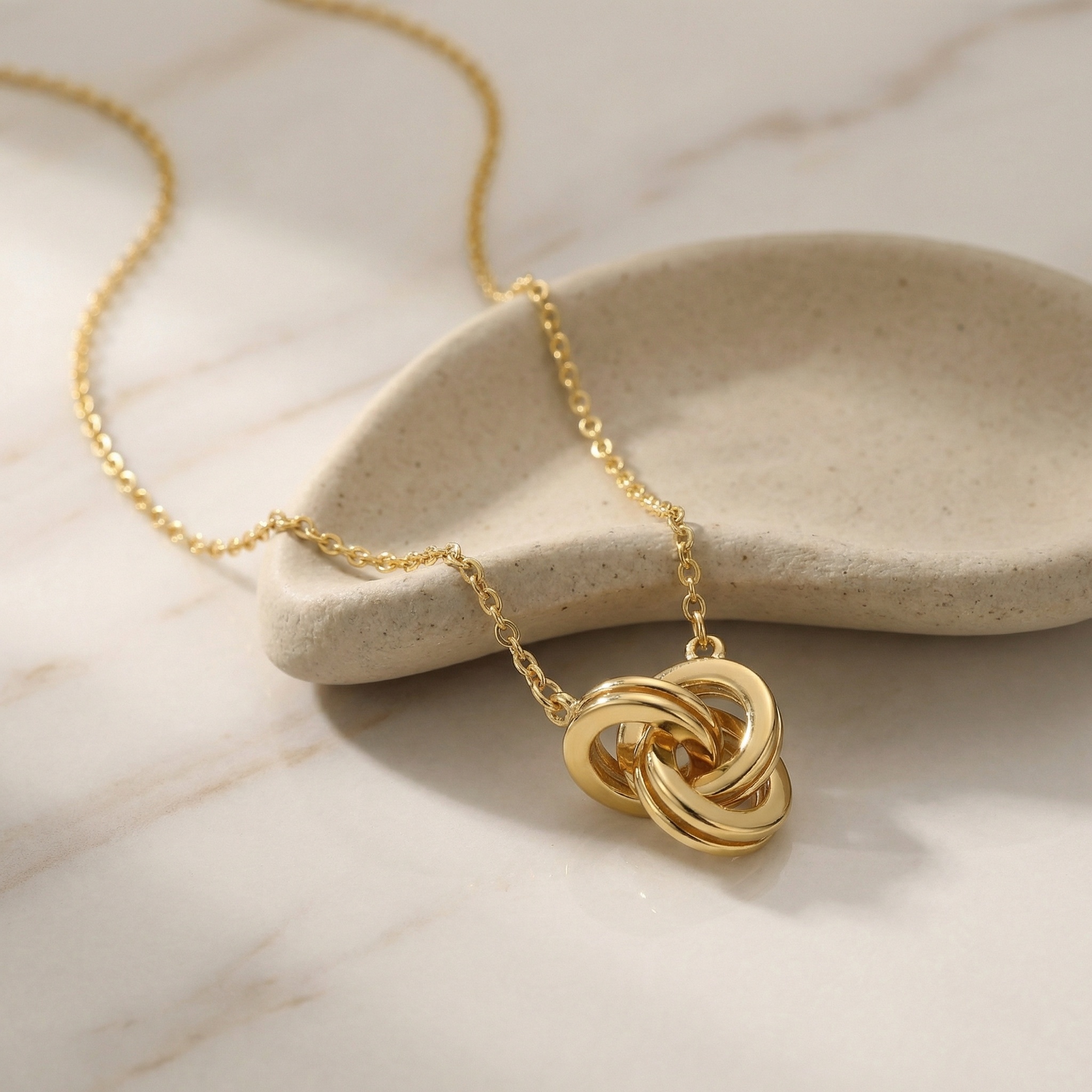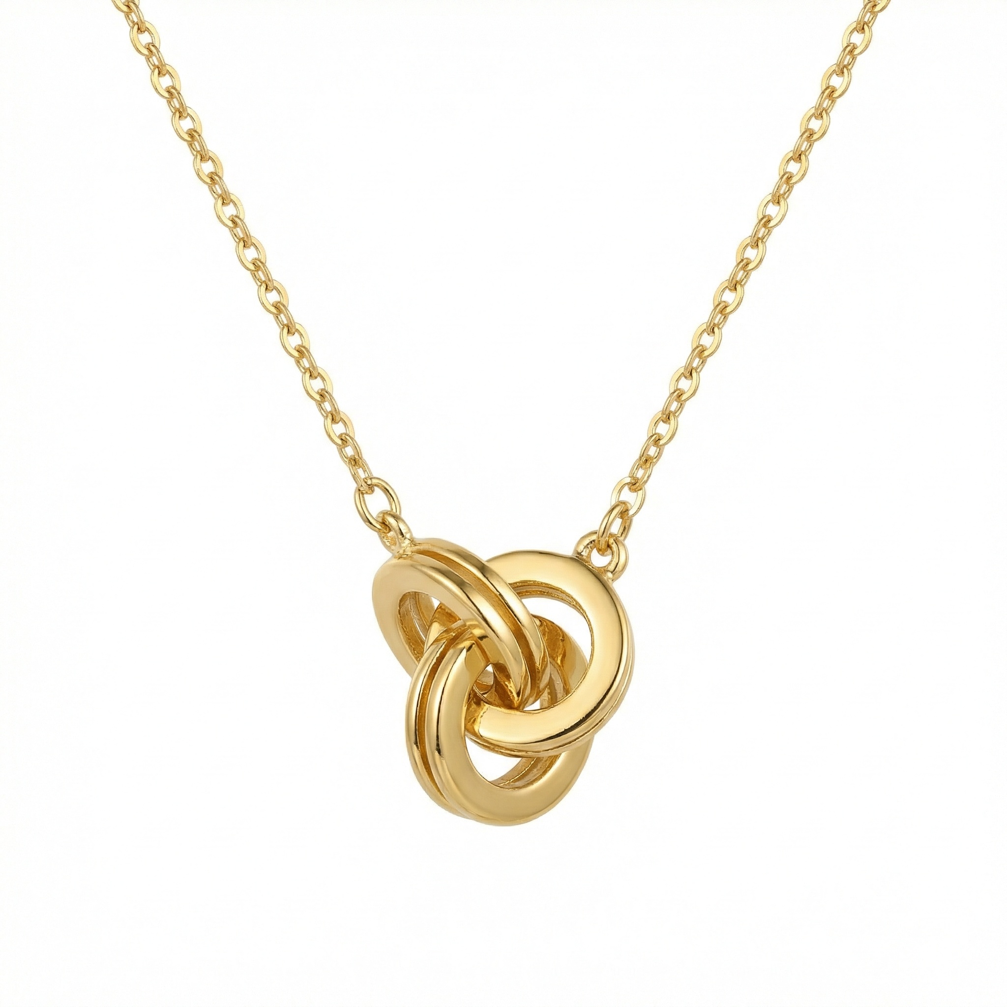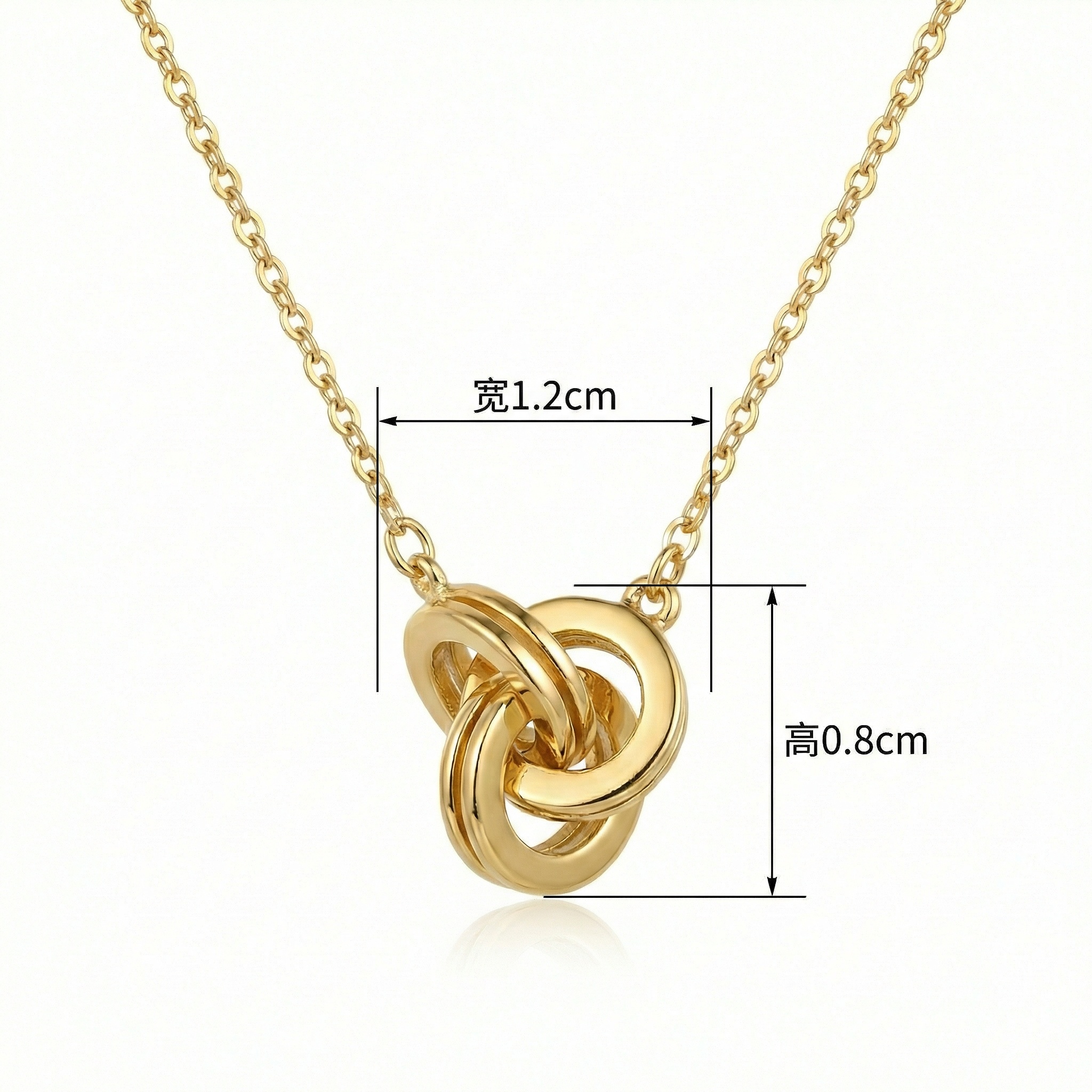 Celebrate timeless elegance with this sophisticated necklace featuring three interlocking rings that symbolize an unbreakable bond and eternal connection. Meticulously crafted with a high-shine finish, each circular band catches the light to radiate a warm, luminous glow. The pendant is suspended from a delicate yet sturdy link chain, offering a minimalist aesthetic that effortlessly transitions from day to evening wear. This versatile piece serves as a beautiful representation of friendship, love, or family, making it a meaningful gift for someone special. Its classic design and warm yellow-toned metallic hue ensure it remains a staple in any jewelry collection for years to come. Whether worn alone for a subtle statement or layered with other pieces, this necklace adds a touch of refined luxury and grace to any ensemble. | Brand: jewelryodm