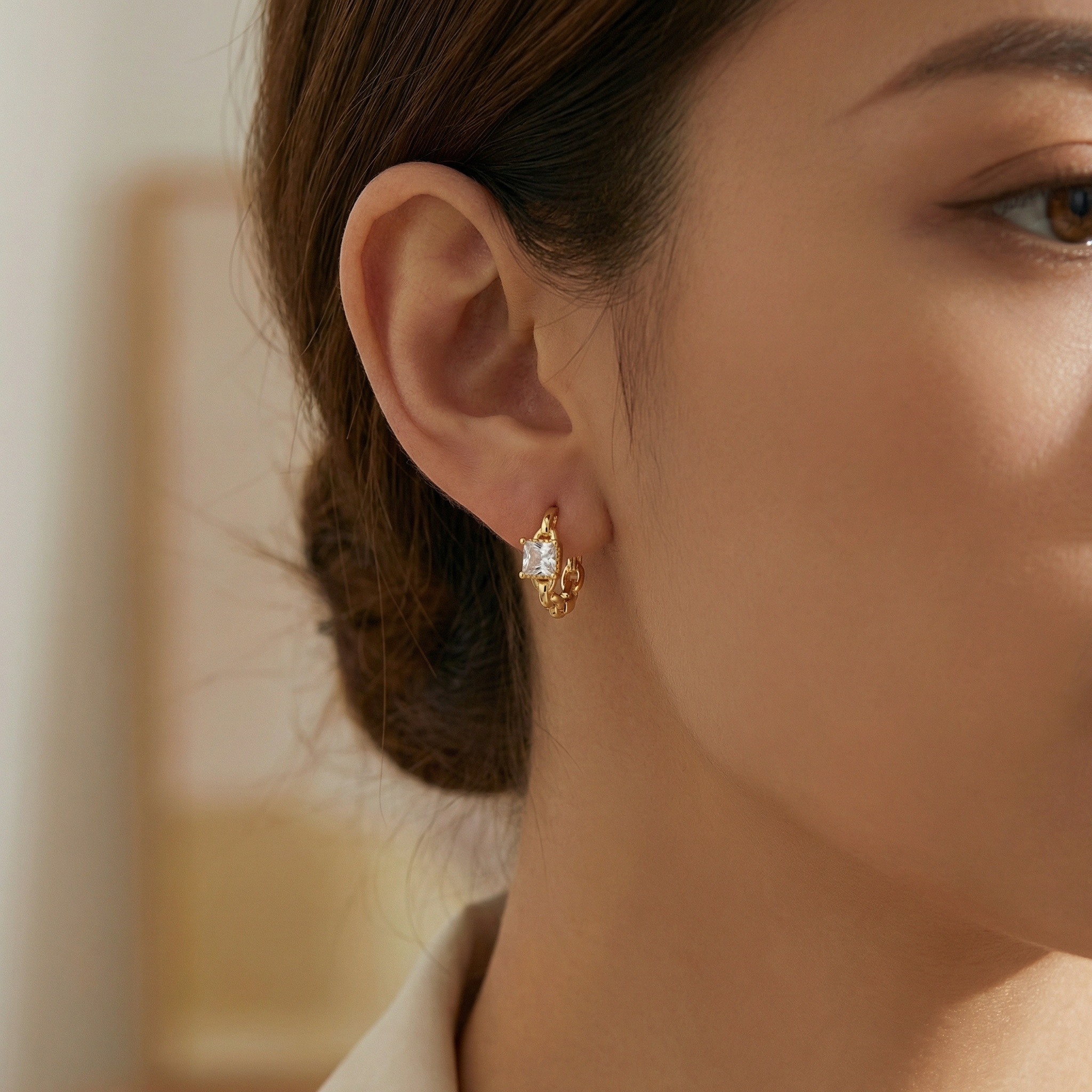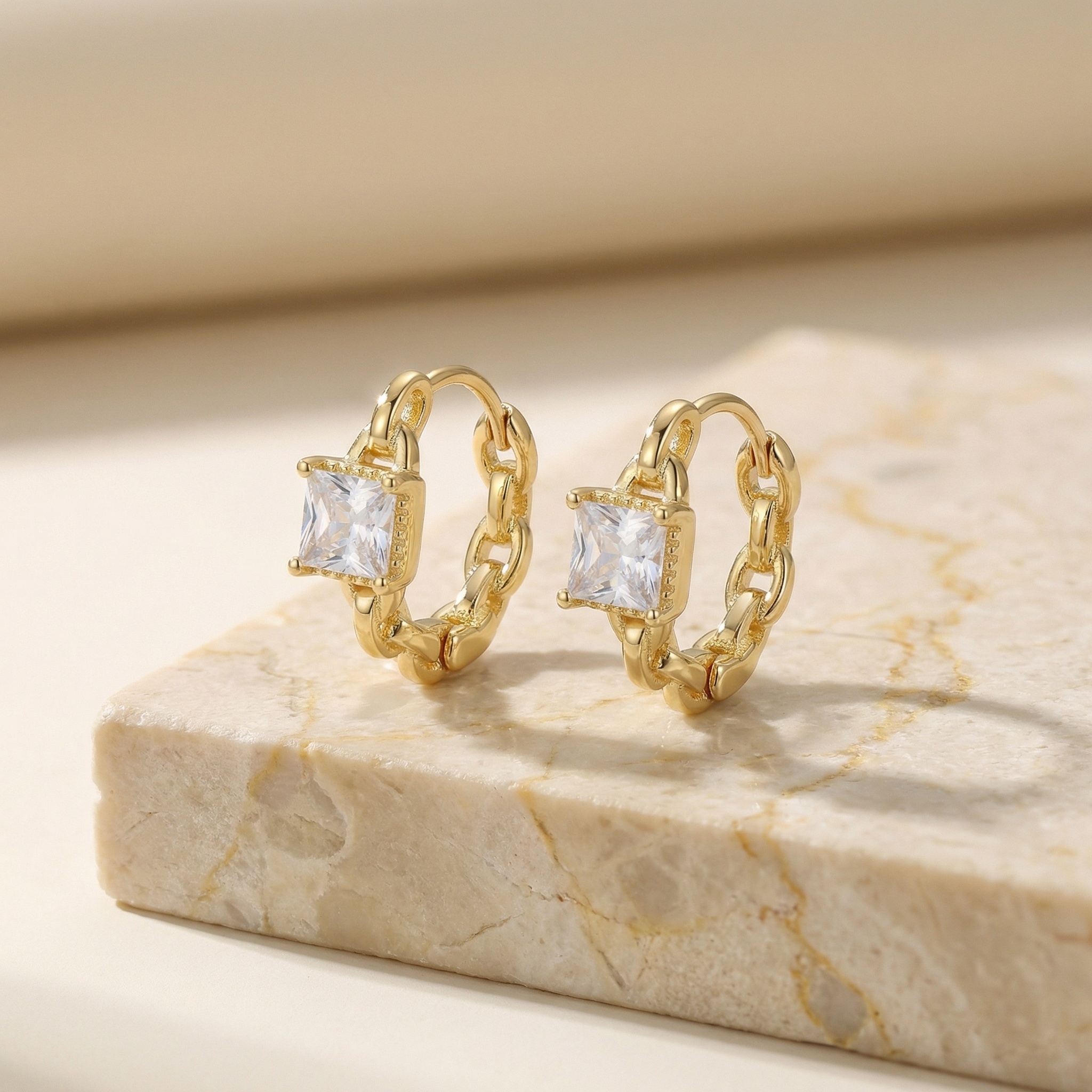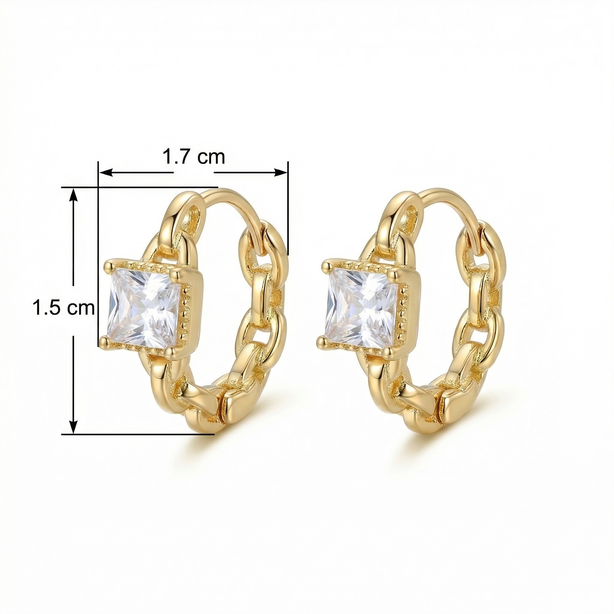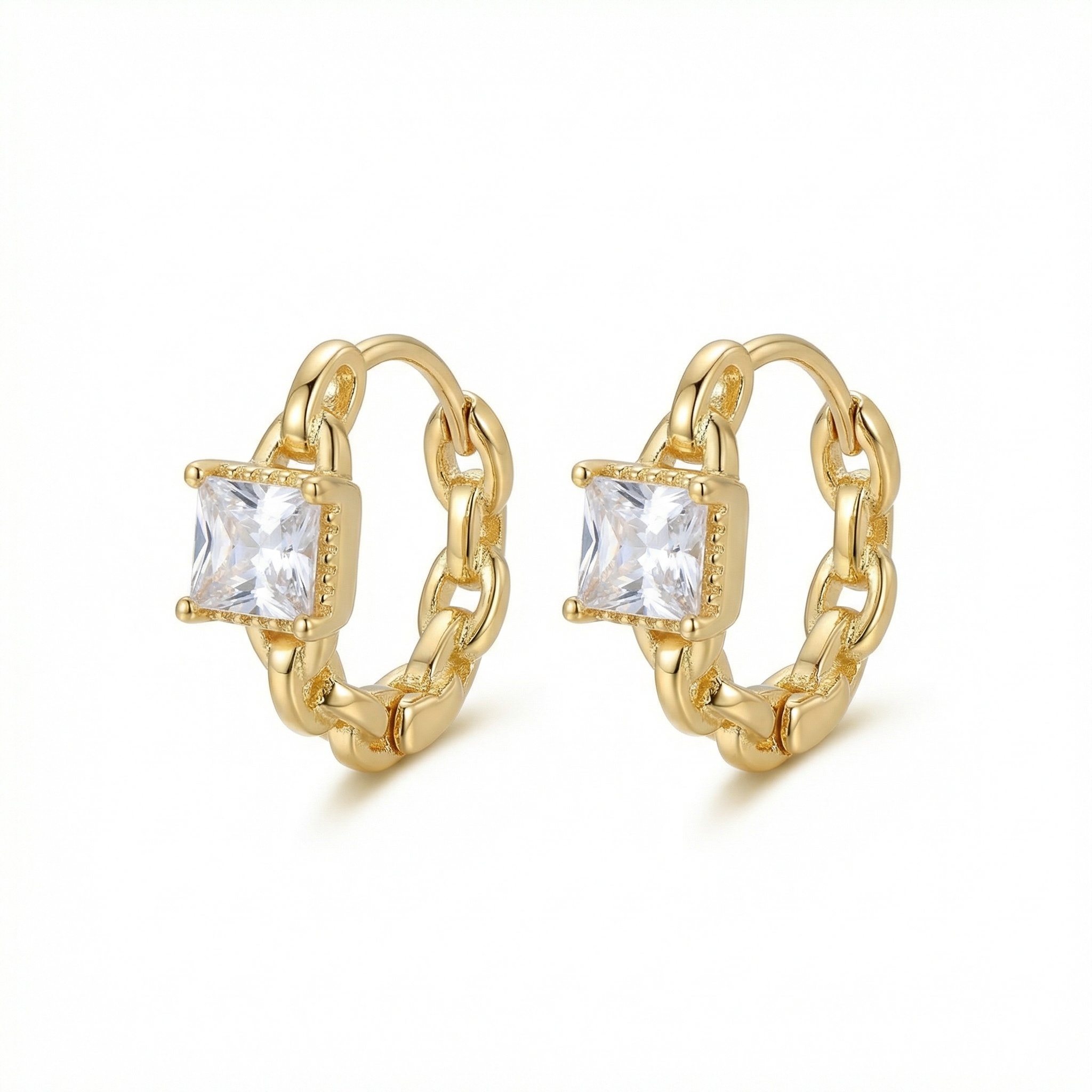 These stunning huggie hoop earrings feature a unique chain-link design that combines modern edge with classic elegance. Each hoop is adorned with a brilliant square-shaped princess-cut cubic zirconia, meticulously set to capture and reflect light from every angle. The high-polish metallic finish provides a luxurious yellow glow, making them a perfect accessory for both daily wear and special occasions. Designed for comfort, these lightweight earrings feature a secure hinged closure, ensuring they stay in place throughout the day. Whether you are dressing up for a night out or adding a touch of sparkle to your office attire, these geometric chain earrings are a versatile addition to any jewelry box. This sophisticated pair makes an ideal gift for birthdays, anniversaries, or any celebration, blending contemporary style with timeless brilliance. | Brand: jewelryodm