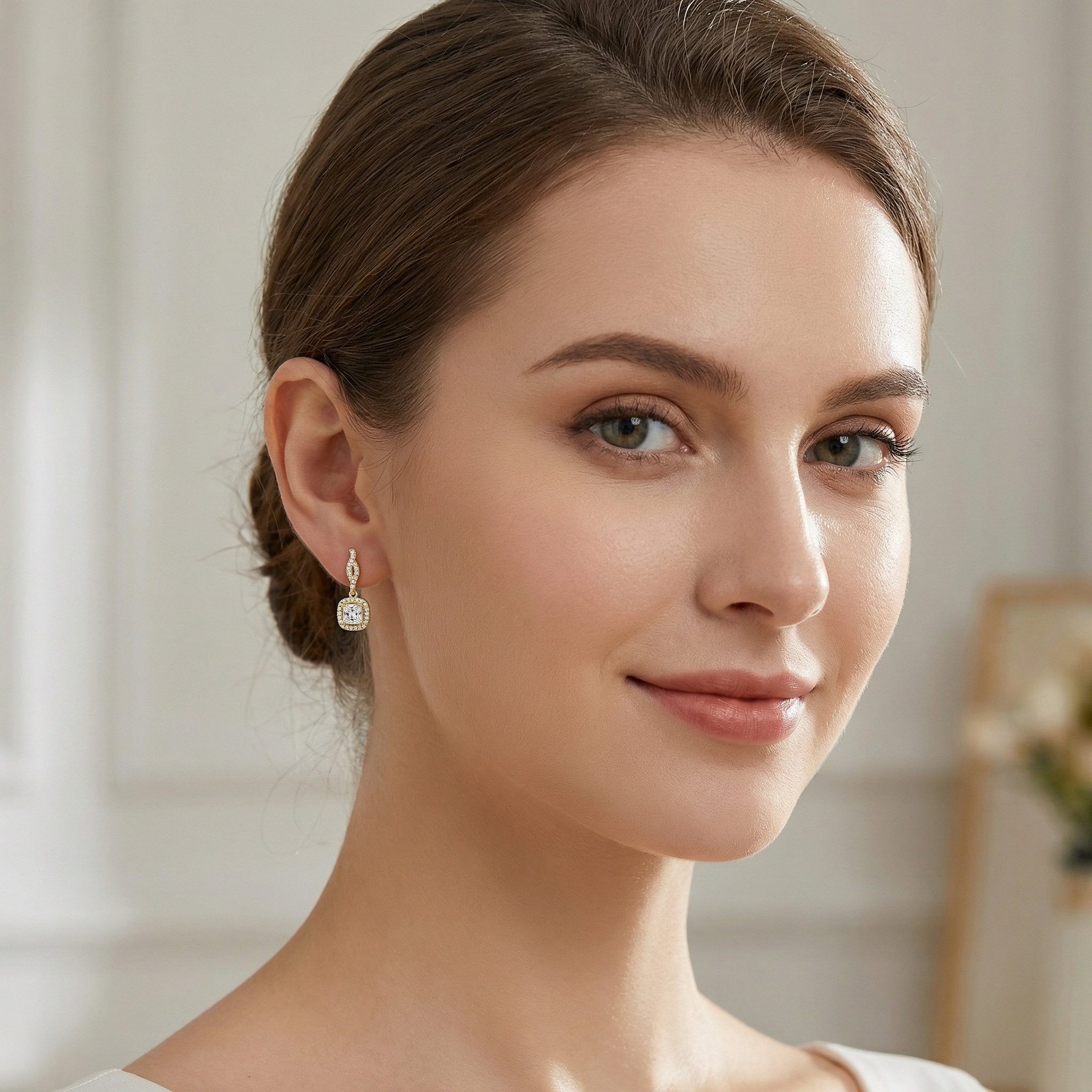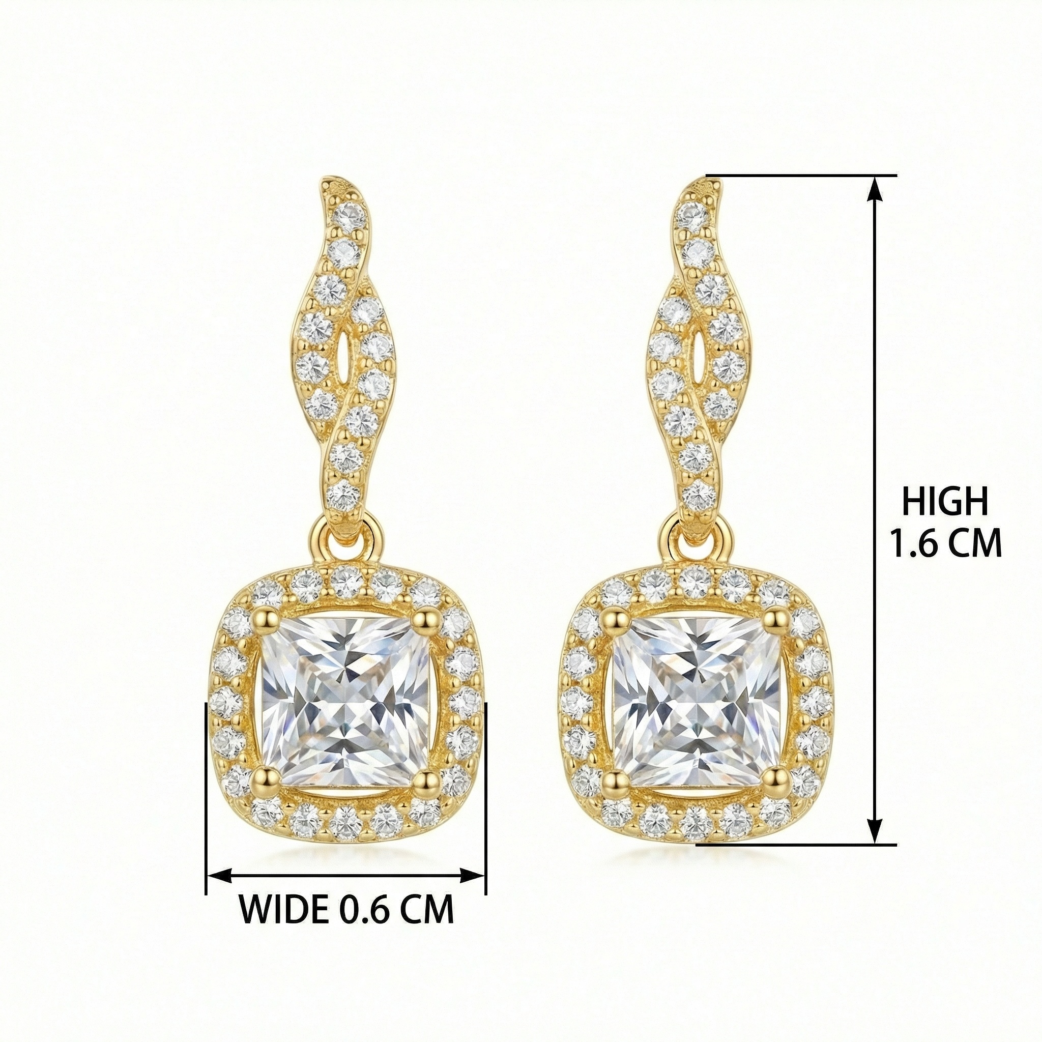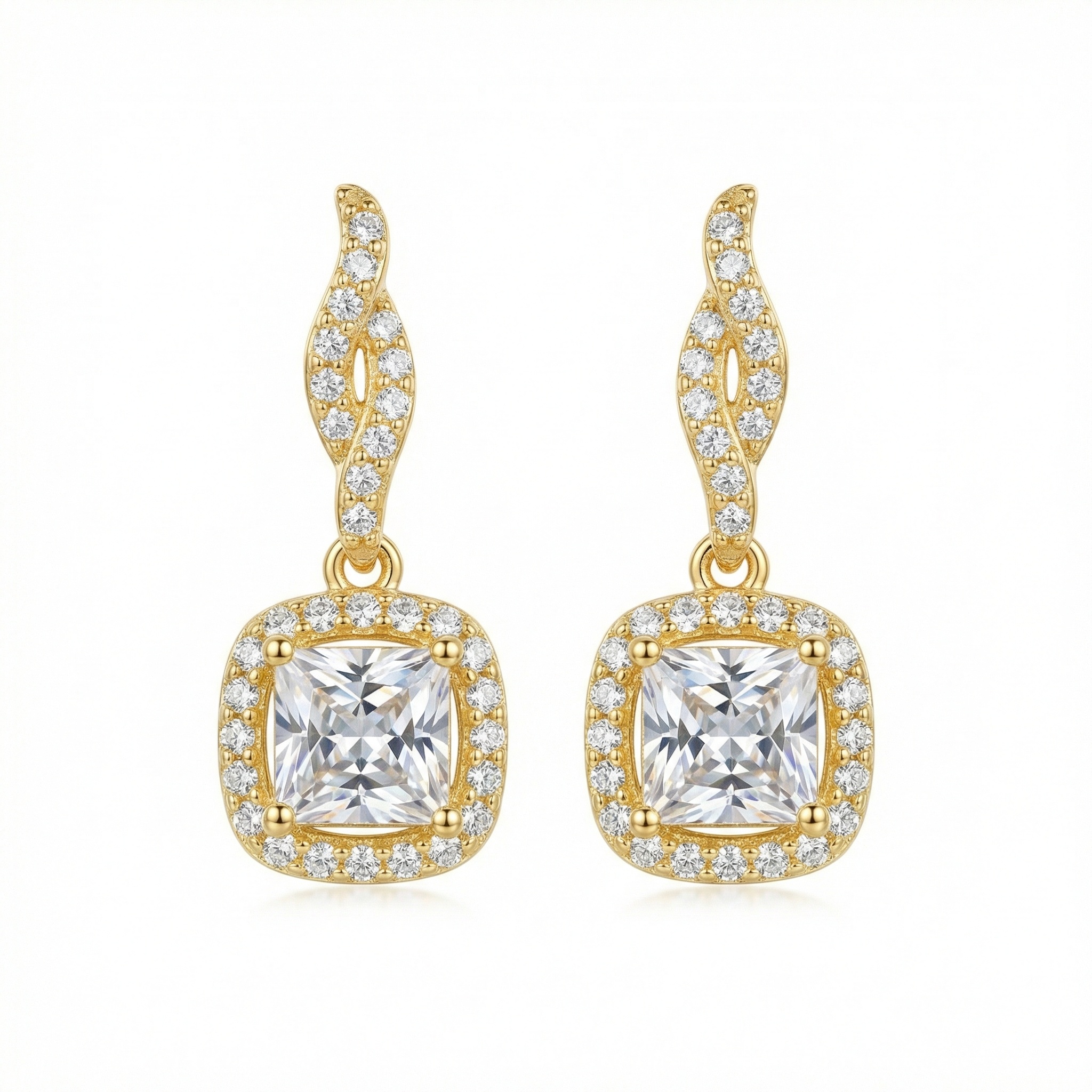 These stunning drop earrings feature a brilliant princess-cut center stone, meticulously cradled within a shimmering halo of pavé-set accents. The elegant square silhouette is suspended from a sophisticated twisted post, also adorned with sparkling smaller gems for a continuous flow of radiance. Finished with a polished metallic luster, these dangles offer a timeless yet contemporary look. Perfect for weddings, formal events, or adding a touch of glamour to your everyday attire, these earrings capture the light from every angle. The intricate craftsmanship ensures a secure fit and a luxurious feel, making them an ideal gift for yourself or a loved one. Whether paired with an evening gown or a simple blouse, these exquisite pieces provide an undeniable spark of sophistication and grace for any jewelry collection. | Brand: jewelryodm