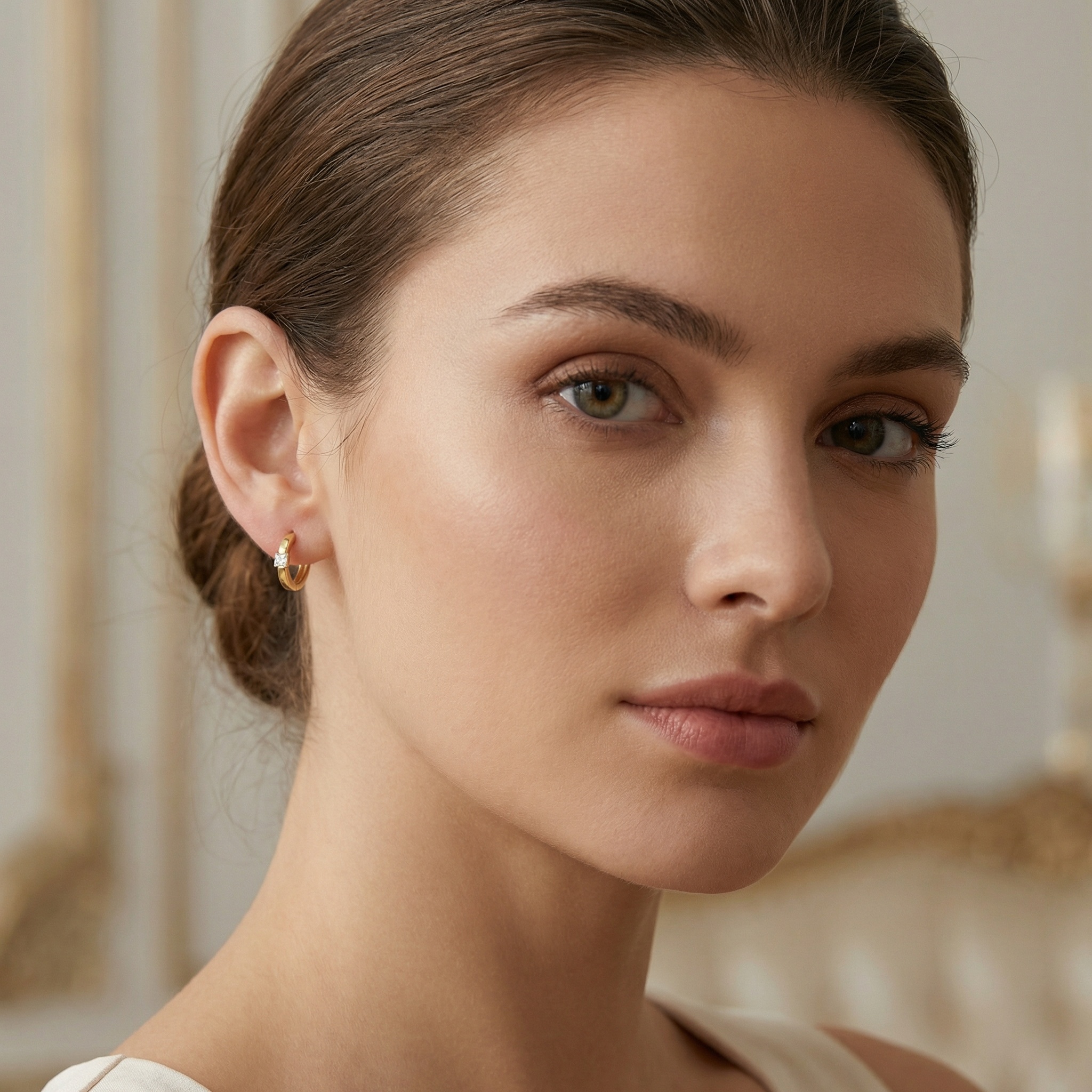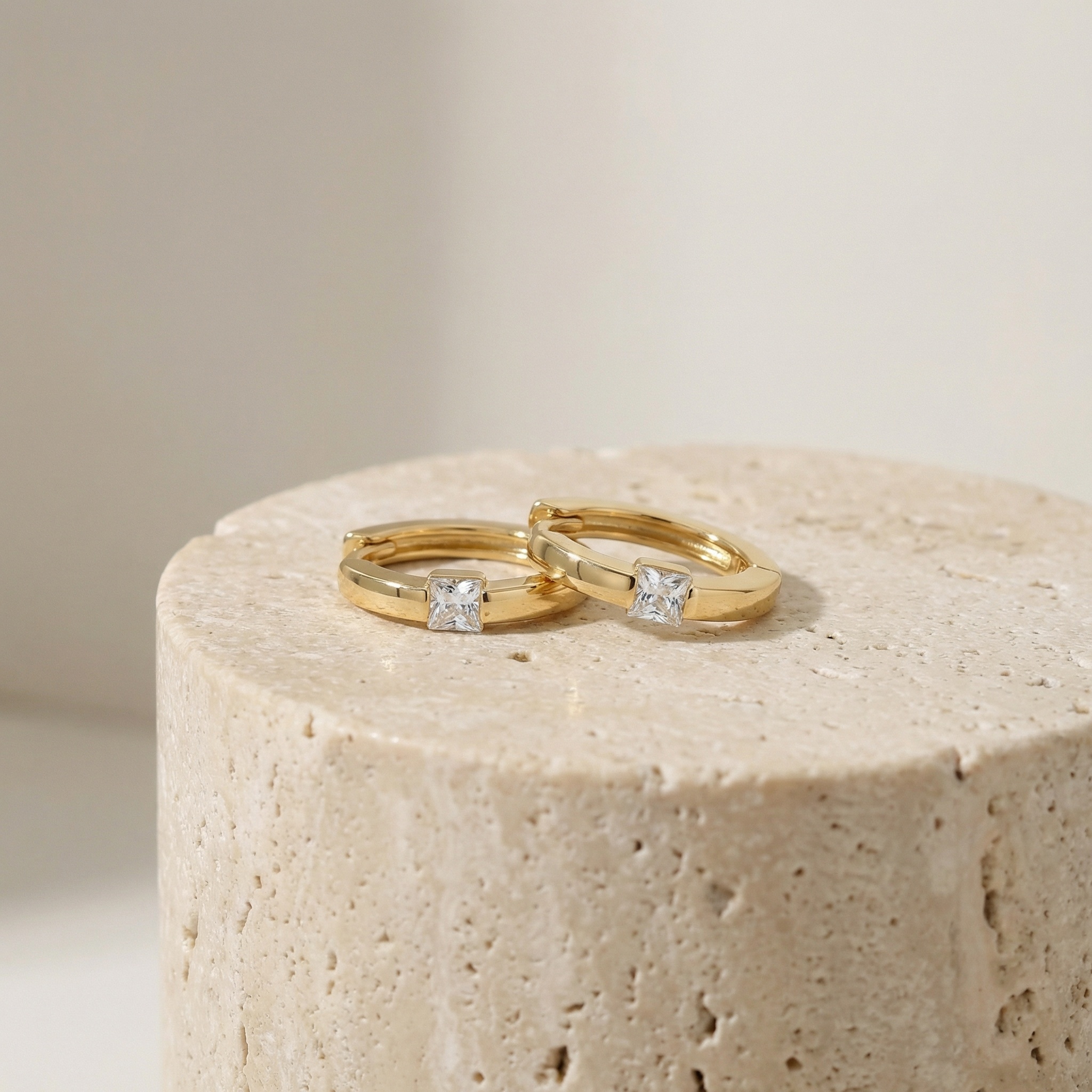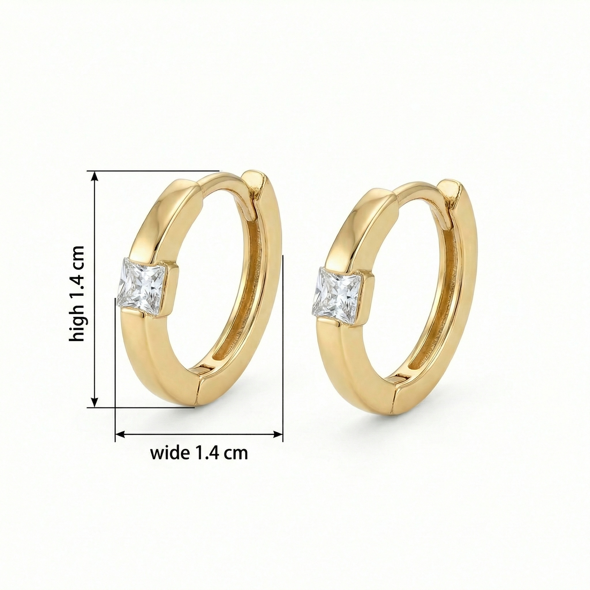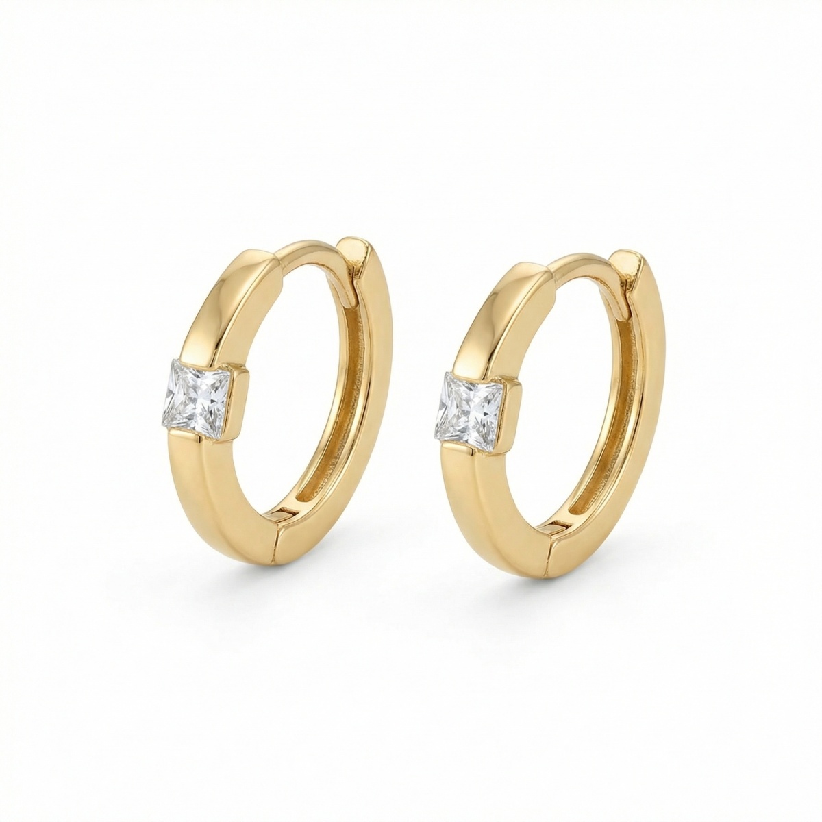 These stunning huggie hoop earrings feature a modern and minimalist design, perfect for adding a touch of sophistication to any outfit. Each earring is crafted from high-quality polished metal with a warm, lustrous tone, showcasing a brilliant square princess-cut stone set securely in the center. The seamless hinged closure ensures a comfortable and secure fit, making them ideal for everyday wear or special occasions. Their timeless appeal and understated sparkle make them a versatile addition to any jewelry collection. These hoops hug the earlobe delicately, offering a sleek profile that transitions effortlessly from day to night. Whether worn alone or stacked with other pieces, these earrings are a must-have accessory for those who appreciate classic elegance with a contemporary twist. | Brand: jewelryodm