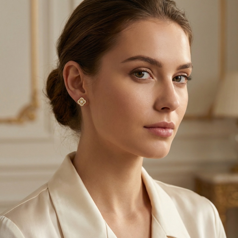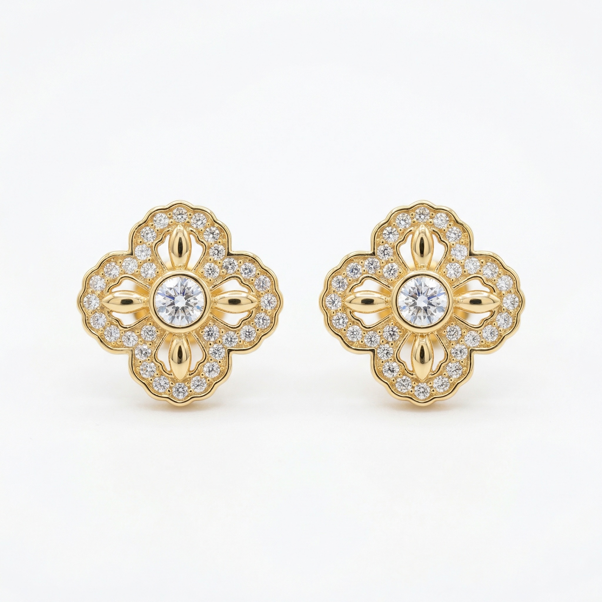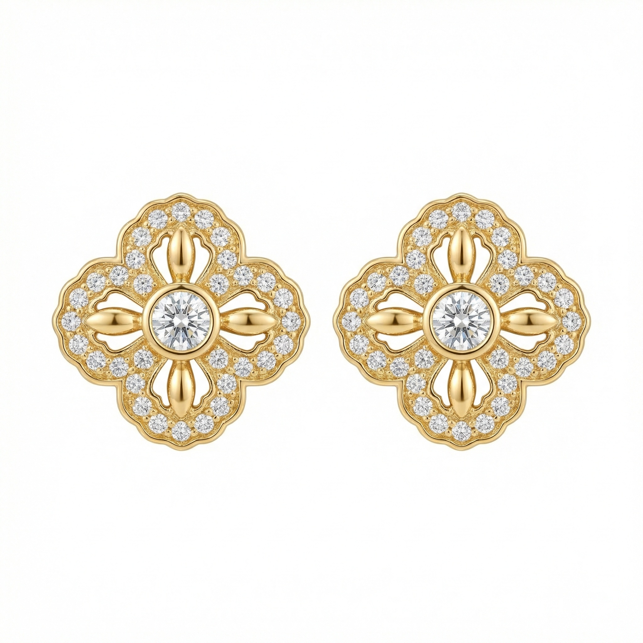 These exquisite earrings feature a classic quatrefoil design, beautifully crafted in a radiant yellow-toned precious metal. At the heart of each piece sits a brilliant round-cut diamond, surrounded by intricate openwork and a border of shimmering accent stones. The scalloped edges and delicate detailing lend a vintage charm to the modern silhouette. Perfect for adding a touch of timeless elegance to any ensemble, these studs offer a balanced blend of luxury and sophistication. The warm yellow finish complements the icy sparkle of the diamonds, making them a versatile choice for both daytime wear and formal occasions. Each earring is designed with precision, ensuring a secure and comfortable fit for all-day brilliance. | Brand: jewelryodm