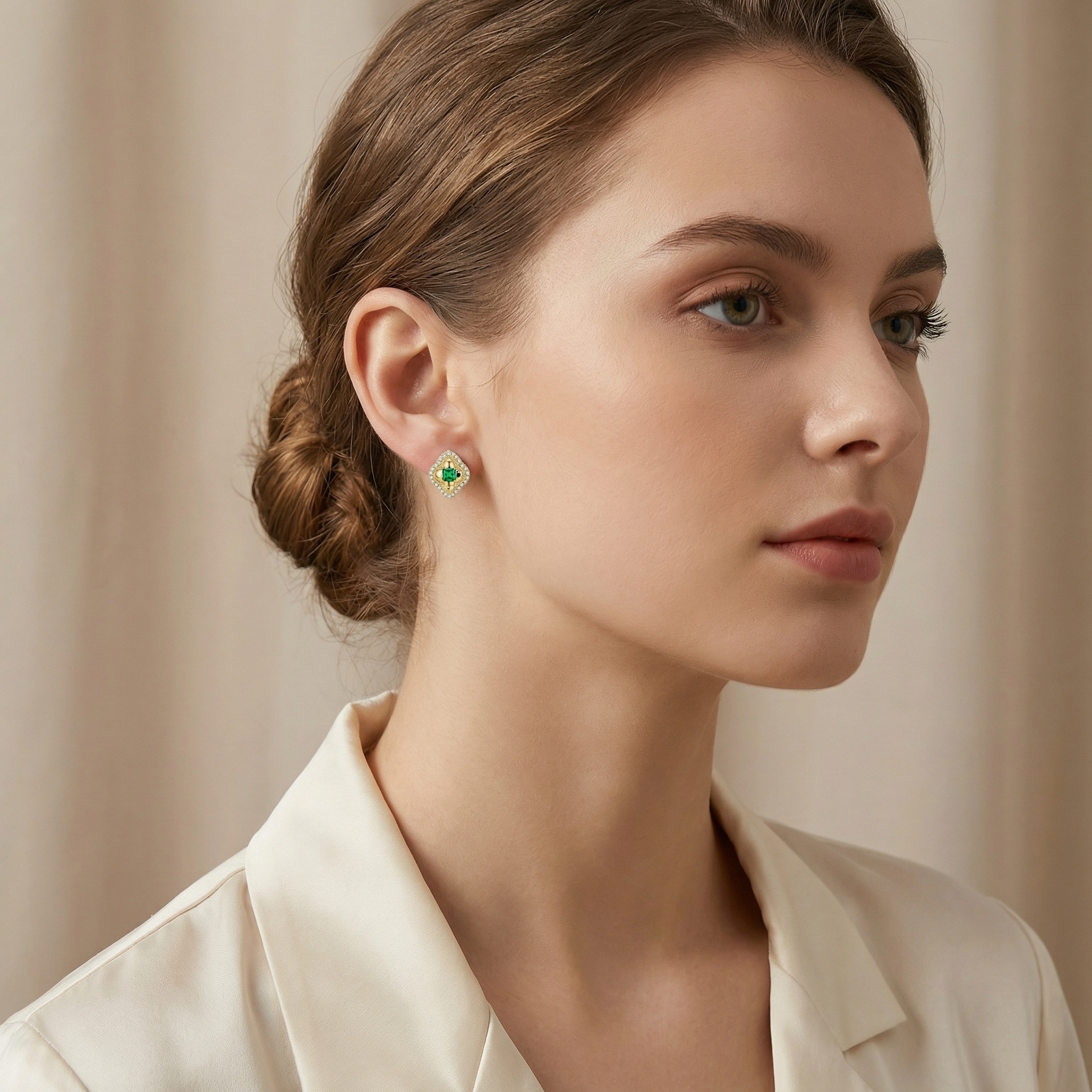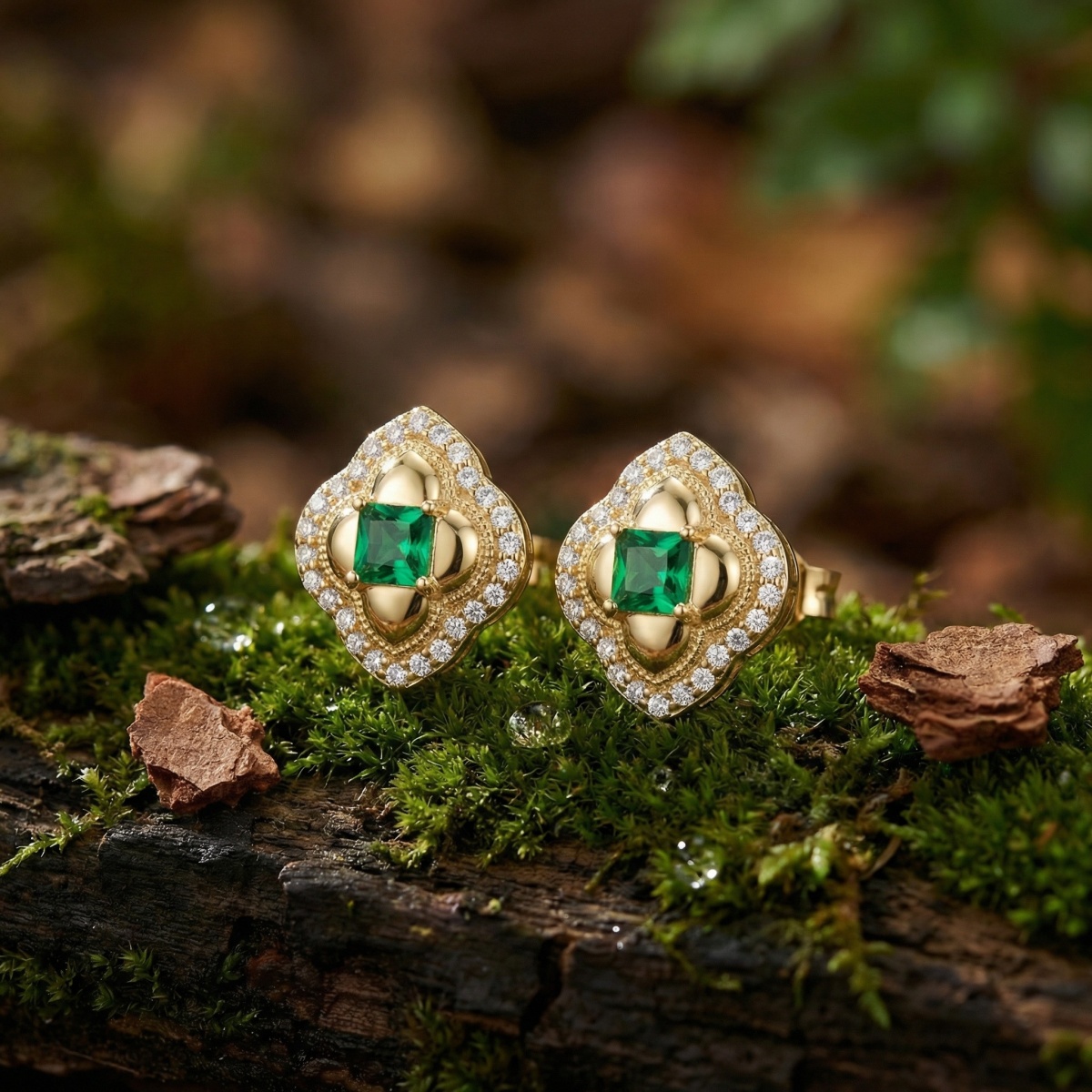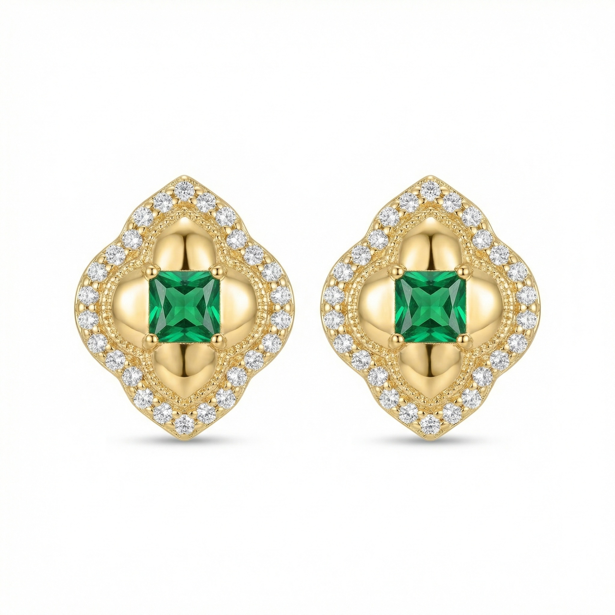 These exquisite stud earrings showcase a timeless vintage-inspired design that radiates sophistication. At the heart of each earring sits a vibrant, princess-cut green gemstone, capturing the light with every movement. The central stones are cradled in a unique, polished metal setting that features intricate milgrain detailing for an antique touch. Surrounding this central motif is a stunning quatrefoil-shaped halo adorned with brilliant white accent stones that add a touch of sparkle and contrast. The combination of the deep green hue and the shimmering white borders creates a classic aesthetic suitable for both formal events and everyday elegance. These studs offer a regal charm, making them a perfect addition to any jewelry collection. The secure backings ensure comfortable wear throughout the day. Elevate your style with these masterfully crafted pieces that blend traditional craftsmanship with contemporary brilliance. | Brand: jewelryodm