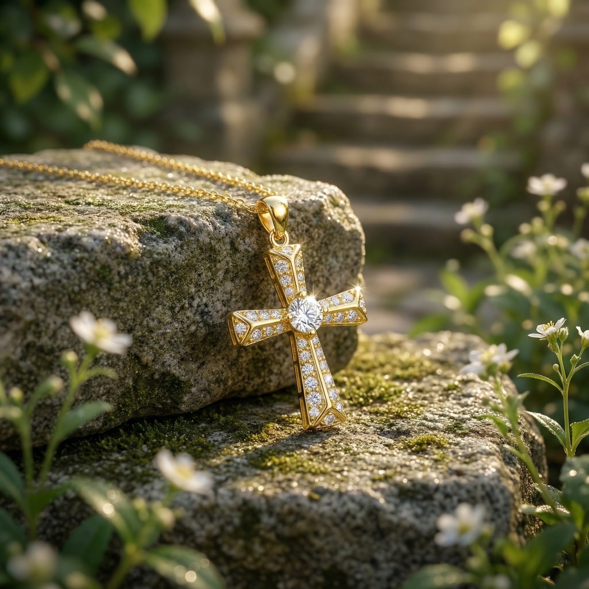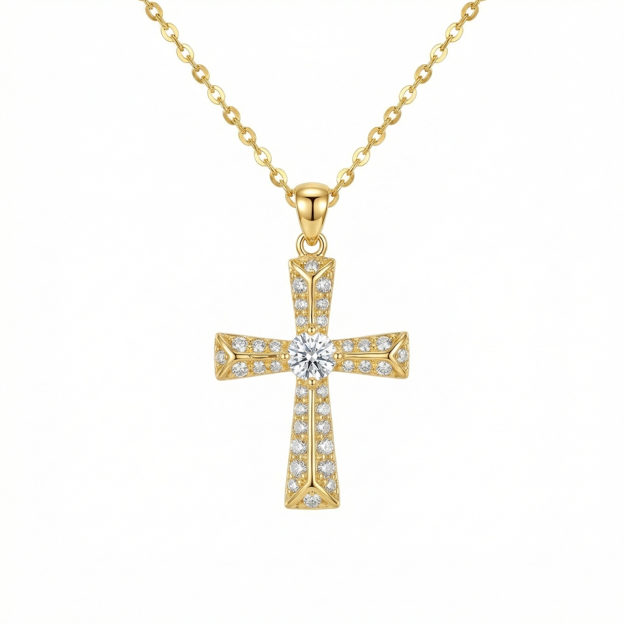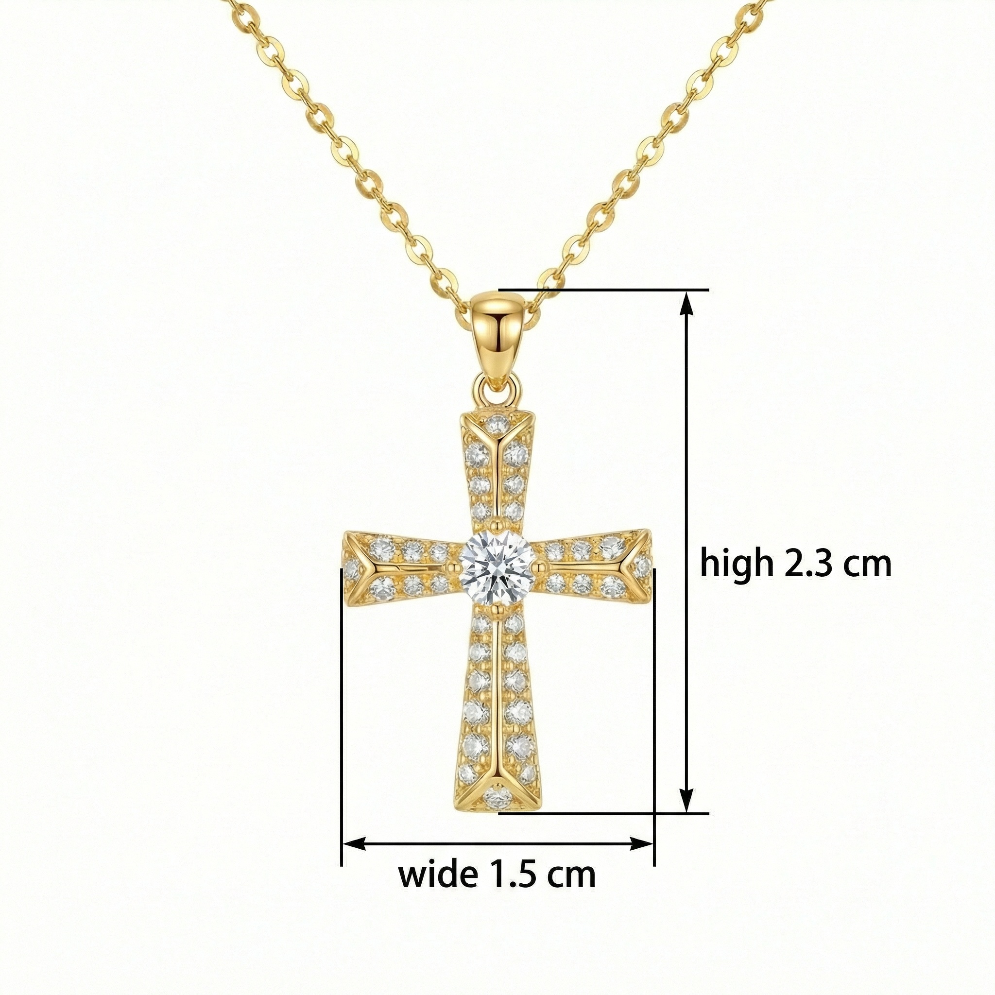 This exquisite cross pendant necklace combines timeless faith with contemporary elegance. Crafted with a stunning shimmering metallic finish, the piece features a prominent central brilliant-cut stone that captures the light from every angle. The arms of the cross are meticulously detailed with a series of smaller, shimmering crystals set into a textured, ornate pattern, adding a touch of vintage-inspired charm. Suspended from a delicate yet sturdy link chain, this necklace serves as a beautiful symbol of devotion or a sophisticated accessory for any occasion. Whether worn daily or saved for special moments, its radiant luster and intricate craftsmanship make it a standout addition to any jewelry collection. Perfect as a meaningful gift for loved ones, this piece celebrates beauty and spirituality in one graceful design. | Brand: jewelryodm