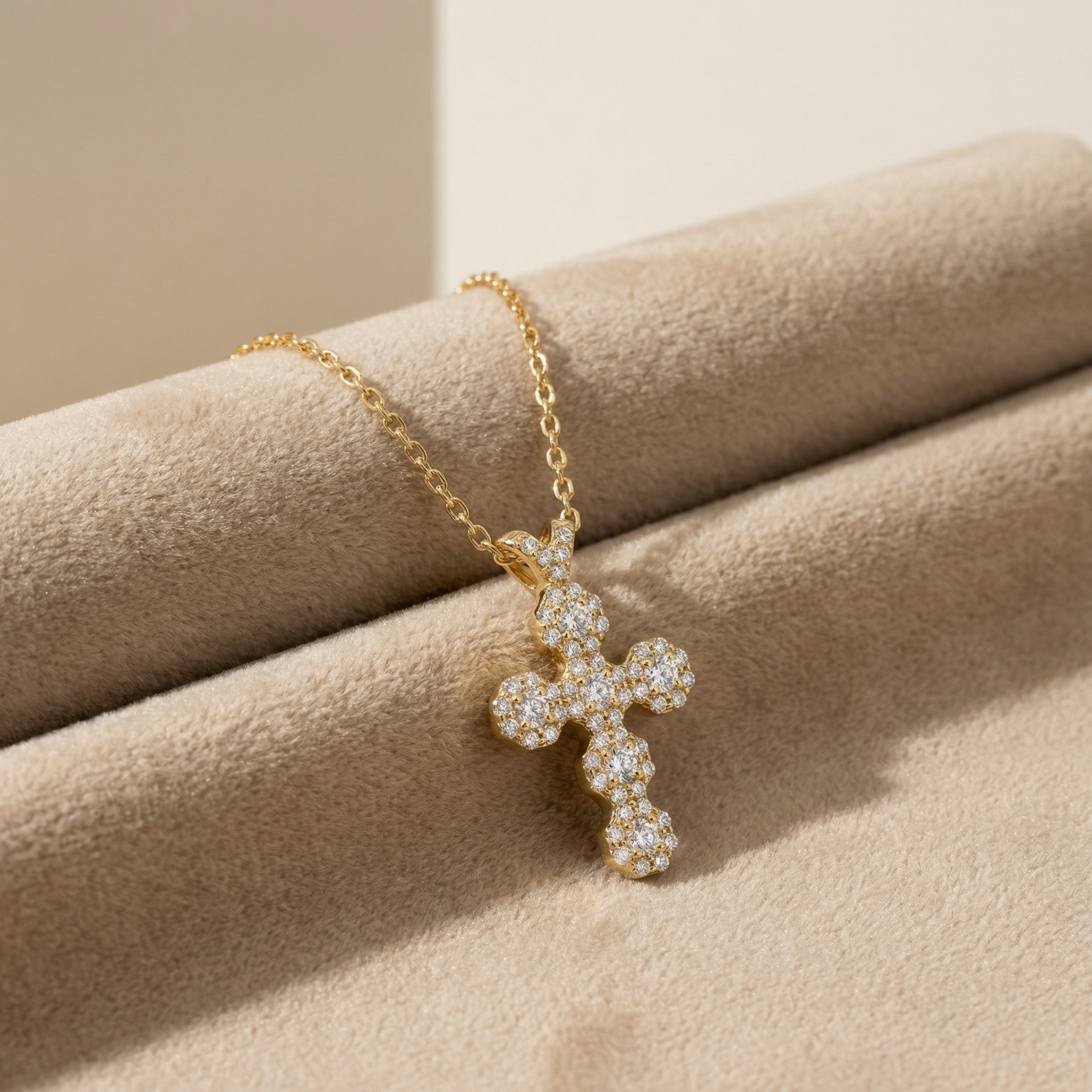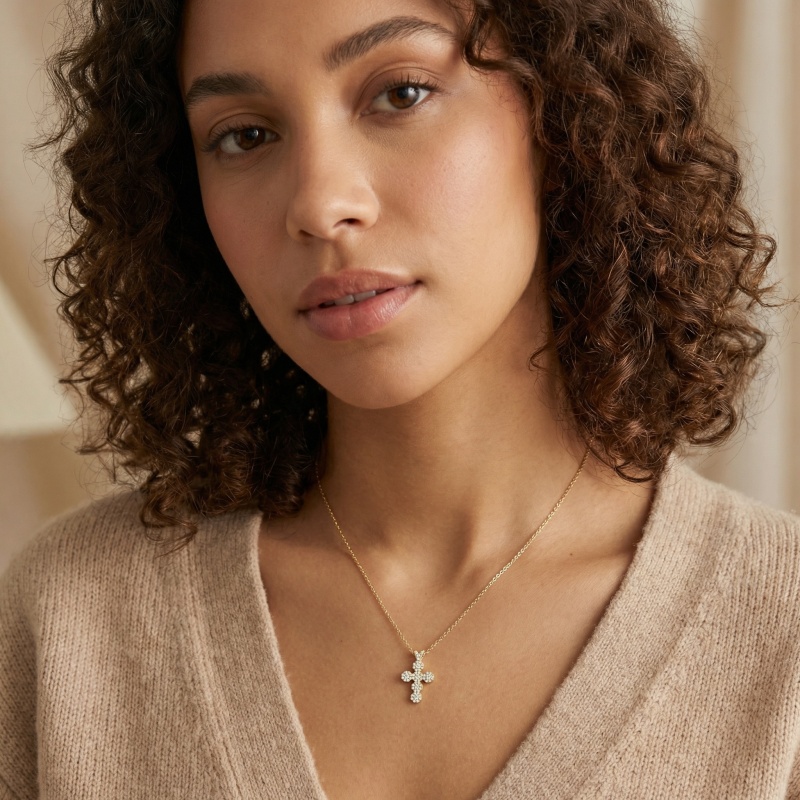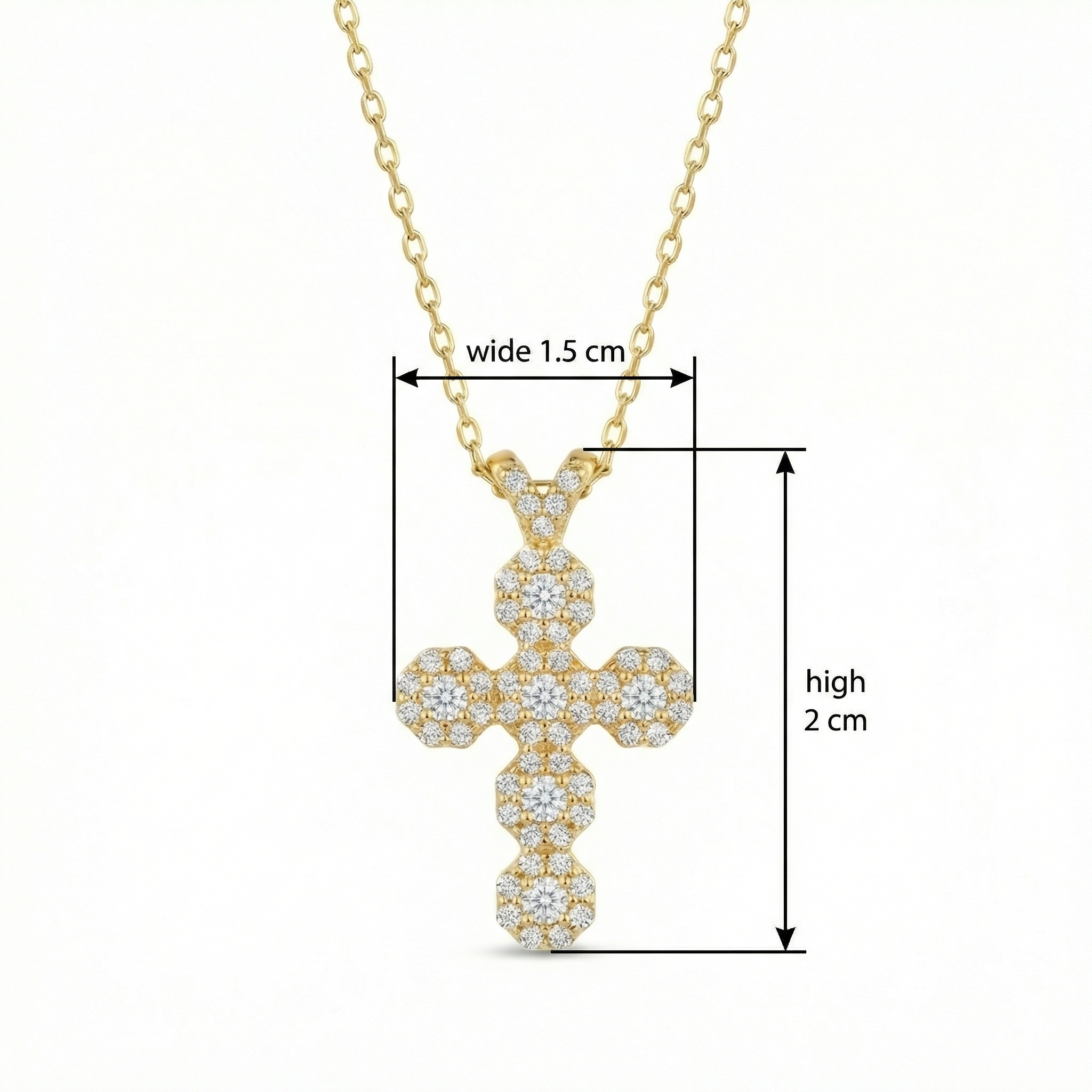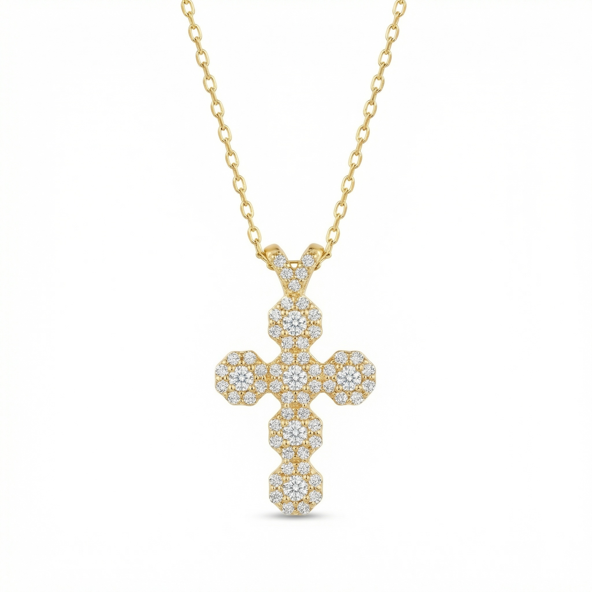 This exquisite cross pendant features a sophisticated design composed of multiple diamond clusters. Each point of the cross is adorned with a brilliant central stone surrounded by a delicate halo of smaller round-cut diamonds, creating a mesmerizing shimmer from every angle. The warm yellow tone of the setting enhances the radiance of the gems, making it a timeless piece of jewelry. This necklace is perfect for expressing faith with elegance or as a meaningful gift for a special occasion. The intricate craftsmanship ensures a luxurious feel, while the classic silhouette remains versatile for both daily wear and formal events. Suspended from a delicate matching chain, this sparkling cross serves as a beautiful and refined symbol of devotion. | Brand: jewelryodm