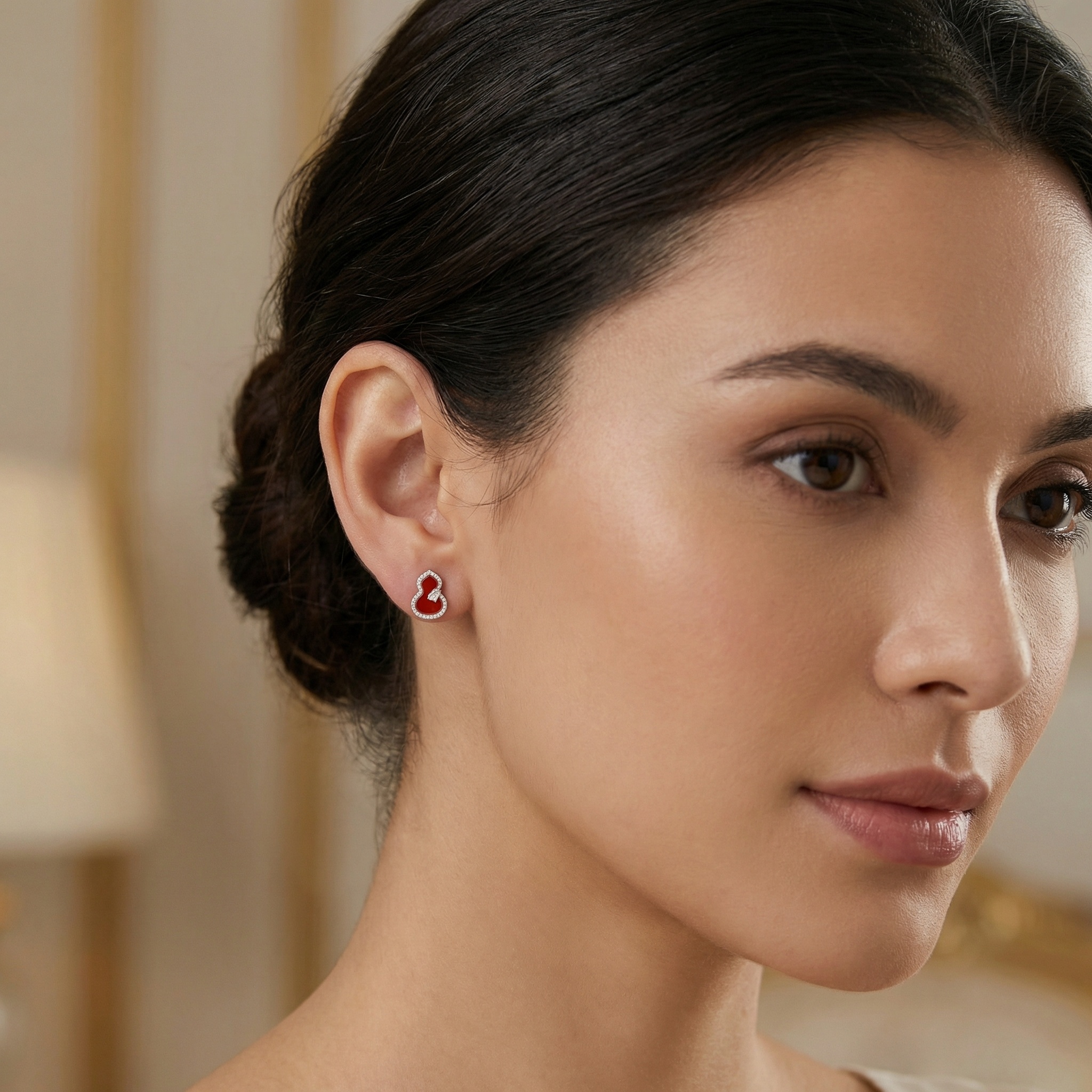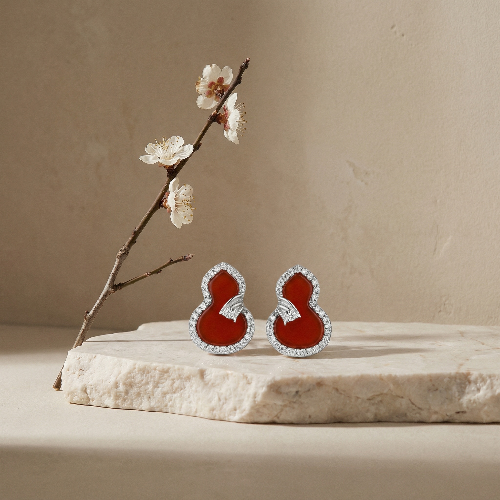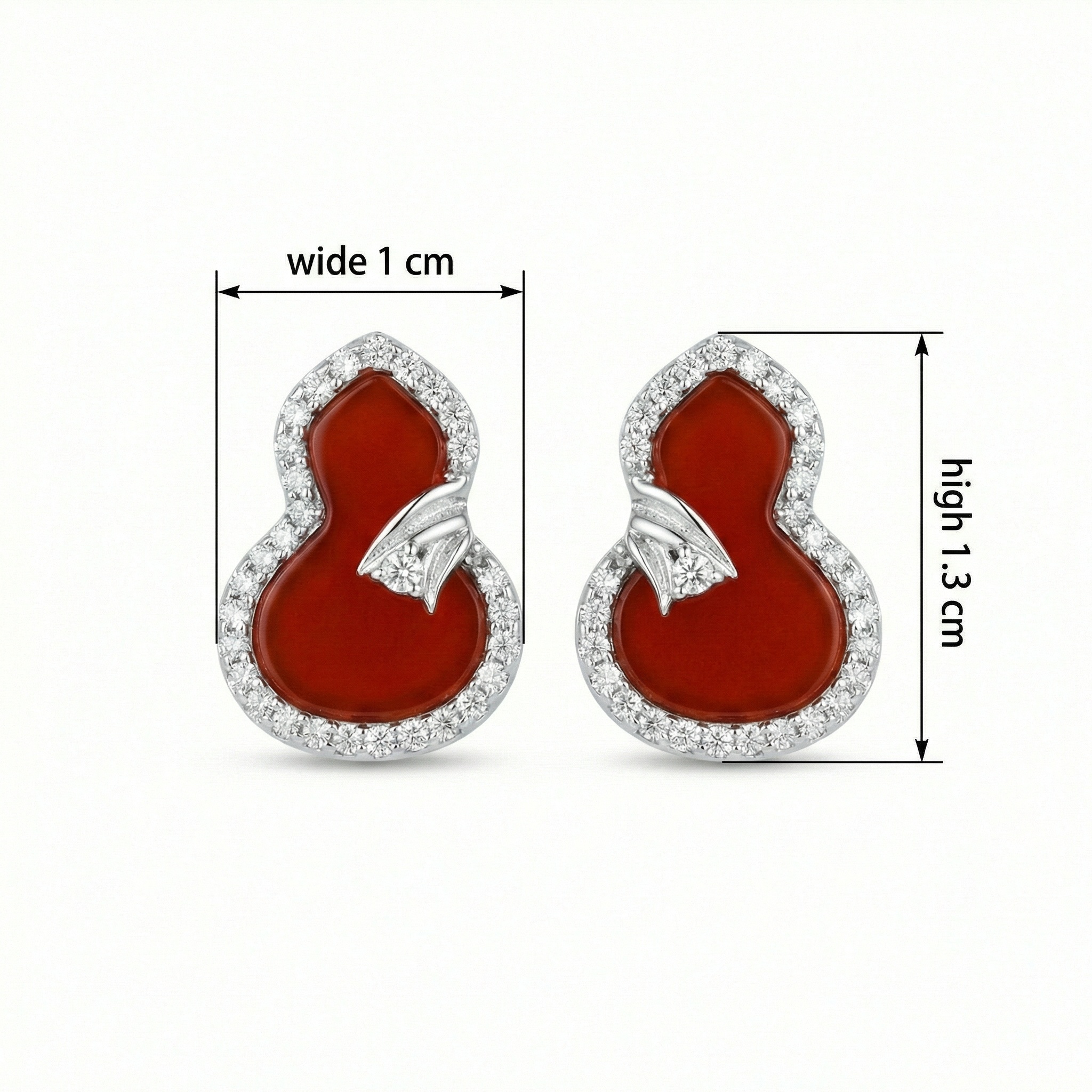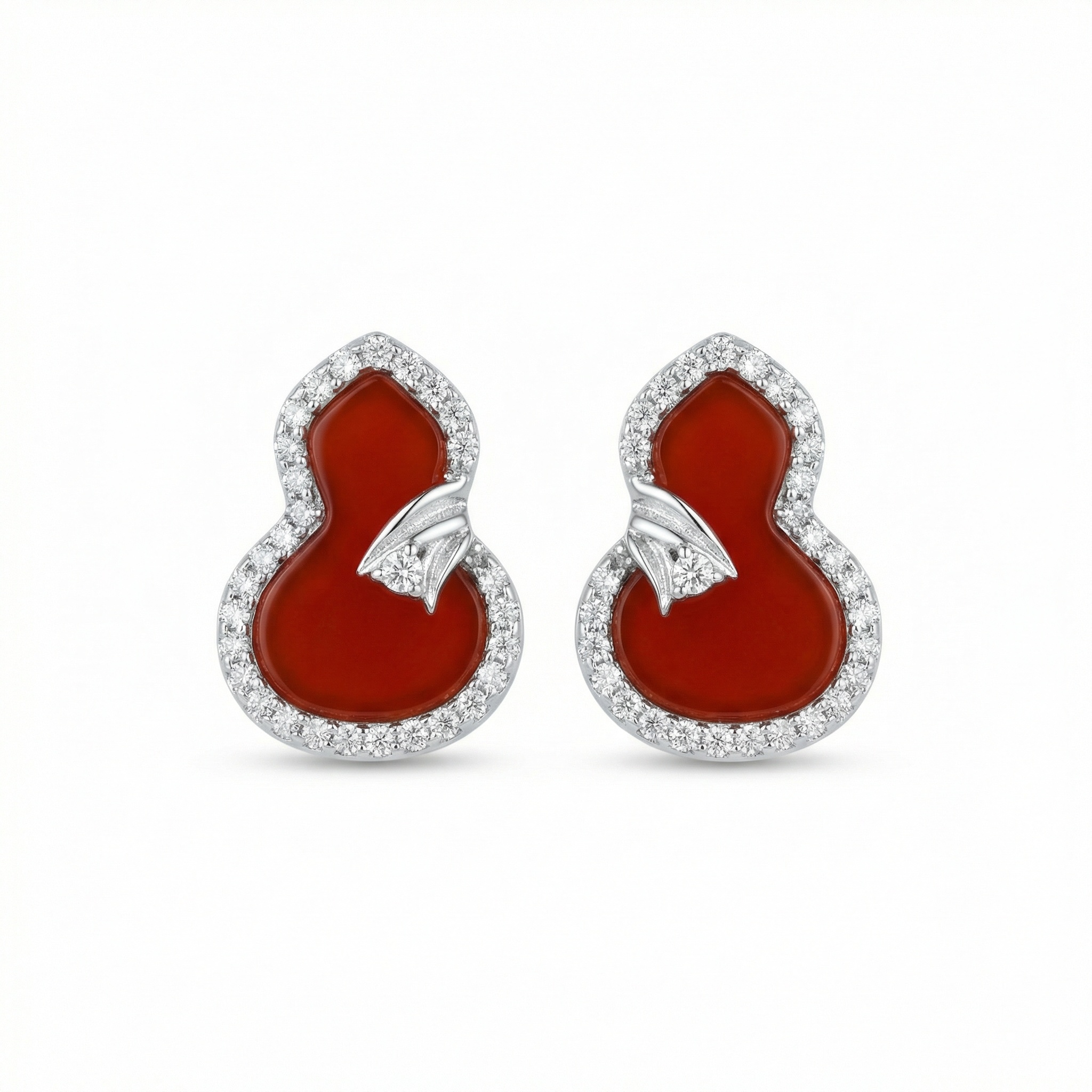 These exquisite stud earrings feature a traditional calabash silhouette, a timeless symbol of longevity and prosperity. Each piece showcases a vibrant, smooth red carnelian center, polished to a brilliant luster. The deep red stone is elegantly framed by a halo of shimmering round diamonds that provide a stunning contrast and catch the light beautifully. A delicate, diamond-set ribbon motif at the waist of the gourd adds a touch of intricate detail and refined charm. Set in a polished white precious metal, these earrings combine auspicious traditional design with contemporary luxury. Whether worn for a special celebration or as a daily statement of elegance, these earrings are a meaningful and sophisticated addition to any jewelry collection. | Brand: jewelryodm
