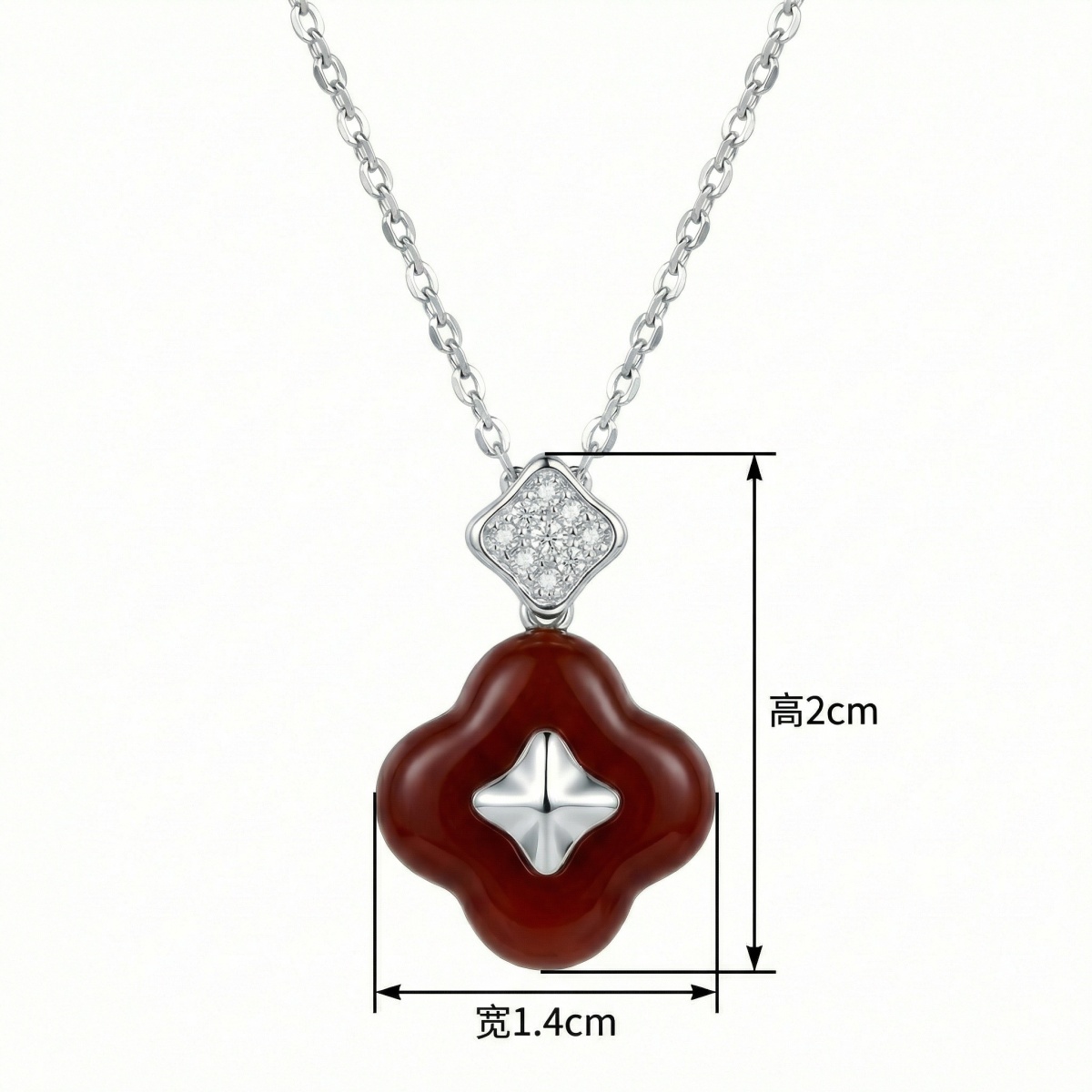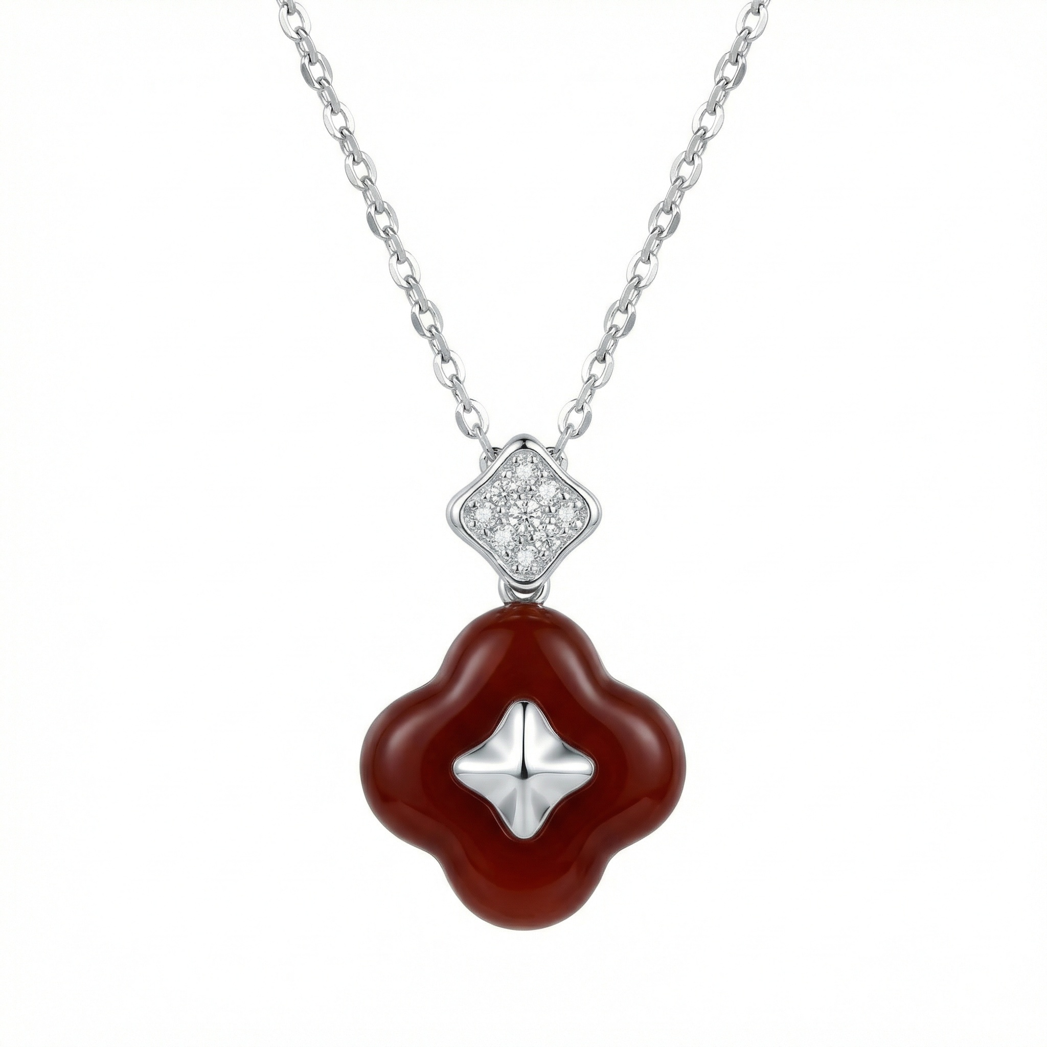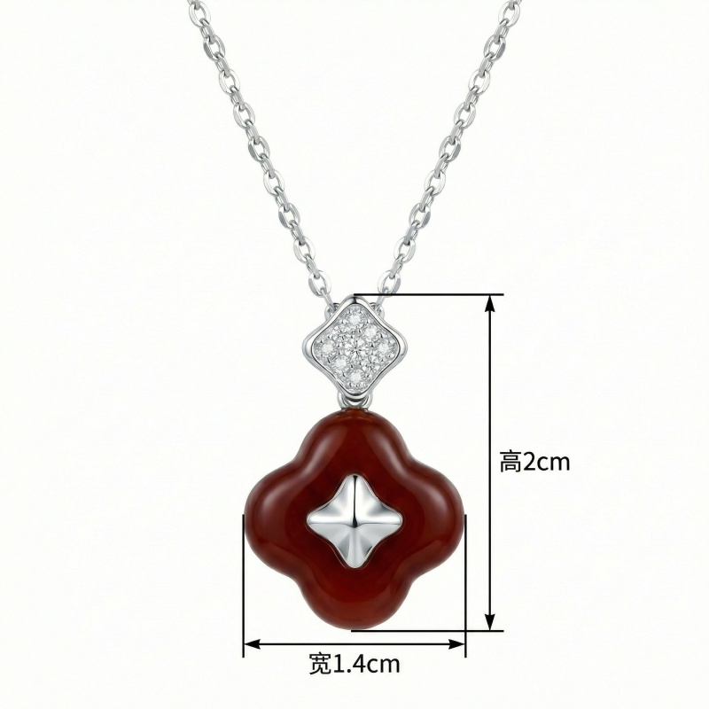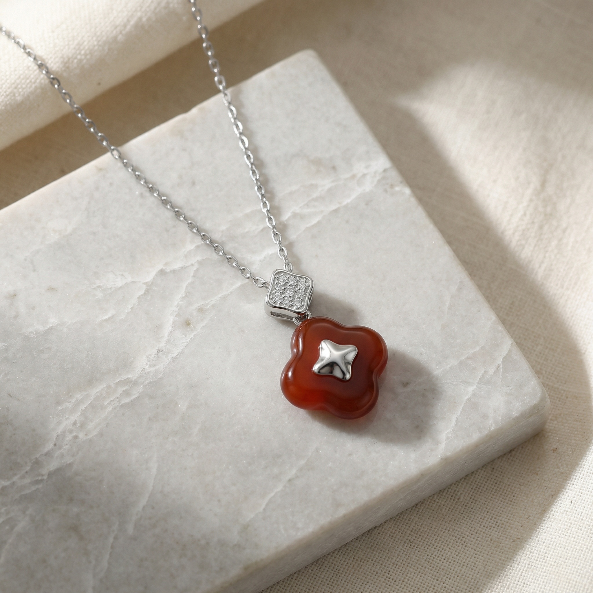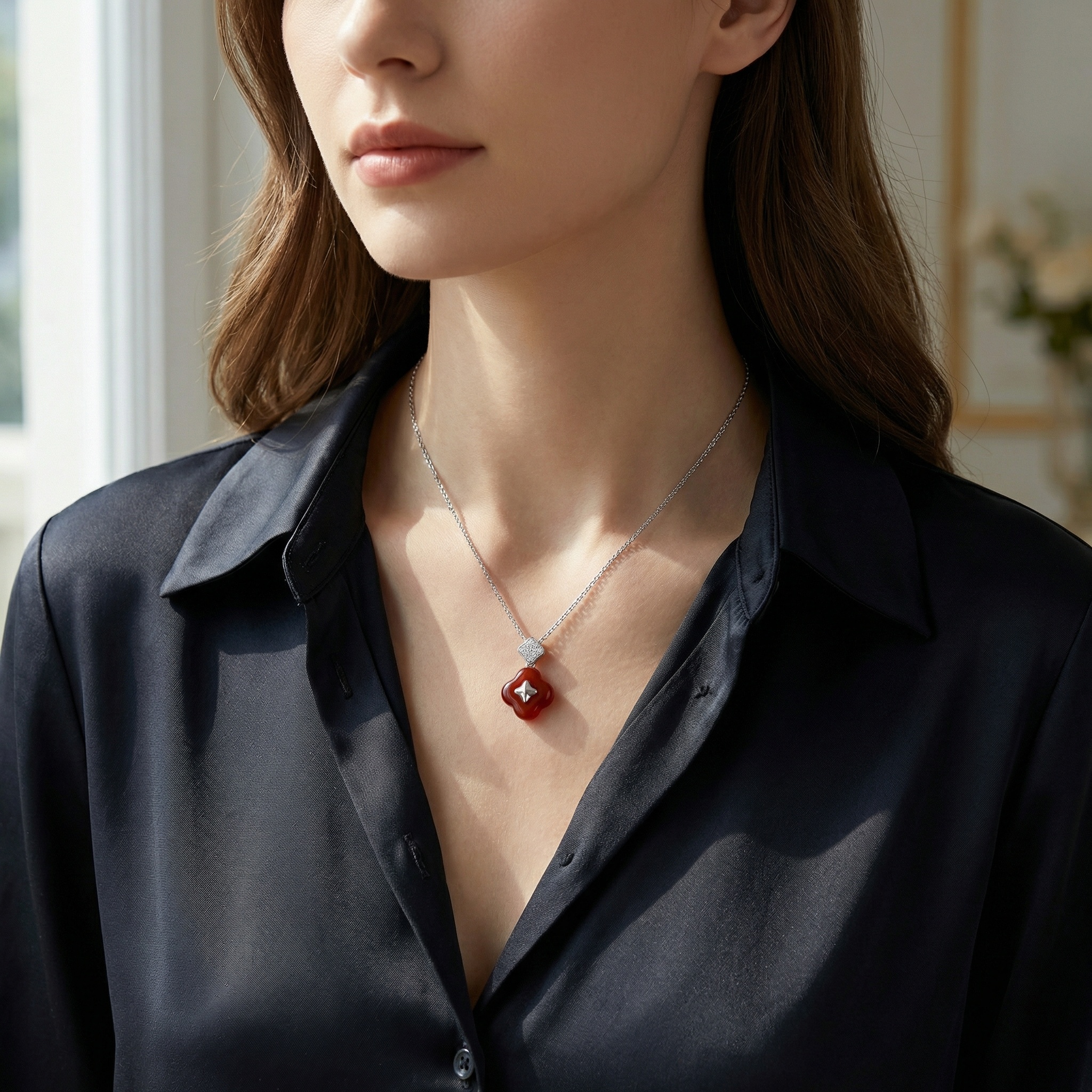 【Delivery Includes】 1 x Necklace featuring Diamond Pavé and Red Carnelian in Quatrefoil Design 1 x Luxury Gift Box 1 x Jewelry Cleaning Cloth 【Care Instructions】 1. When not wearing, gently wipe the necklace with the provided cleaning cloth and store it in the gift box to prevent scratches and oxidation. 2. Avoid contact with chemicals, perfumes, and excessive moisture to maintain the luster and brilliance of the diamonds and carnelian. 3. Remove the necklace before bathing, swimming, or engaging in intense physical activities to ensure longevity and prevent damage. 4. Separate from other jewelry to avoid abrasions and keep gemstones secure. | Brand: jewelryodm