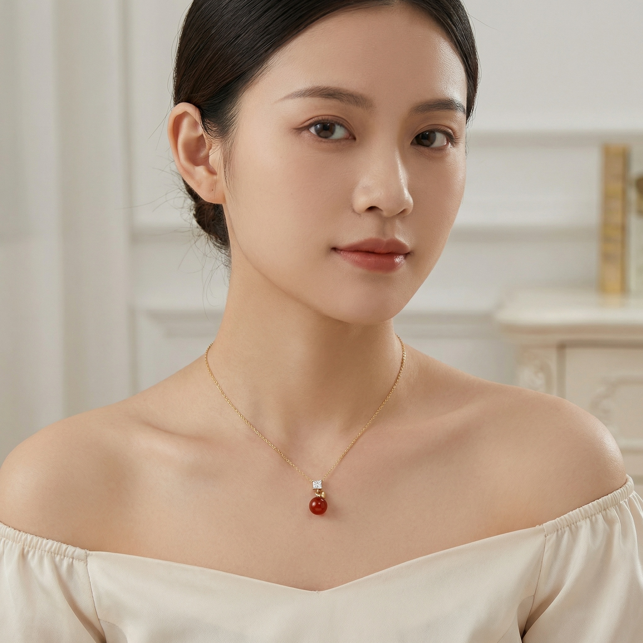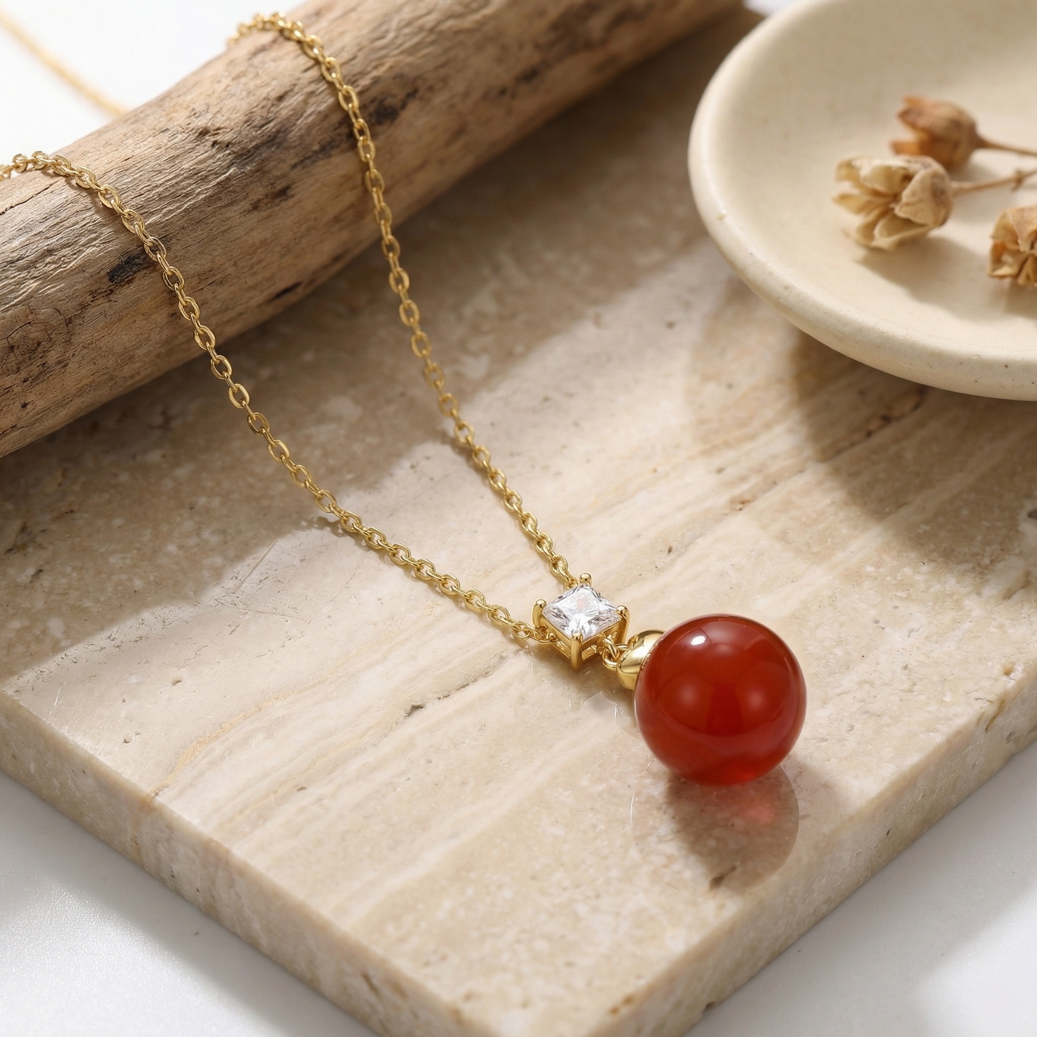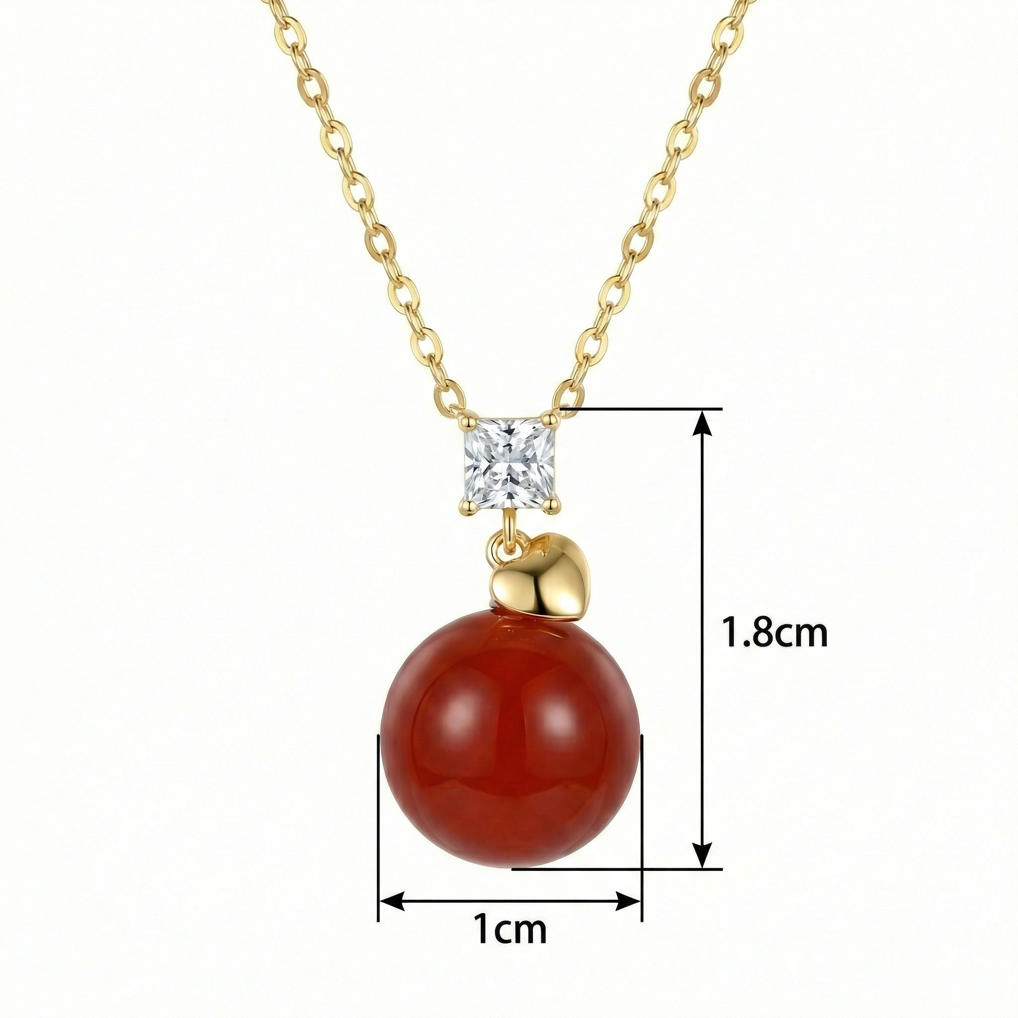 This exquisite jewelry piece features a vibrant, polished red agate sphere that serves as the stunning centerpiece. Hanging gracefully from a delicate metallic link chain, the pendant is topped with a brilliant, square-cut crystal that catches the light beautifully. Adding a touch of romance, a dainty heart-shaped charm sits nestled between the clear gemstone and the large spherical bead. The warm metallic finish of the settings complements the deep, earthy tones of the stone, creating a sophisticated and timeless look. Perfect for adding a pop of color to any outfit, this necklace combines geometric precision with soft, organic curves. Whether worn for a special occasion or as a daily statement piece, its unique design and rich colors make it a captivating accessory for any collection. | Brand: jewelryodm