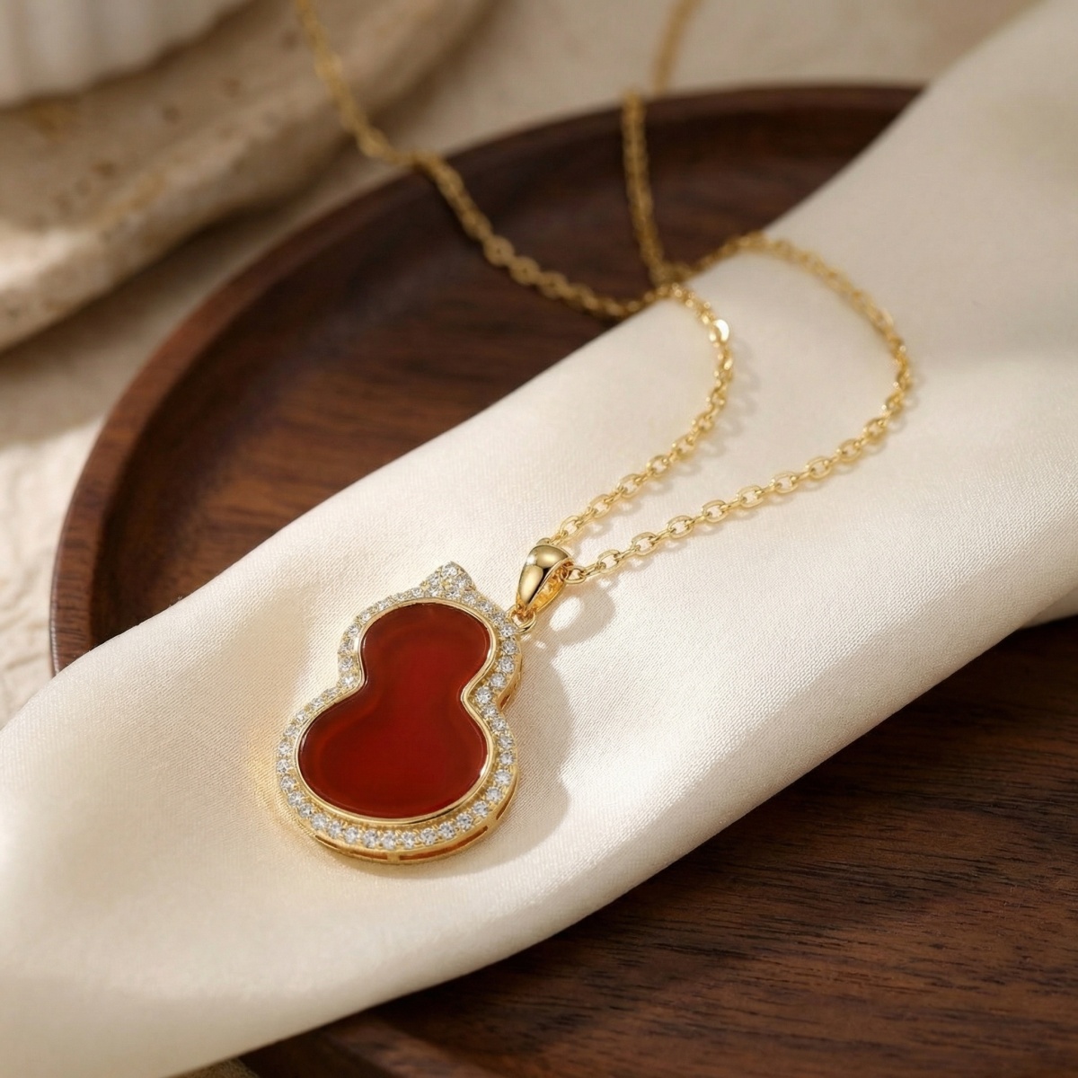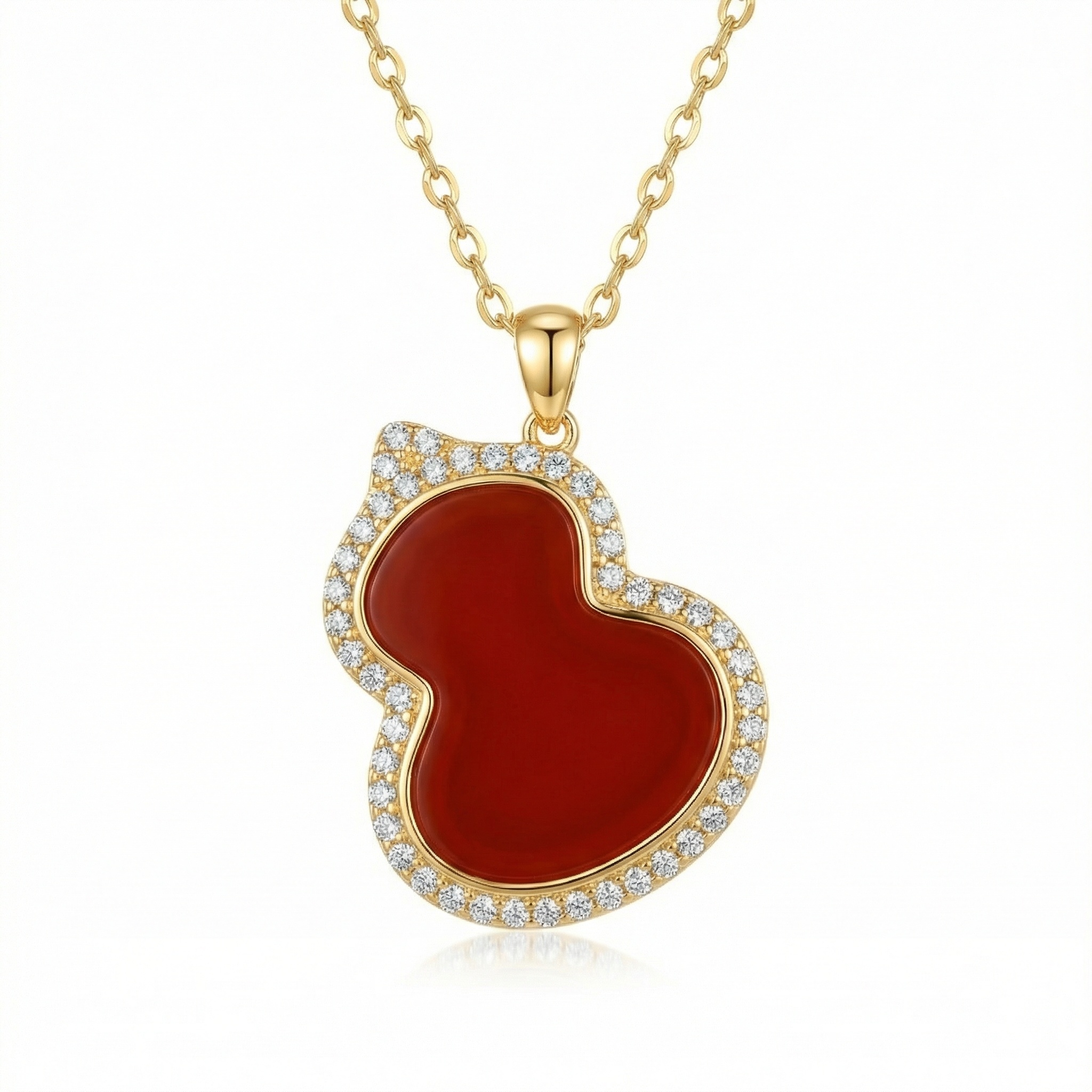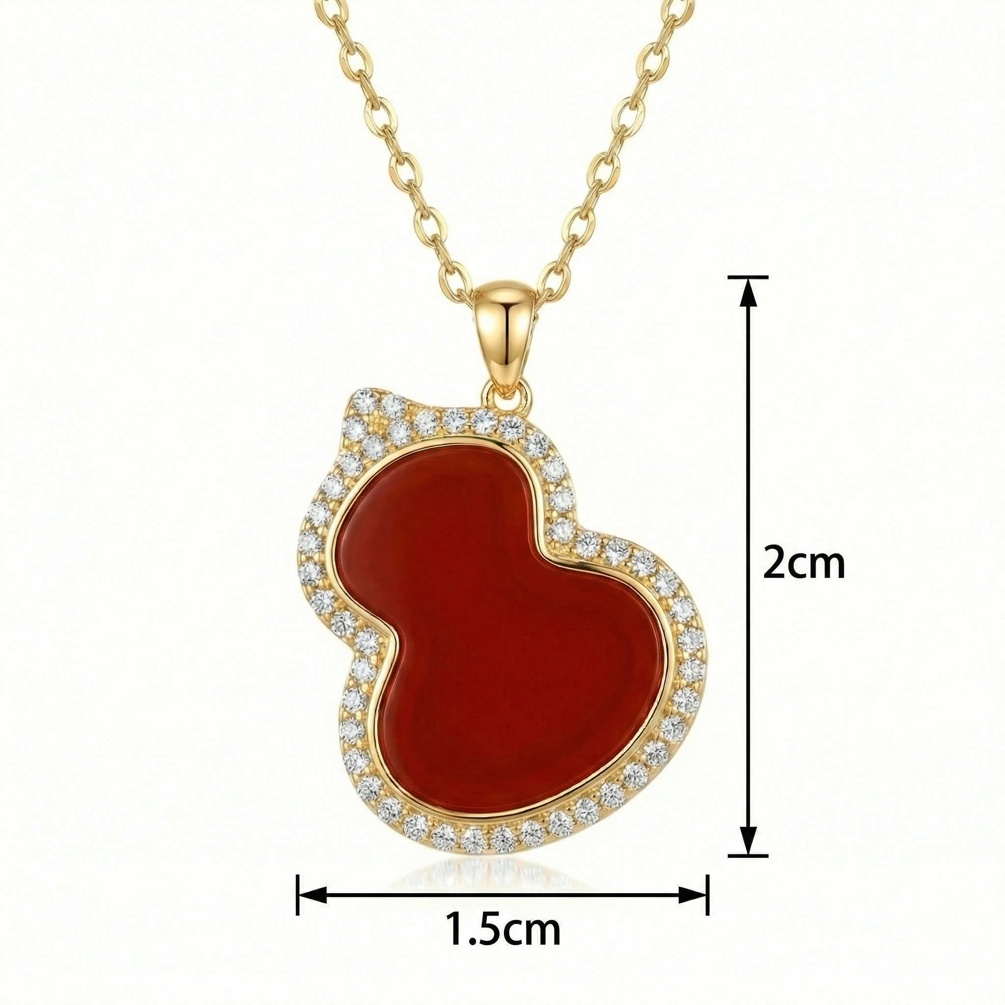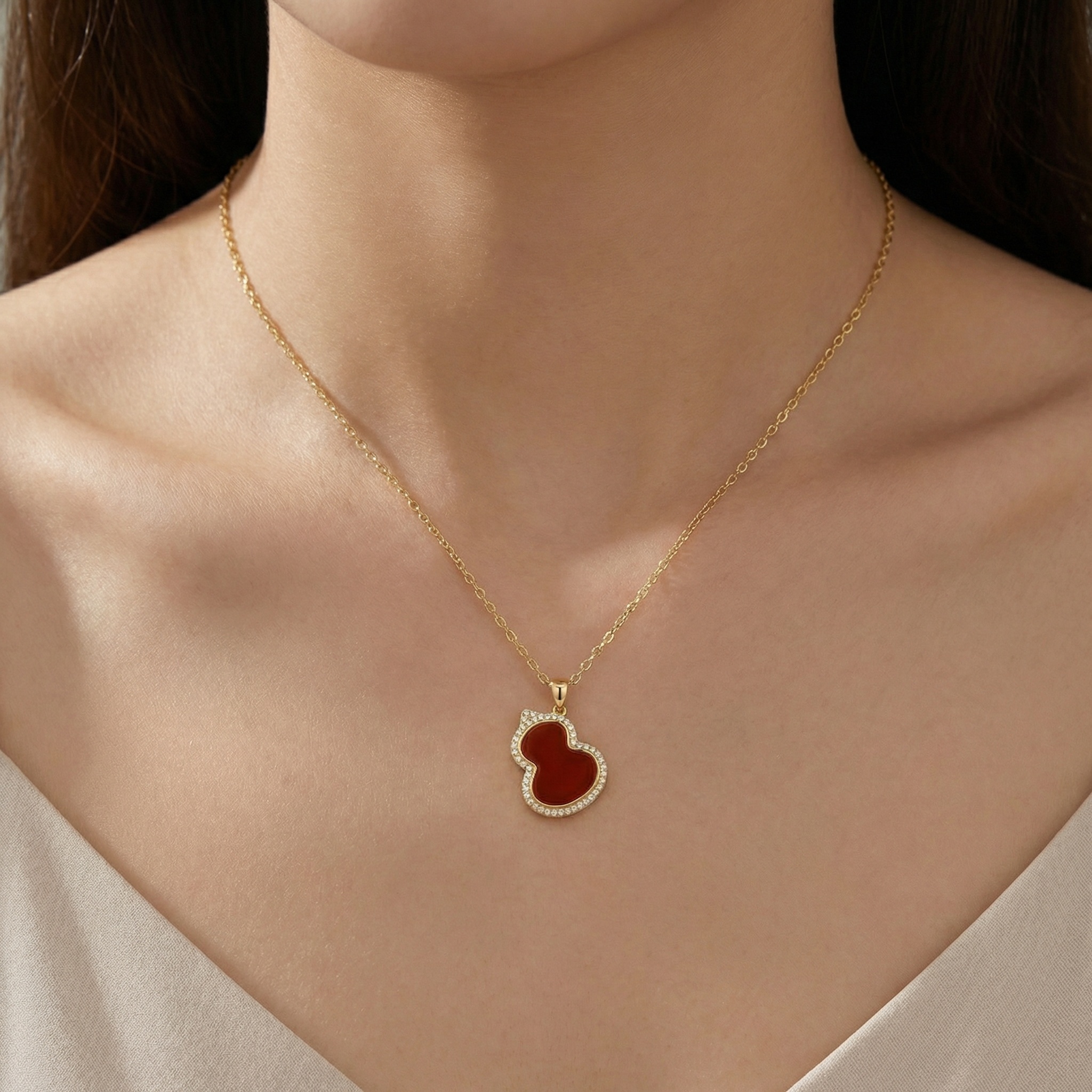 This exquisite necklace features a classic hulu or gourd-shaped pendant, a symbol traditionally associated with prosperity and longevity. The centerpiece is a rich, polished red carnelian inlay that provides a bold pop of color. Surrounding the deep crimson stone is a shimmering halo of meticulously set round-cut brilliant crystals, adding a touch of sophisticated radiance. The pendant hangs gracefully from a delicate link chain with a polished metallic finish, making it a versatile piece for both daily wear and special occasions. Perfect as a meaningful gift or a stylish addition to your personal collection, this jewelry piece combines traditional motifs with modern elegance. Its vibrant red hue and sparkling border create a captivating contrast that draws the eye and complements any outfit with a touch of timeless charm. | Brand: jewelryodm