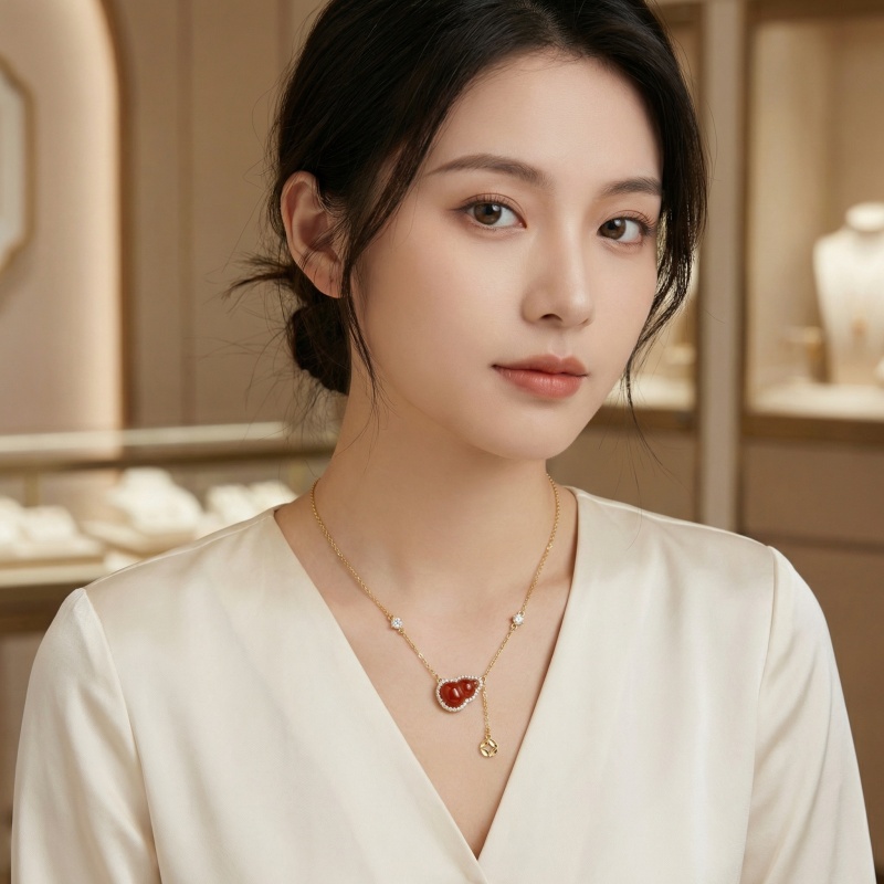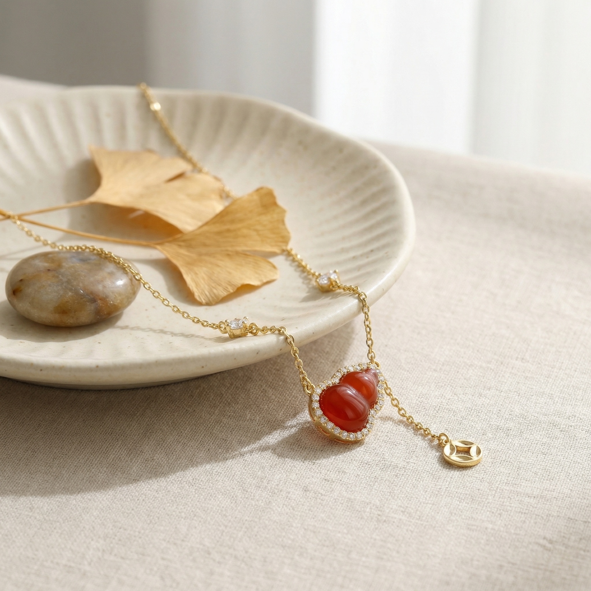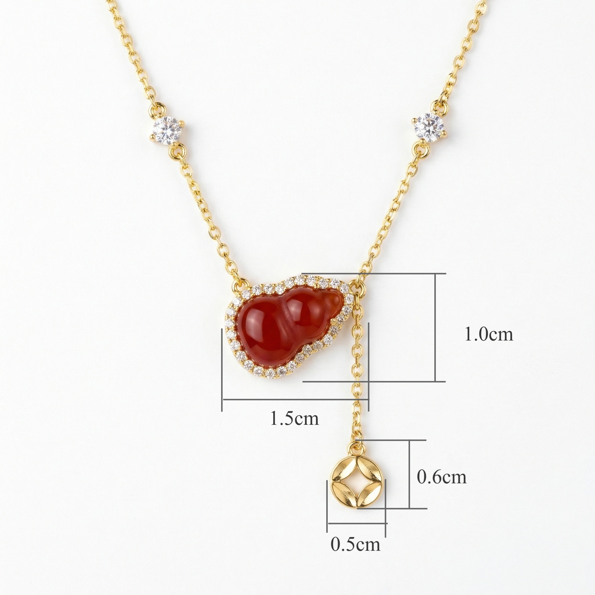 This exquisite necklace features a vibrant red carnelian pendant carved into a traditional hulu shape, symbolizing prosperity and longevity. The centerpiece is elegantly framed by a halo of shimmering accents, catching the light from every angle. The delicate chain is further adorned with two brilliant-cut stones on either side, adding layers of radiance. A unique dangling charm, shaped like an auspicious ancient coin, hangs gracefully from the side of the pendant, enhancing its symbolic meaning. Crafted with a lustrous polished finish, this piece beautifully blends cultural heritage with modern sophistication. It serves as a perfect statement accessory or a meaningful gift for those who appreciate fine detail and symbolic jewelry. The adjustable chain ensures a perfect fit, making it a versatile addition to any collection. | Brand: jewelryodm