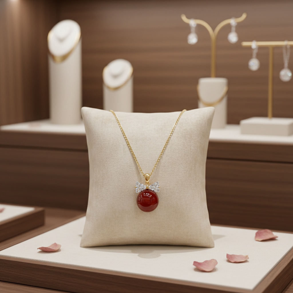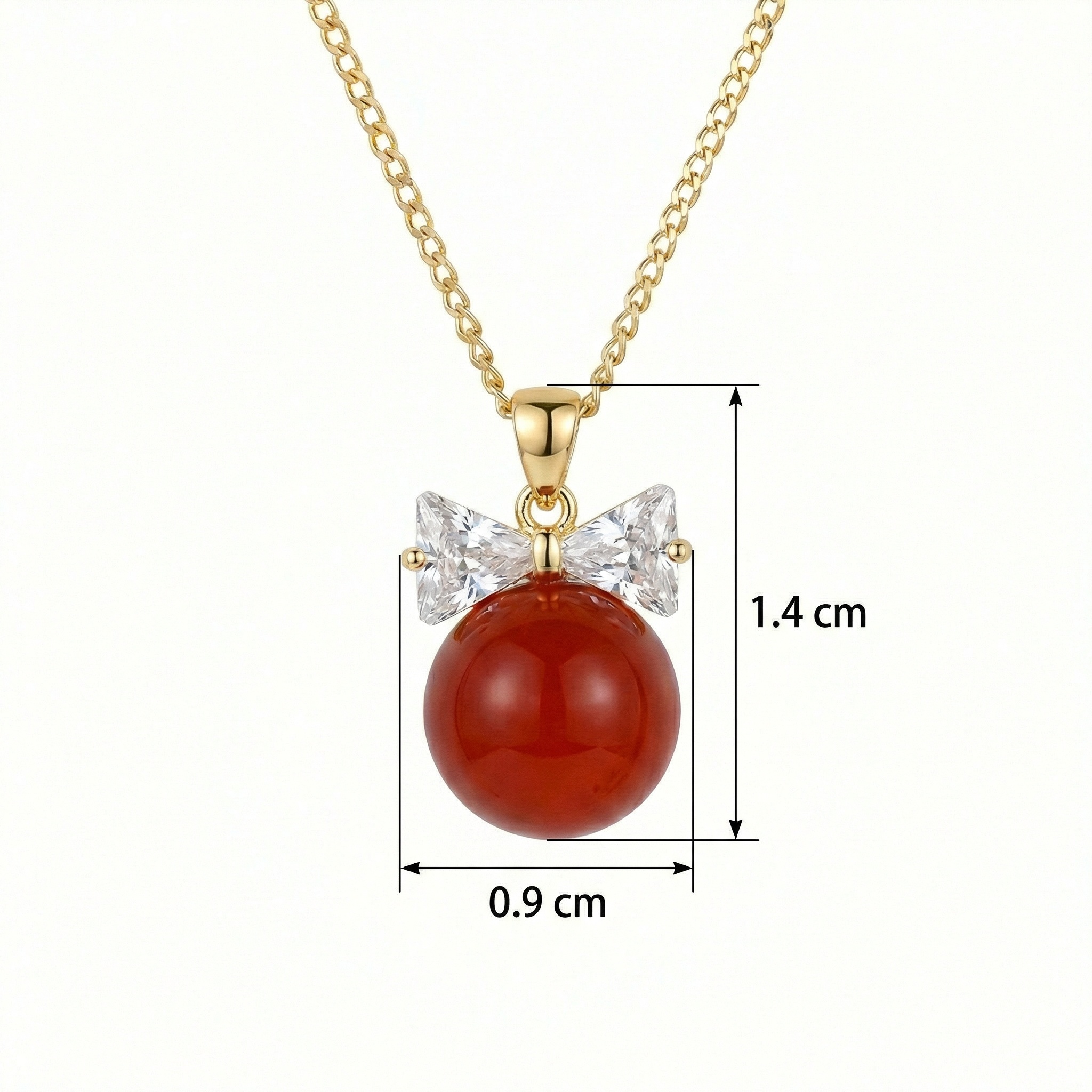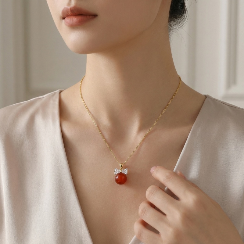 Add a touch of playful elegance to your jewelry collection with this stunning red gemstone pendant necklace. Featuring a large, polished crimson sphere, this piece is beautifully accented by a sparkling bow-tie motif crafted from brilliant clear crystals. The sleek metallic finish of the chain and setting provides a luxurious backdrop for the vibrant red stone, making it a perfect statement piece for both casual and formal occasions. This eye-catching accessory captures the light with every movement, offering a timeless blend of classic charm and contemporary style. Whether you're treating yourself or looking for the perfect gift, this necklace is sure to leave a lasting impression with its bold color and delicate craftsmanship. | Brand: jewelryodm