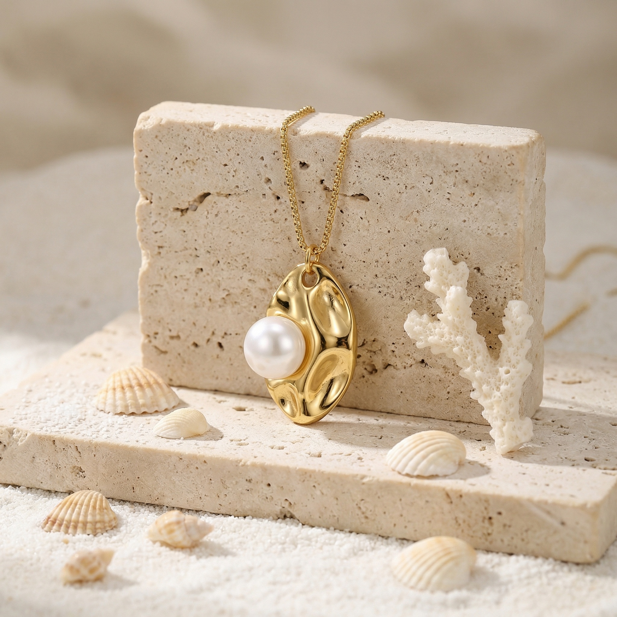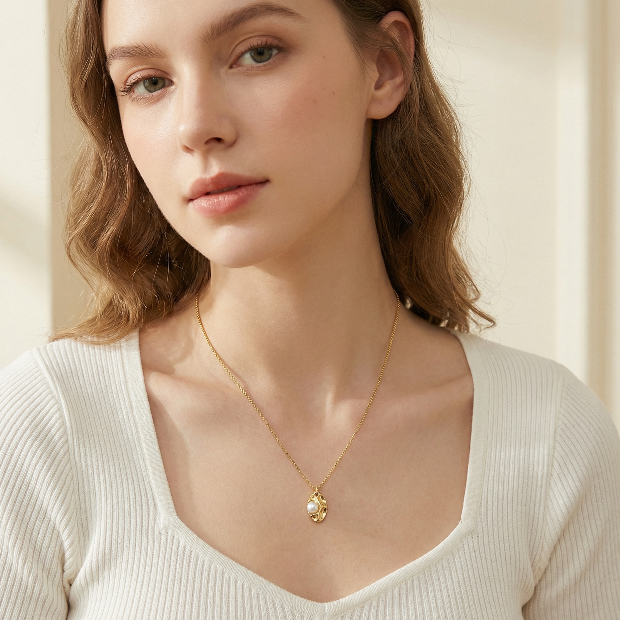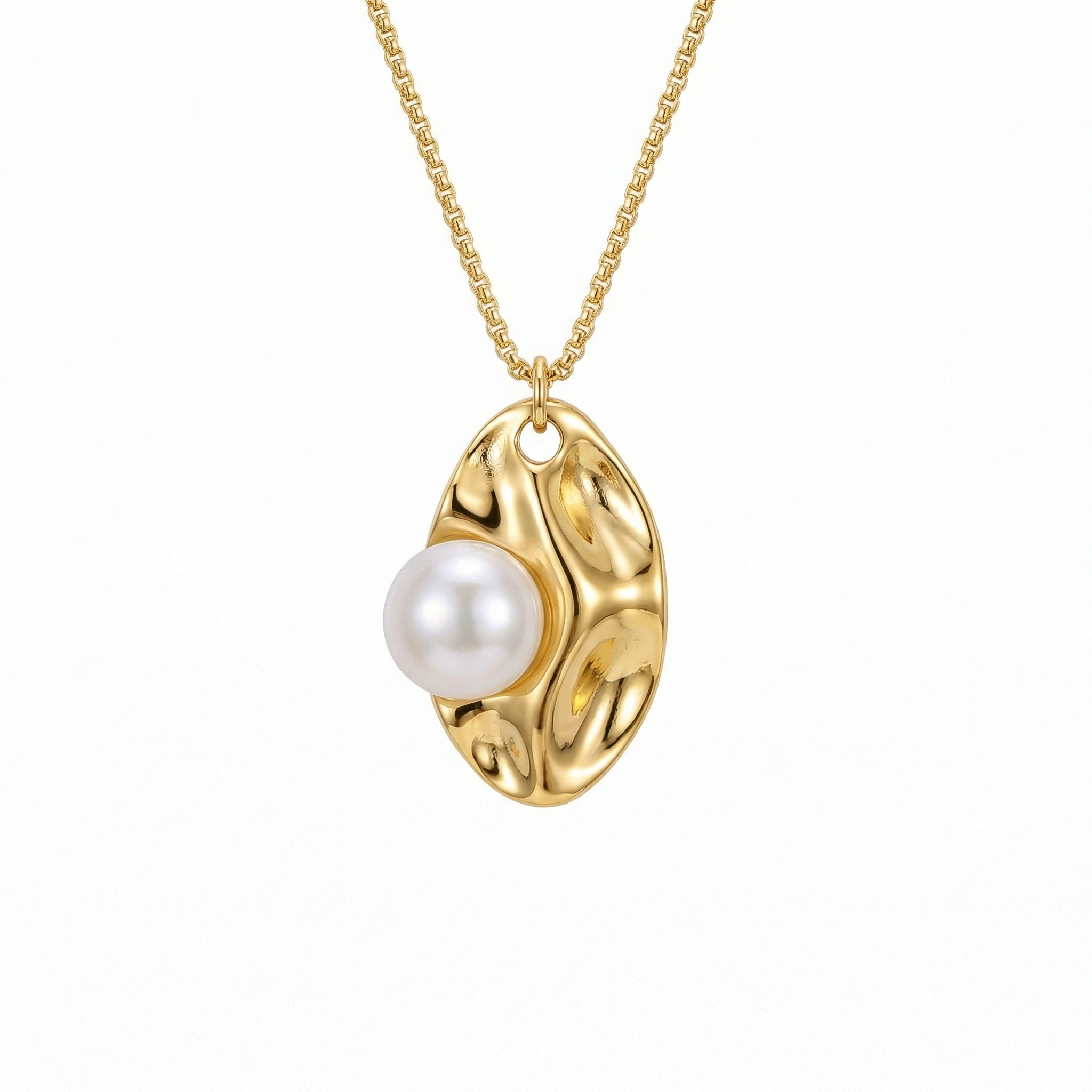 This exquisite necklace features a uniquely sculpted oval pendant with a captivating rippled texture that mimics the fluid motion of molten metal. A single, luminous white pearl is elegantly inset, providing a serene focal point against the vibrant yellow-toned metallic backdrop. The artistic, organic design offers a modern twist on classic pearl jewelry, making it a standout piece for any ensemble. Hung from a sleek and durable box chain, this necklace sits gracefully on the neckline. Crafted with meticulous attention to detail, it combines bold contemporary aesthetics with refined charm. Ideal for gifting or personal indulgence, this piece enhances any look with its sophisticated shimmer and artistic flair. | Brand: jewelryodm