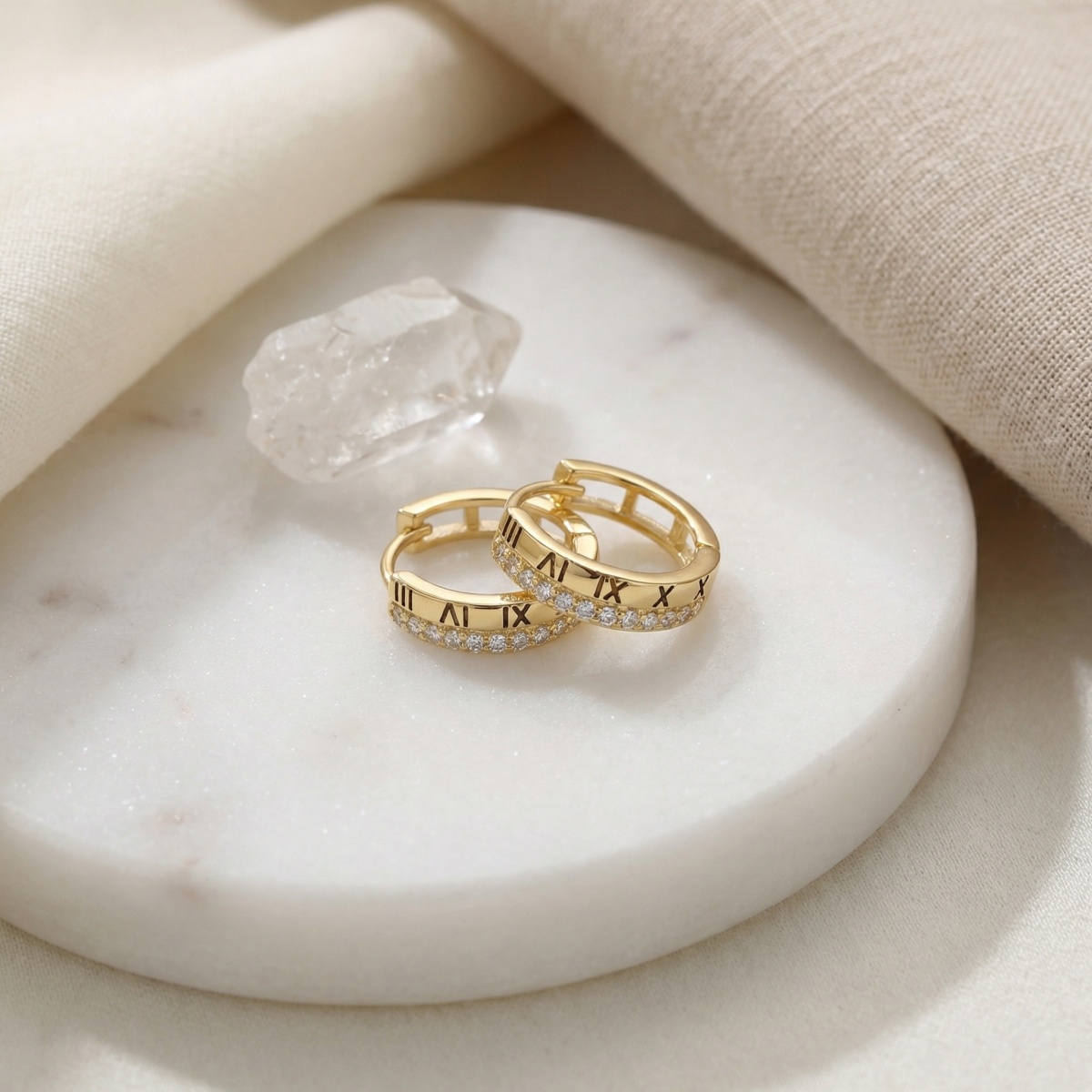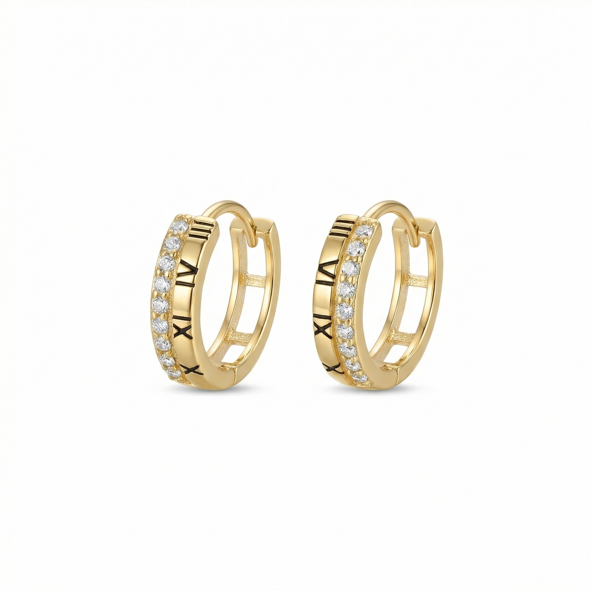 Elevate your jewelry collection with these sophisticated huggie hoop earrings featuring a blend of classic and modern aesthetics. Each earring is meticulously crafted with a warm metallic finish and showcases a unique dual-design band. One side is beautifully engraved with intricate Roman numerals, while the other is adorned with a row of brilliant, pave-set stones that catch the light from every angle. The secure latch-back closure provides both comfort and ease for all-day wear. Perfect for adding a touch of timeless elegance to any outfit, these earrings are a versatile choice for both casual and formal occasions. Their refined craftsmanship makes them a wonderful gift or a personal treat for those who appreciate detailed artistry and subtle sparkle. | Brand: jewelryodm