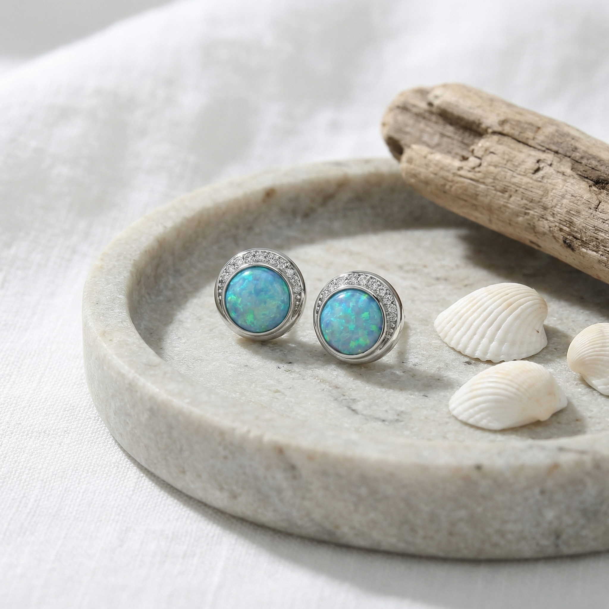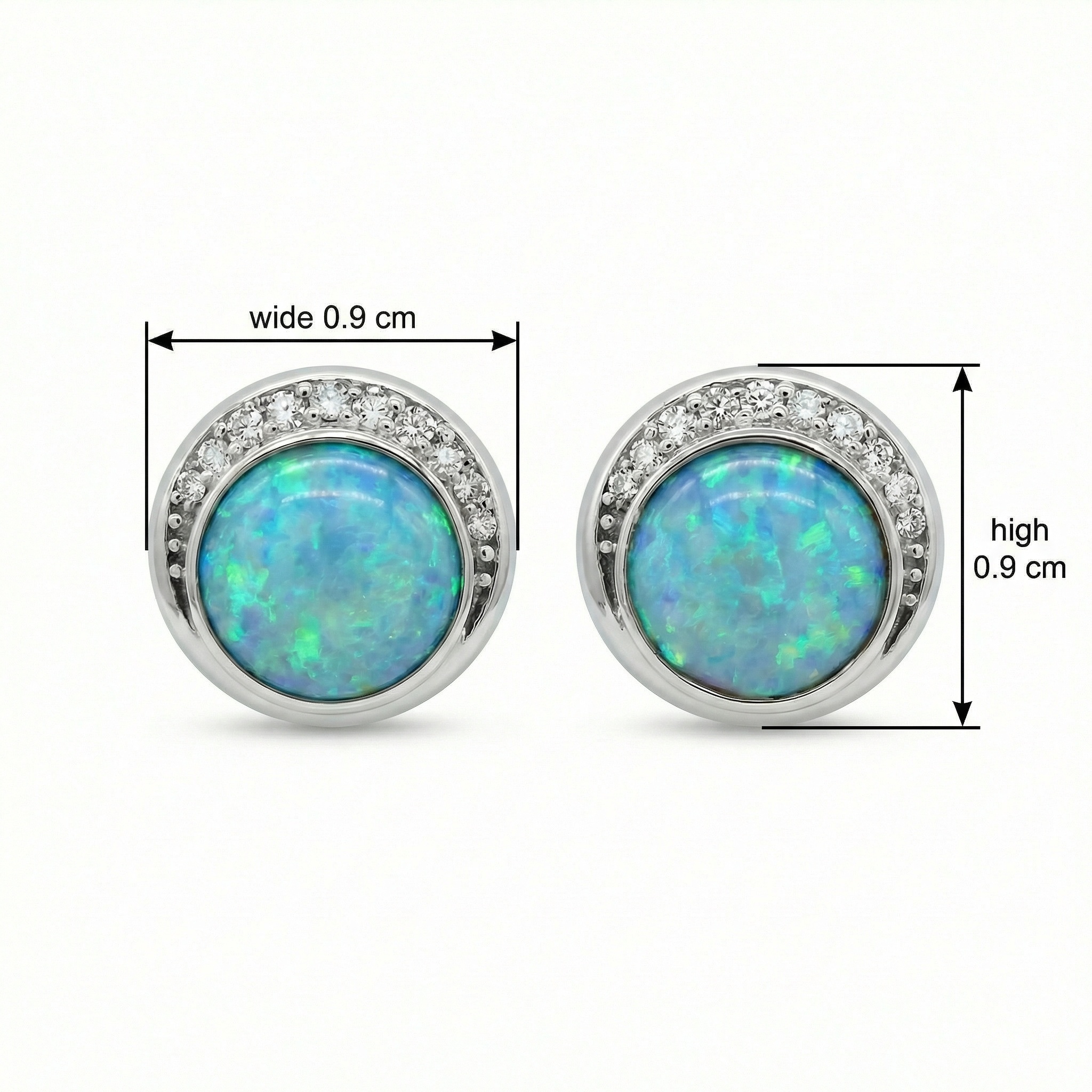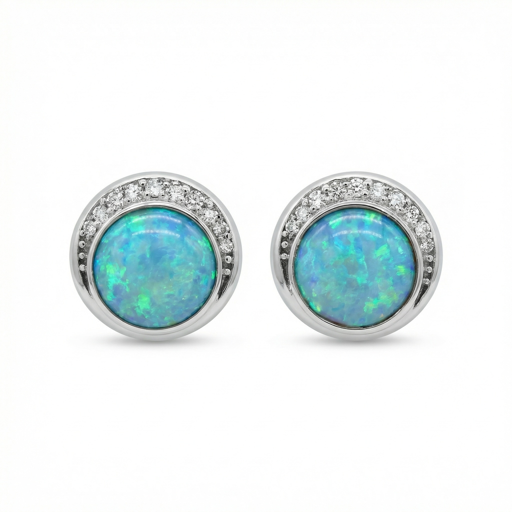 These exquisite stud earrings feature a pair of round blue-green opals, each showcasing a mesmerizing play-of-color with vibrant flashes of turquoise and emerald. The opals are nestled within a polished silver-tone bezel setting, creating a sleek and modern silhouette. Adding a touch of sophisticated brilliance, a delicate crescent-shaped halo of shimmering round-cut stones arcs gracefully along the upper edge of each earring. The combination of the ethereal, iridescent opal and the classic sparkle of the halo creates a timeless look that captures the light from every angle. Perfectly sized for both everyday elegance and special occasions, these earrings offer a unique blend of contemporary design and radiant beauty. They serve as a stunning accessory for any jewelry collection or a thoughtful gift for someone special. | Brand: jewelryodm