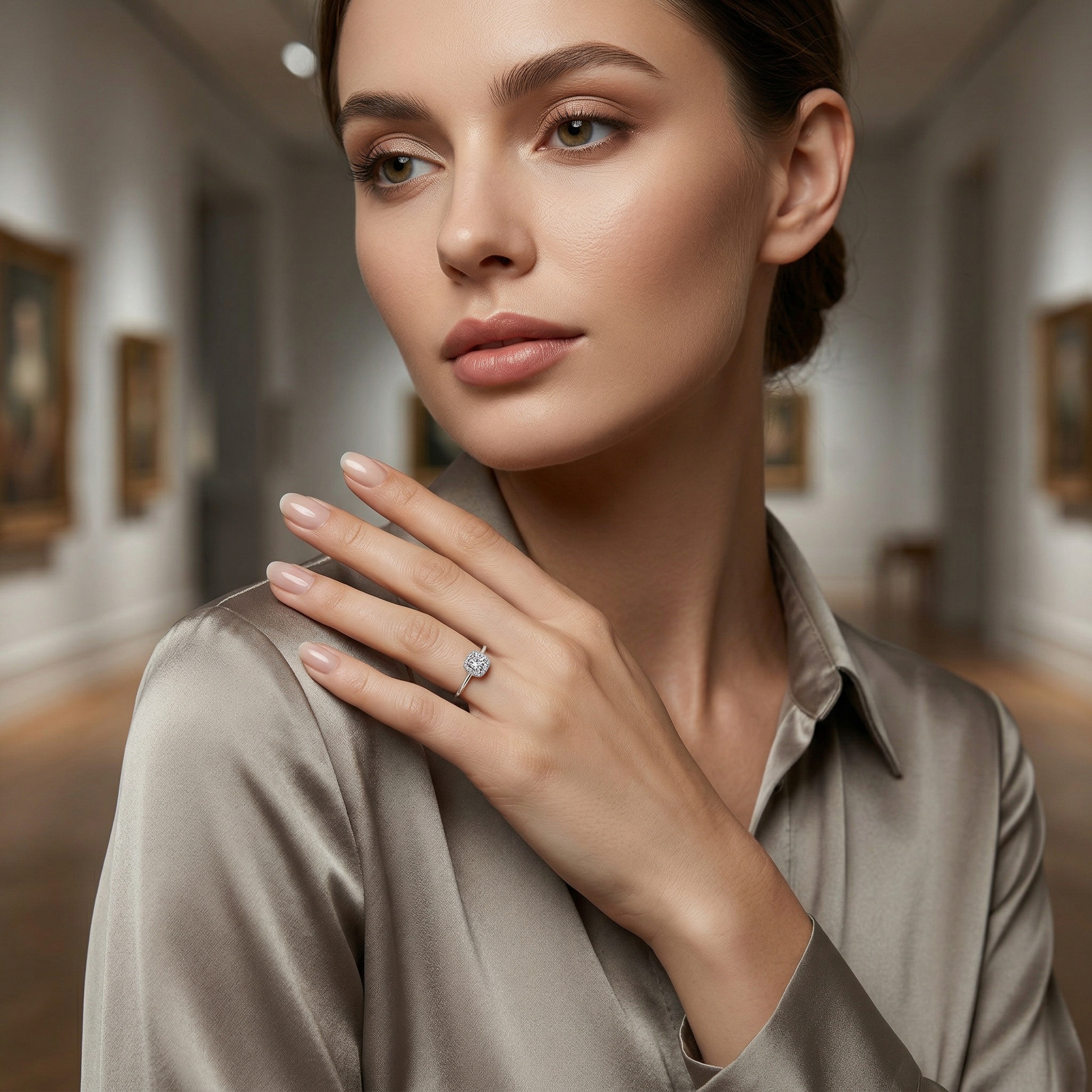 This exquisite engagement ring features a stunning round brilliant-cut center stone, radiating exceptional sparkle and fire. The center gem is elegantly framed by a shimmering cushion-shaped halo of delicate pavé-set accents, enhancing its brilliance and creating a larger-than-life presence. Crafted with a sleek, high-polish band in a lustrous white metal finish, the design balances vintage-inspired glamour with modern sophistication. The smooth, tapered shoulders lead the eye directly to the magnificent center setting, ensuring a timeless aesthetic that complements any style. Perfect for proposals, anniversaries, or special celebrations, this ring symbolizes eternal love and refined beauty. Its comfortable fit and durable construction make it an ideal choice for everyday wear while maintaining its luxurious appeal. Whether chosen as a promise of forever or a sophisticated accessory, this piece is sure to be cherished for generations to come. | Brand: jewelryodm