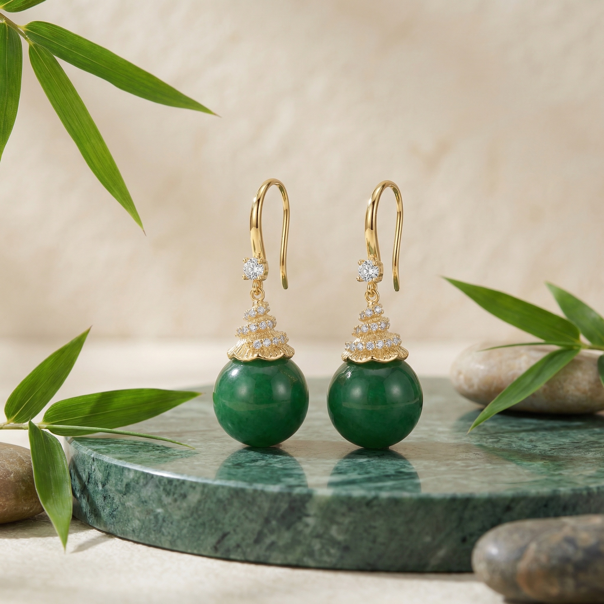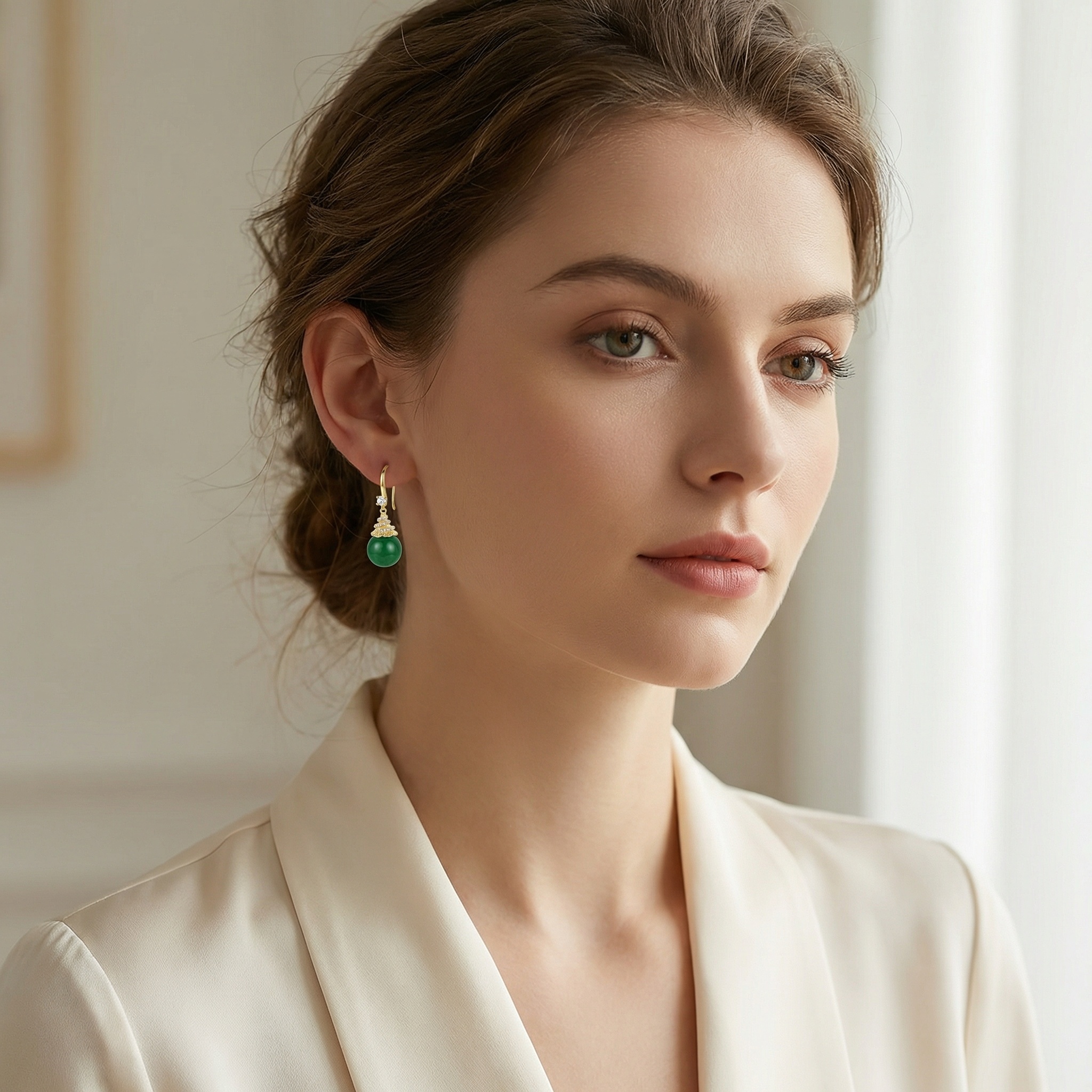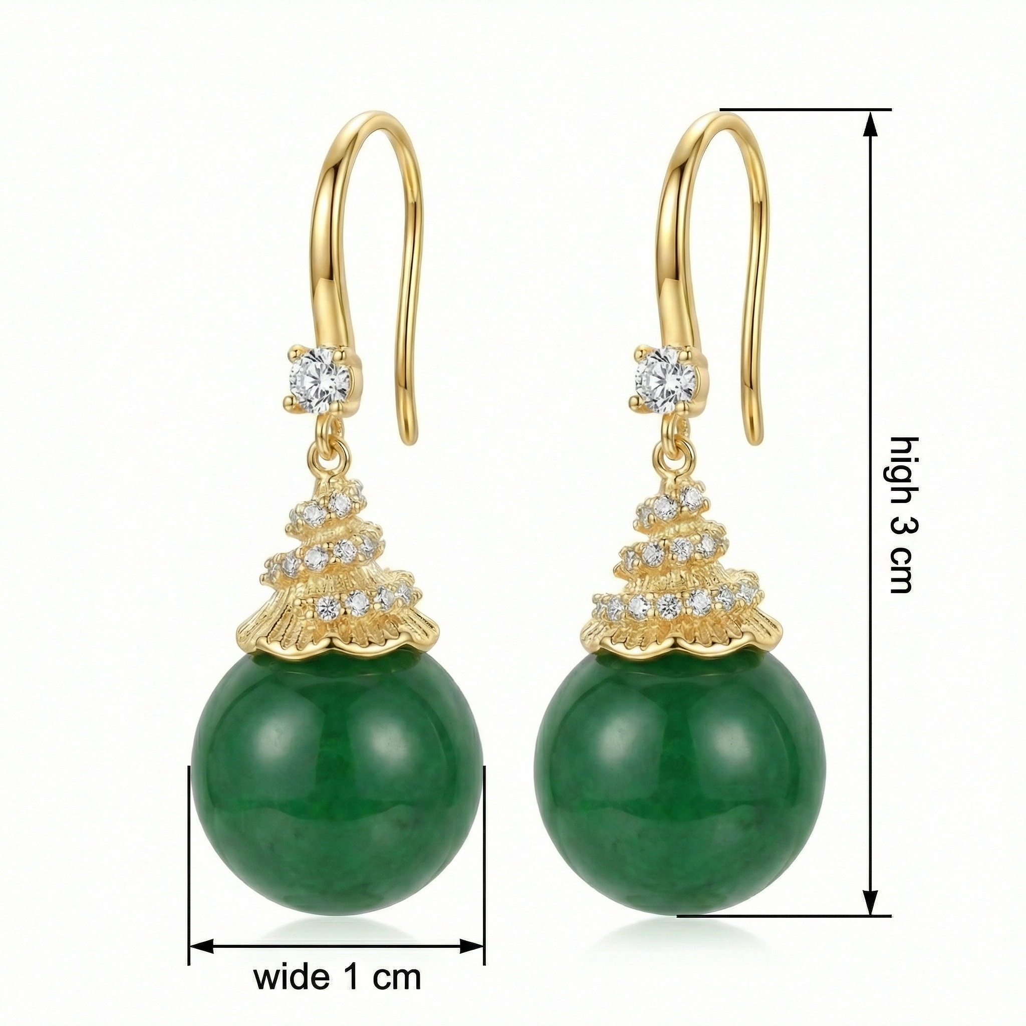 These stunning drop earrings showcase vibrant, polished green gemstone spheres that exude timeless elegance. Each round stone is crowned with an intricately detailed yellow-toned metal cap, featuring a layered, scalloped design adorned with rows of shimmering clear crystals. A brilliant, larger round-cut stone sits above the decorative cap, adding a focal point of light before transitioning into the graceful hook-style wires. The rich green hue of the stones creates a beautiful contrast against the lustrous metallic finish and sparkling accents, offering a sophisticated look suitable for any occasion. Designed with meticulous craftsmanship, these earrings blend classic style with modern glamour. They serve as an exquisite accessory for formal gatherings or a luxurious gift for a loved one. The lightweight hook design ensures comfort, making them a versatile and eye-catching addition to any jewelry collection. | Brand: jewelryodm
