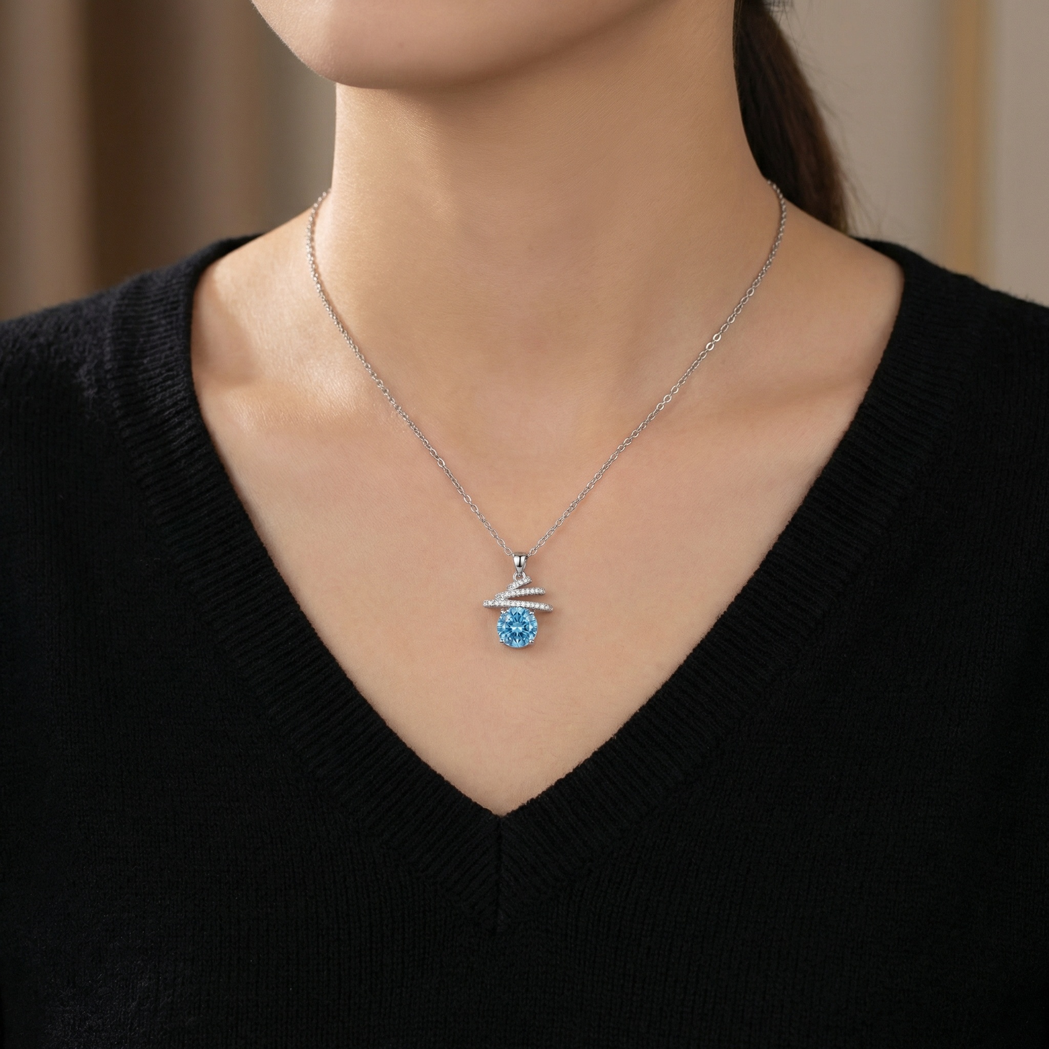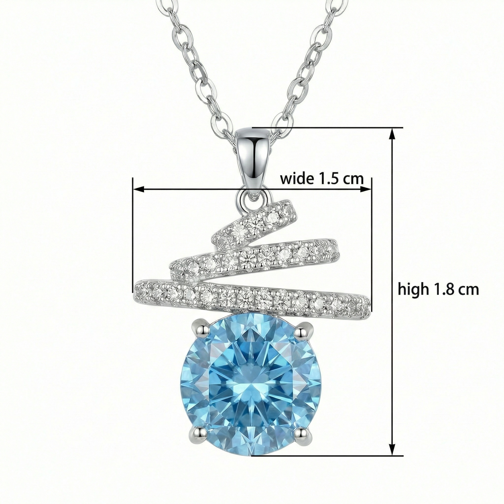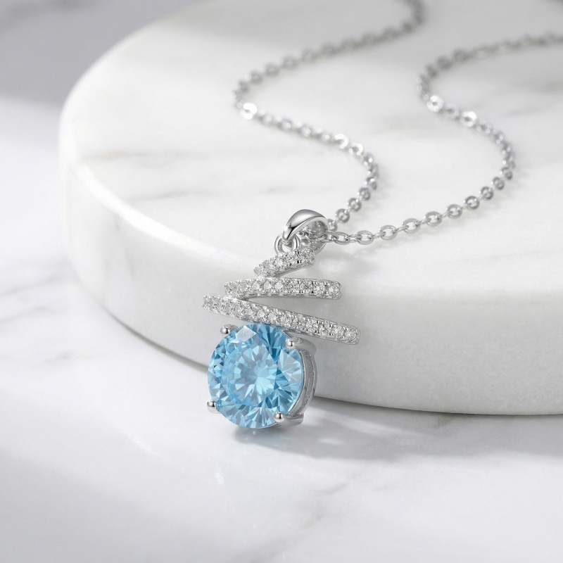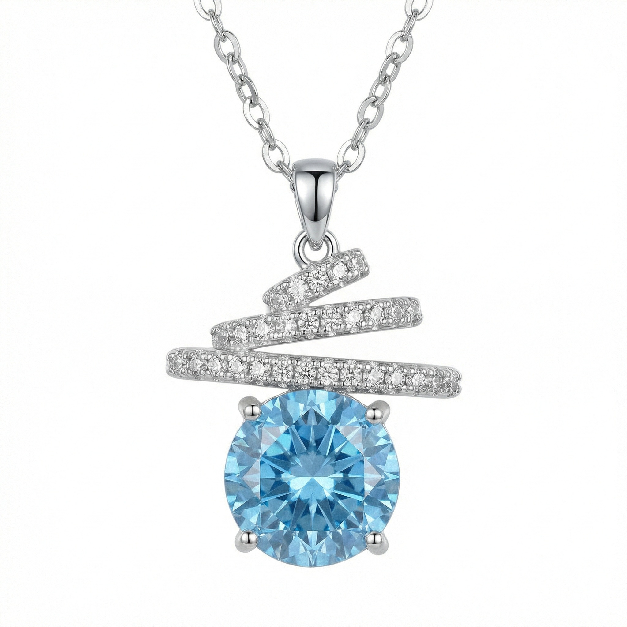 This exquisite necklace features a vibrant, round-cut light blue gemstone that captures the light from every angle. The central stone is held securely by a classic four-prong setting, hanging elegantly beneath a unique decorative element. Above the main stone, a graceful, spiral-shaped ribbon motif is encrusted with brilliant white accent stones, adding a touch of contemporary flair and extra shimmer. Crafted in polished sterling silver, the pendant hangs from a delicate link chain, making it a perfect accessory for both special occasions and everyday elegance. This piece combines a timeless aesthetic with a modern twist, making it a thoughtful gift for someone special or a beautiful addition to any jewelry collection. Its sophisticated design ensures it stands out as a symbol of grace and style. | Brand: jewelryodm