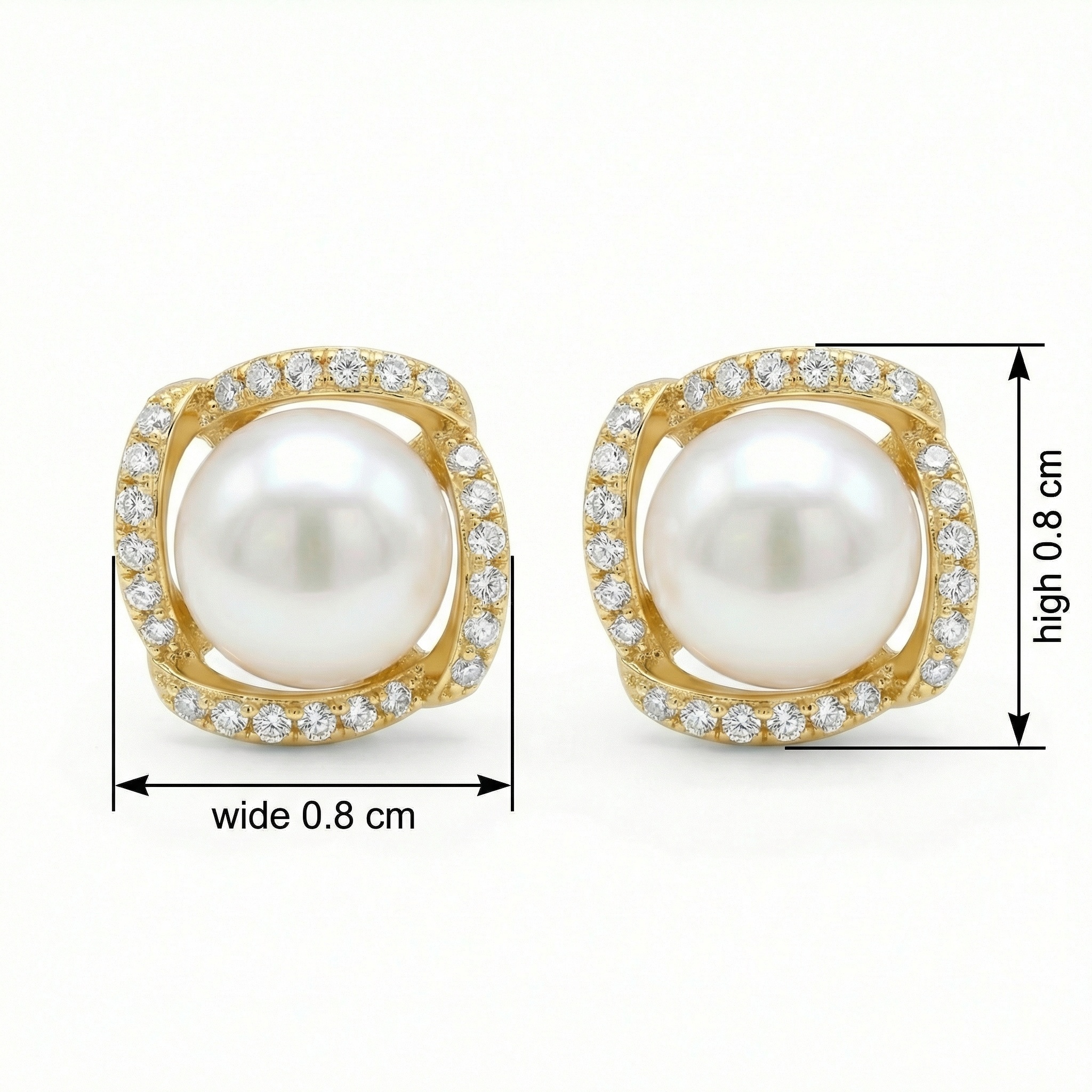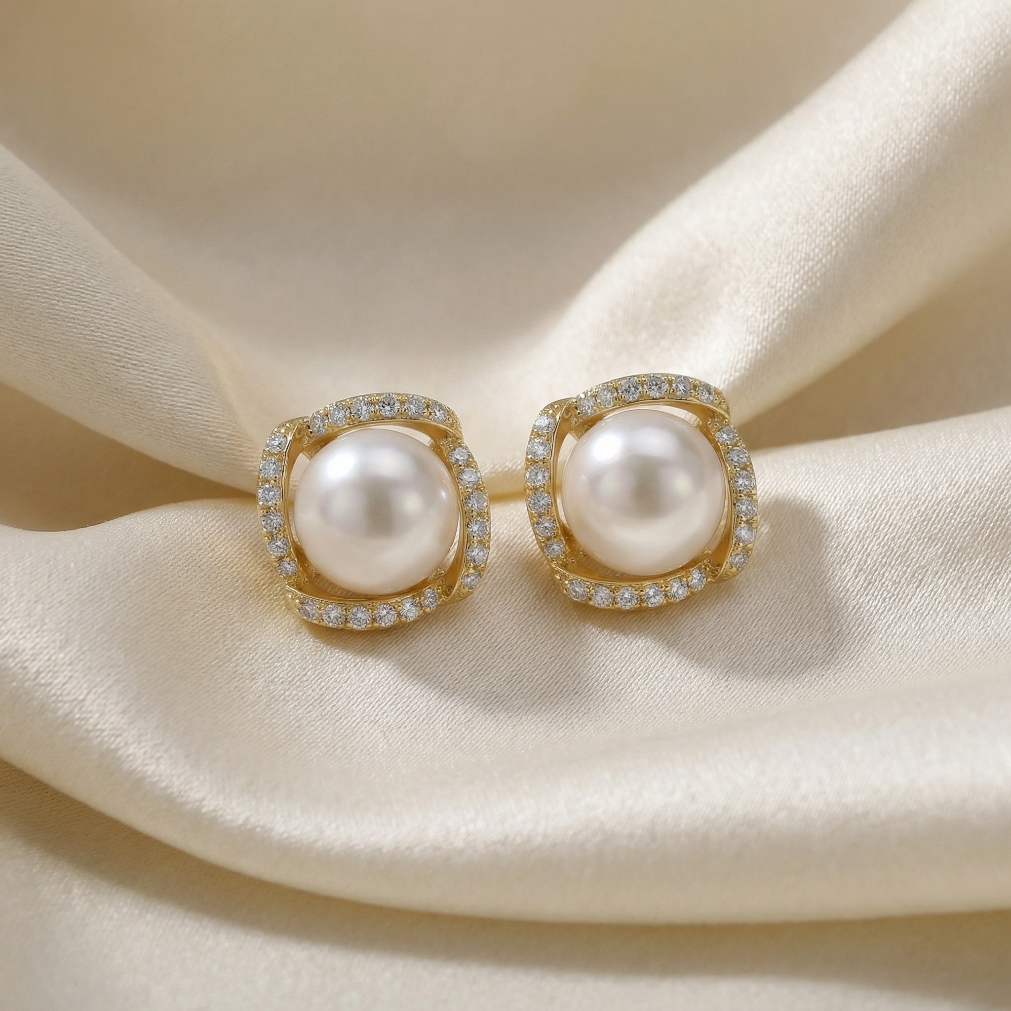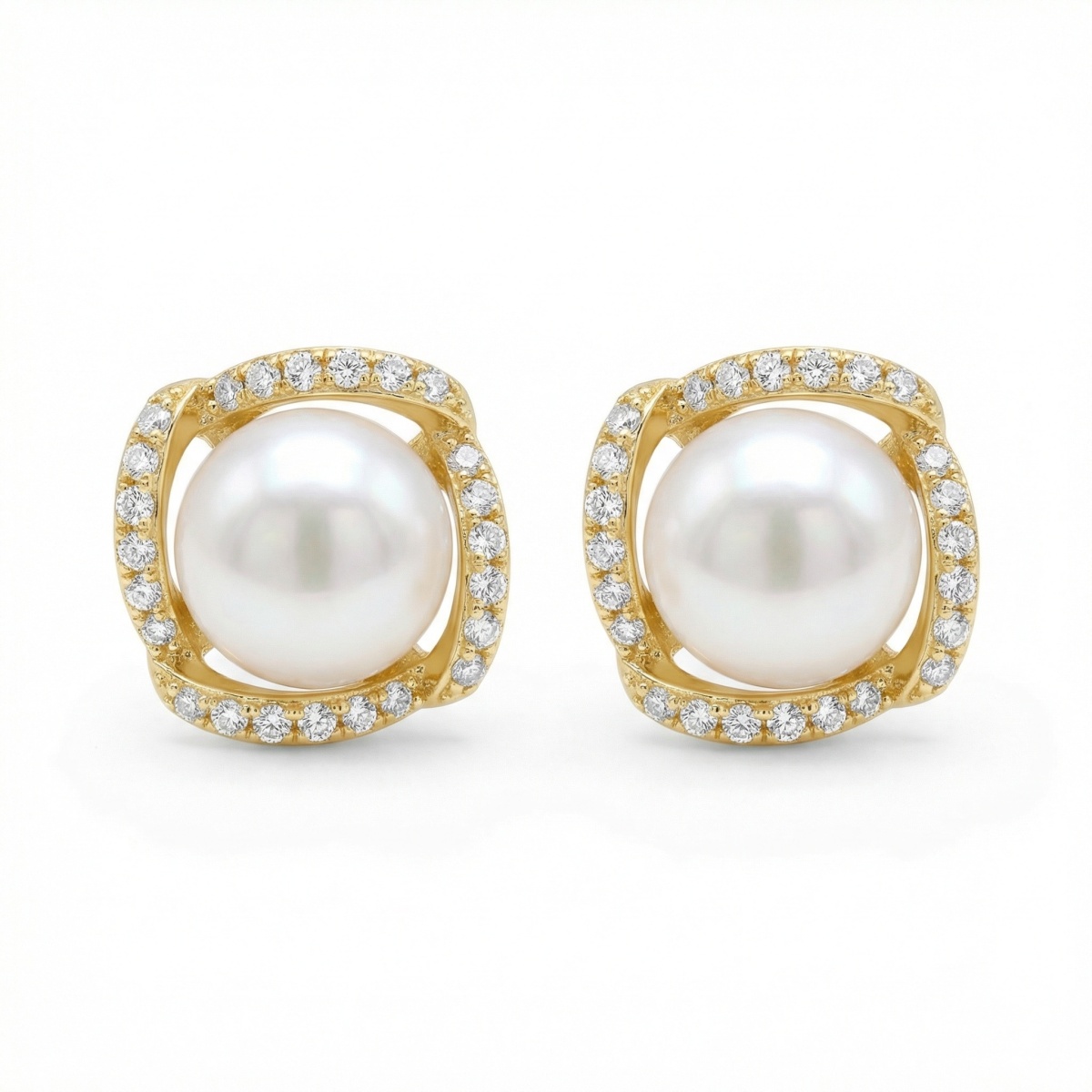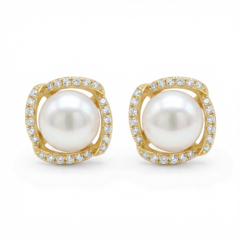 These sophisticated stud earrings feature a pair of highly lustrous white pearls at their center. Each pearl is encased in a uniquely shaped square frame crafted from a warm yellow-toned metal. The frame is beautifully accented with shimmering round-cut diamonds, meticulously pave-set to catch the light from every angle. The swirling design of the metal frame adds a modern touch to the classic pearl silhouette, making these earrings perfect for both formal occasions and everyday elegance. The combination of the smooth, creamy pearl surface and the brilliant sparkle of the diamond accents creates a stunning contrast. Designed with a secure post-back closure, these earrings offer a comfortable and stylish fit. They represent a timeless blend of classic beauty and contemporary craftsmanship, making them an essential addition to any fine jewelry collection. | Brand: jewelryodm