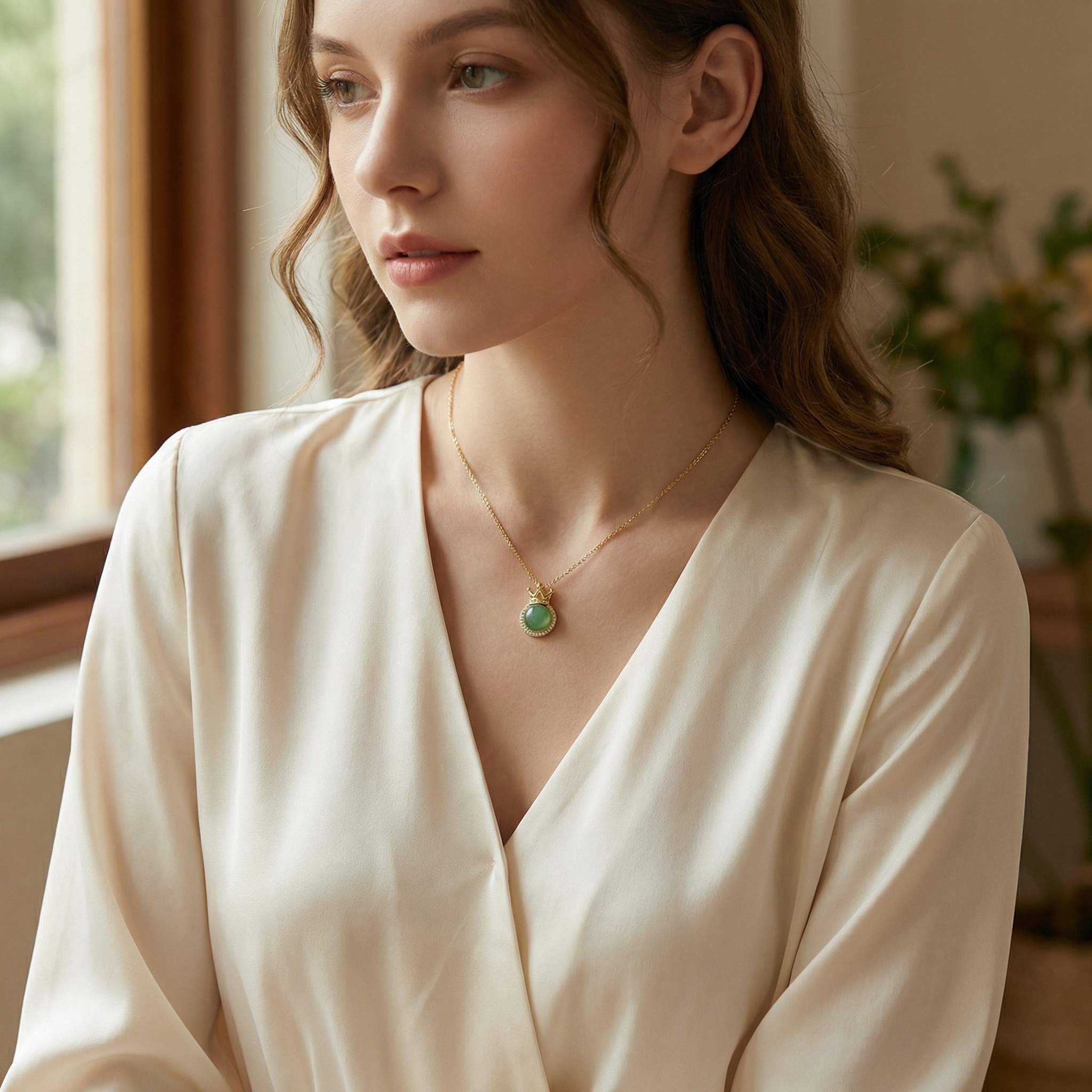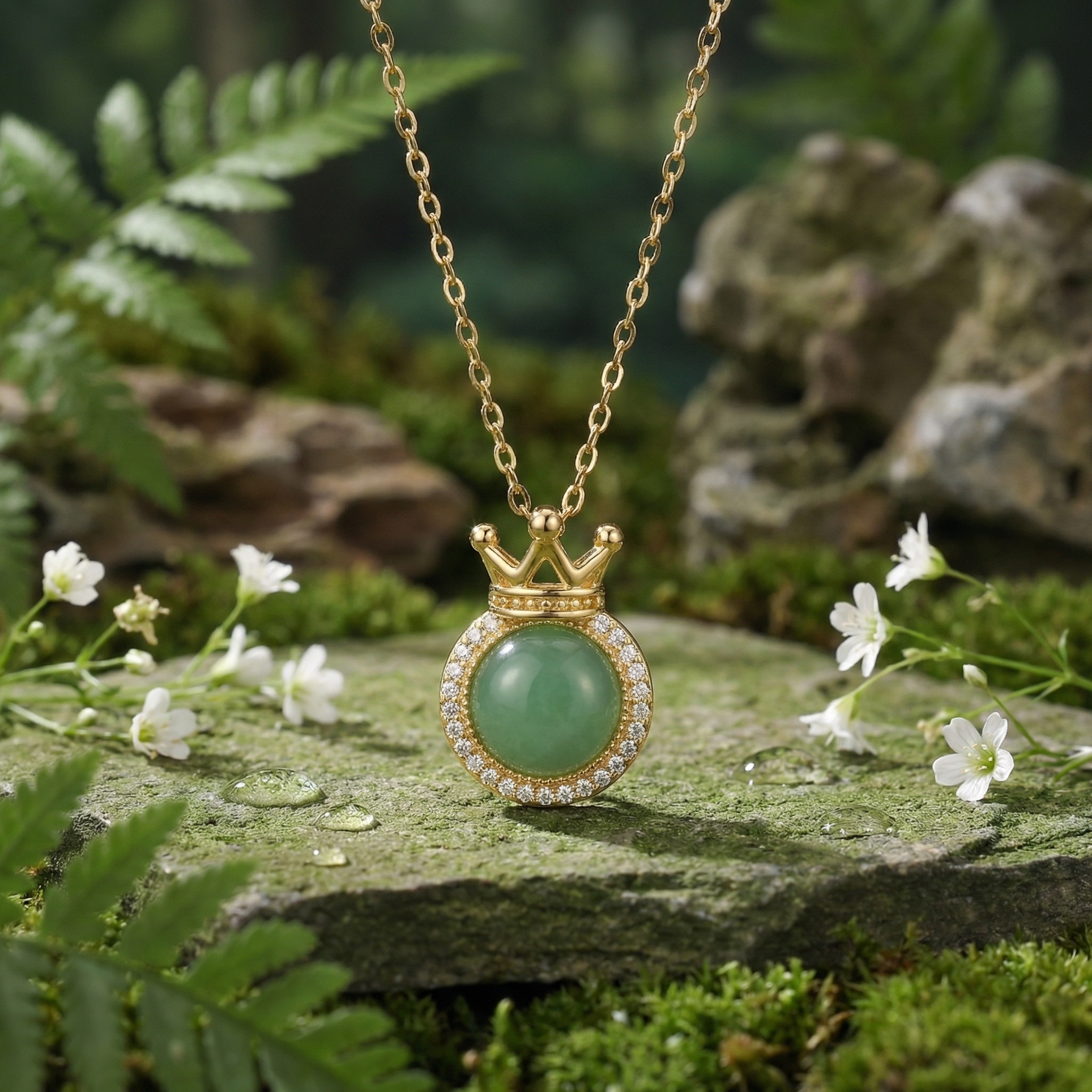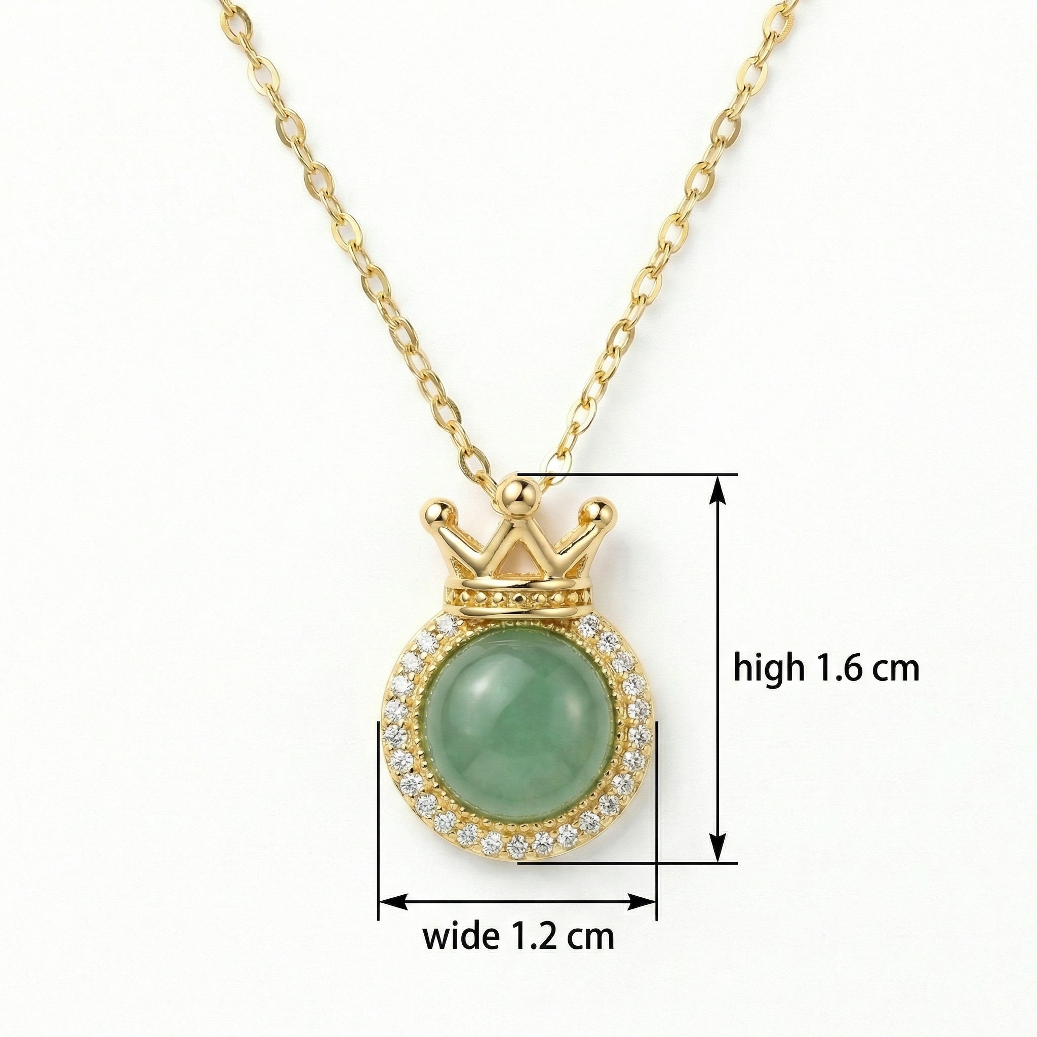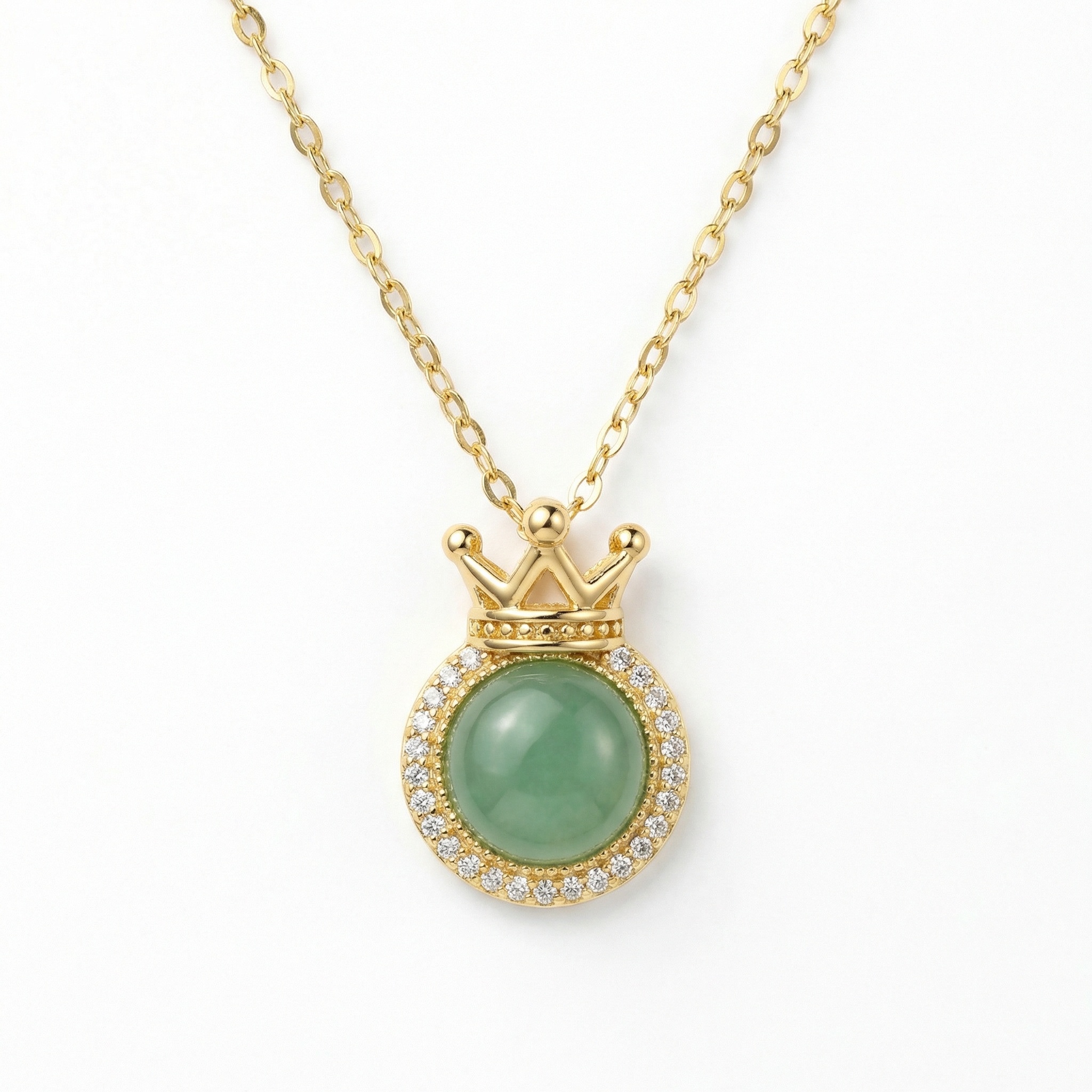 This exquisite necklace showcases a round, smooth green gemstone at its center, elegantly framed by a halo of brilliant clear crystals. Above the gem sits a beautifully crafted crown motif, adding a touch of royalty and sophistication to the piece. The pendant hangs gracefully from a fine, polished chain that complements its warm metallic finish. Perfect for both everyday wear and special occasions, this piece blends classic charm with modern craftsmanship. Whether as a gift for a loved one or a treat for yourself, this crown-themed accessory brings a regal flair to any outfit. Its timeless design ensures it remains a cherished part of any jewelry collection. | Brand: jewelryodm