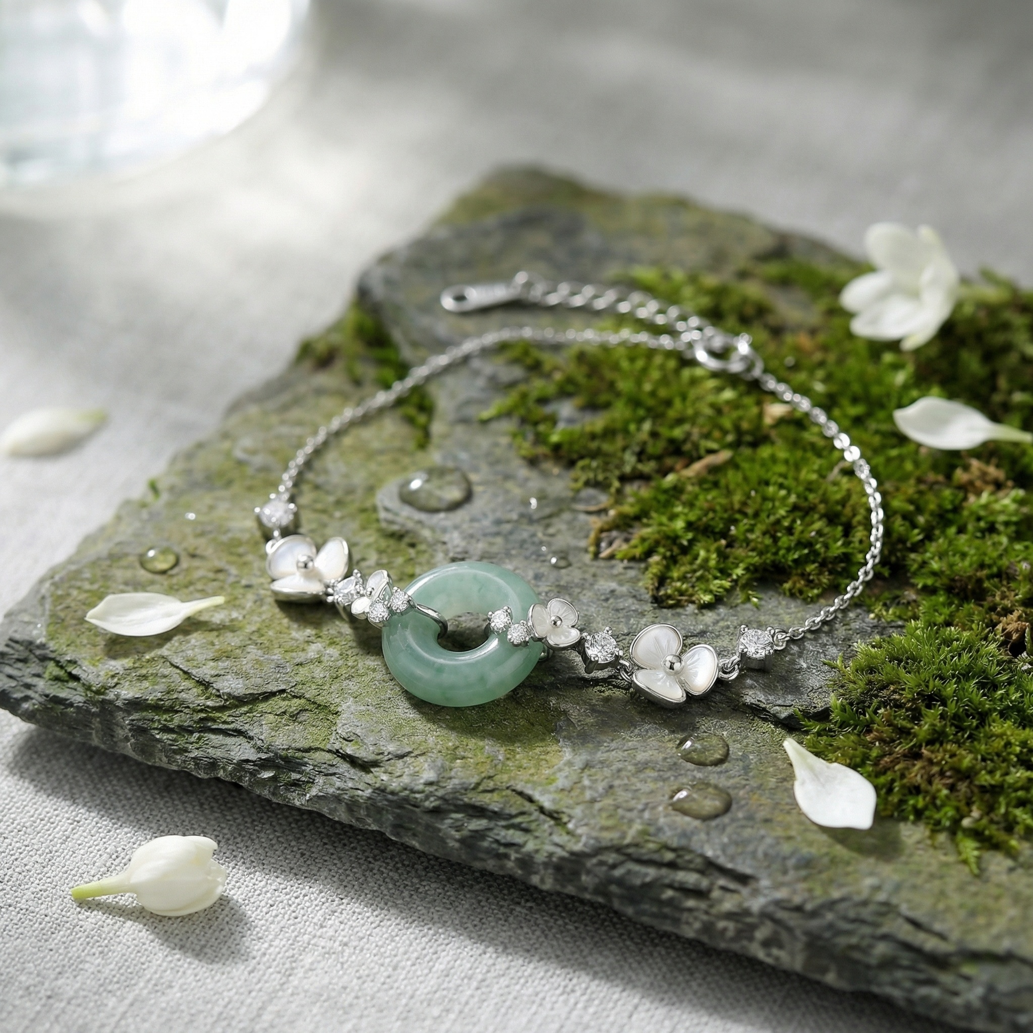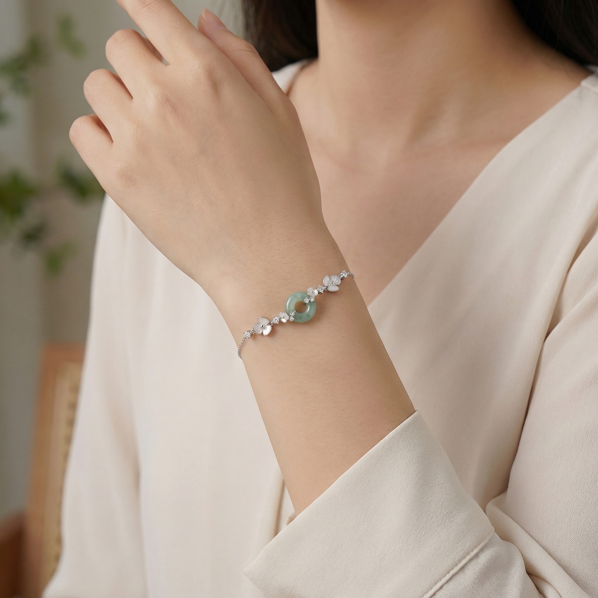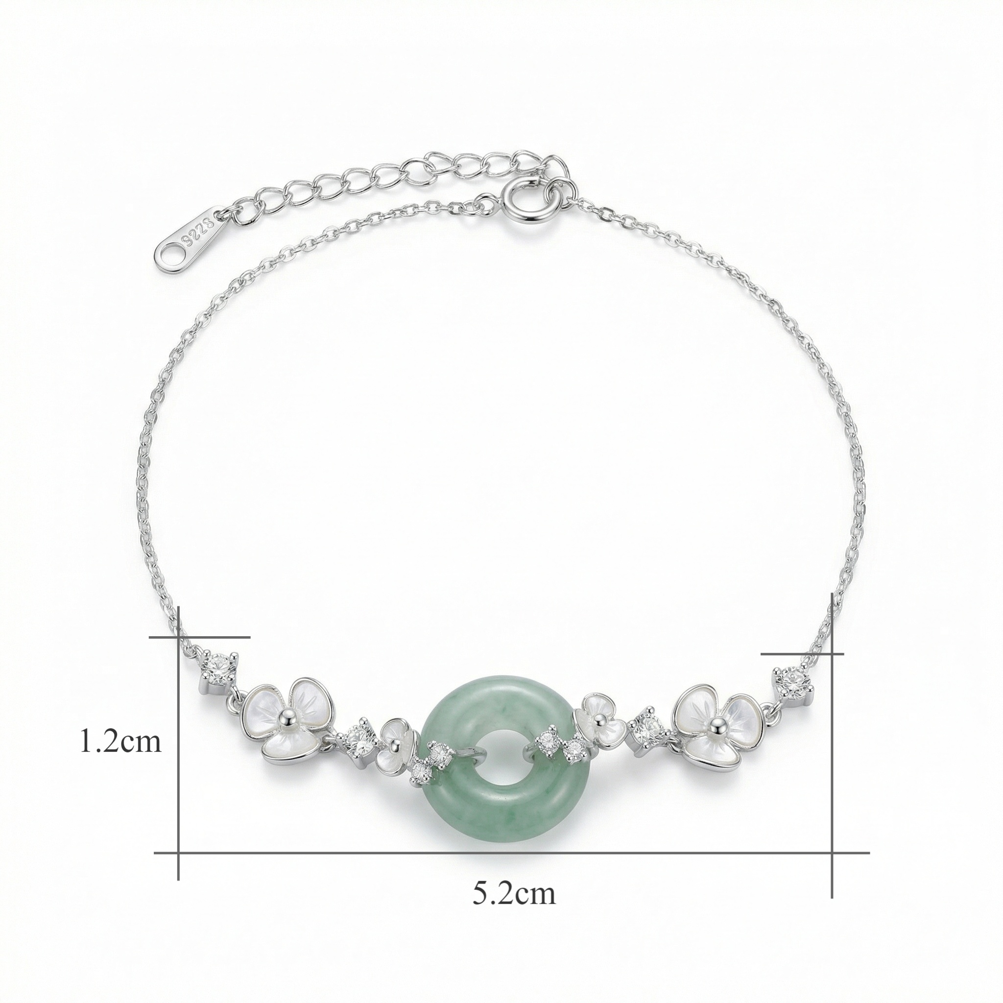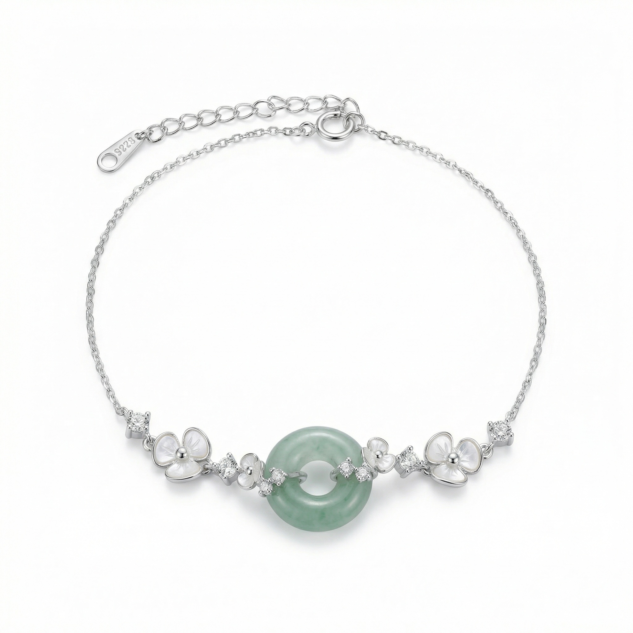 This exquisite bracelet is crafted from high-quality S925 sterling silver, offering a timeless and polished finish. The centerpiece features a smooth, translucent green jade ring, symbolizing peace and balance. Accompanying the jade are delicate white floral charms, likely crafted from lustrous mother-of-pearl, adding a touch of feminine grace. Sparkling brilliant-cut cubic zirconia stones are interspersed throughout the design, providing a subtle yet captivating shimmer. The bracelet is finished with a fine link chain and an adjustable extension featuring a secure spring ring clasp, ensuring a perfect fit for any wrist. Combining traditional jade elements with contemporary floral motifs, this piece is a versatile accessory suitable for both elegant events and everyday wear. Its delicate craftsmanship makes it an ideal gift for those who appreciate meaningful and sophisticated jewelry. | Brand: jewelryodm