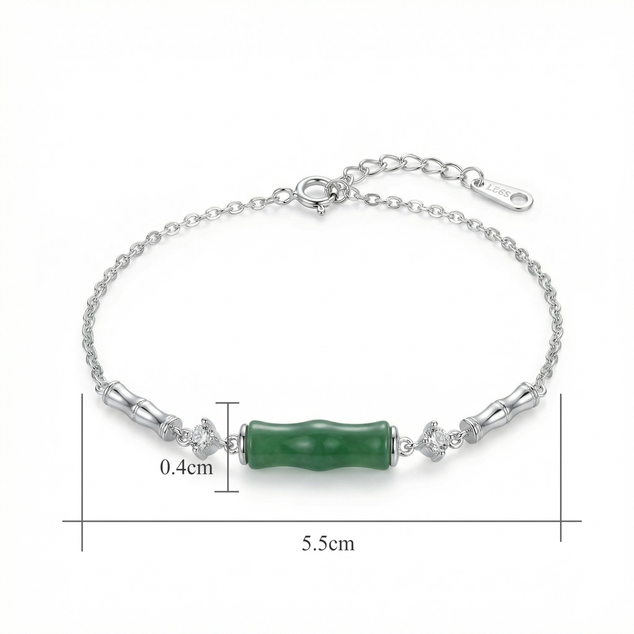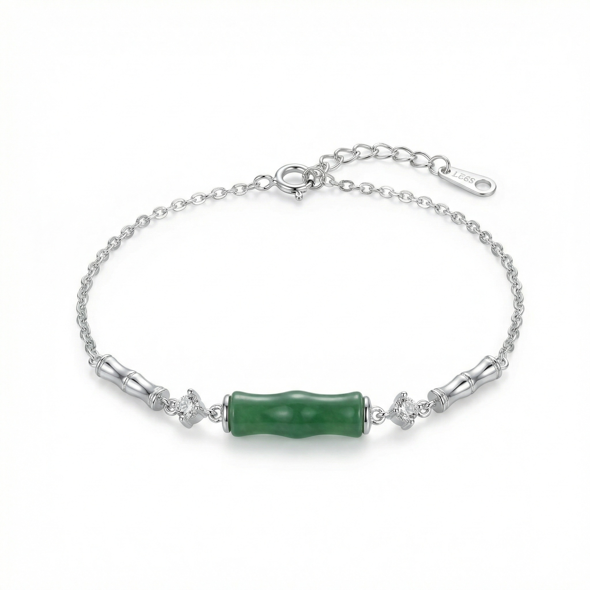 This exquisite bracelet features a central green stone carved into a bamboo section, symbolizing strength and resilience. Crafted from high-quality S925 sterling silver, it is beautifully accented by shimmering cubic zirconia and detailed silver bamboo segments. The delicate cable chain includes a lobster clasp and an extender for an adjustable fit. Its blend of traditional motifs and modern craftsmanship makes it a sophisticated accessory for any occasion. | Brand: jewelryodm
