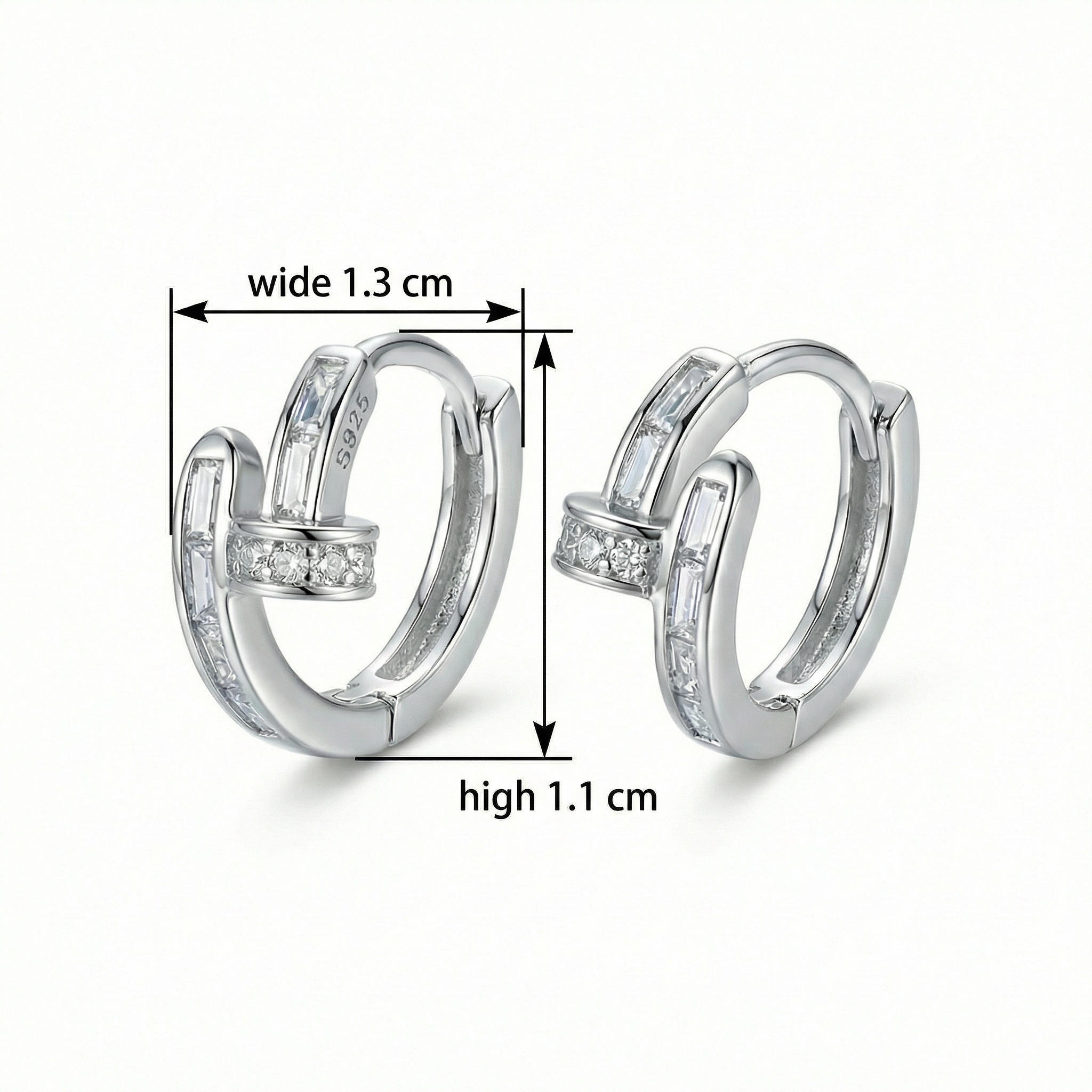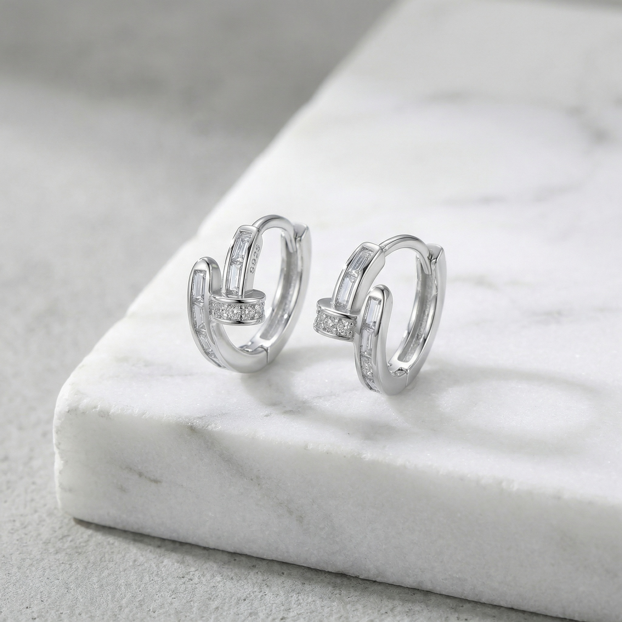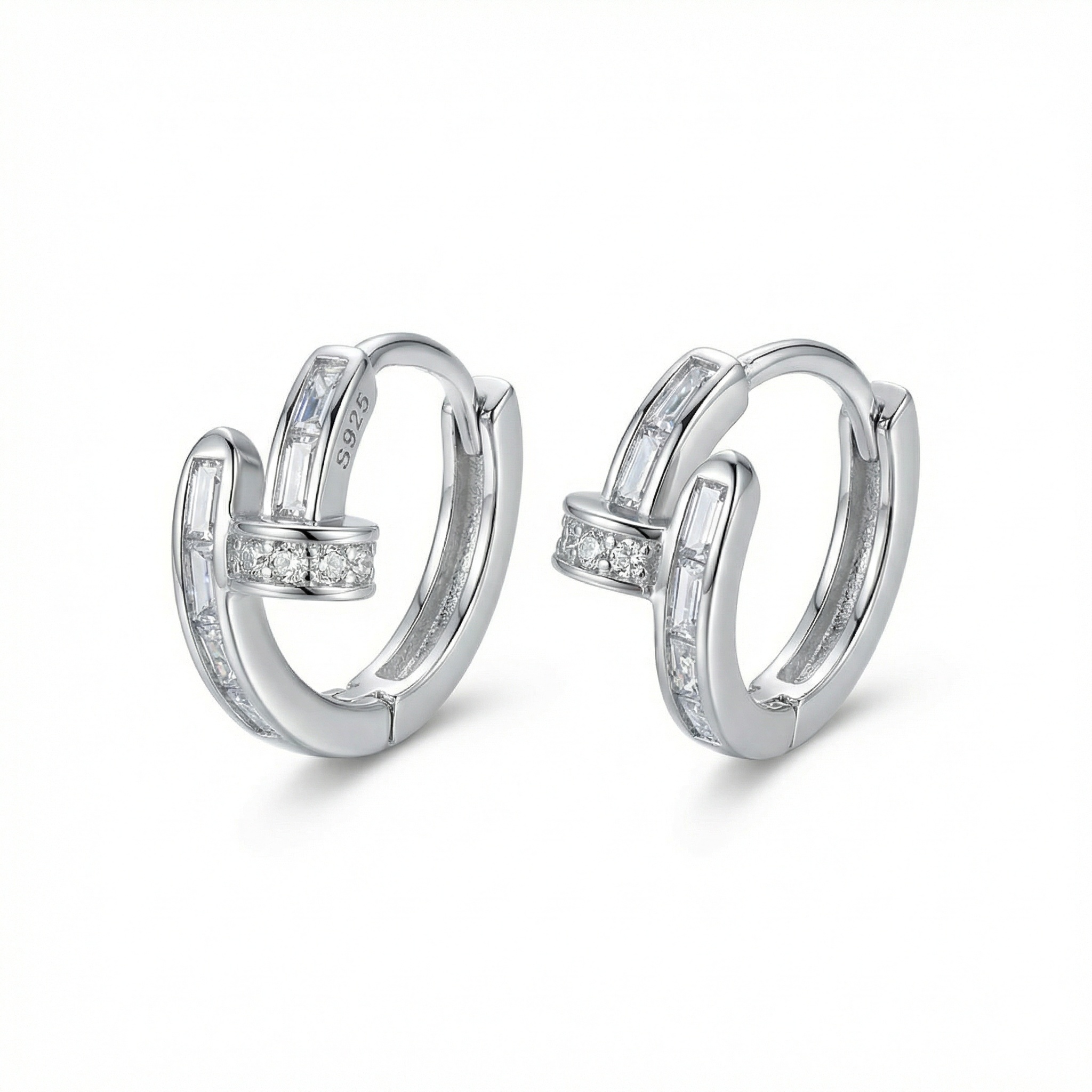 Crafted from premium S925 sterling silver, these huggie hoop earrings feature a chic nail-inspired design that perfectly balances modern edge with classic elegance. The earrings are meticulously set with shimmering baguette and round-cut cubic zirconia stones, creating a brilliant, high-shine finish. Their unique wrap-around nail silhouette offers a contemporary twist on traditional hoops, making them a standout accessory for any fashion-forward individual. Designed with a secure hinged clasp, they provide a comfortable fit for daily wear or special occasions. These versatile earrings are perfect for layering or wearing alone as a bold statement piece. A stunning addition to any jewelry box, they make an excellent gift for birthdays, anniversaries, or just to show someone you care. | Brand: jewelryodm