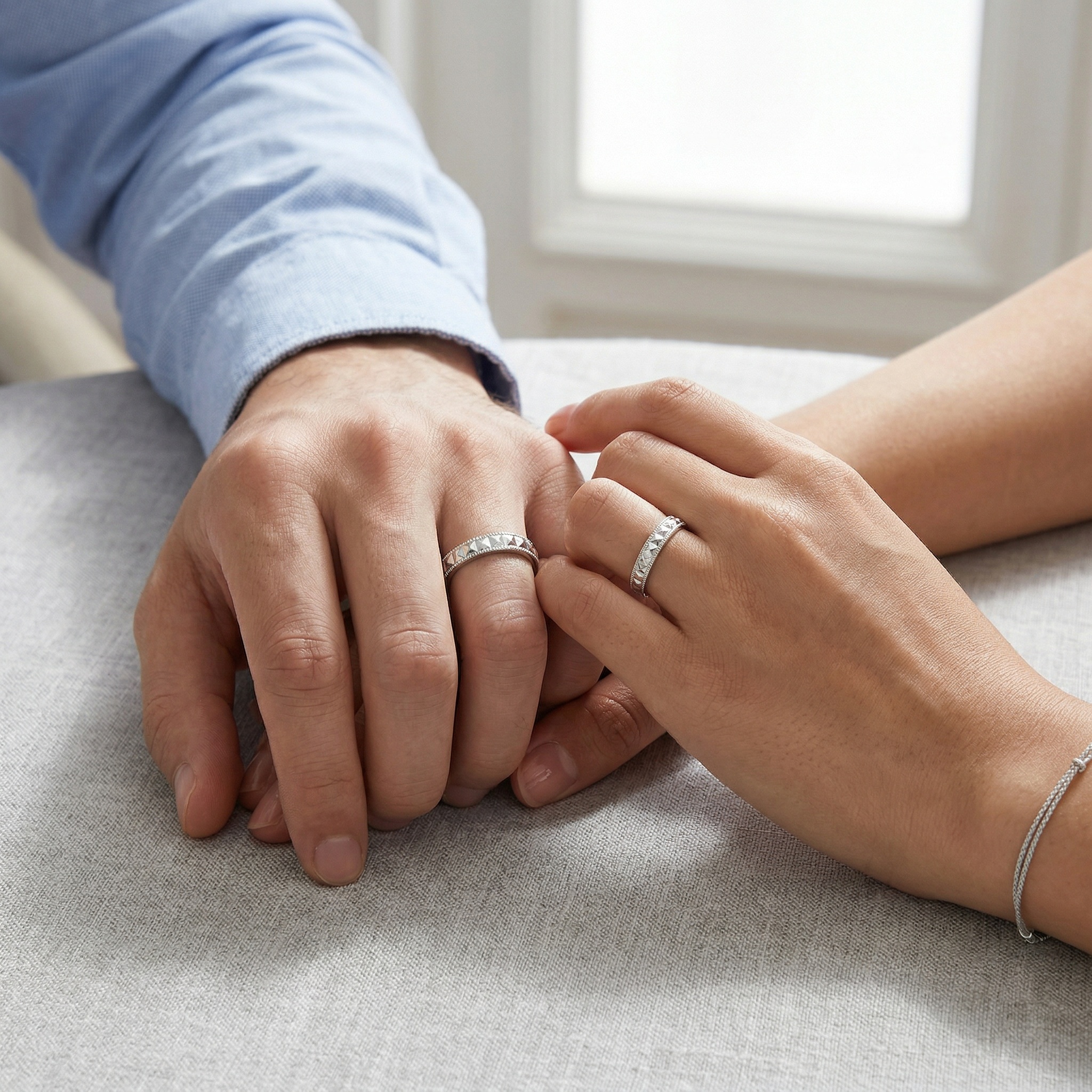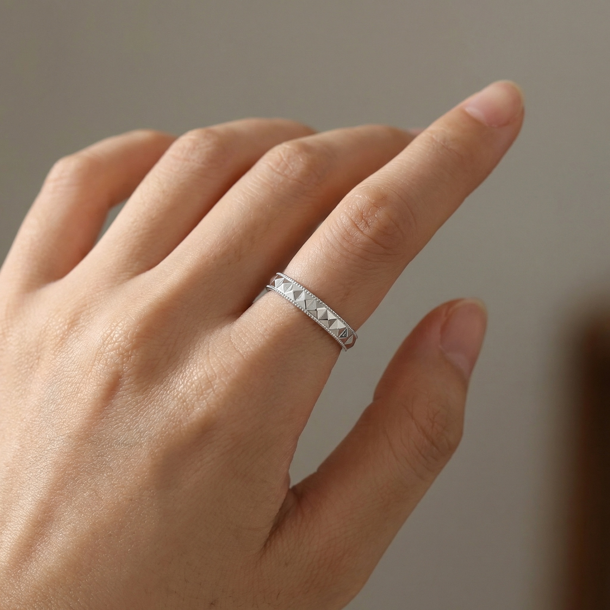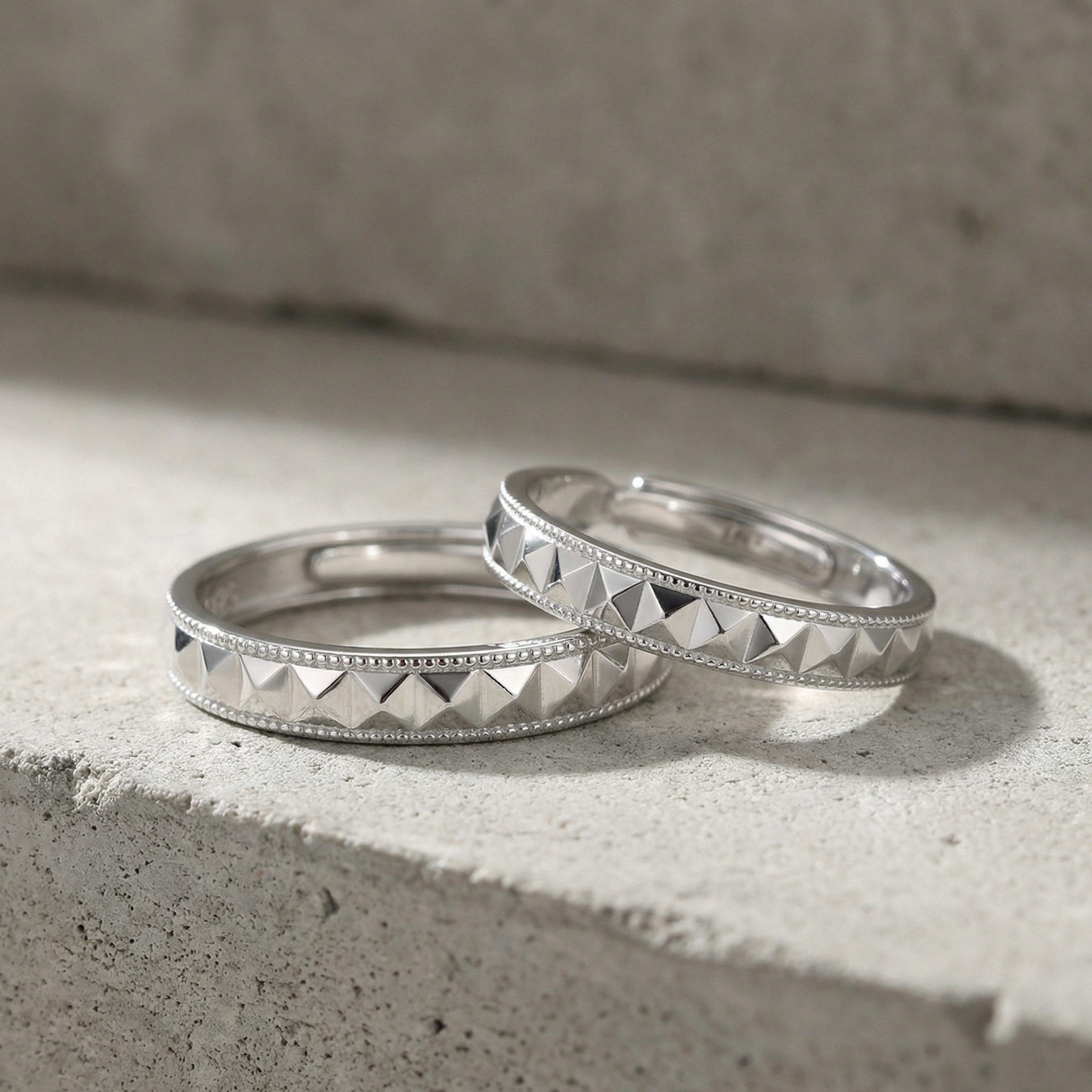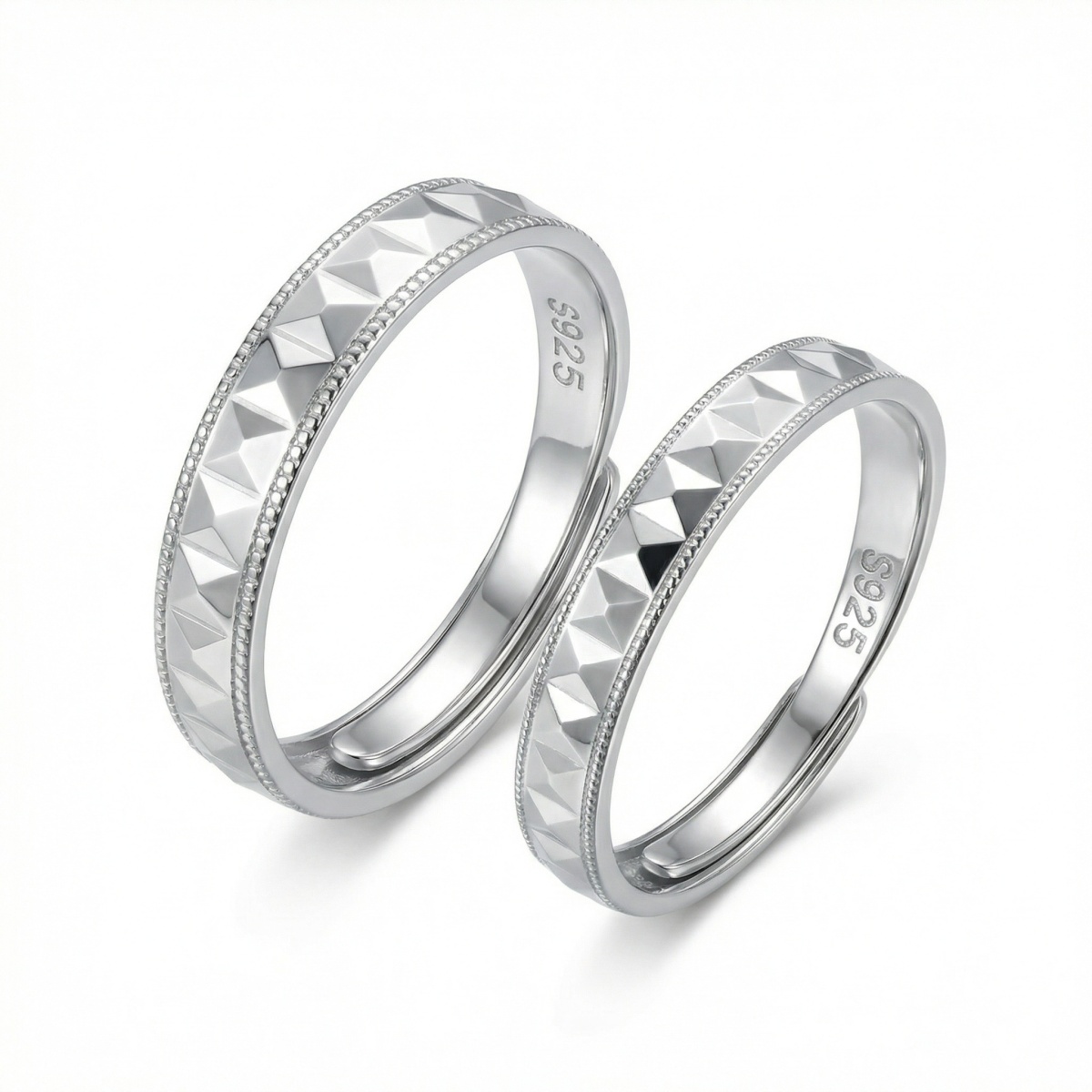 This exquisite pair of couple rings is meticulously crafted from high-quality S925 sterling silver, featuring a polished finish for lasting brilliance. Each band showcases a striking geometric pyramid pattern, framed by delicate beaded detailing that adds a touch of sophisticated texture. The unique adjustable open-ring design ensures a versatile and comfortable fit for various finger sizes, making them a perfect choice for gifting. These matching rings serve as a modern symbol of connection and style, suitable for anniversaries, engagements, or everyday wear. Durable and hypoallergenic, this set elegantly combines contemporary fashion with timeless craftsmanship. | Brand: jewelryodm