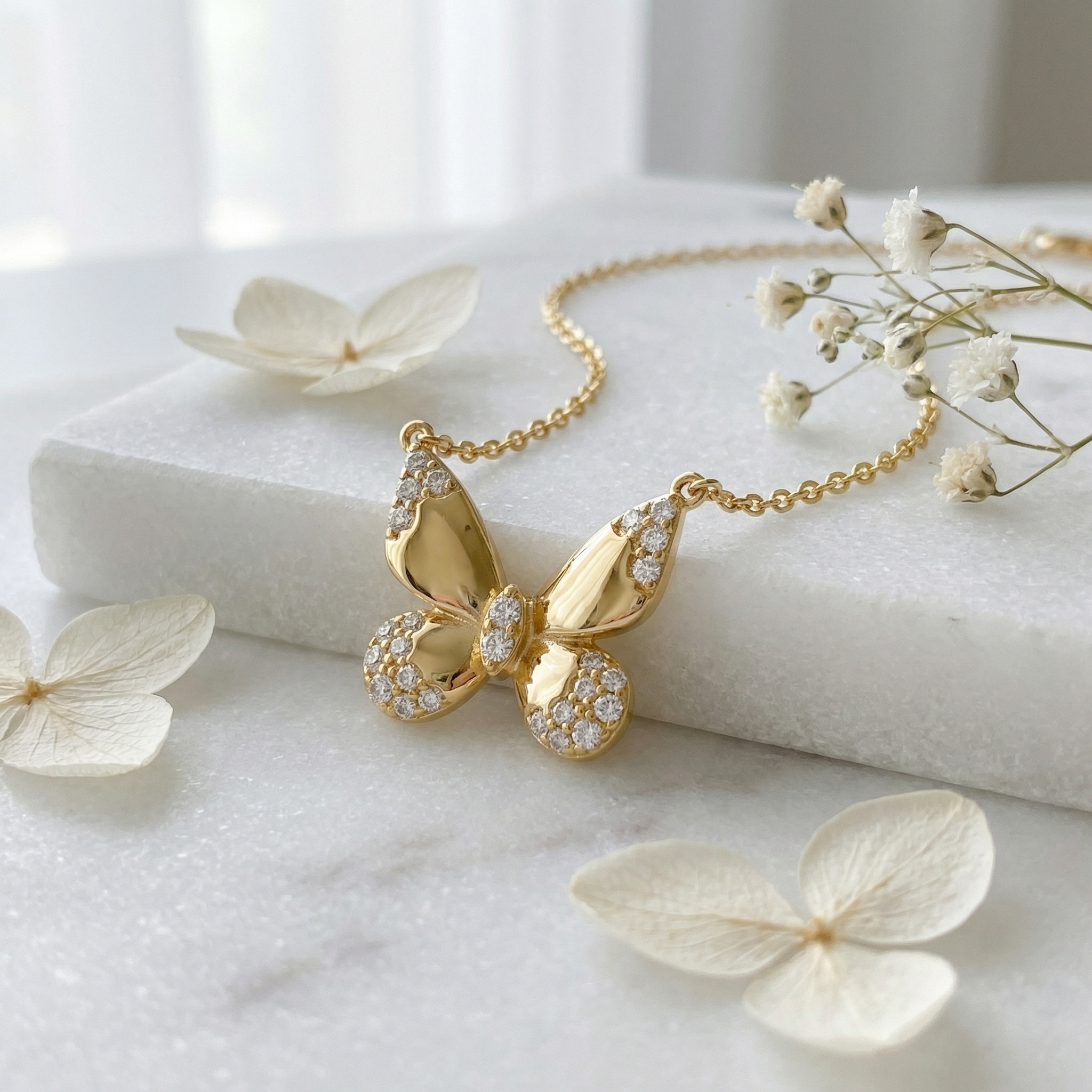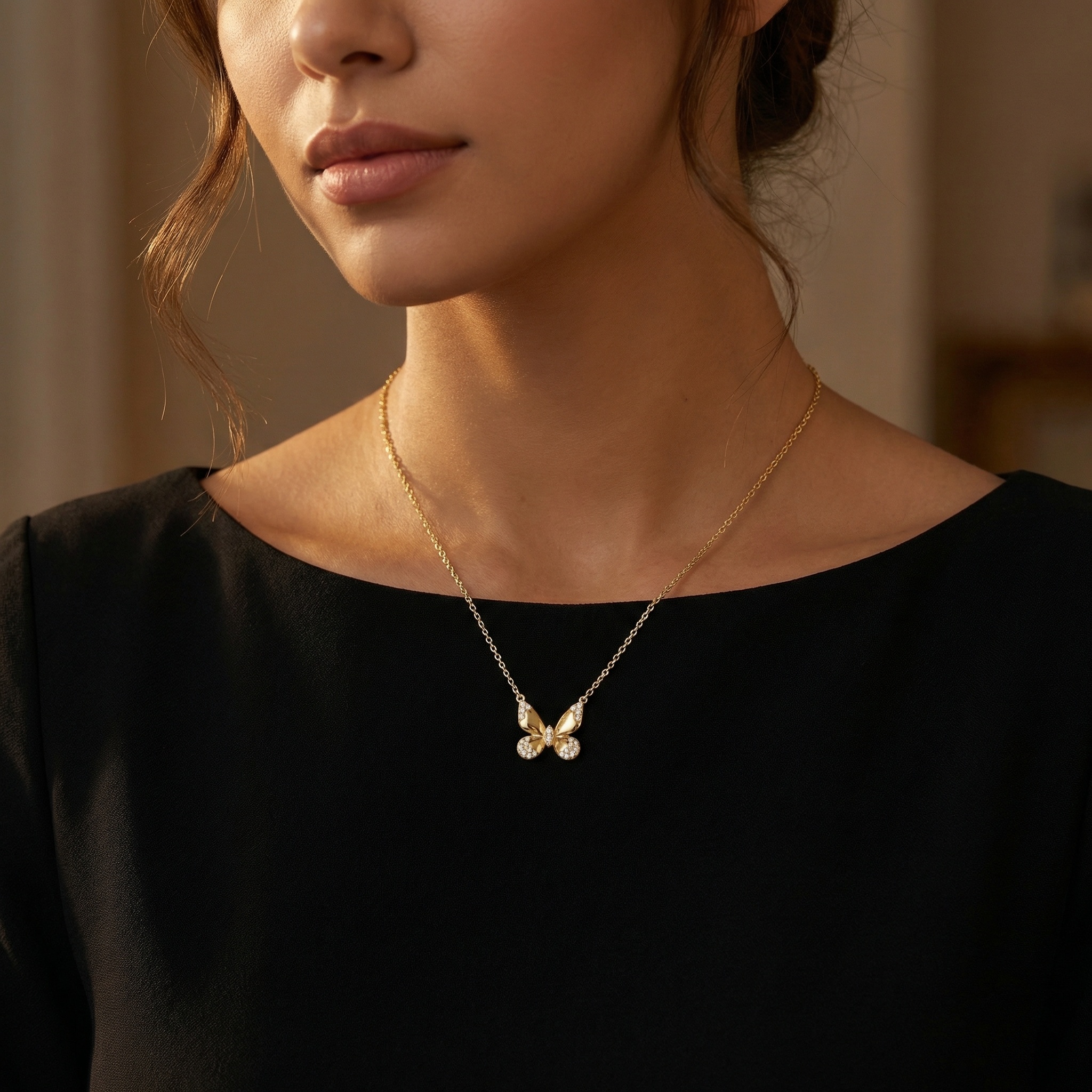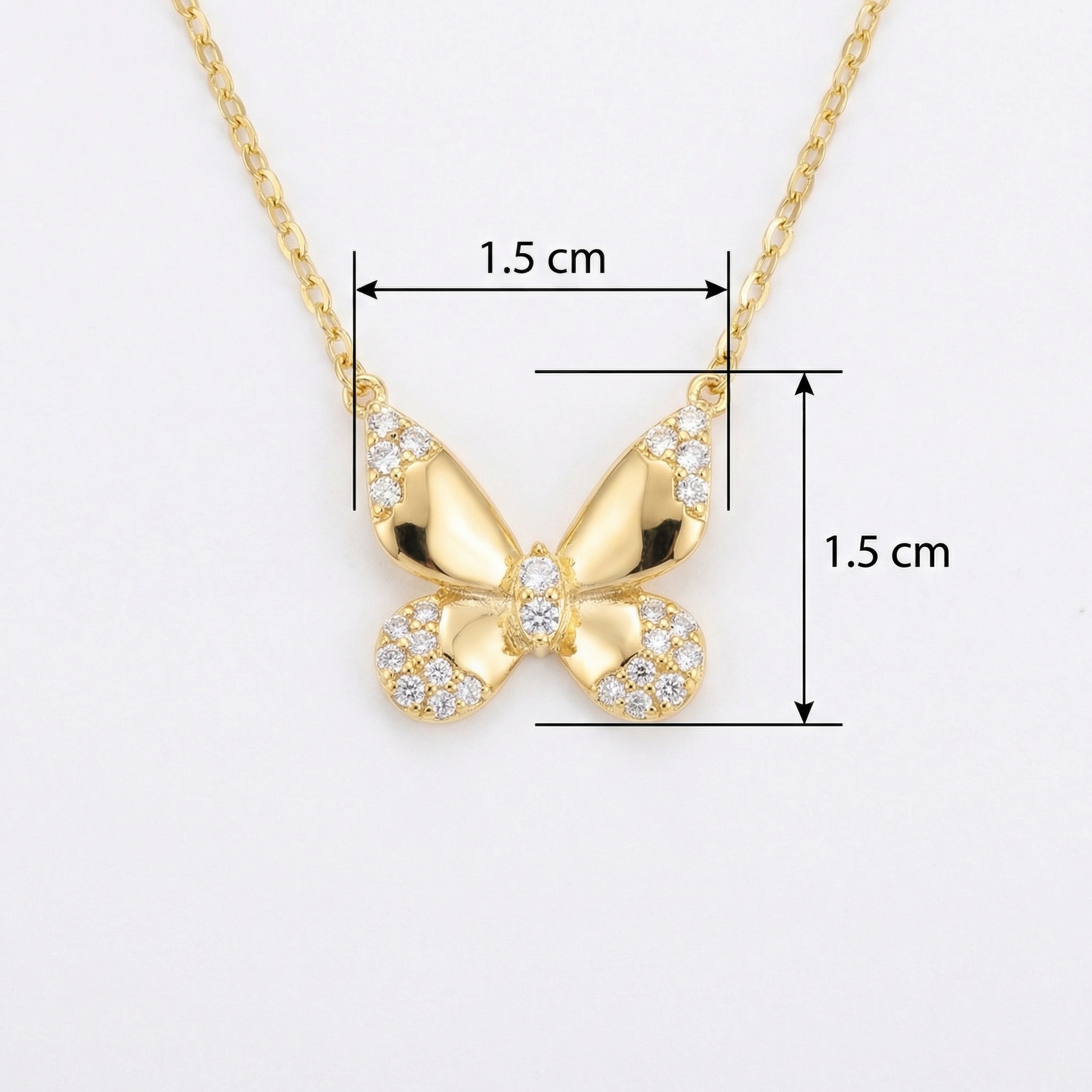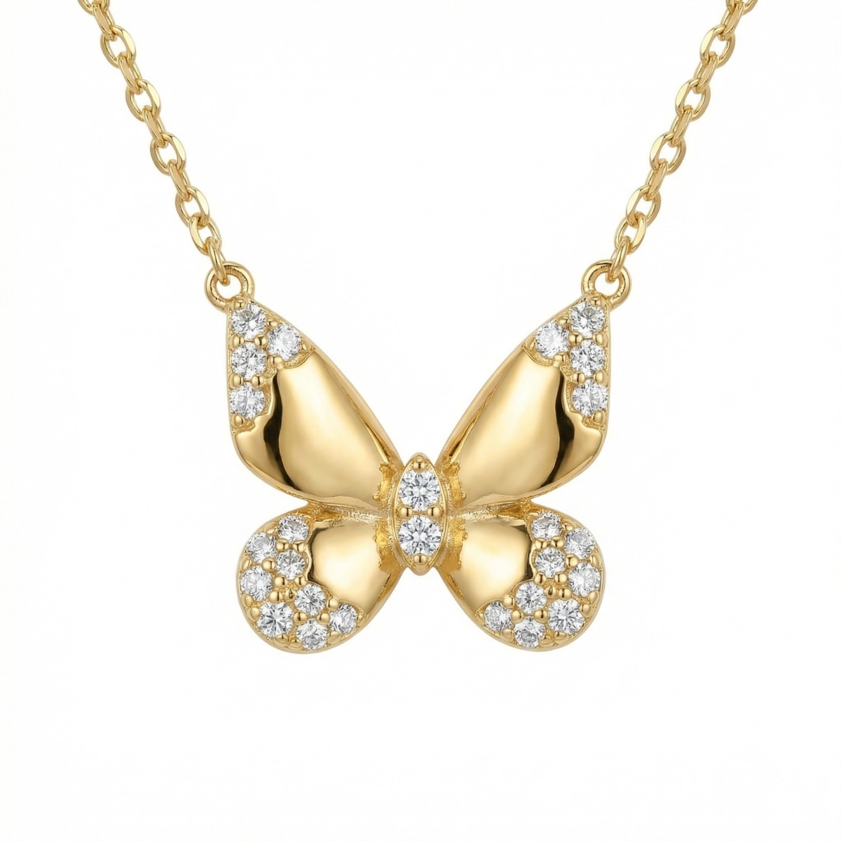 Embrace the beauty of nature with this exquisite butterfly necklace. This stunning piece features a finely crafted butterfly silhouette, rendered in a lustrous honey-toned metallic finish that radiates warmth and elegance. The delicate wings are adorned with clusters of brilliant round-cut stones, carefully set to catch the light from every angle, while the body of the butterfly is highlighted with shimmering gems for added brilliance. Suspended from a dainty link chain, this necklace offers a timeless and feminine aesthetic. Its whimsical design makes it a perfect accessory for both everyday wear and special occasions, symbolizing transformation and grace. Whether treating yourself or gifting a loved one, this radiant piece is a sophisticated addition to any jewelry collection, offering a touch of sparkle and a refined, nature-inspired charm that never goes out of style. | Brand: jewelryodm